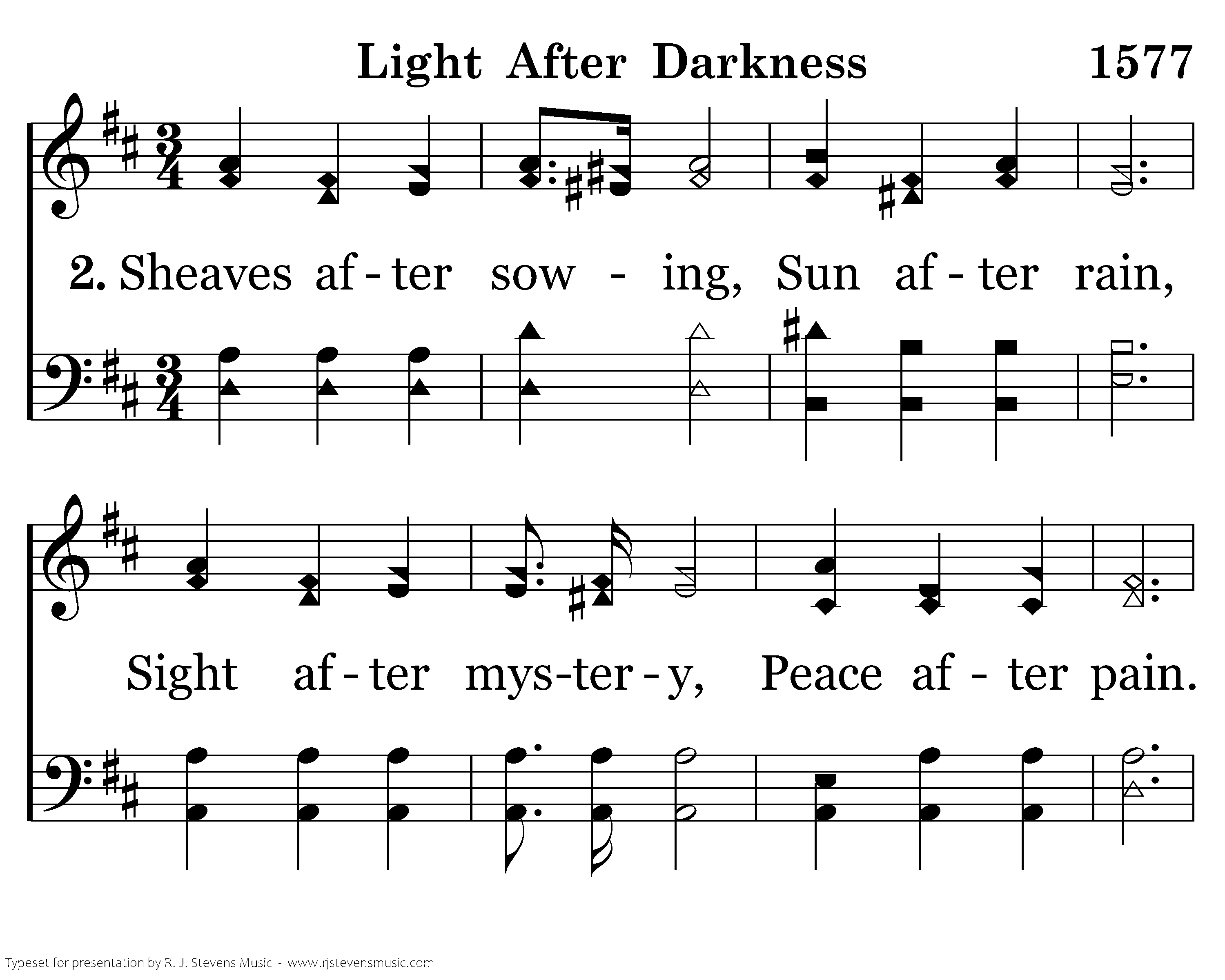 Light after darkness, Gain after loss, Strength after suff'ring, Crown after cross. Sweet after bitter, Song after sigh, Home after wandering, Praise after cry.