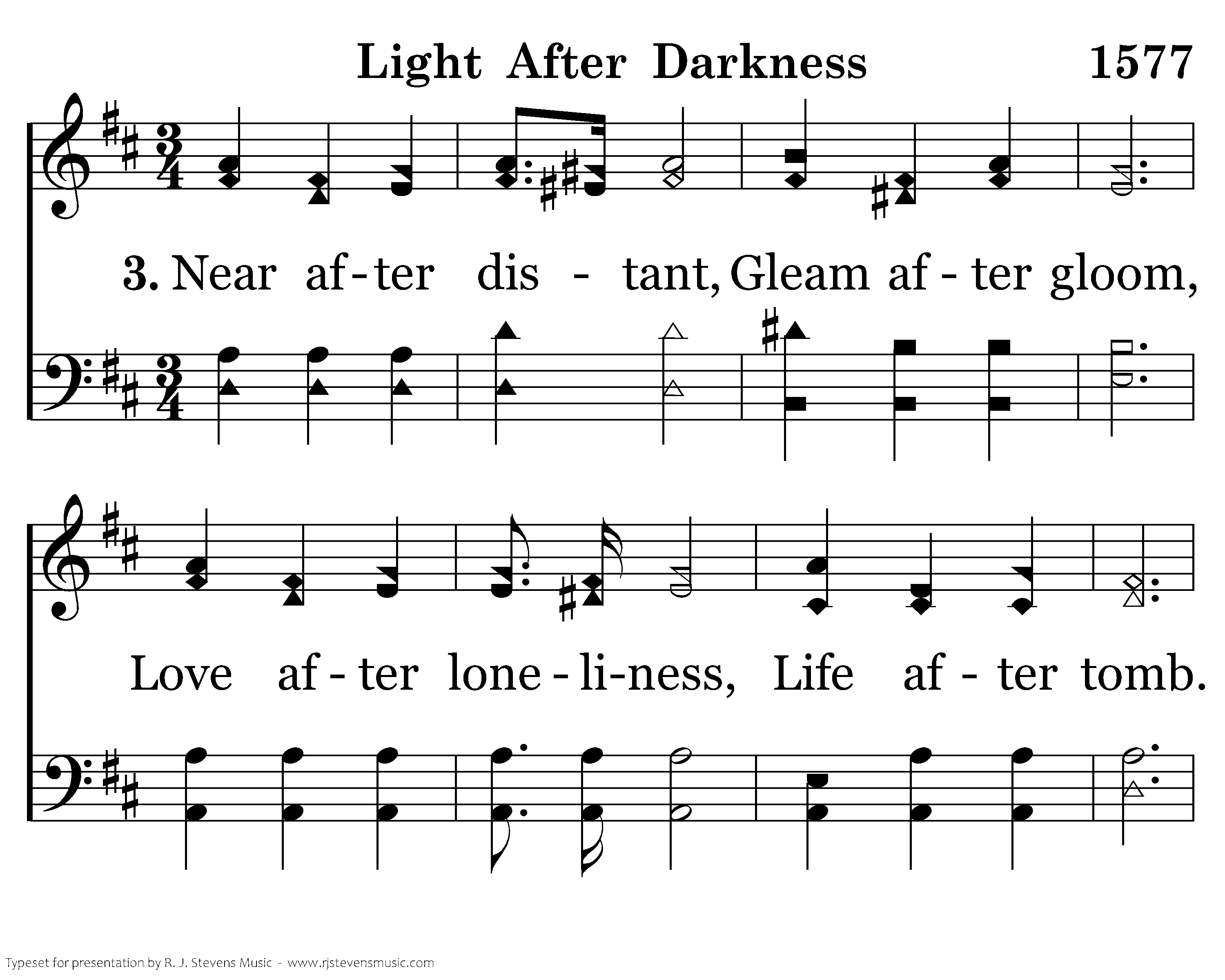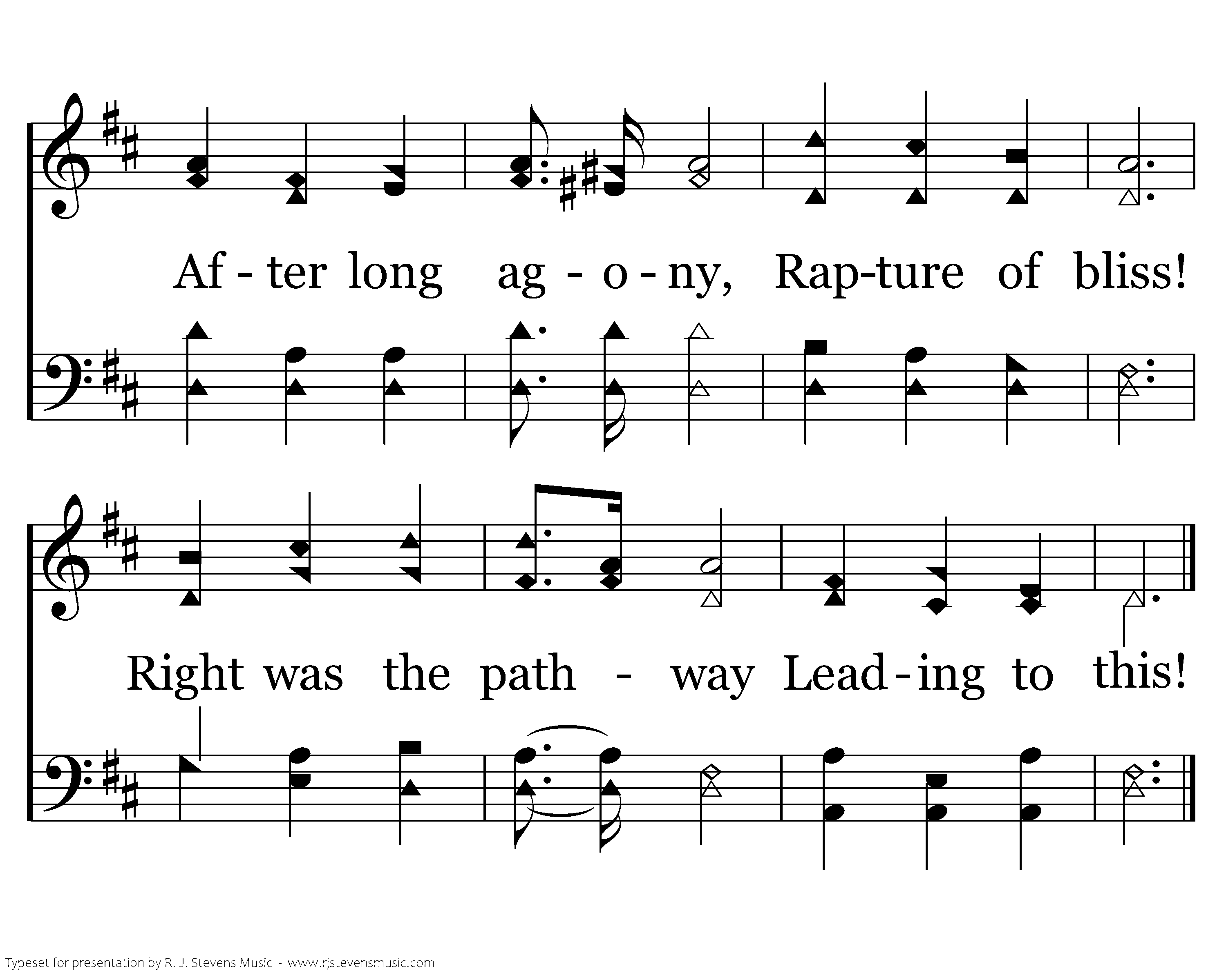 Near after distant, Gleam after gloom, Love after loneliness, Life after tomb. After long agony, Rapture of bliss! Right was the pathway Leading to this!