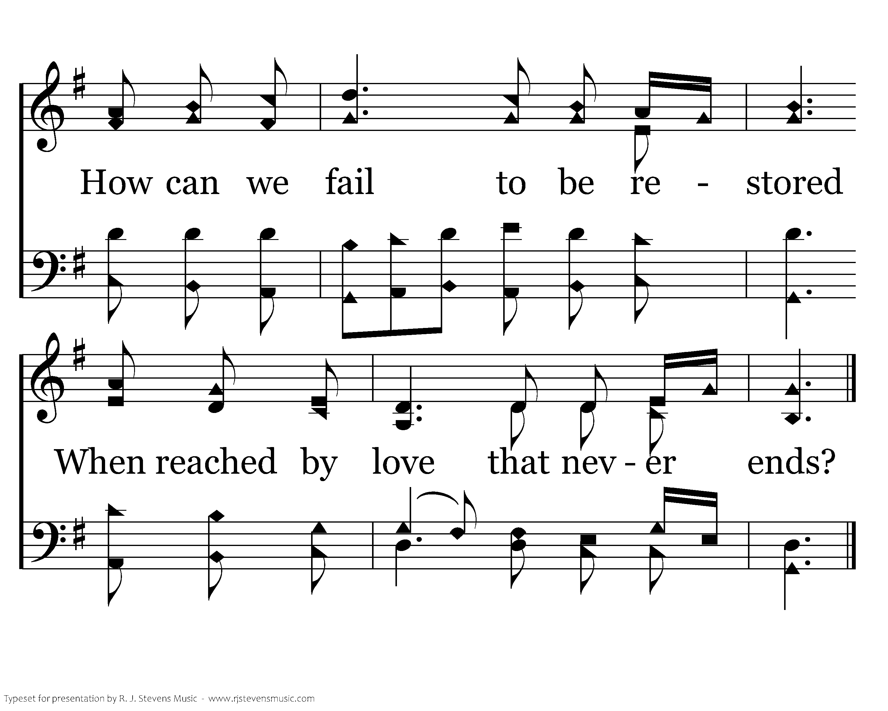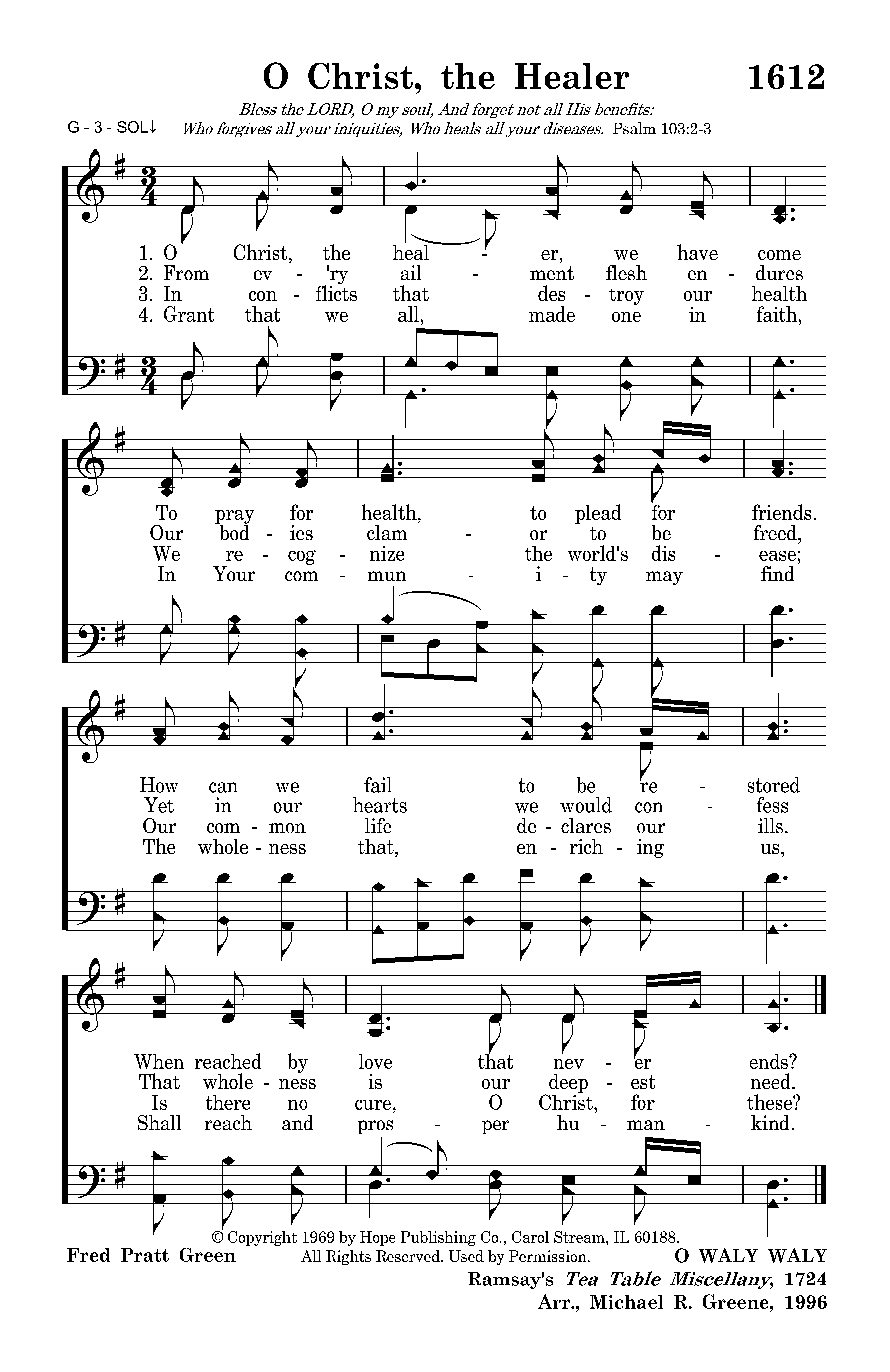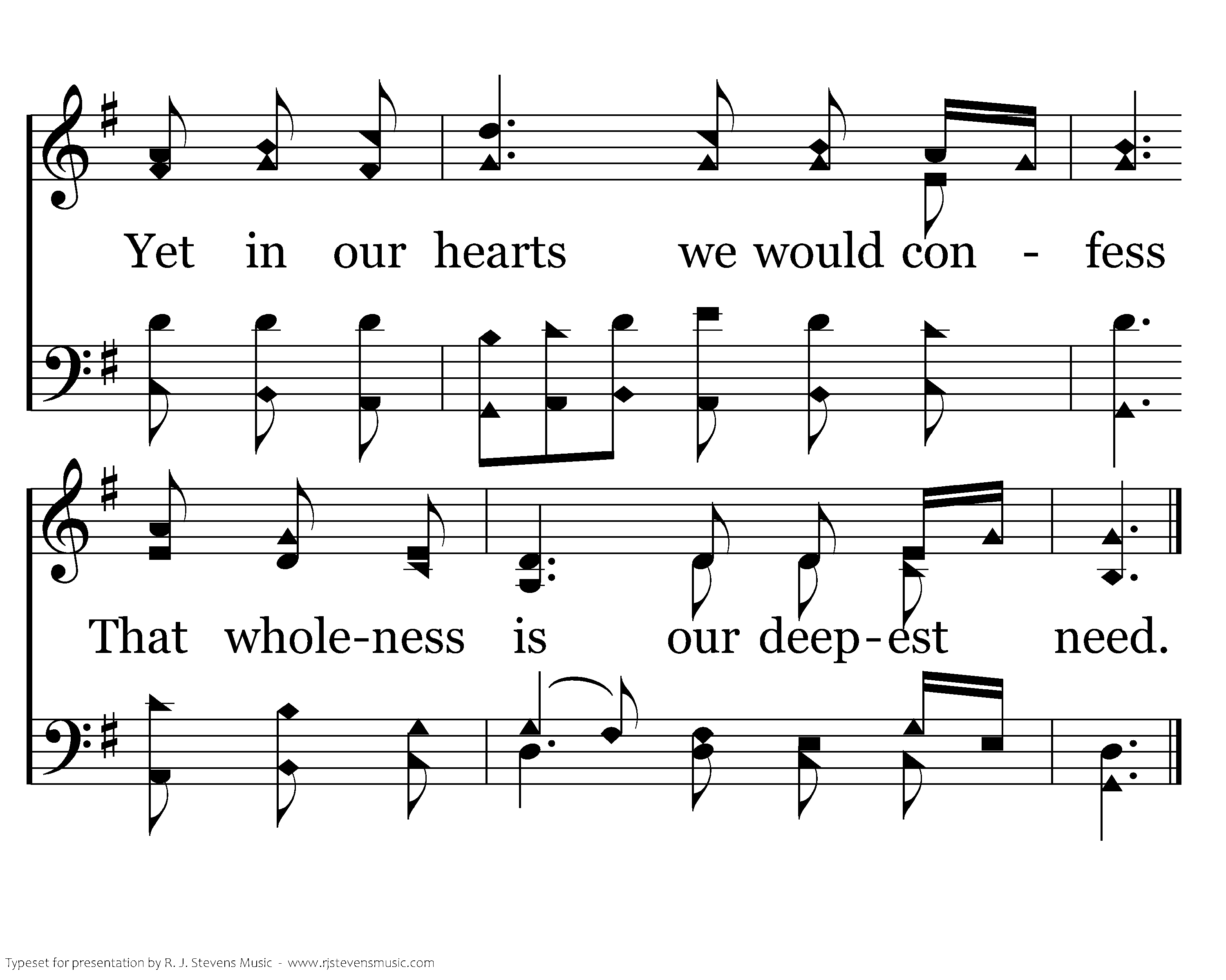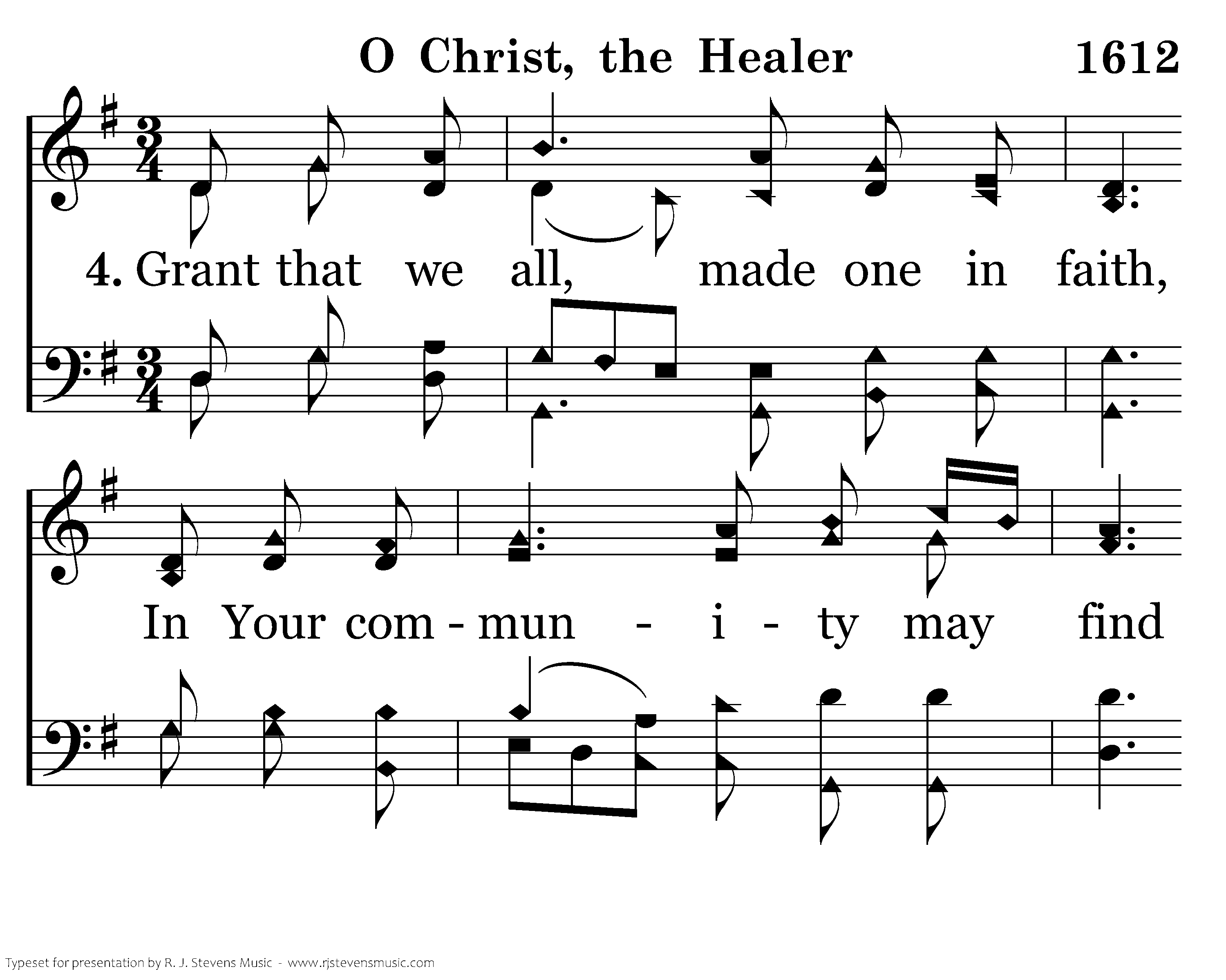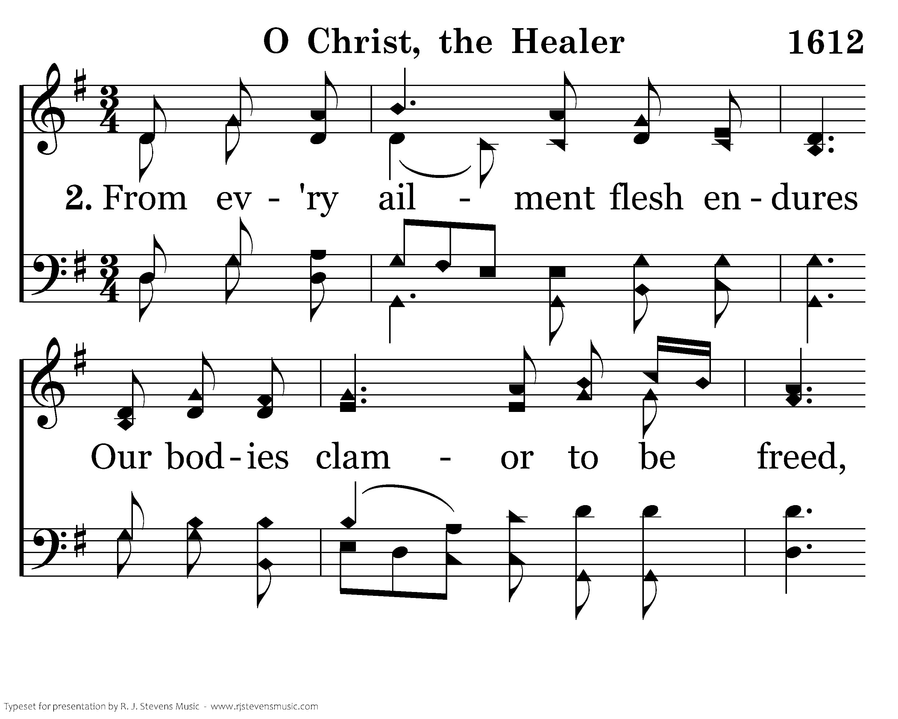 From ev'ry ailment flesh endures Our bodies clamor to be freed, Yet in our hearts we would confess That wholeness is our deepest need.