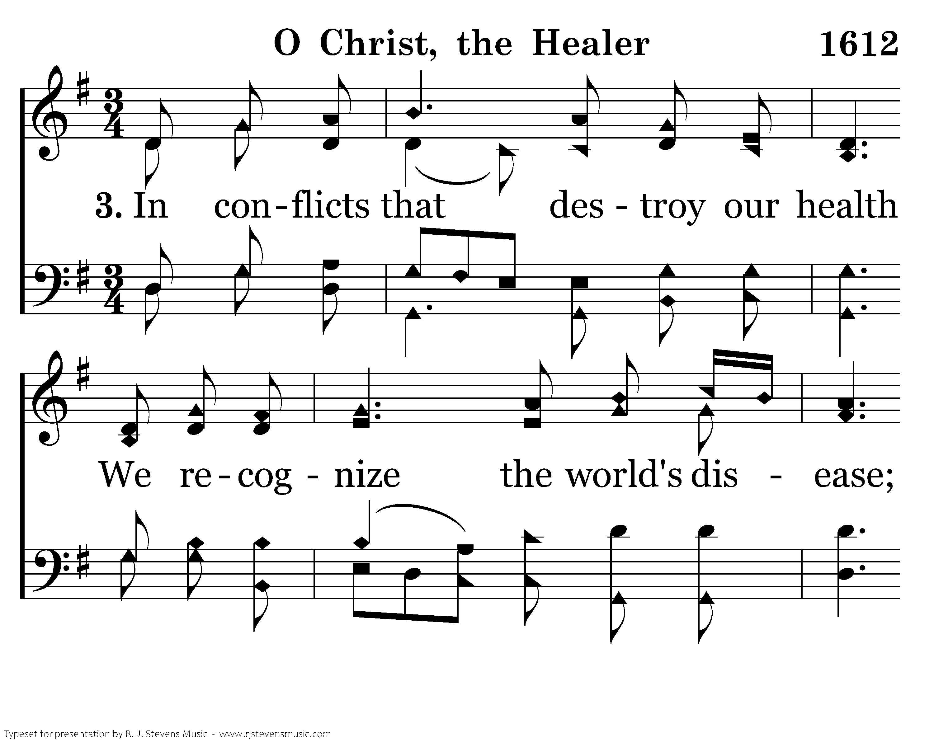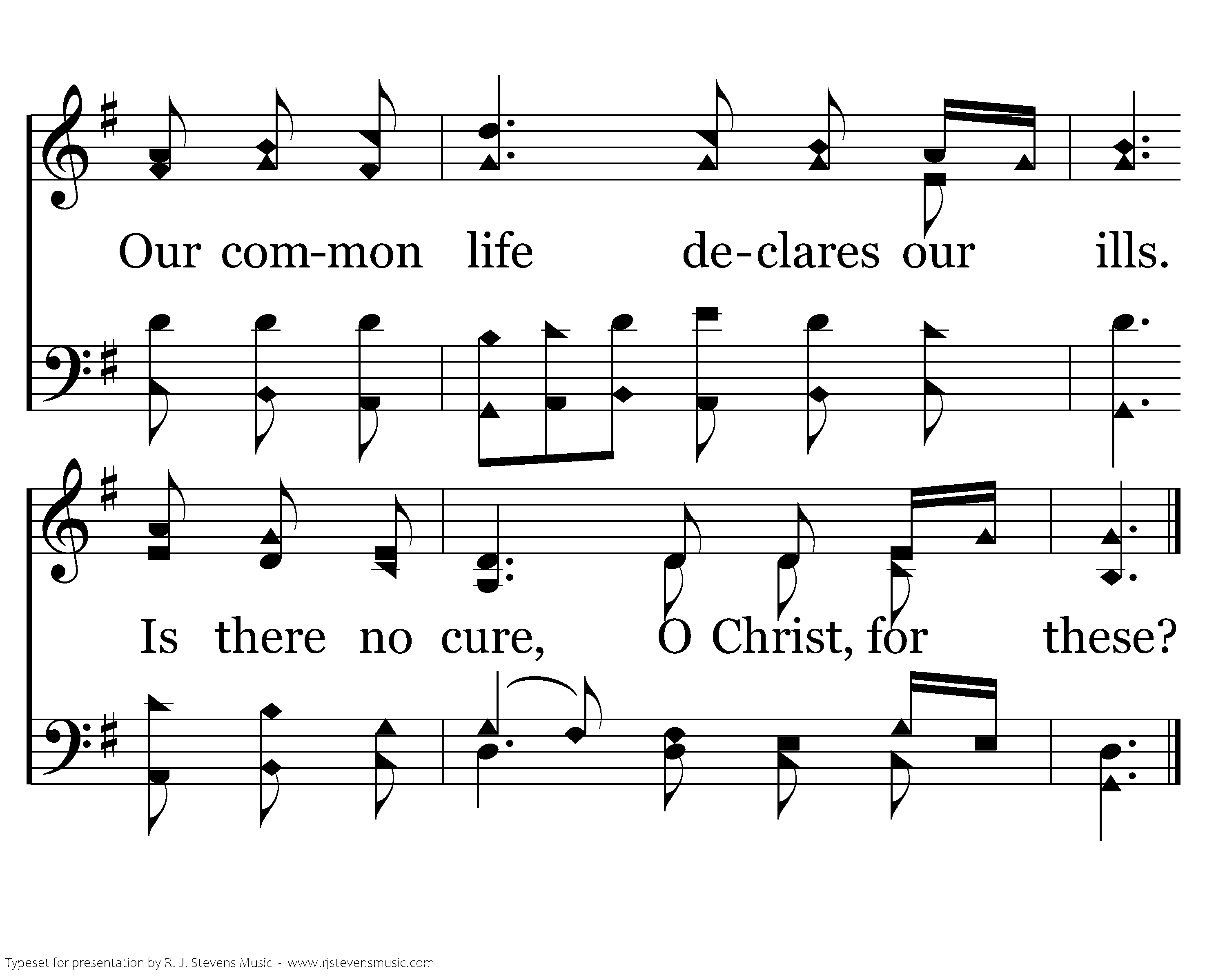 In conflicts that destroy our health We recognize the world's disease; Our common life declares our ills. Is there no cure, O Christ, for these?