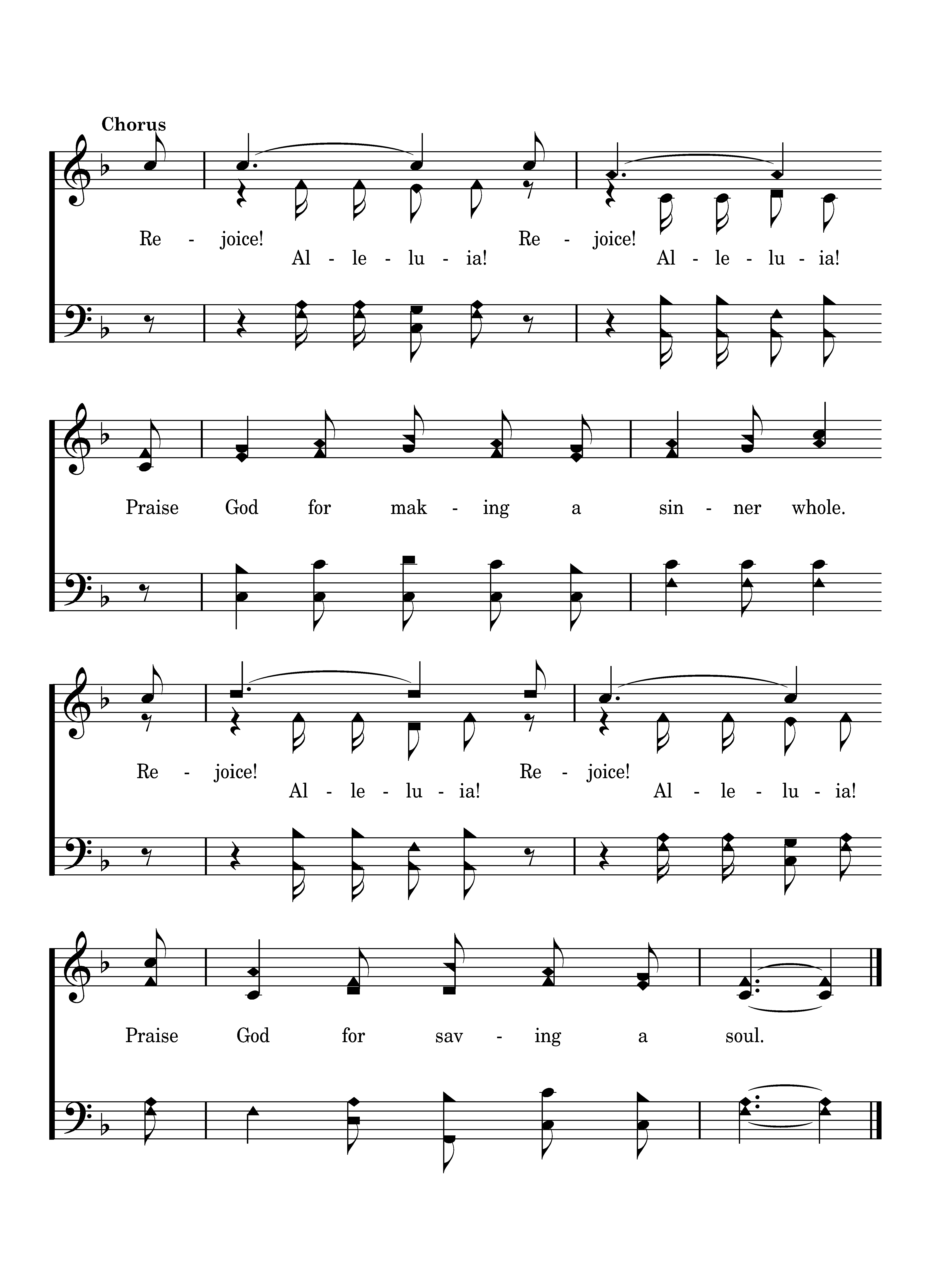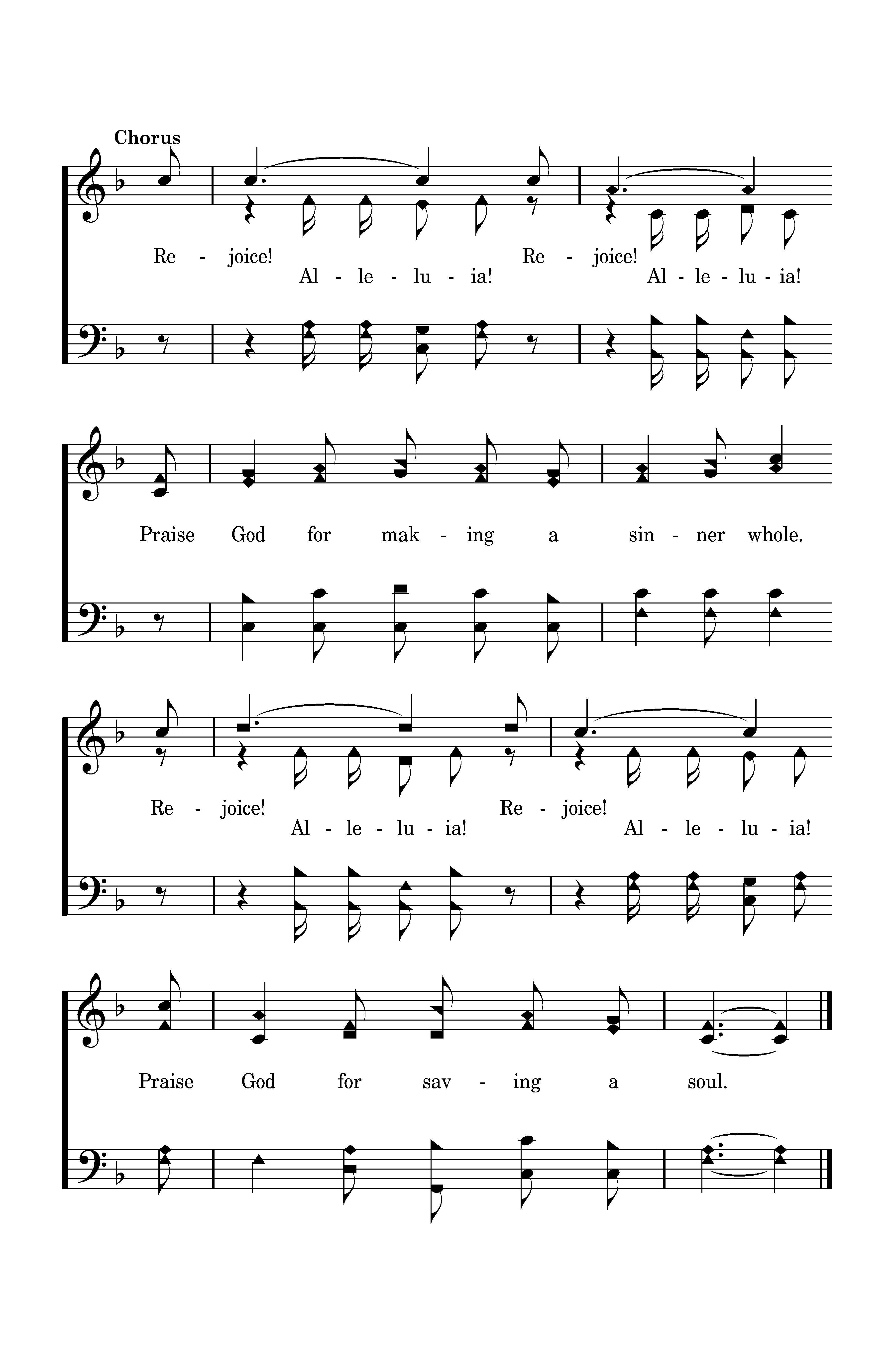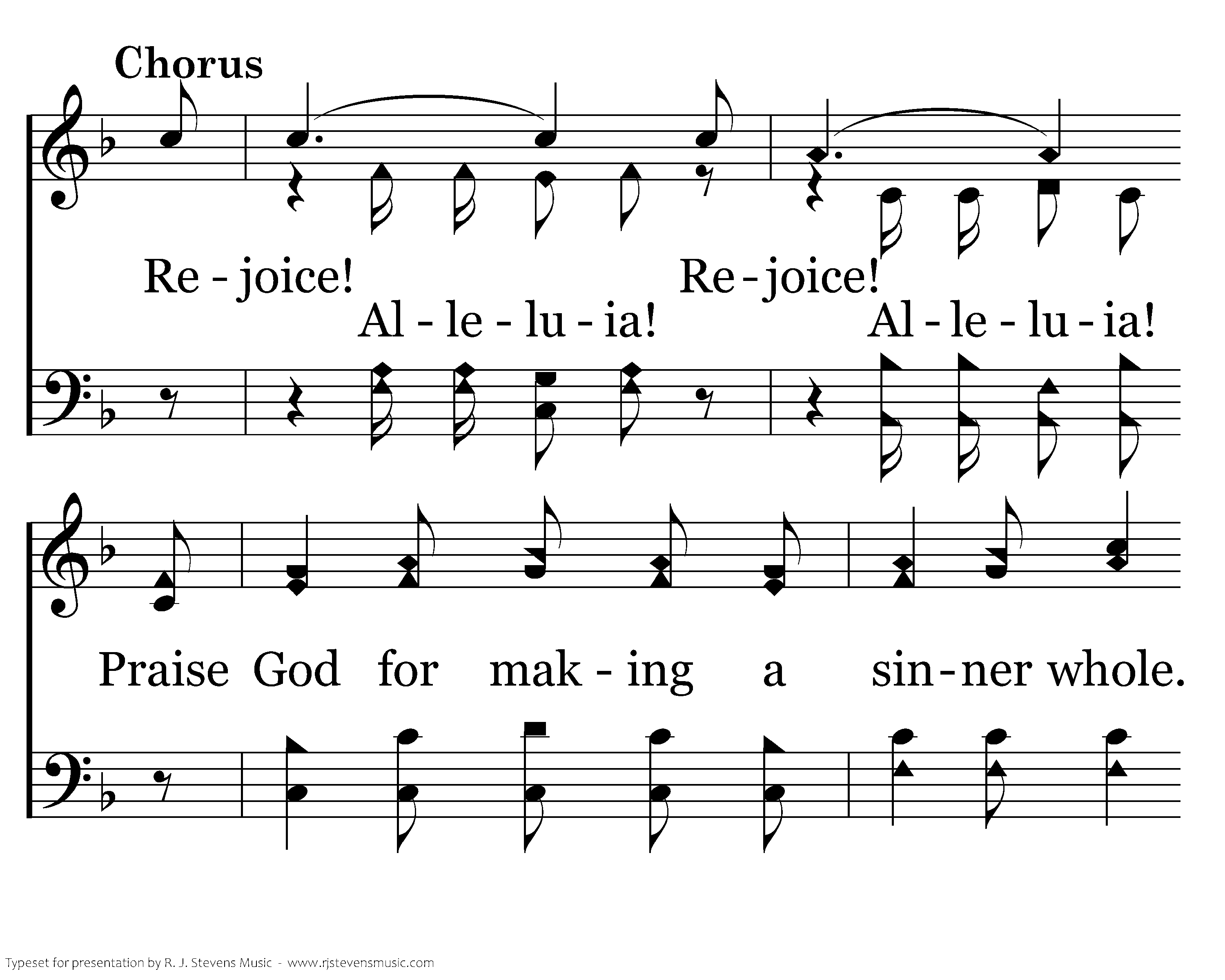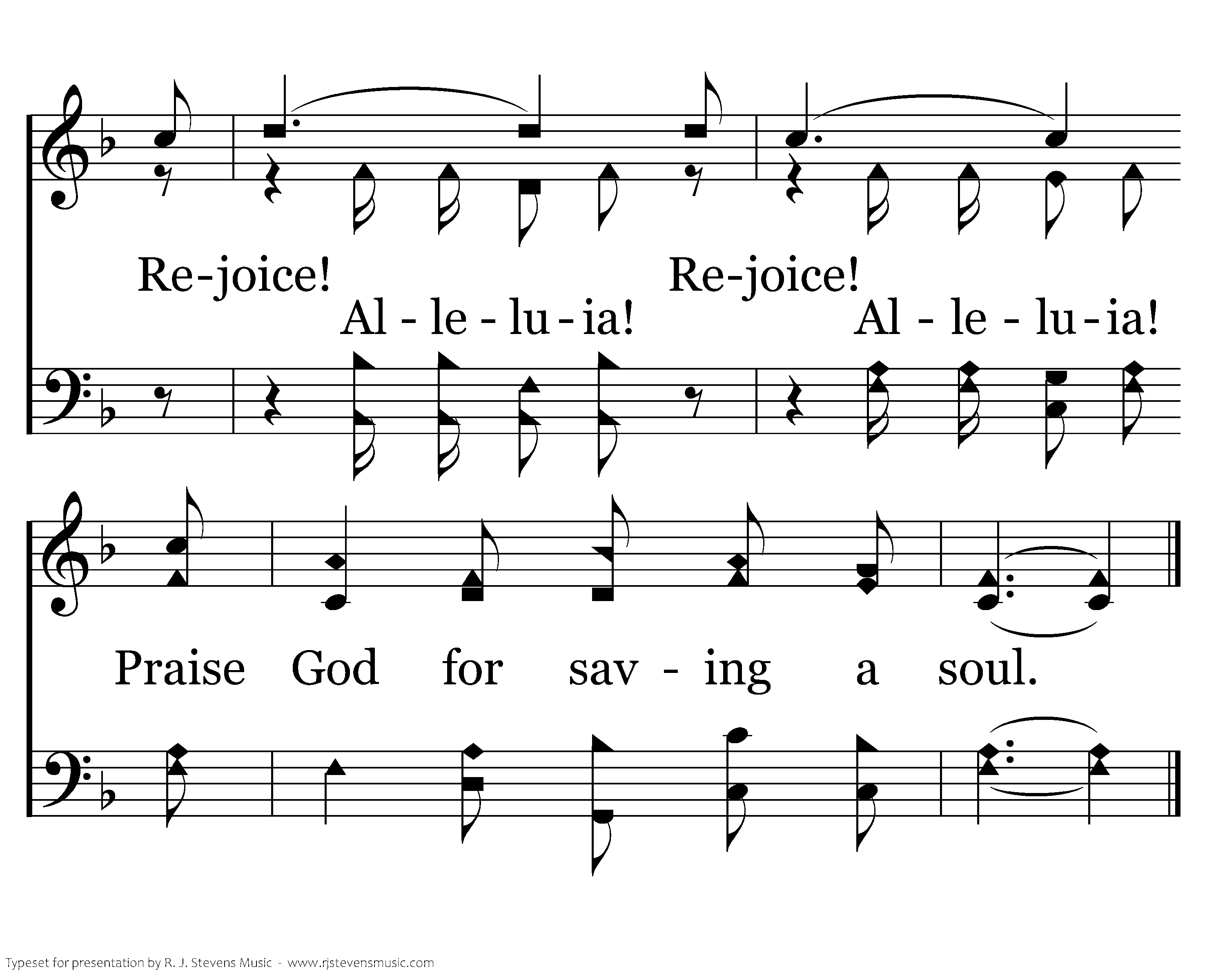 Alleluia! Alleluia! Rejoice! Rejoice! Praise God for making a sinner whole. Rejoice! Rejoice! Praise God for saving a soul.