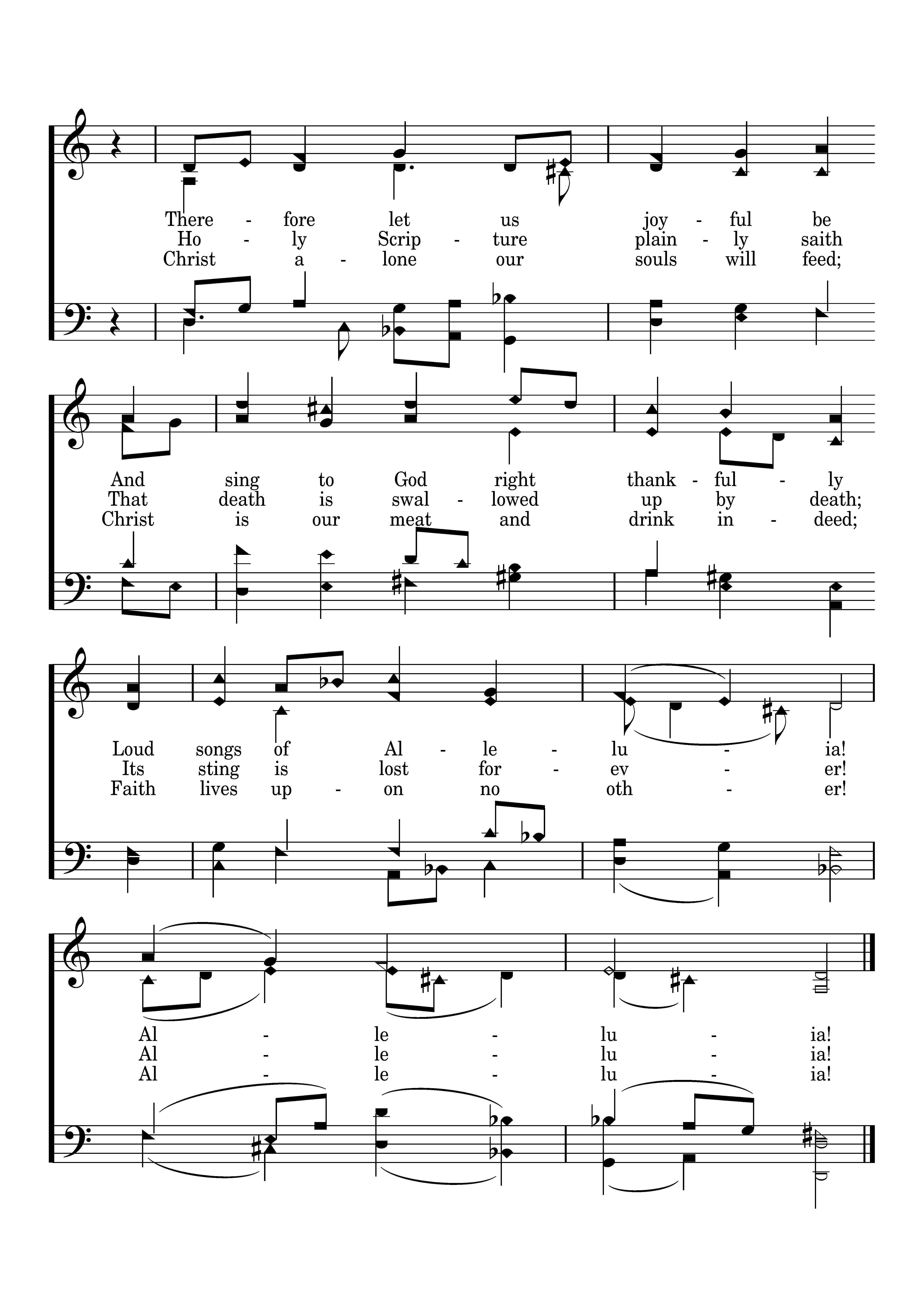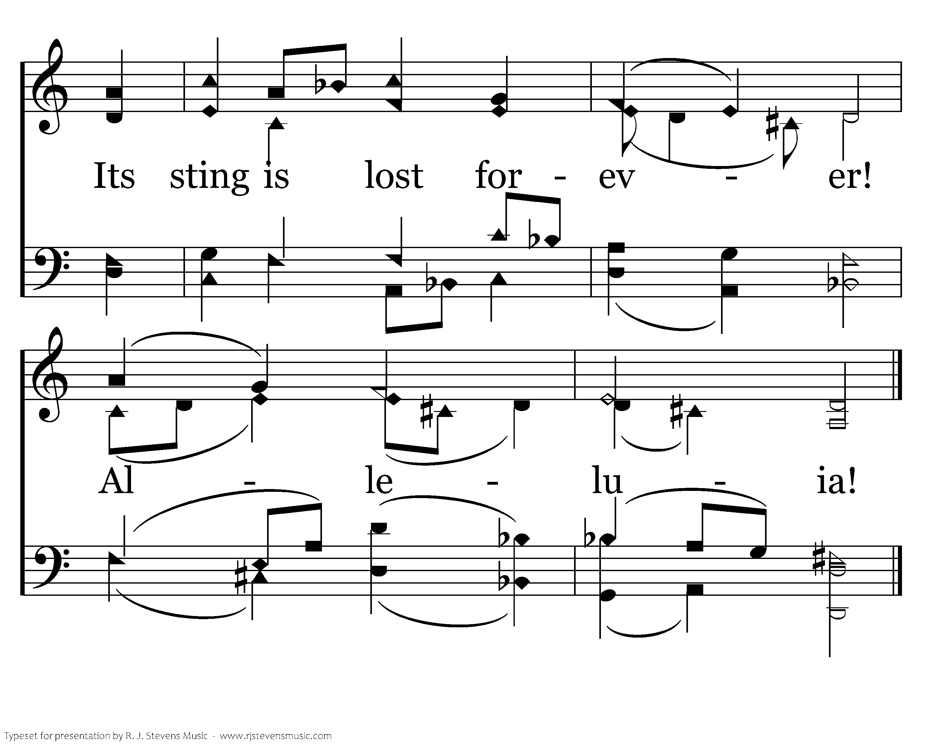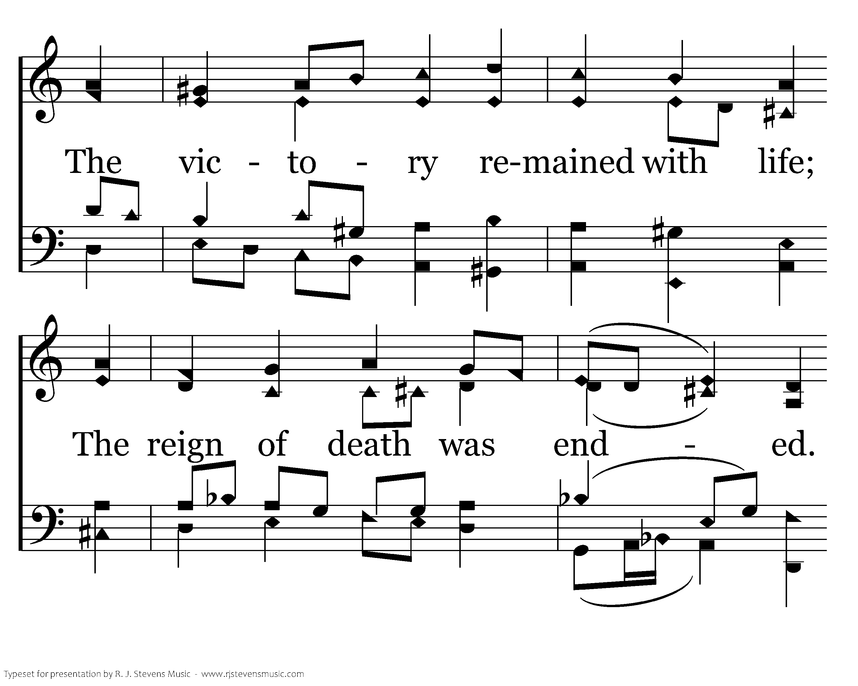 It was a strange and dreadful strife When life and death contended; The victory remained with life; The reign of death was ended. Holy Scripture plainly saith That death is swallowed up by death; Its sting is lost forever! Alleluia!