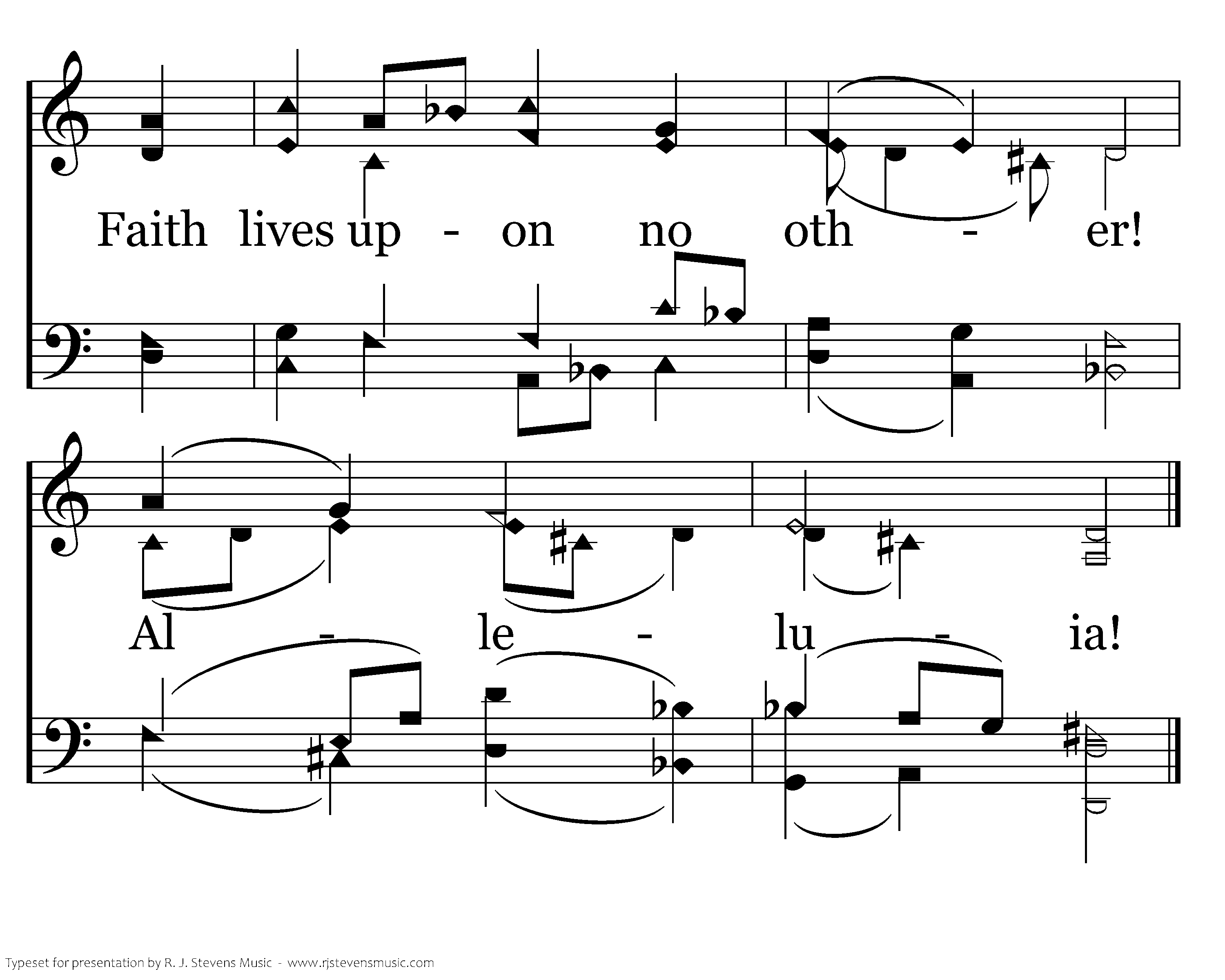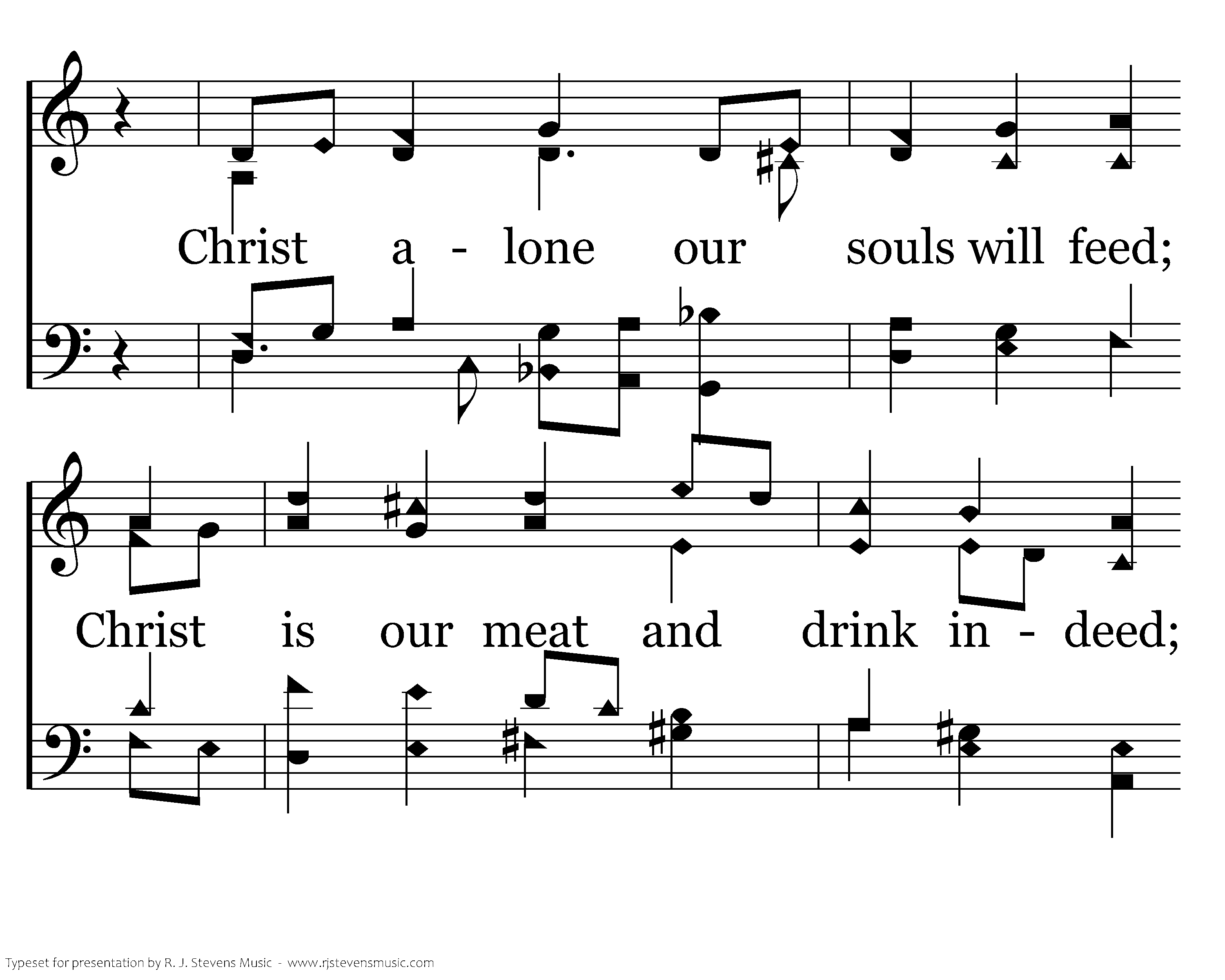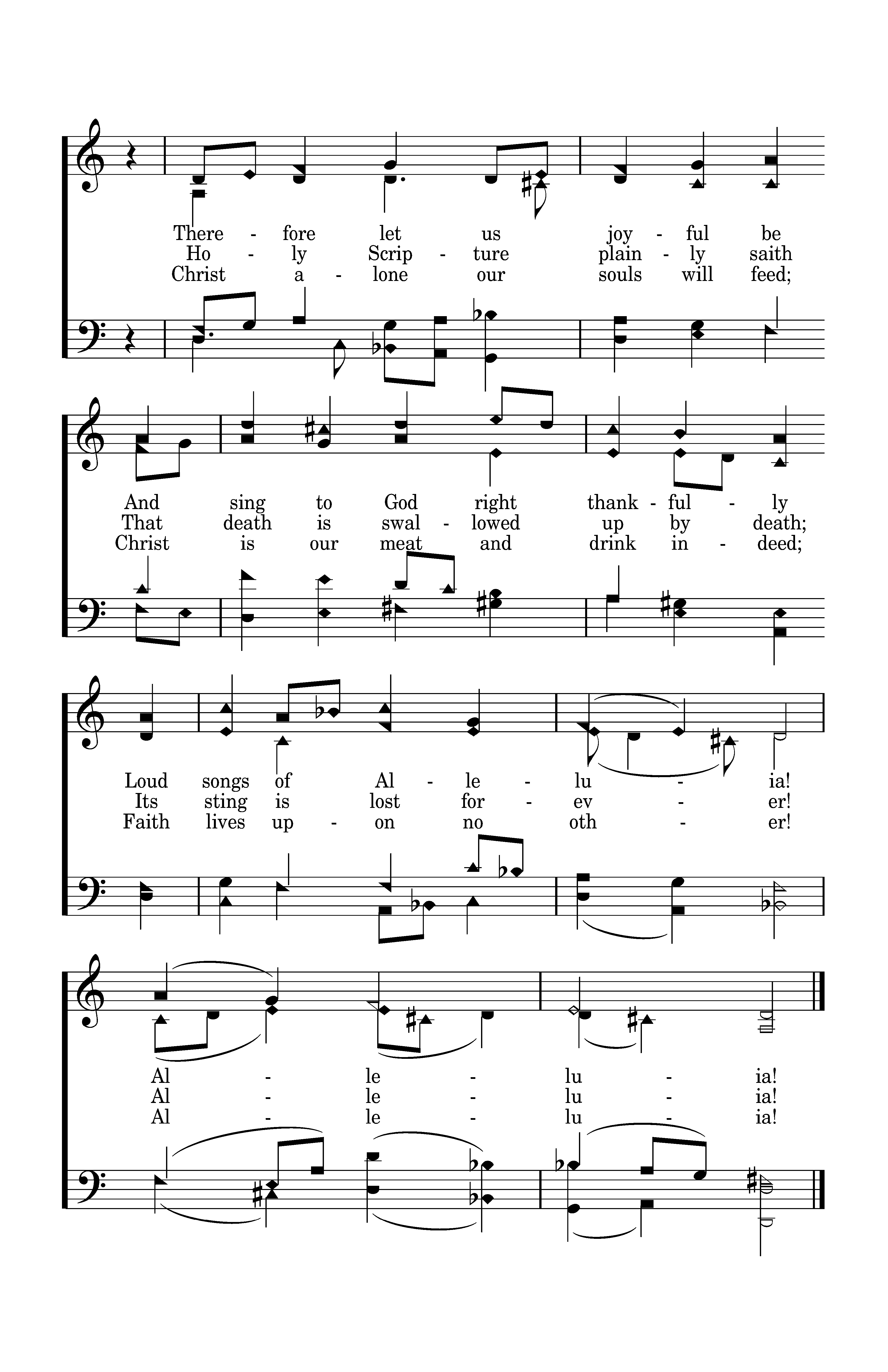 Then let us feast, this new Lord's day. On the true bread of heaven; The Word of grace hath purged away The old and wicked leaven. Christ alone our souls will feed; Christ is our meat and drink indeed; Faith lives upon no other! Alleluia!
