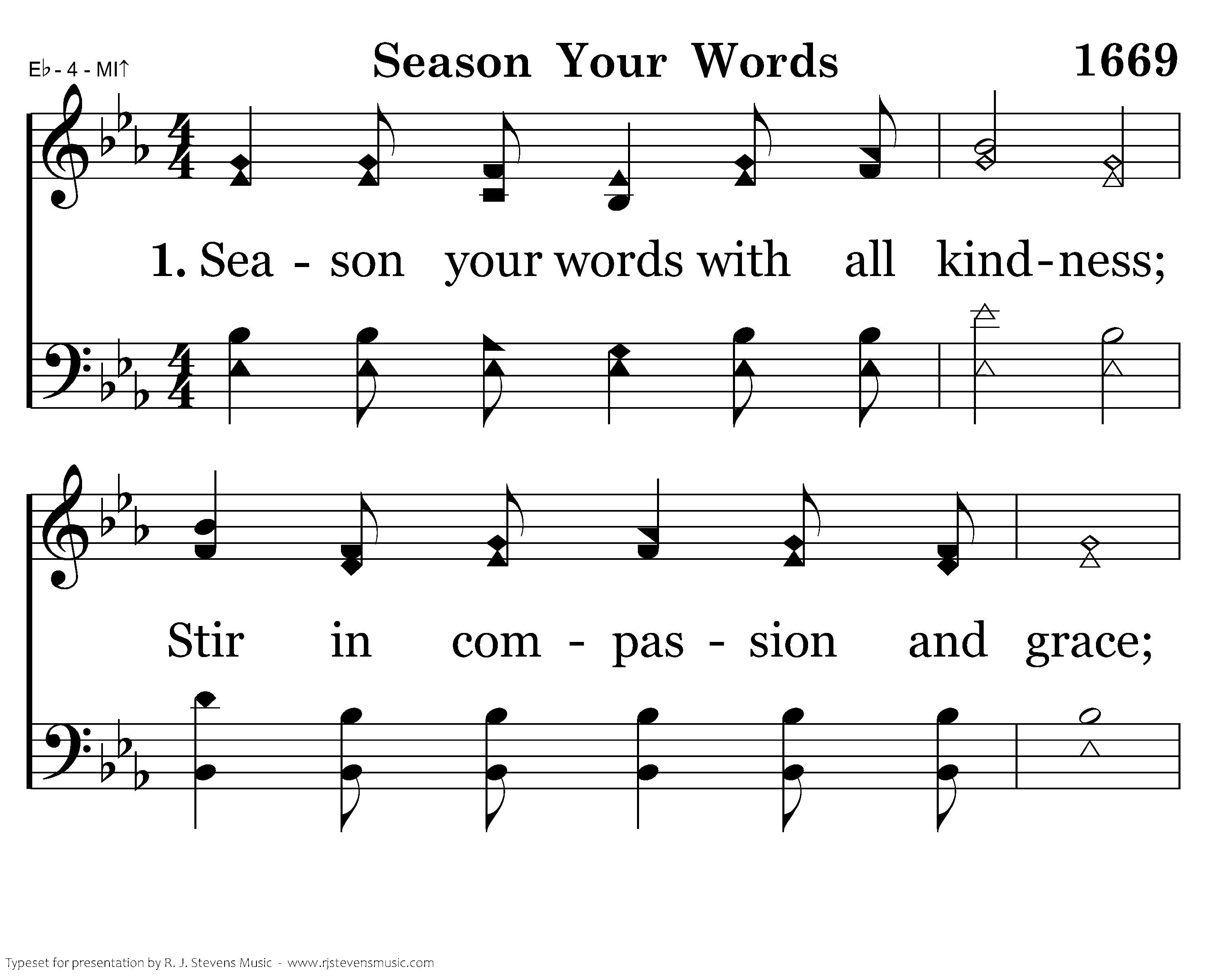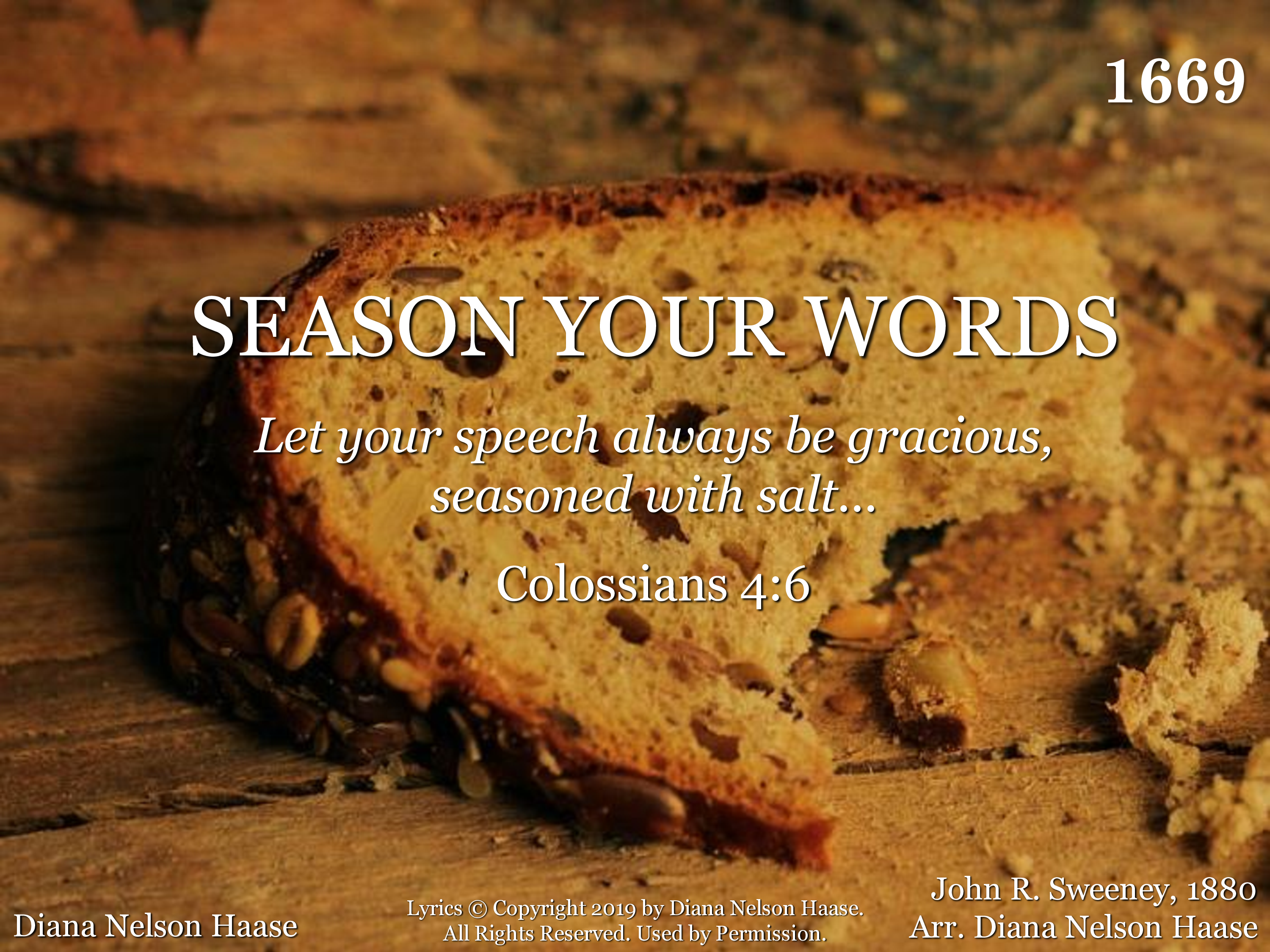 Season your words with all kindness; Stir in compassion and grace; Spice up your comments with patience; Flavor your language with praise. Season your mind with all pureness; Mix with God's sunshine above; Pepper your heart with His goodness; Coat all your moments with love.