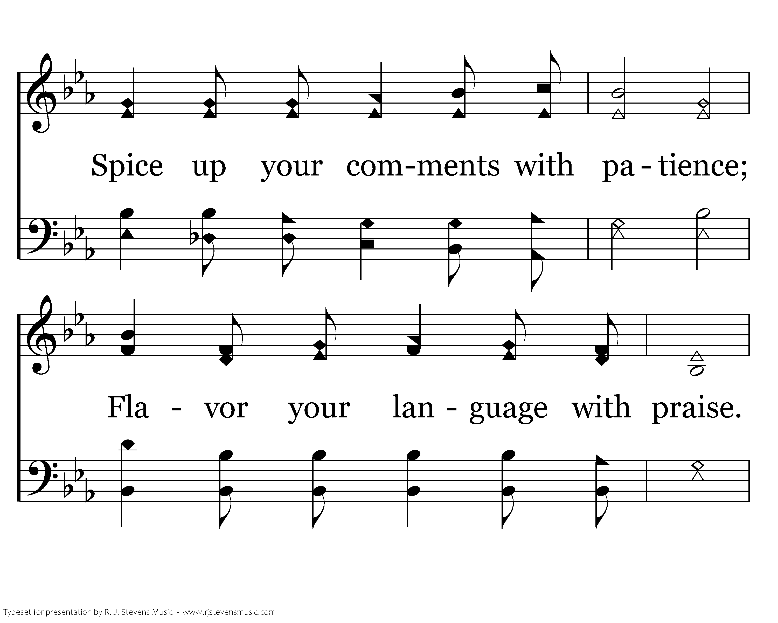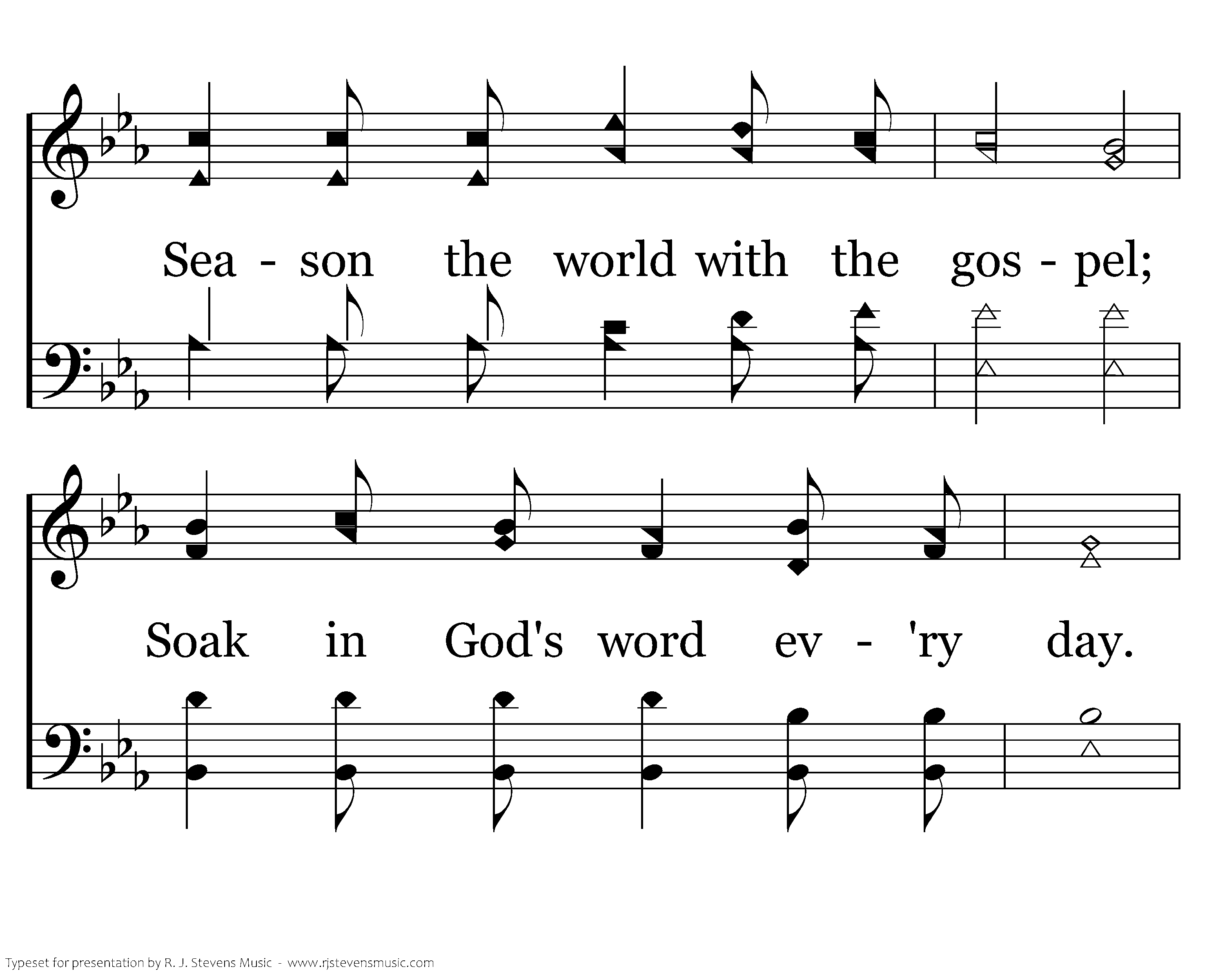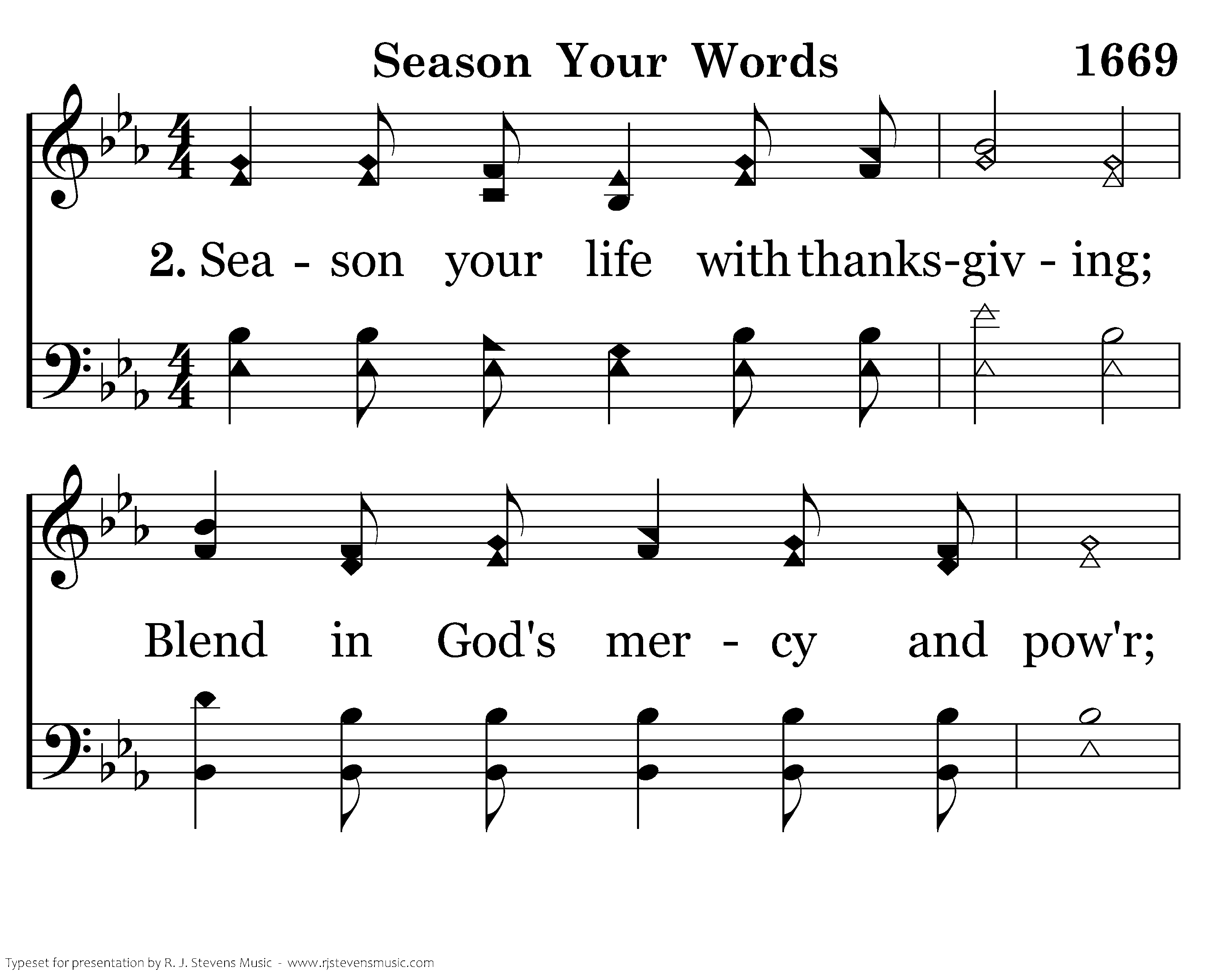Season your life with thanksgiving; Blend in God's mercy and pow'r; Spread peace and comfort in trials; Sprinkle your journey with awe. Season the world with the gospel; Soak in God's word ev'ry day. Scatter the seeds of the kingdom; Pour out the truth of His way.
