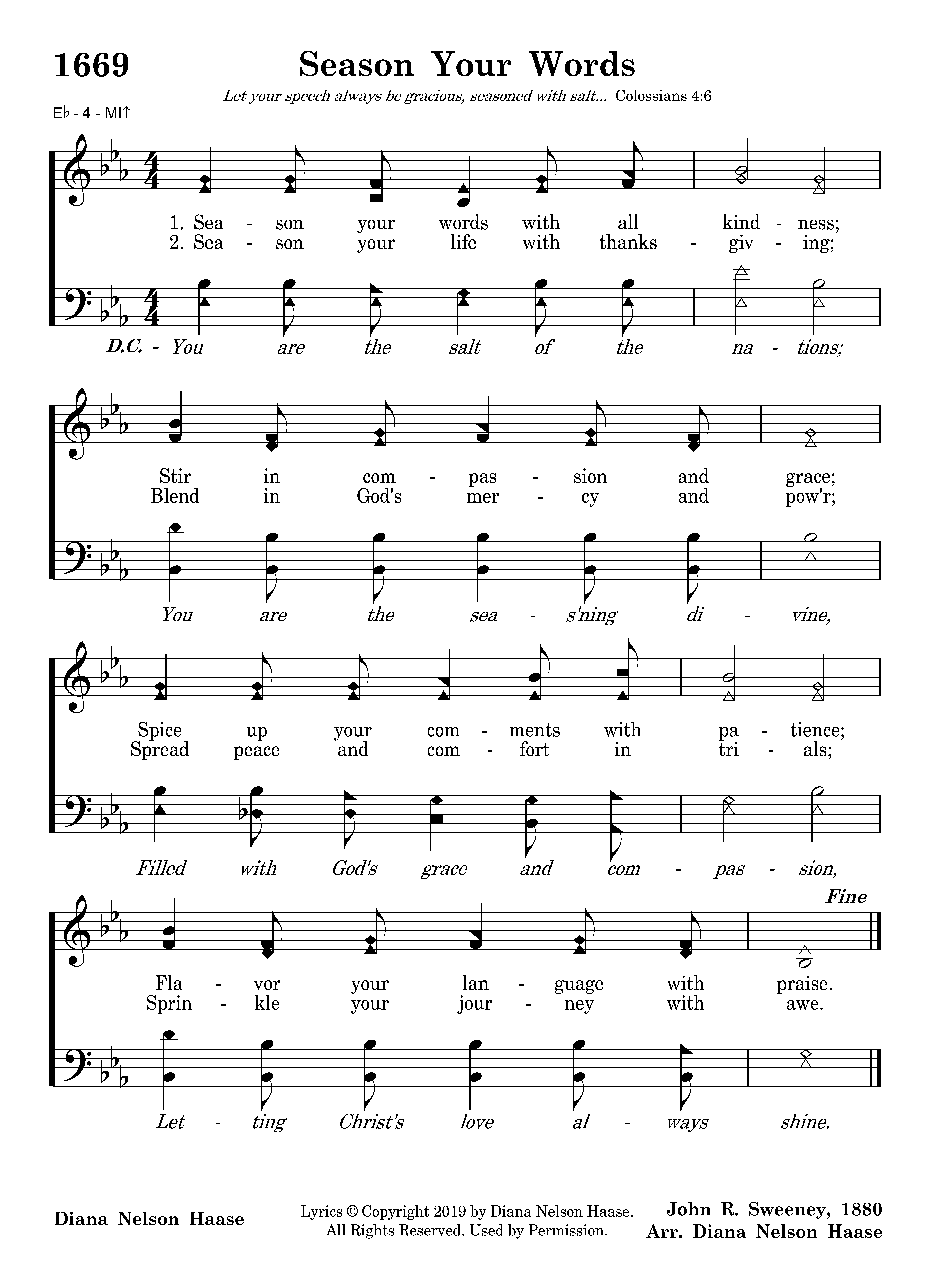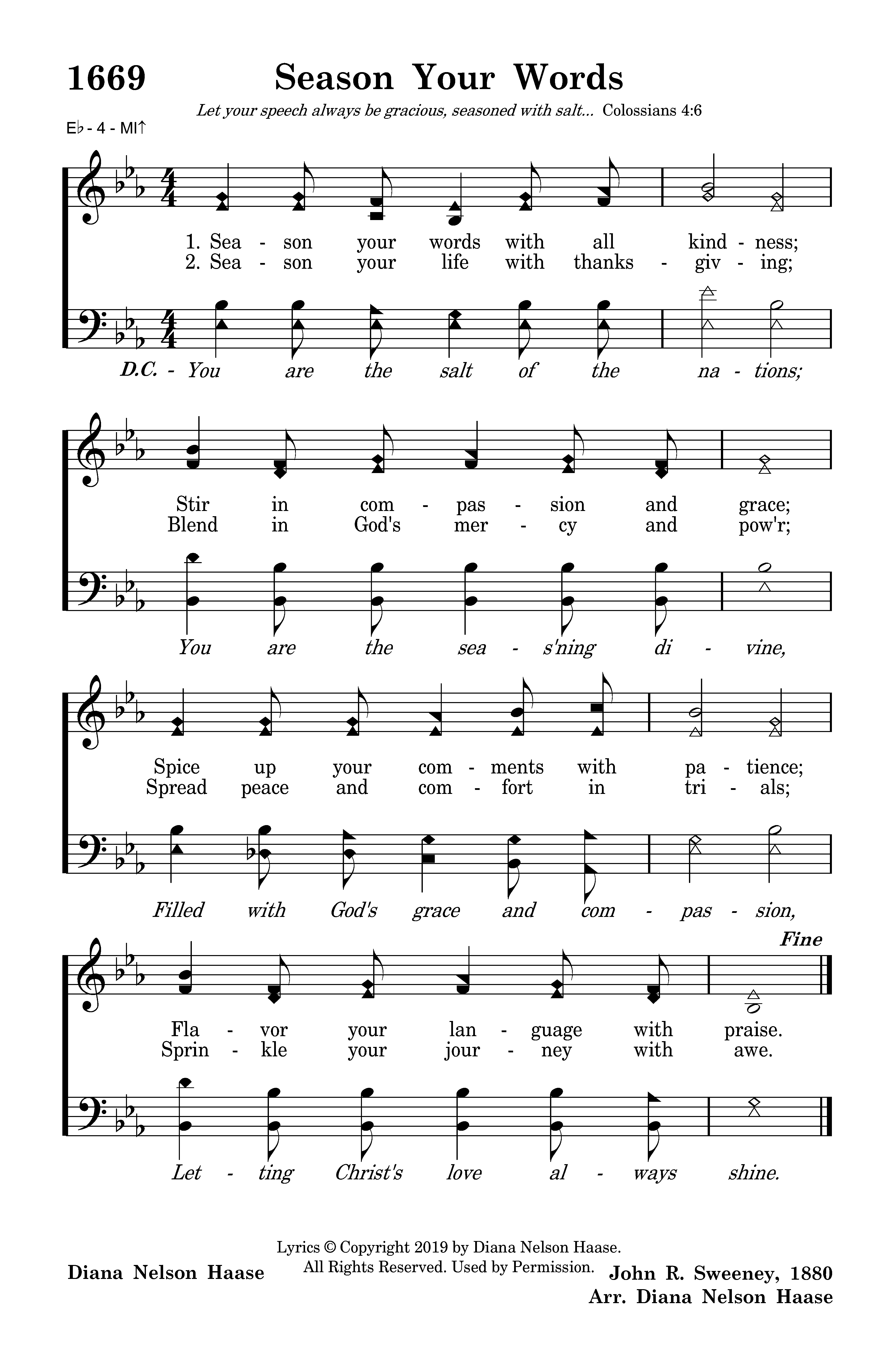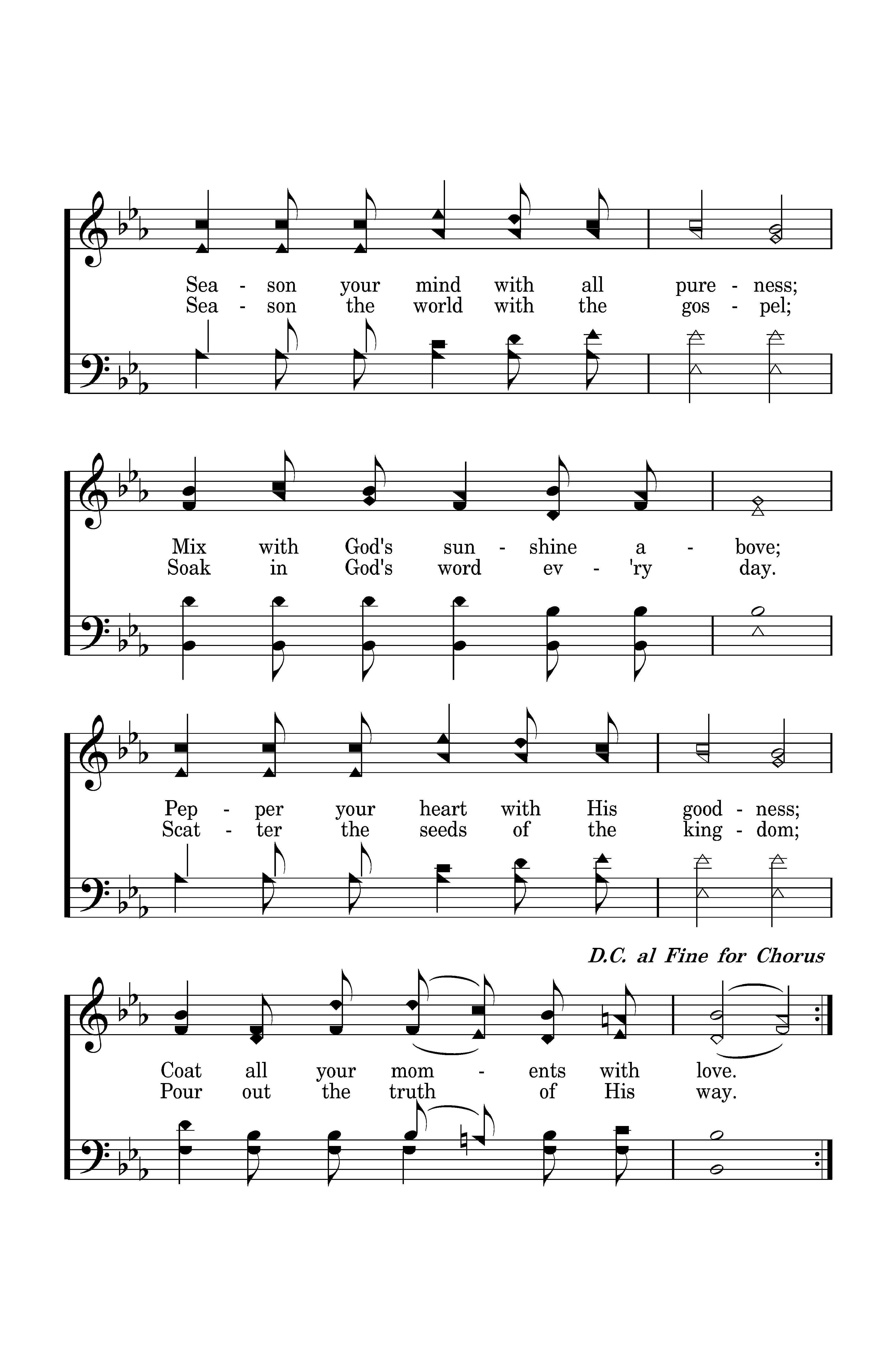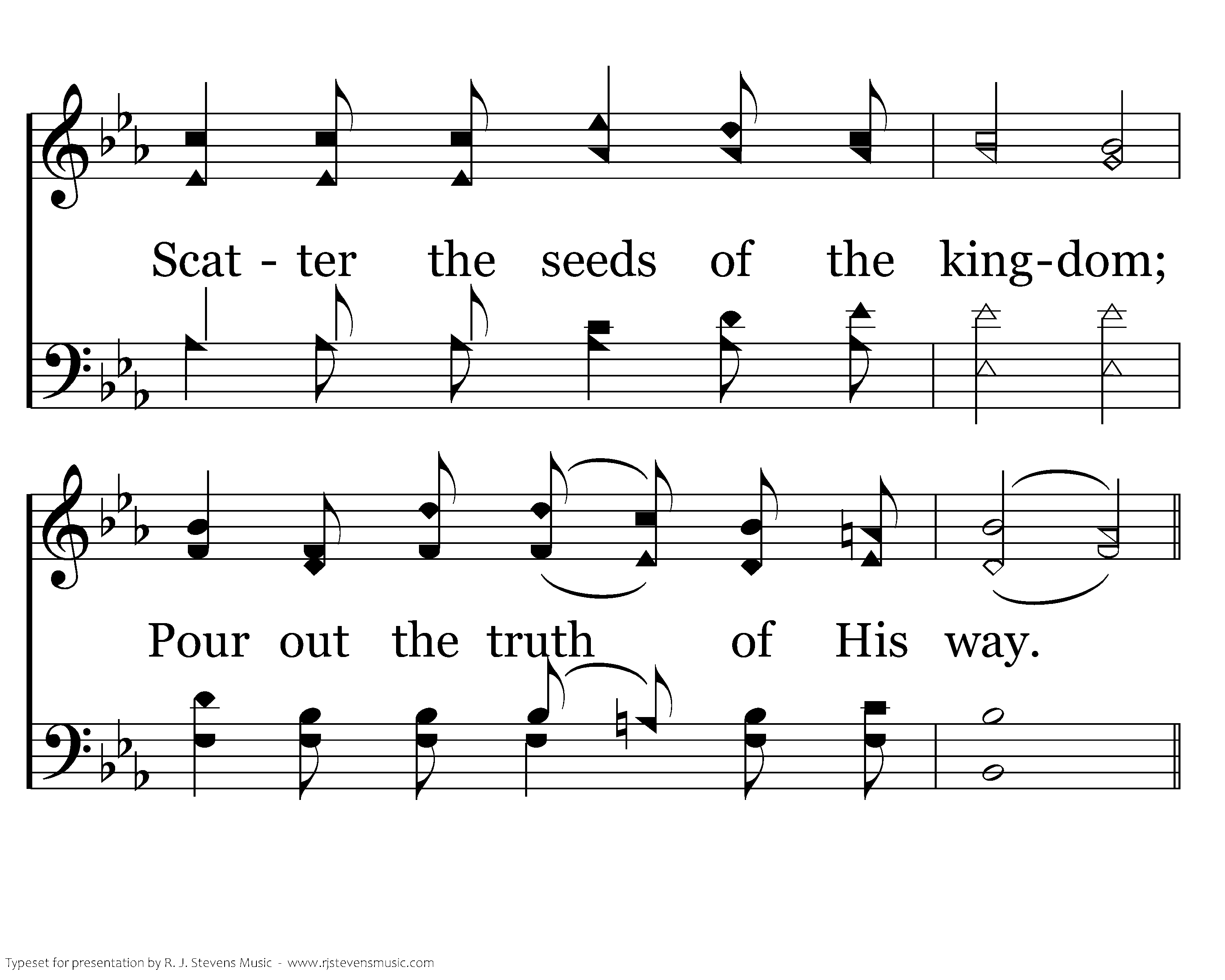 Season your life with thanksgiving; Blend in God's mercy and pow'r; Spread peace and comfort in trials; Sprinkle your journey with awe. Season the world with the gospel; Soak in God's word ev'ry day. Scatter the seeds of the kingdom; Pour out the truth of His way.
