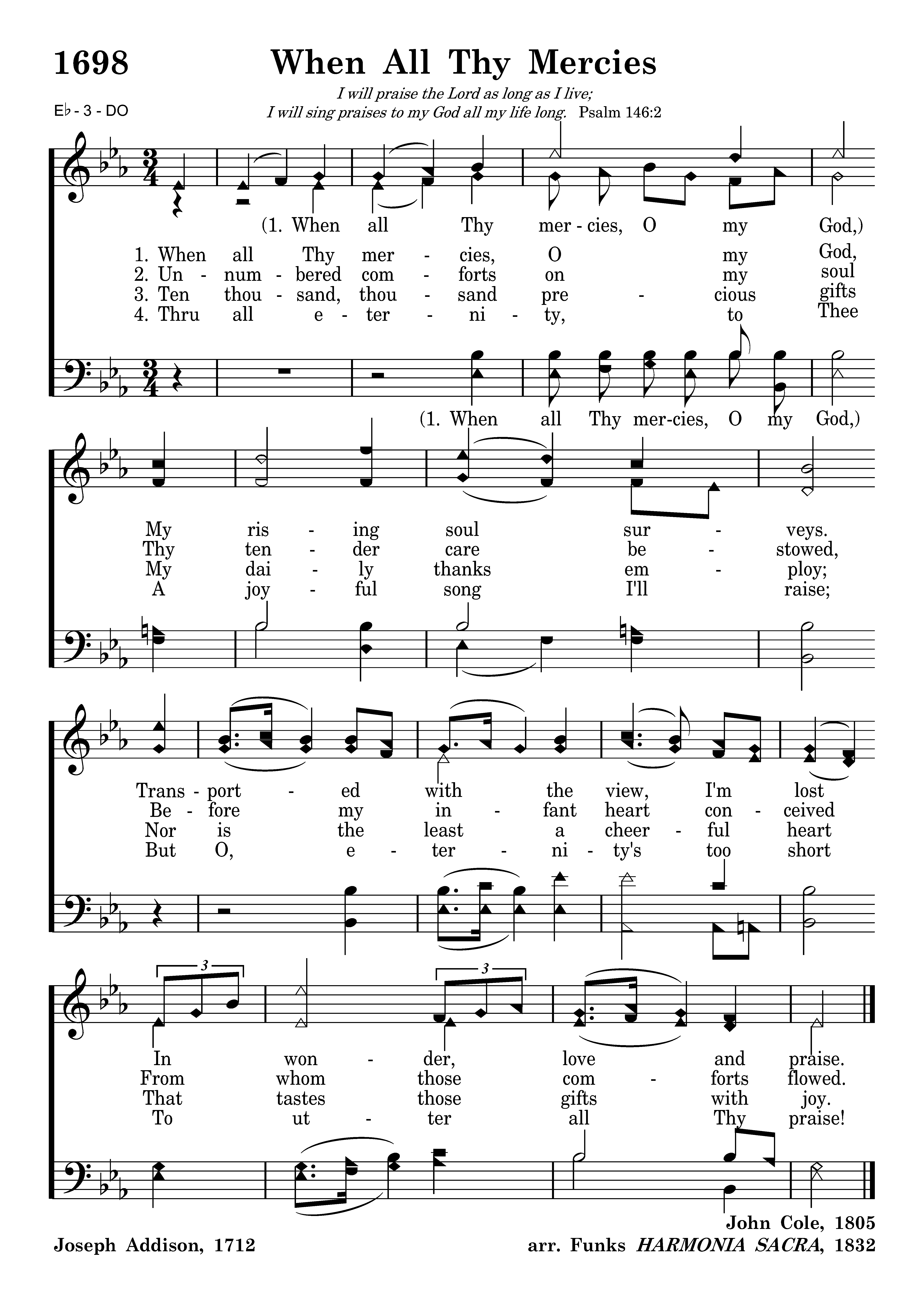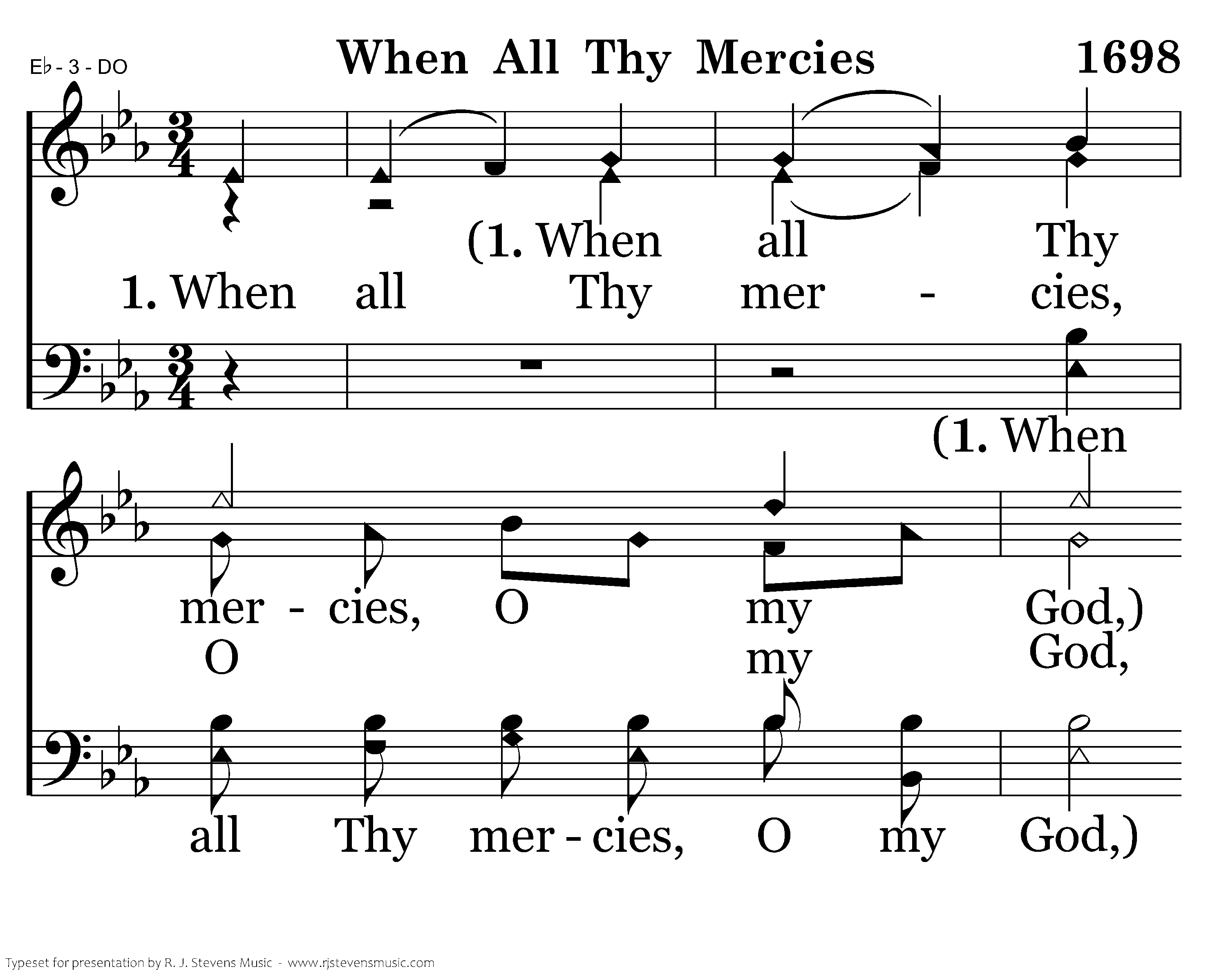 When all Thy mercies, O my God, My rising soul surveys. Transported with the view, I'm lost In wonder, love and praise.