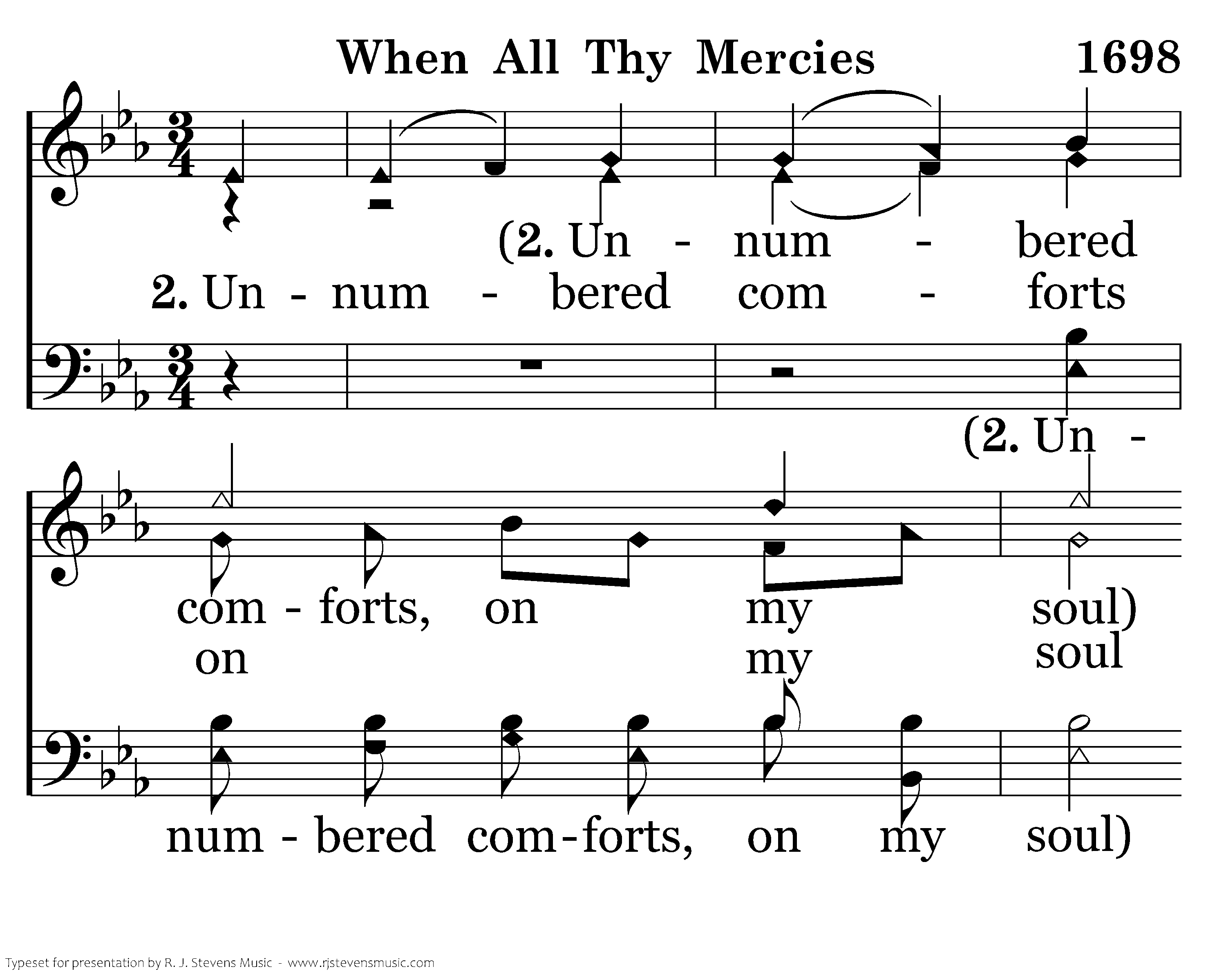 Unnumbered comforts on my soul Thy tender care bestowed, Before my infant heart conceived From whom those comforts flowed.