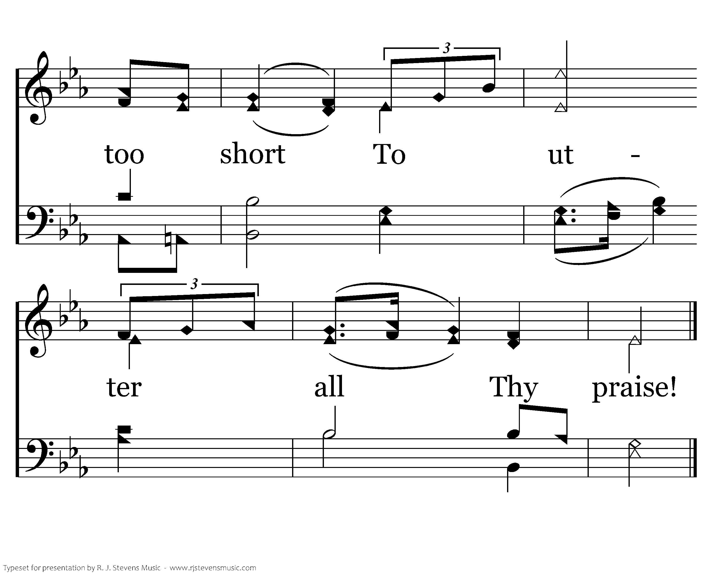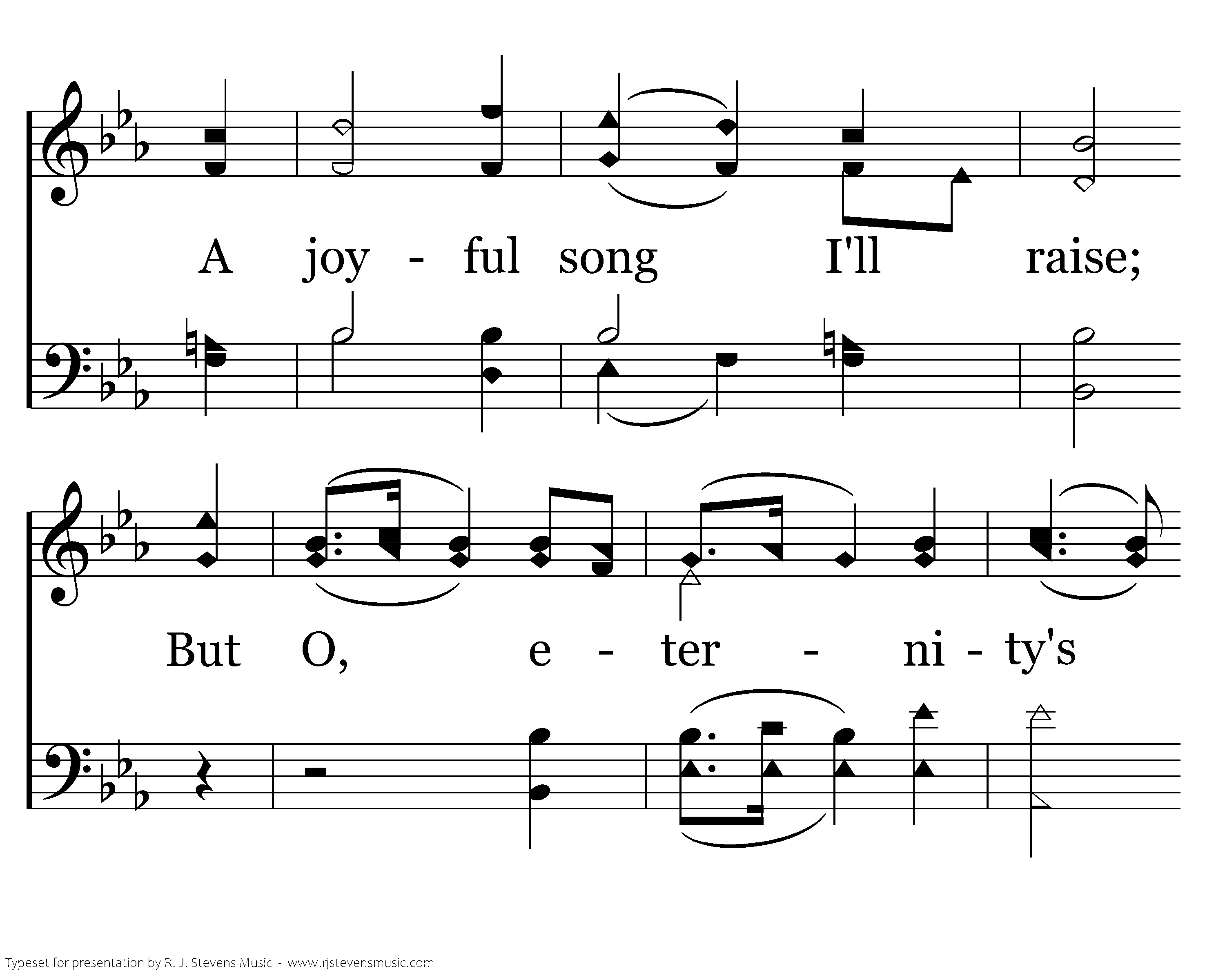 Thru all eternity, to Thee A joyful song I'll raise; But O, eternity's too short To utter all Thy praise!