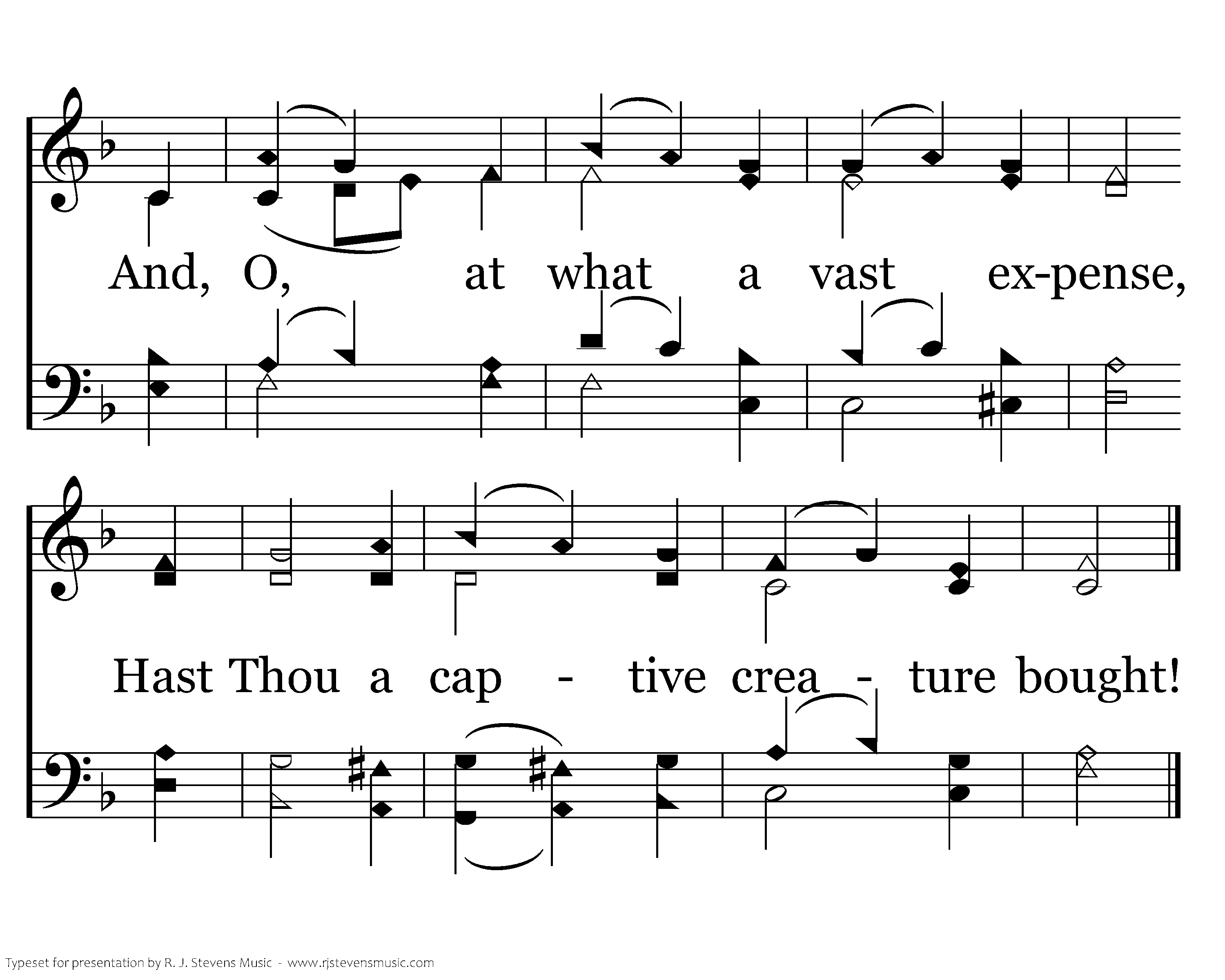 I was a slave to sin and sense, Had sold my precious soul for nought; And, O, at what a vast expense, Hast Thou a captive creature bought!