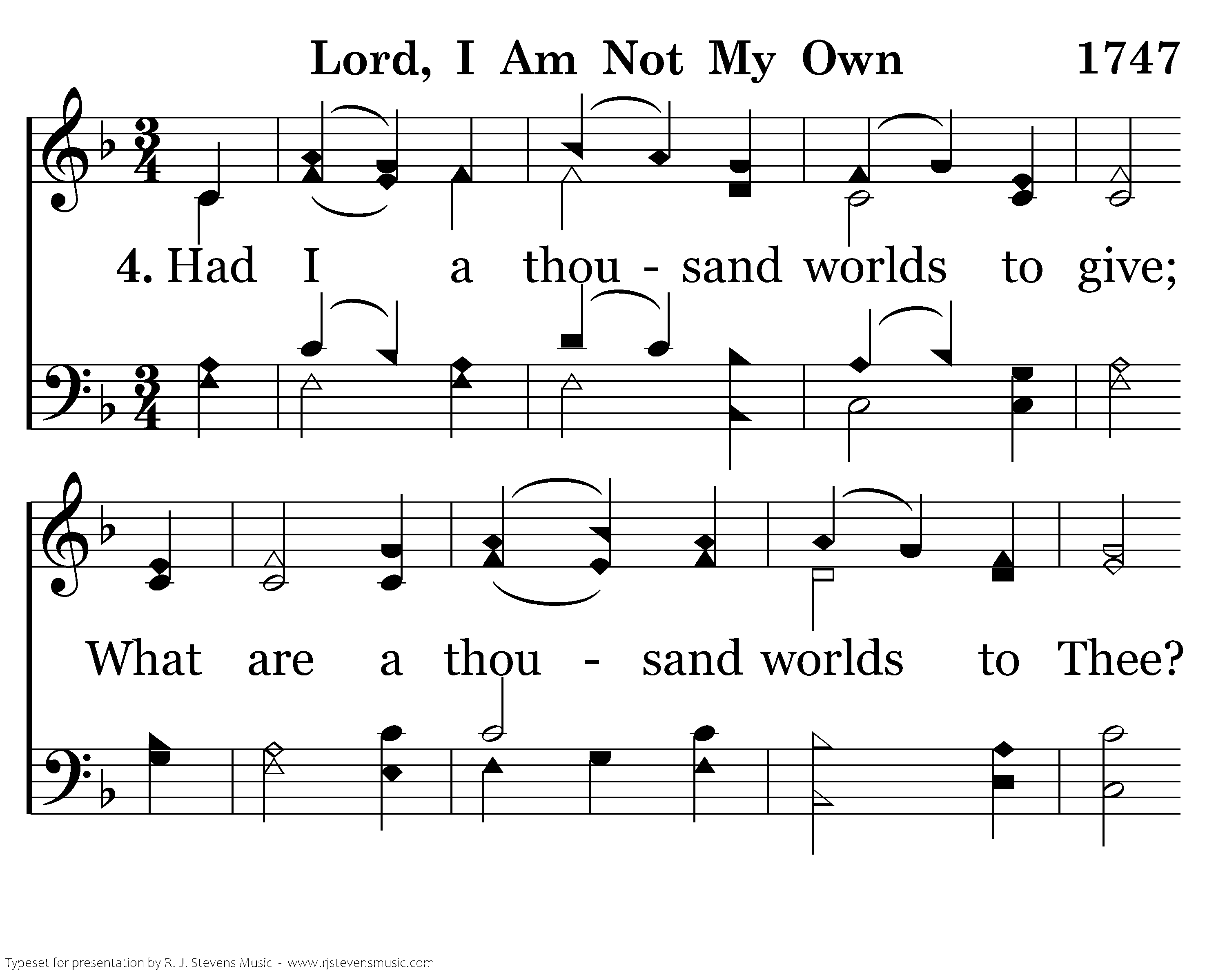 Had I a thousand worlds to give; What are a thousand worlds to Thee? O! let me to Thy honor live, Till I Thy face in glory see.