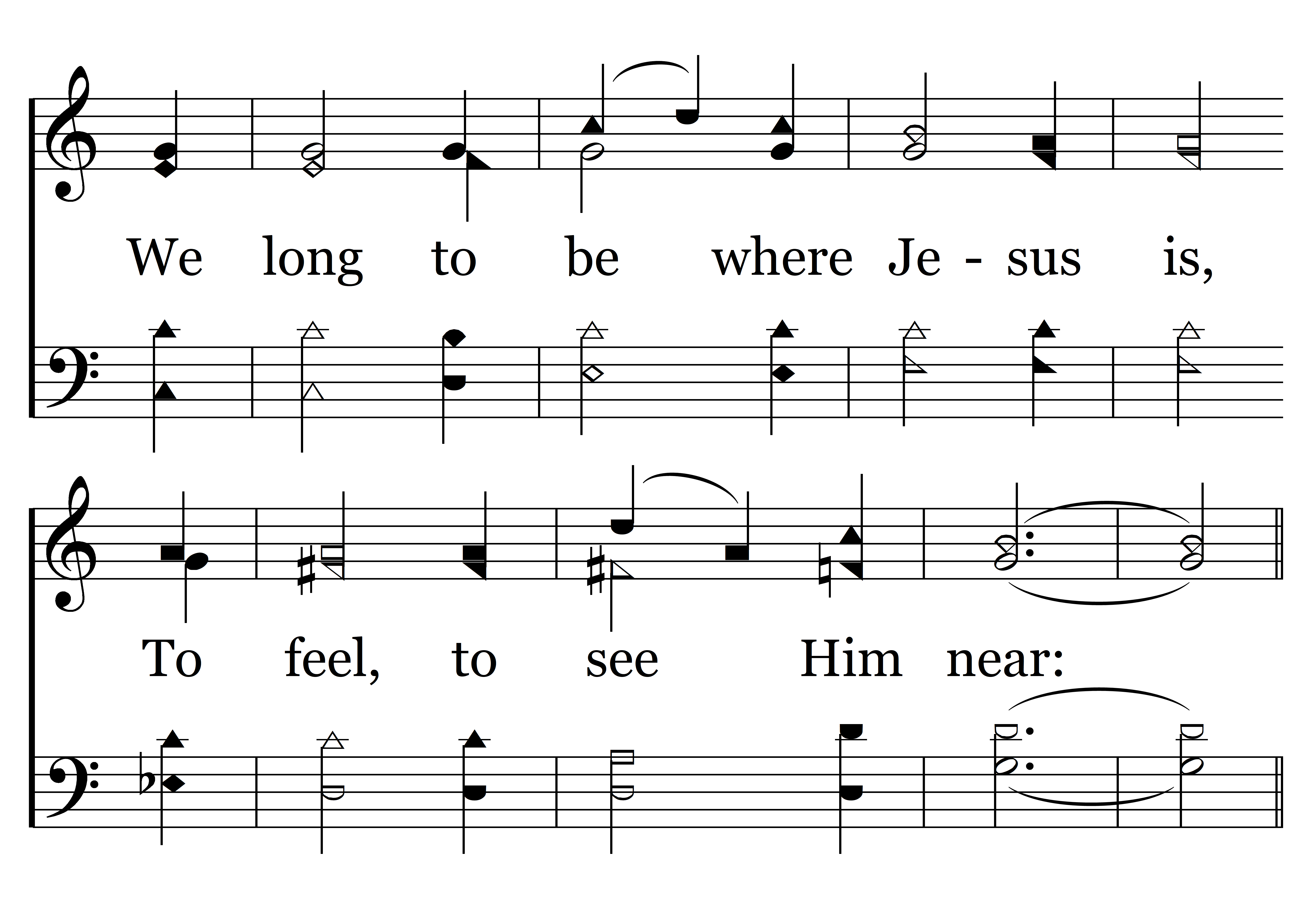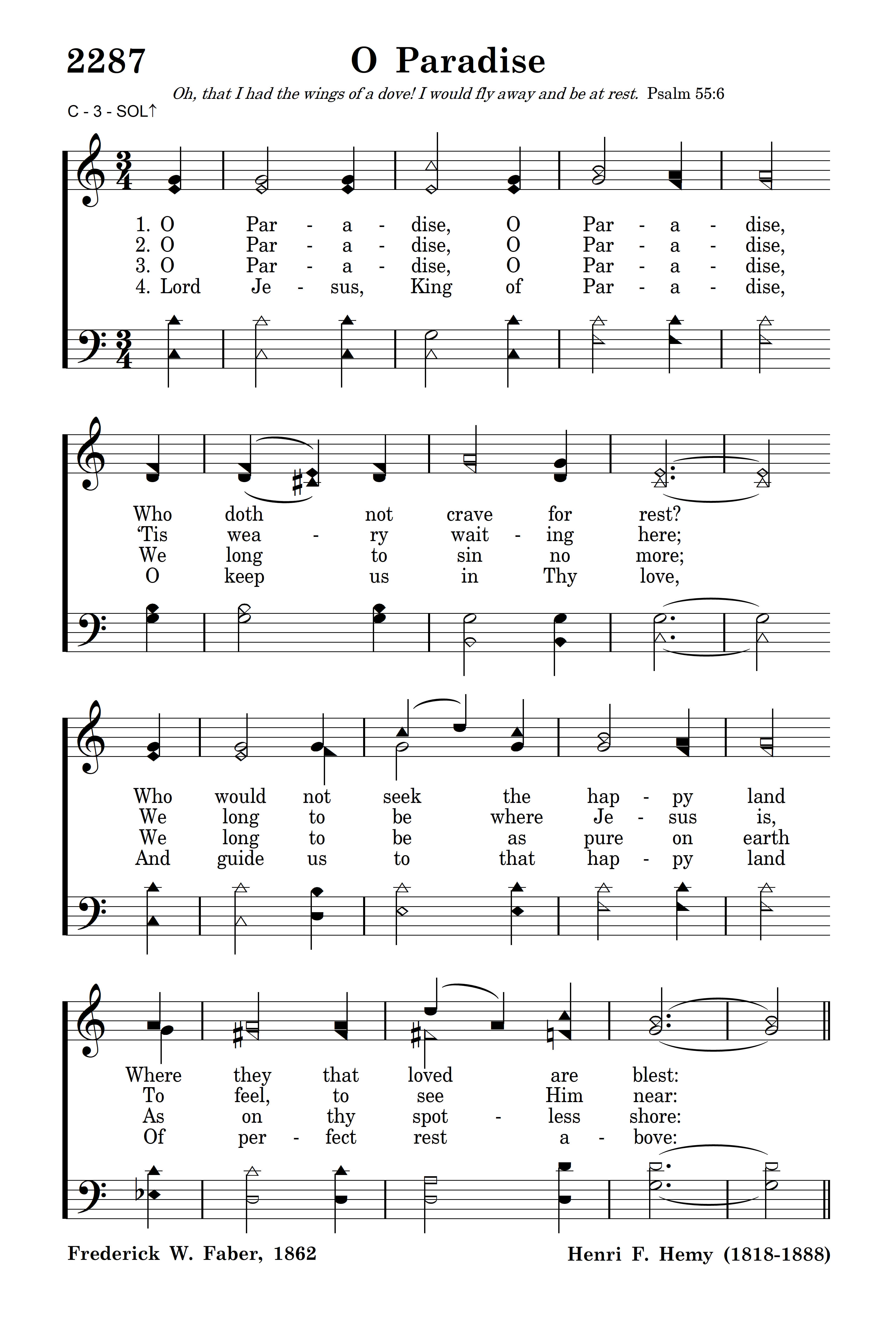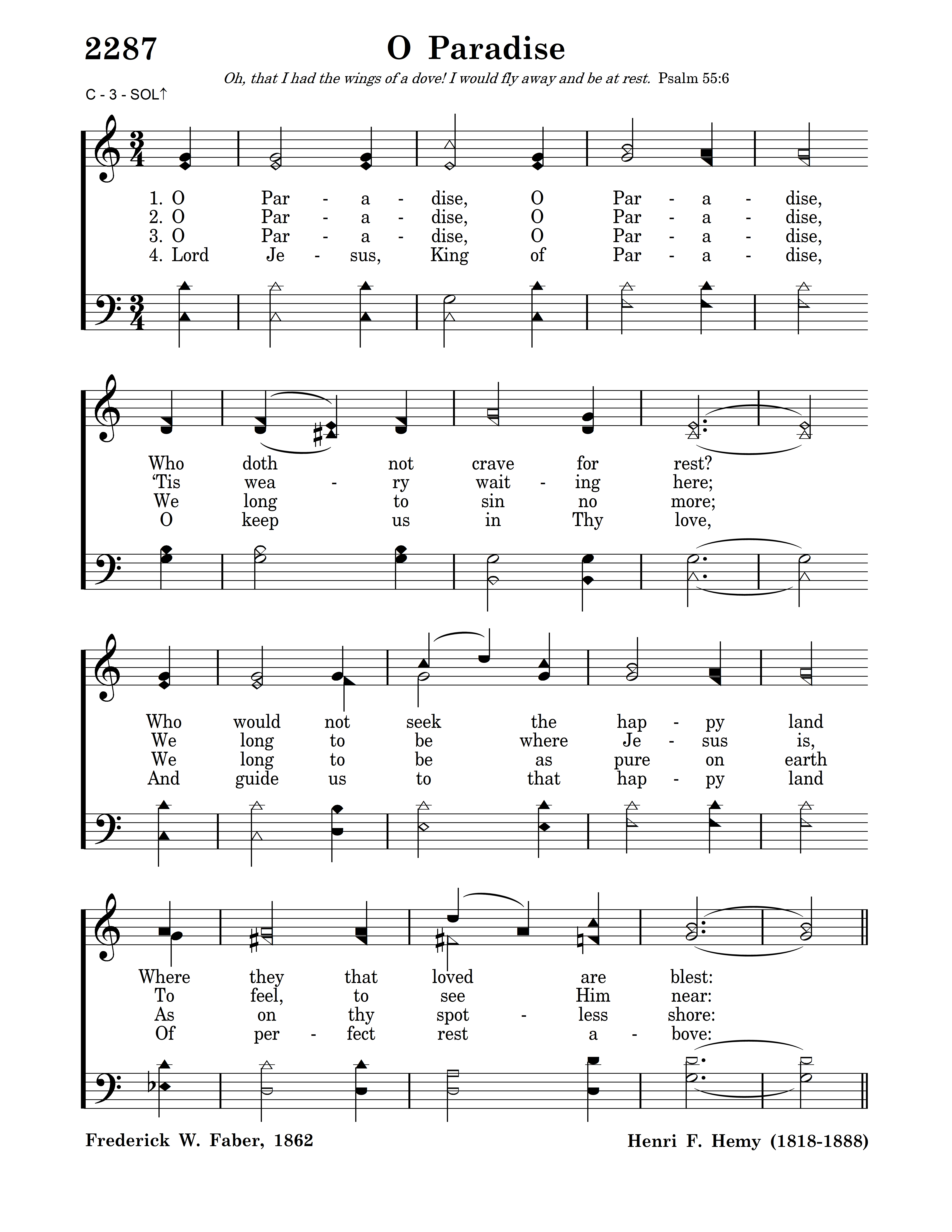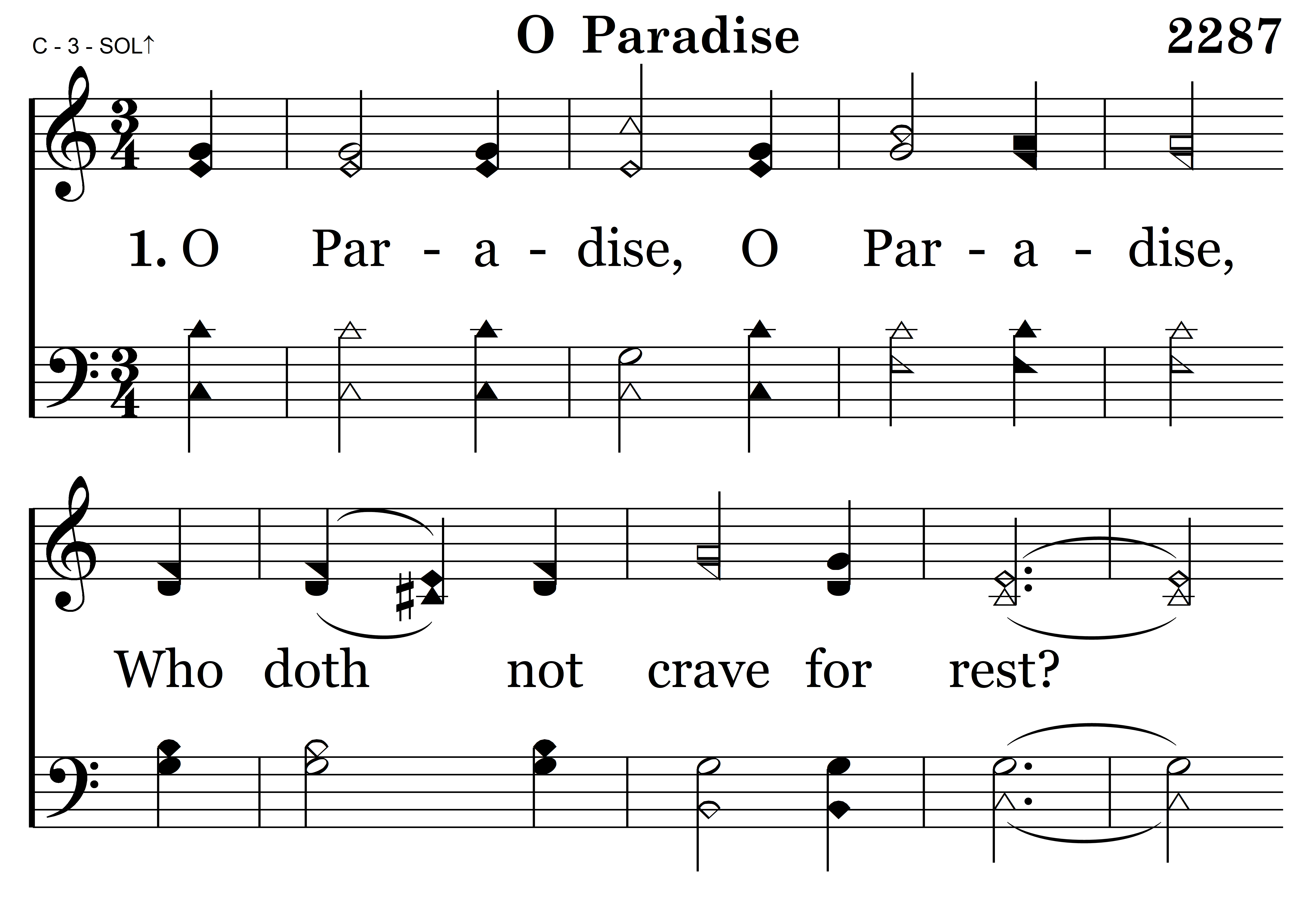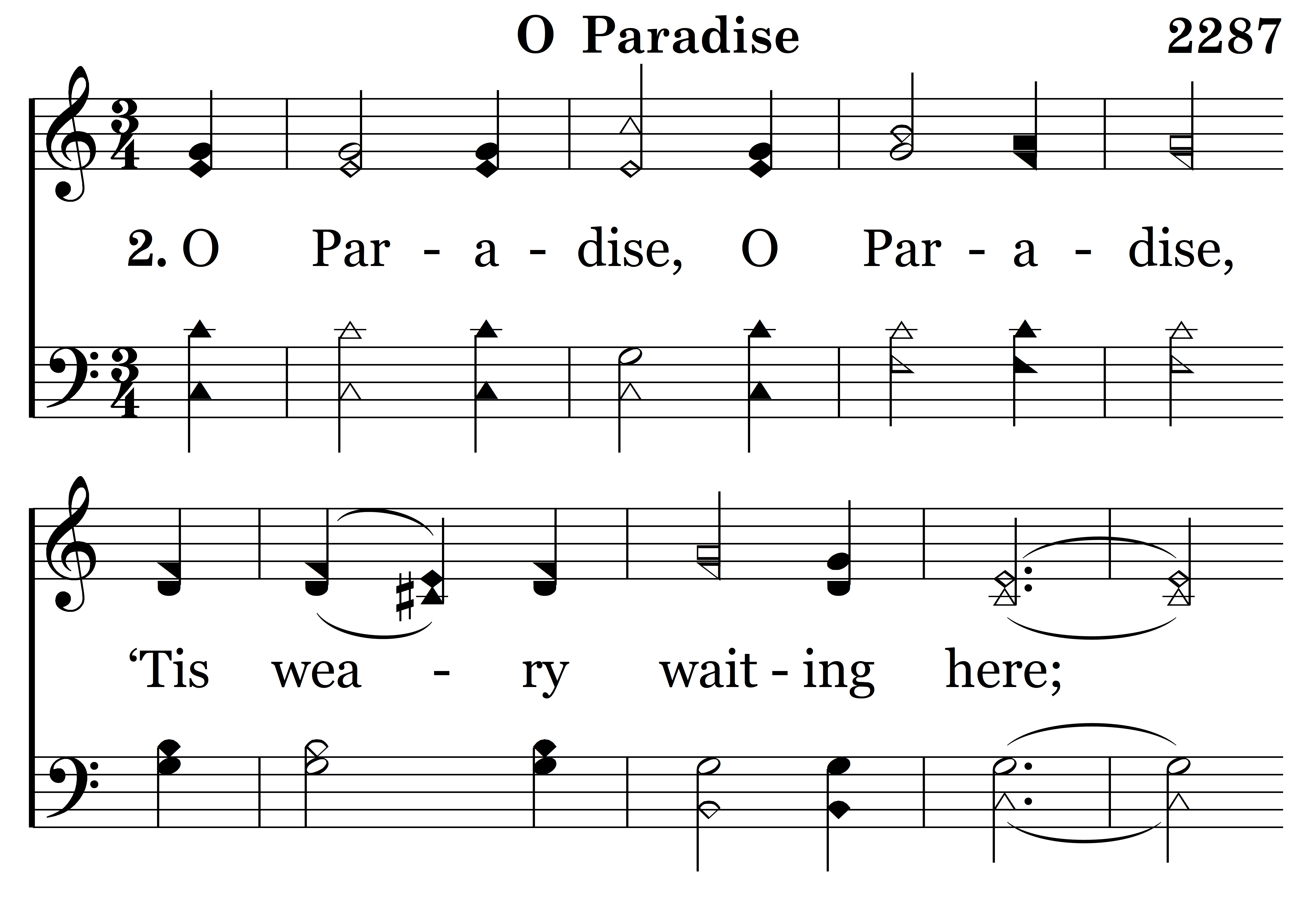 O Paradise, O Paradise, ‘Tis weary waiting here; We long to be where Jesus is, To feel, to see Him near: