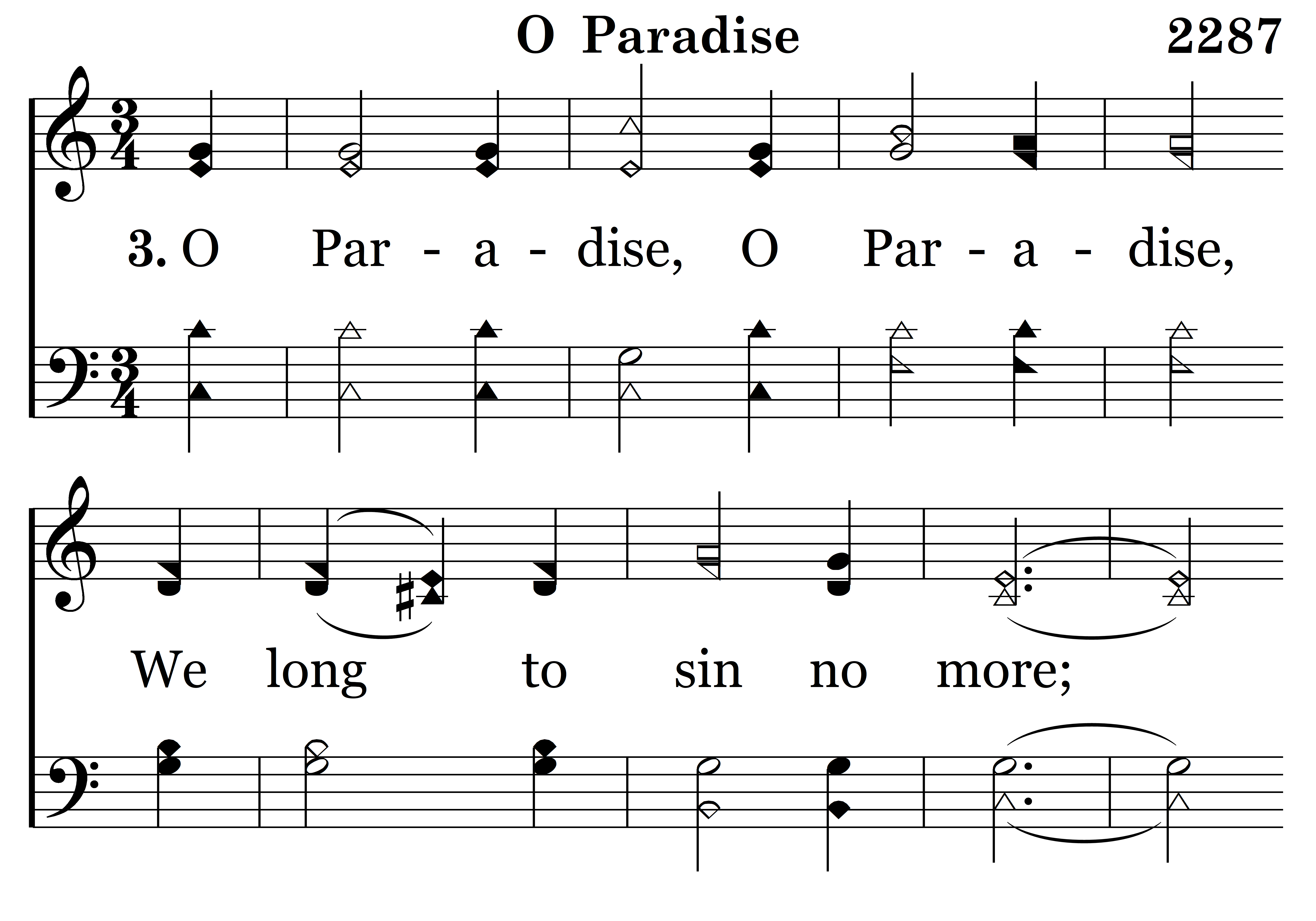 O Paradise, O Paradise, We long to sin no more; We long to be as pure on earth As on thy spotless shore: