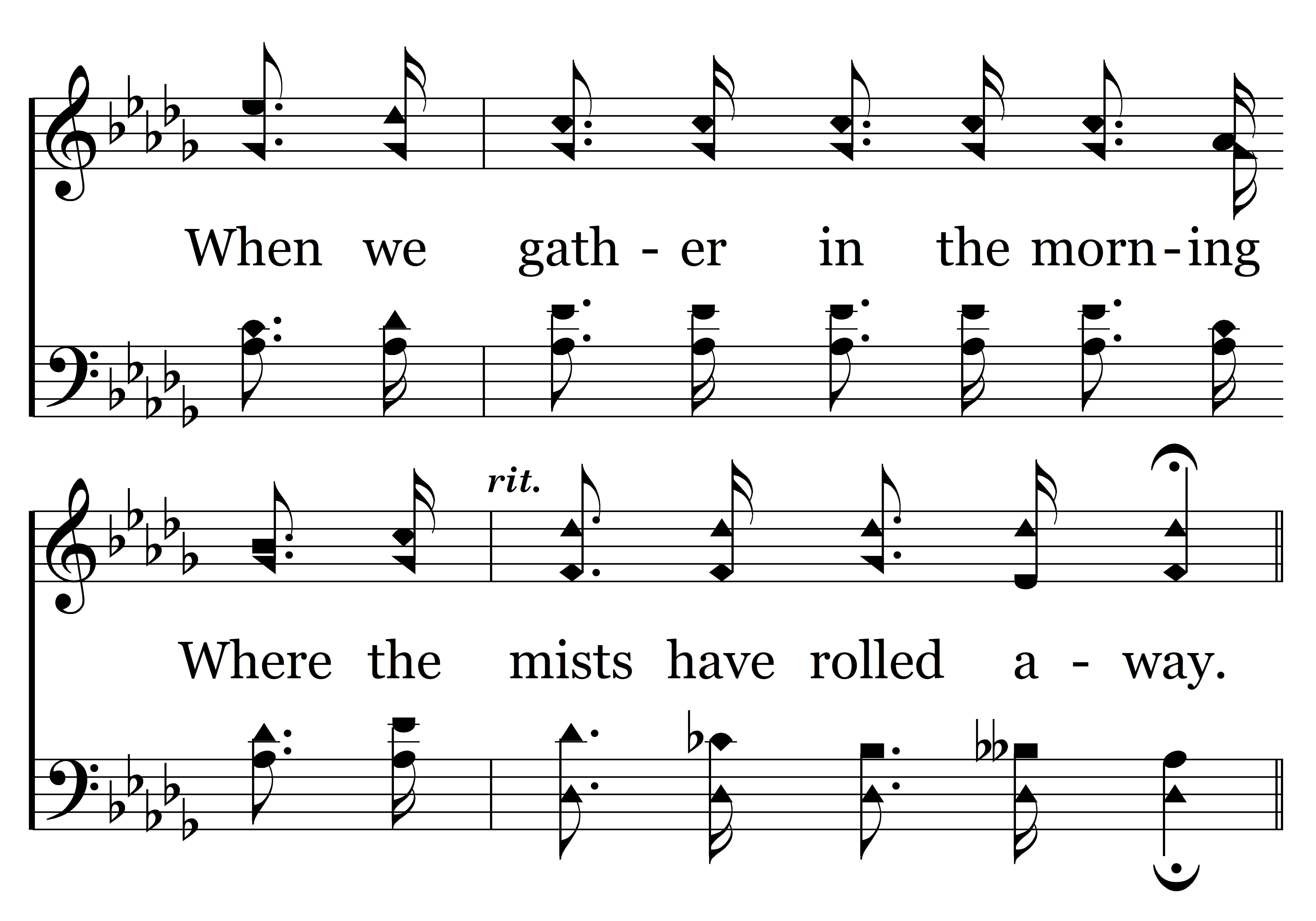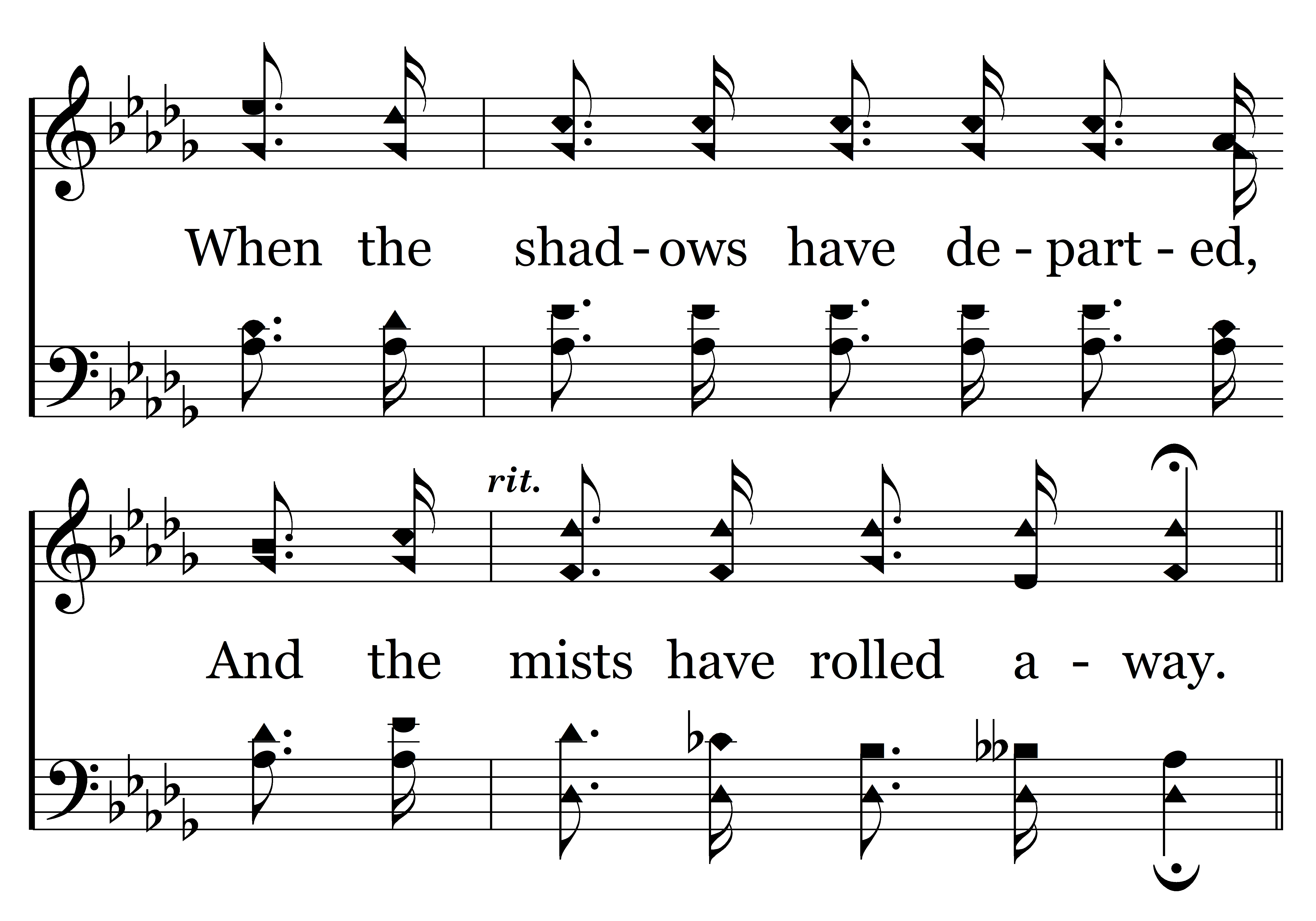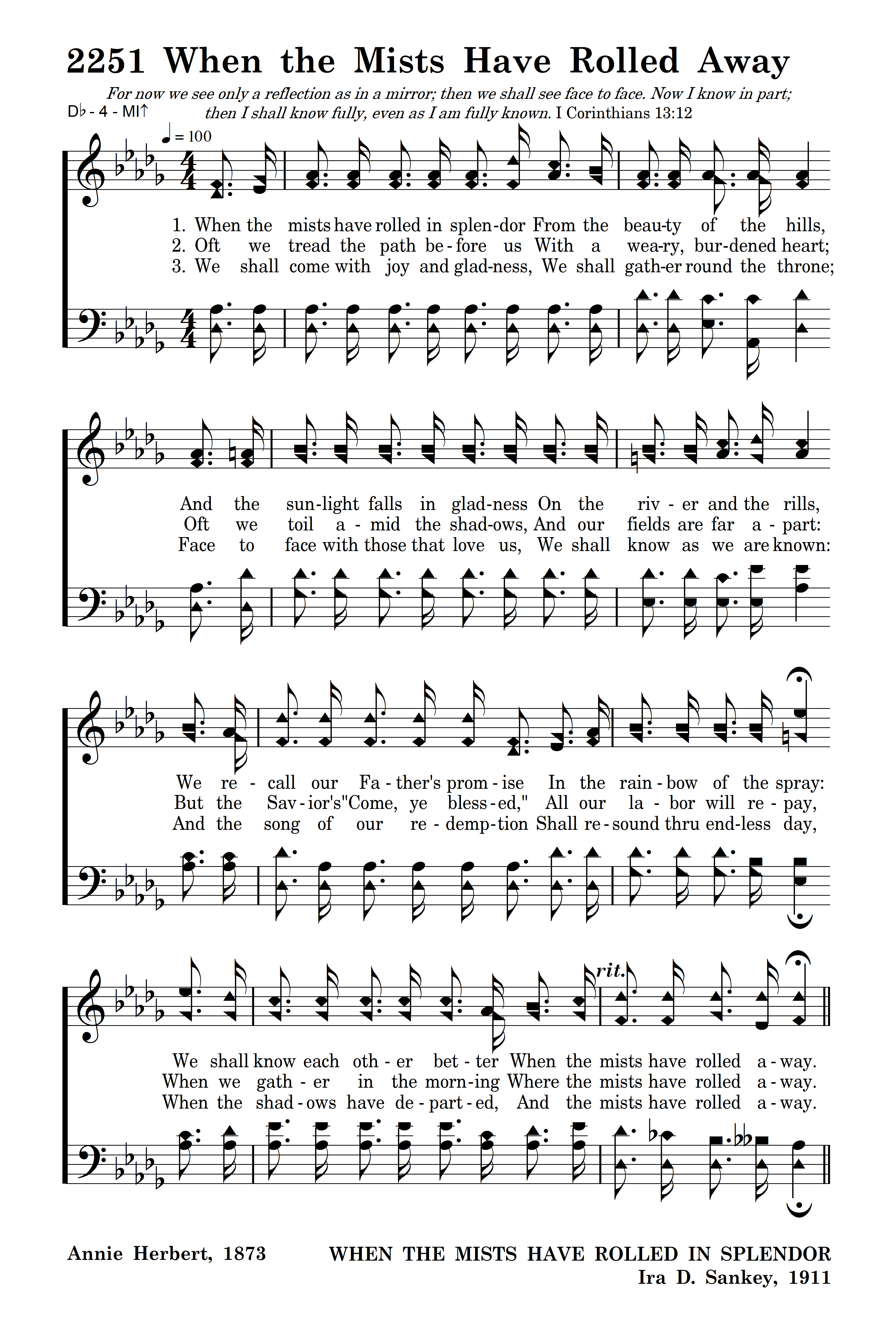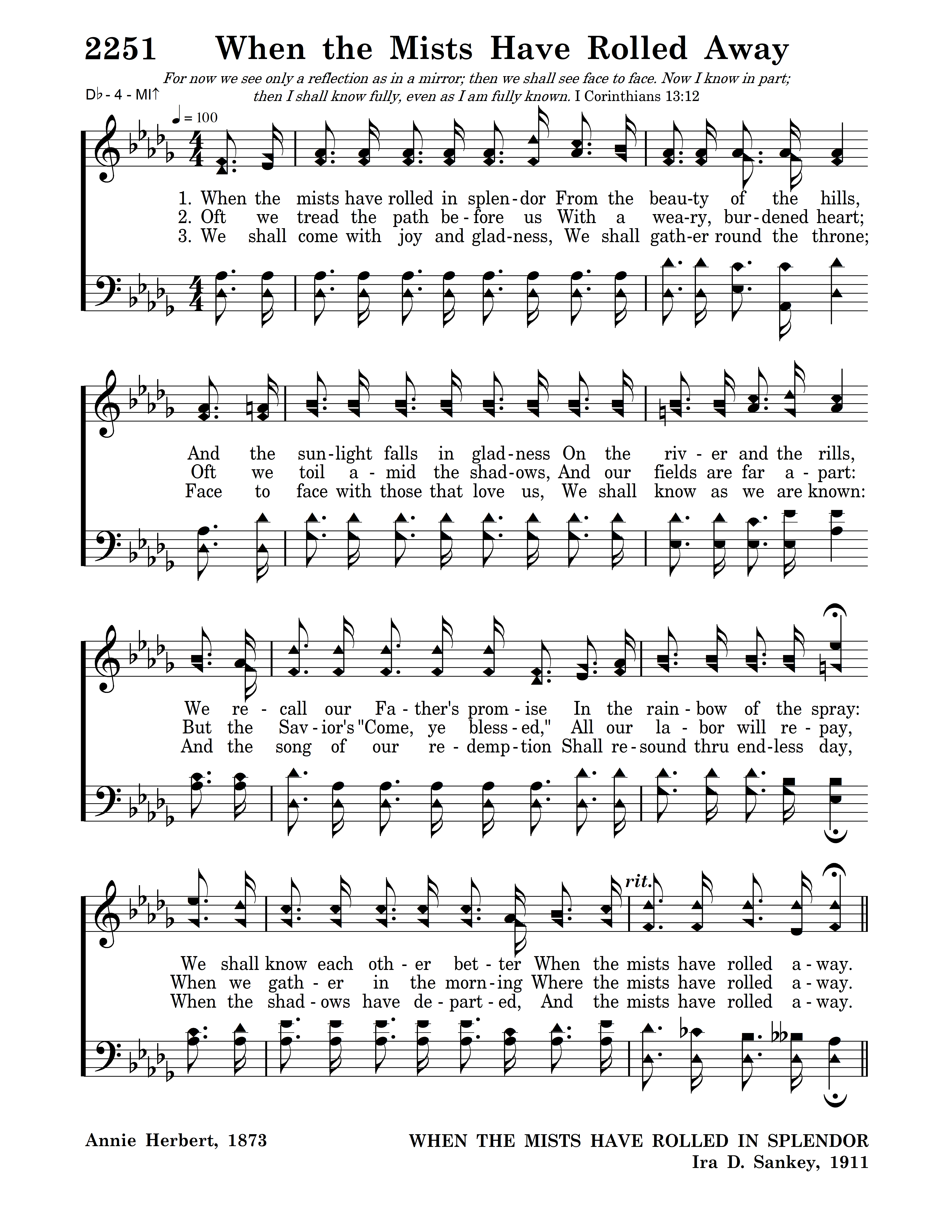 When the mists have rolled in splendor From the beauty of the hills, And the sunlight falls in gladness On the river and the rills, We recall our Father's promise In the rainbow of the spray: We shall know each other better When the mists have rolled away.