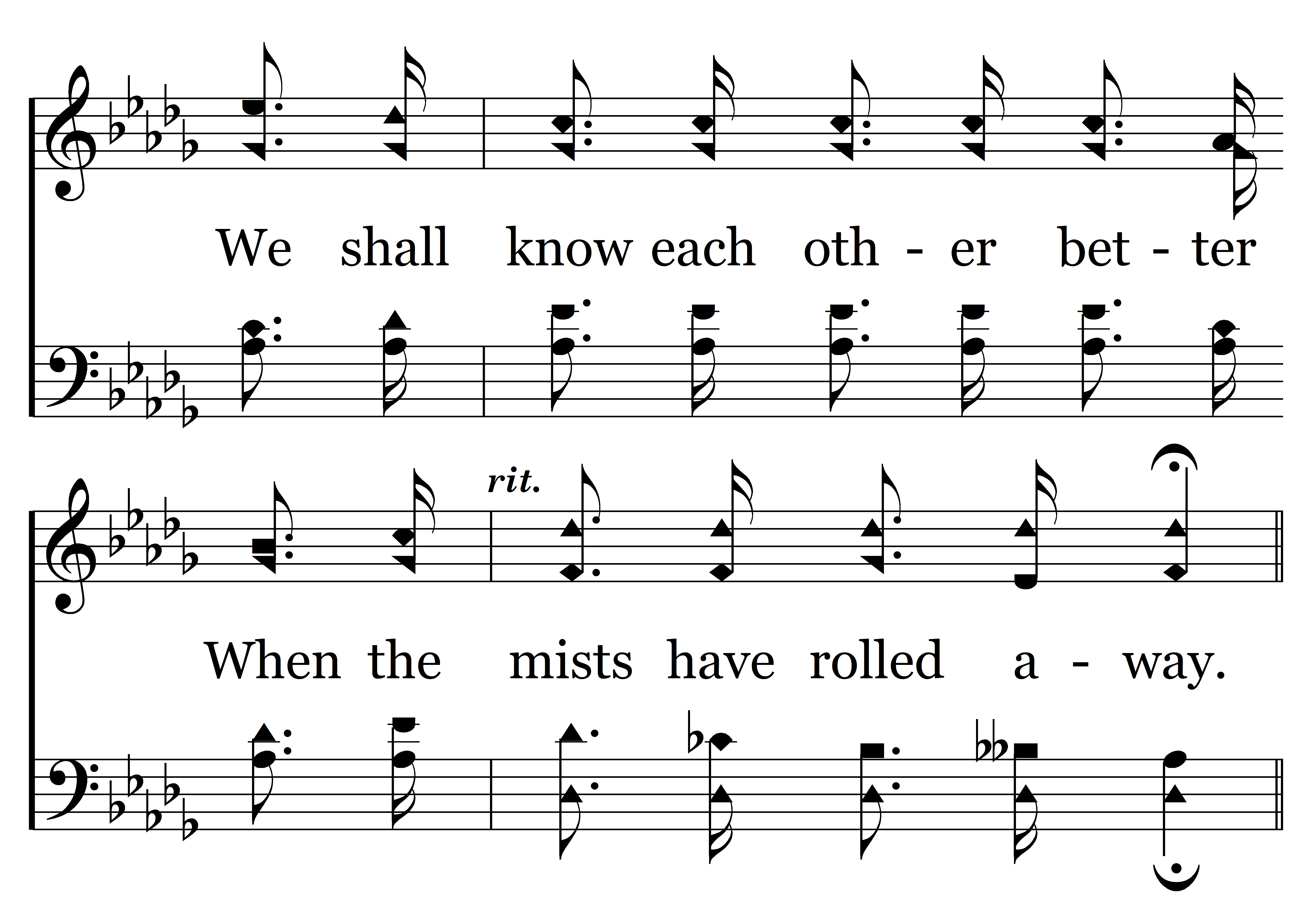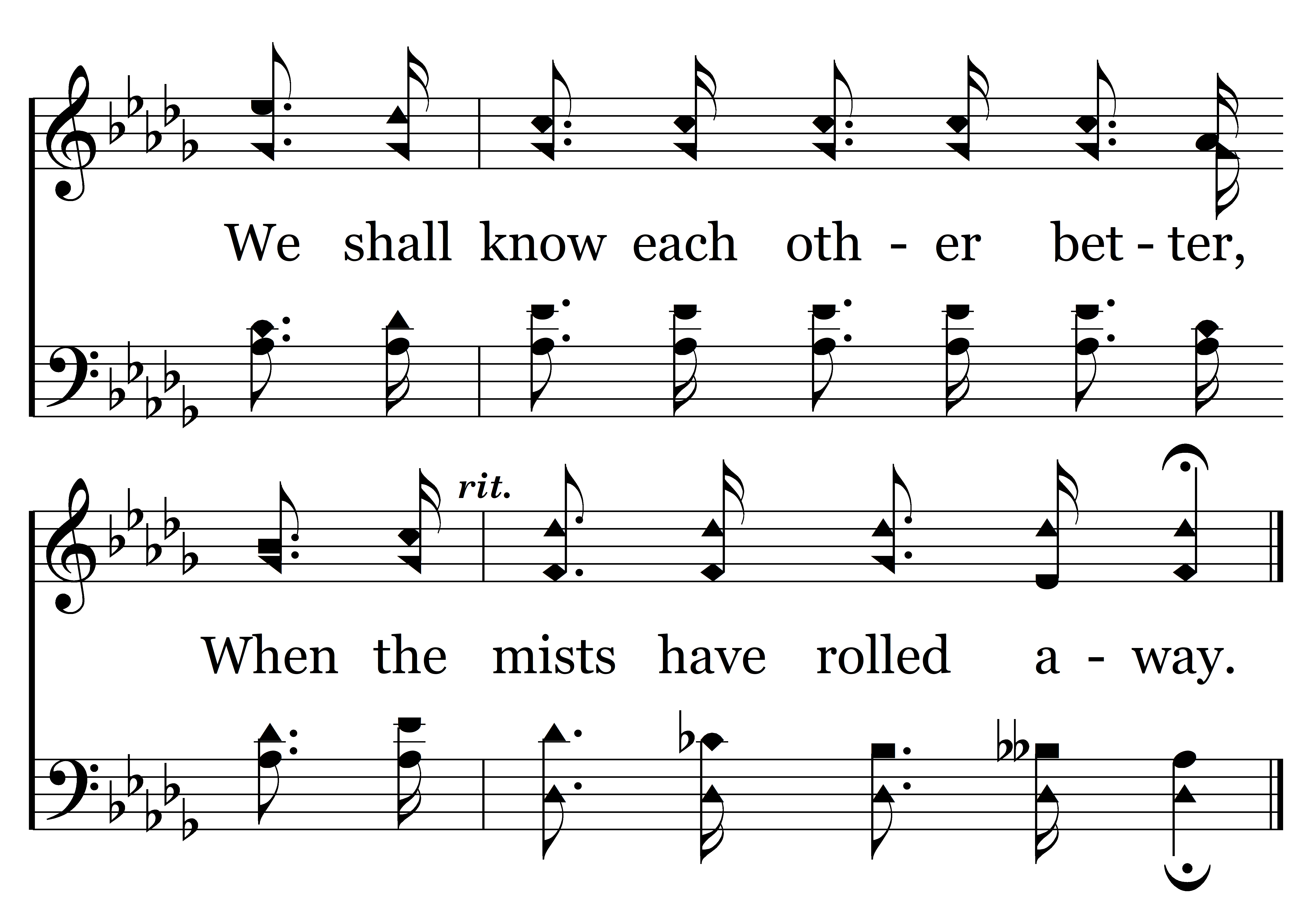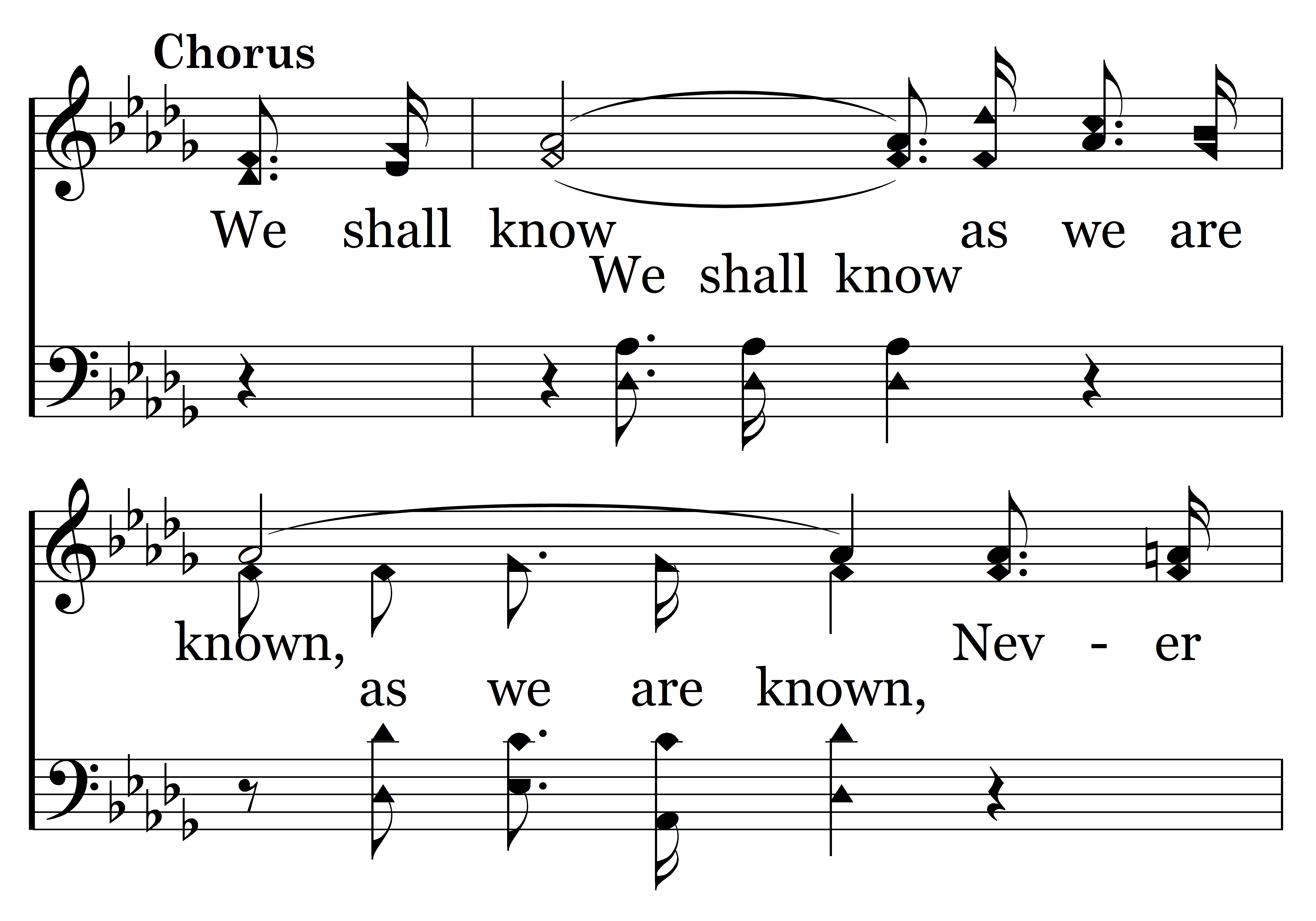 We shall know (We shall know) as we are known, (as we are known,) Never more (Never more) to walk alone; (to walk alone;) In the dawning of the morning Of that bright and happy day. We shall know each other better, When the mists have rolled away.