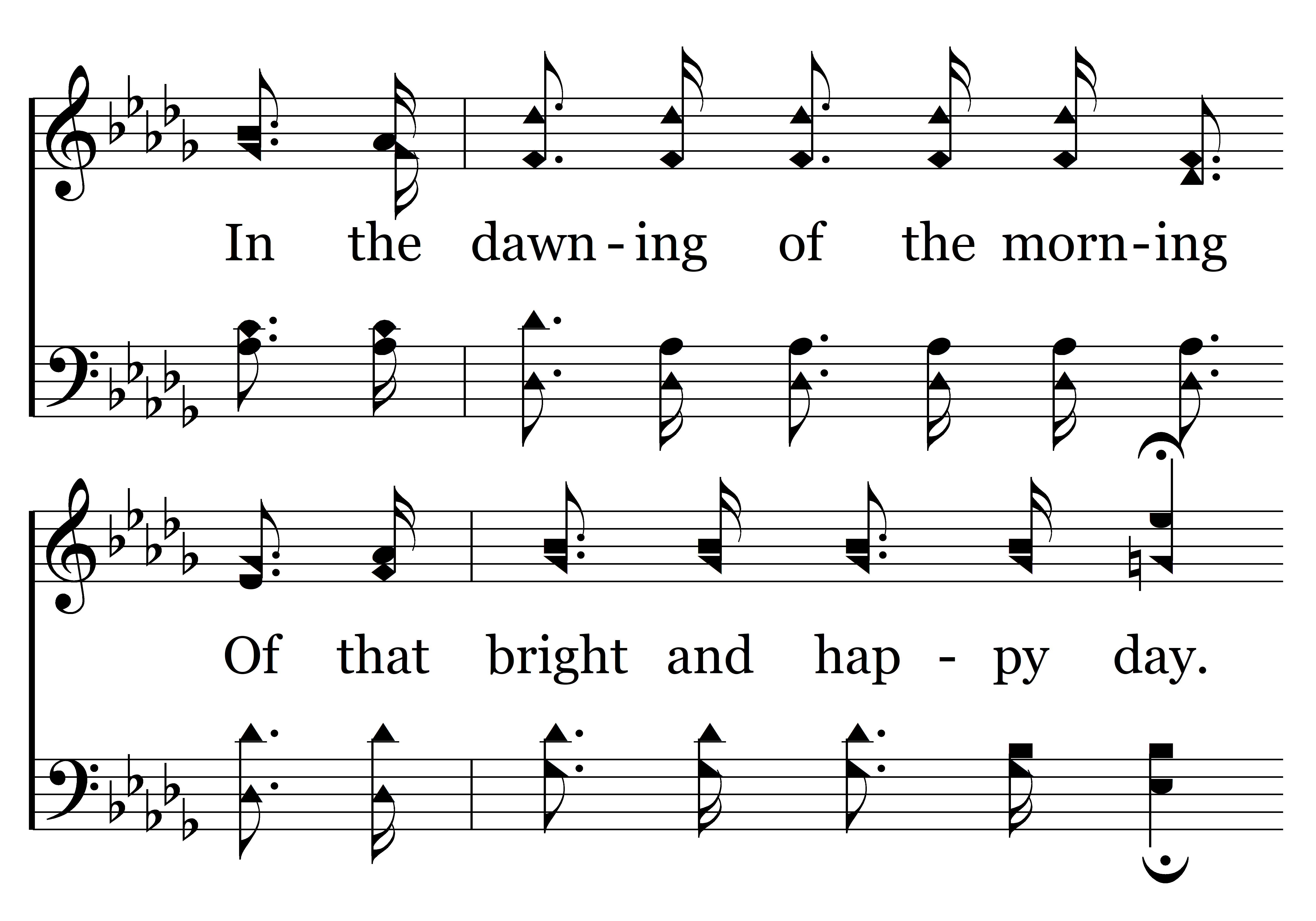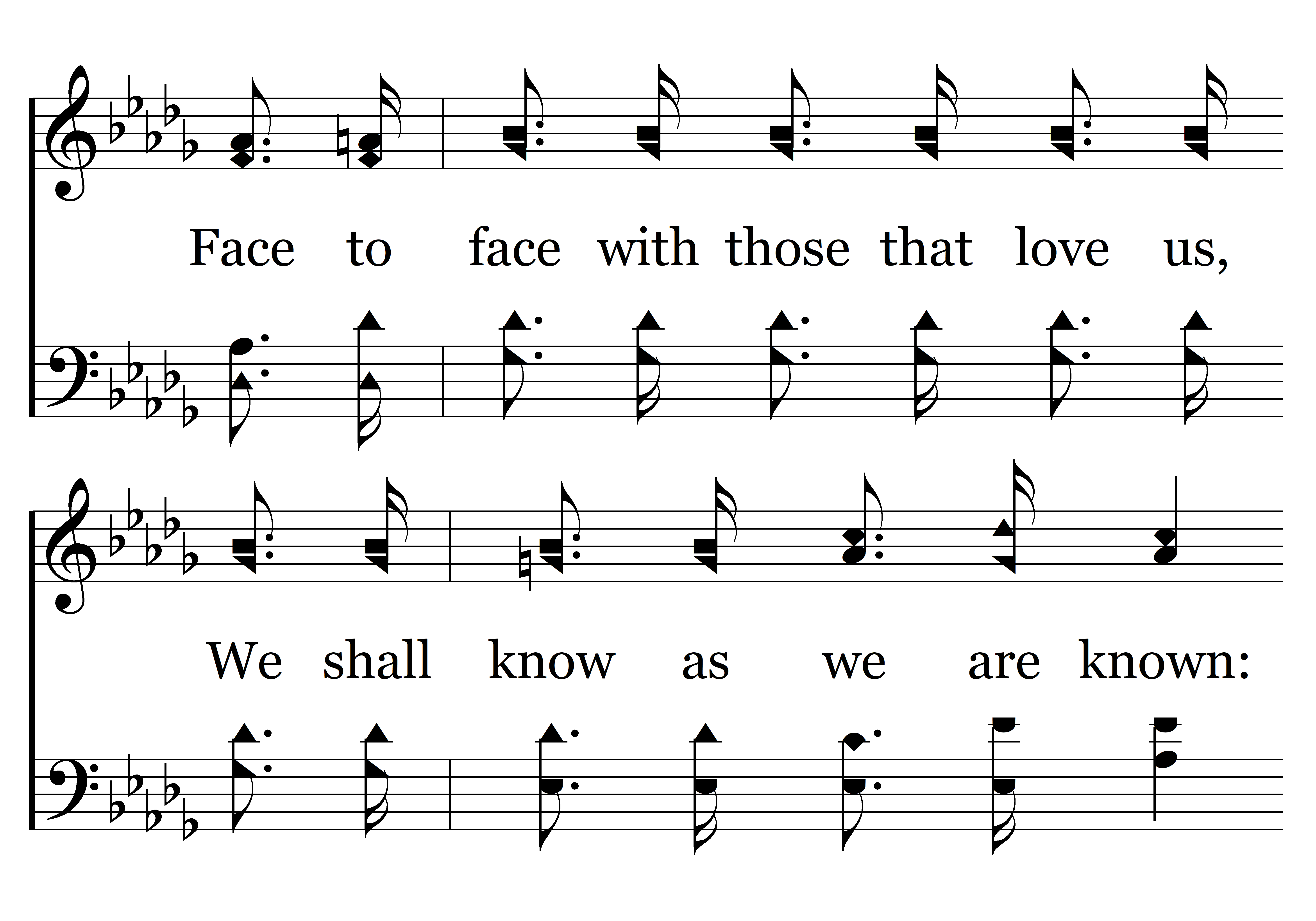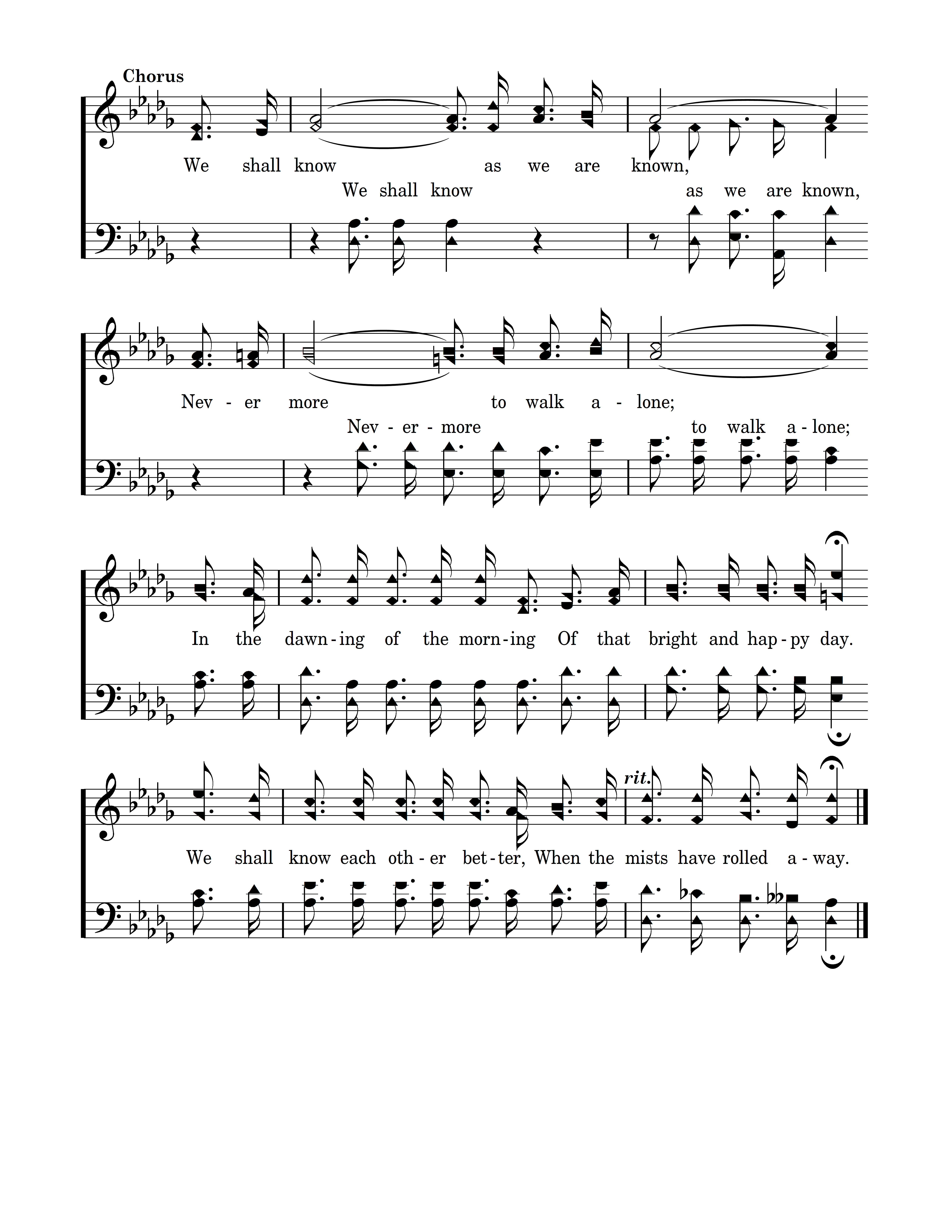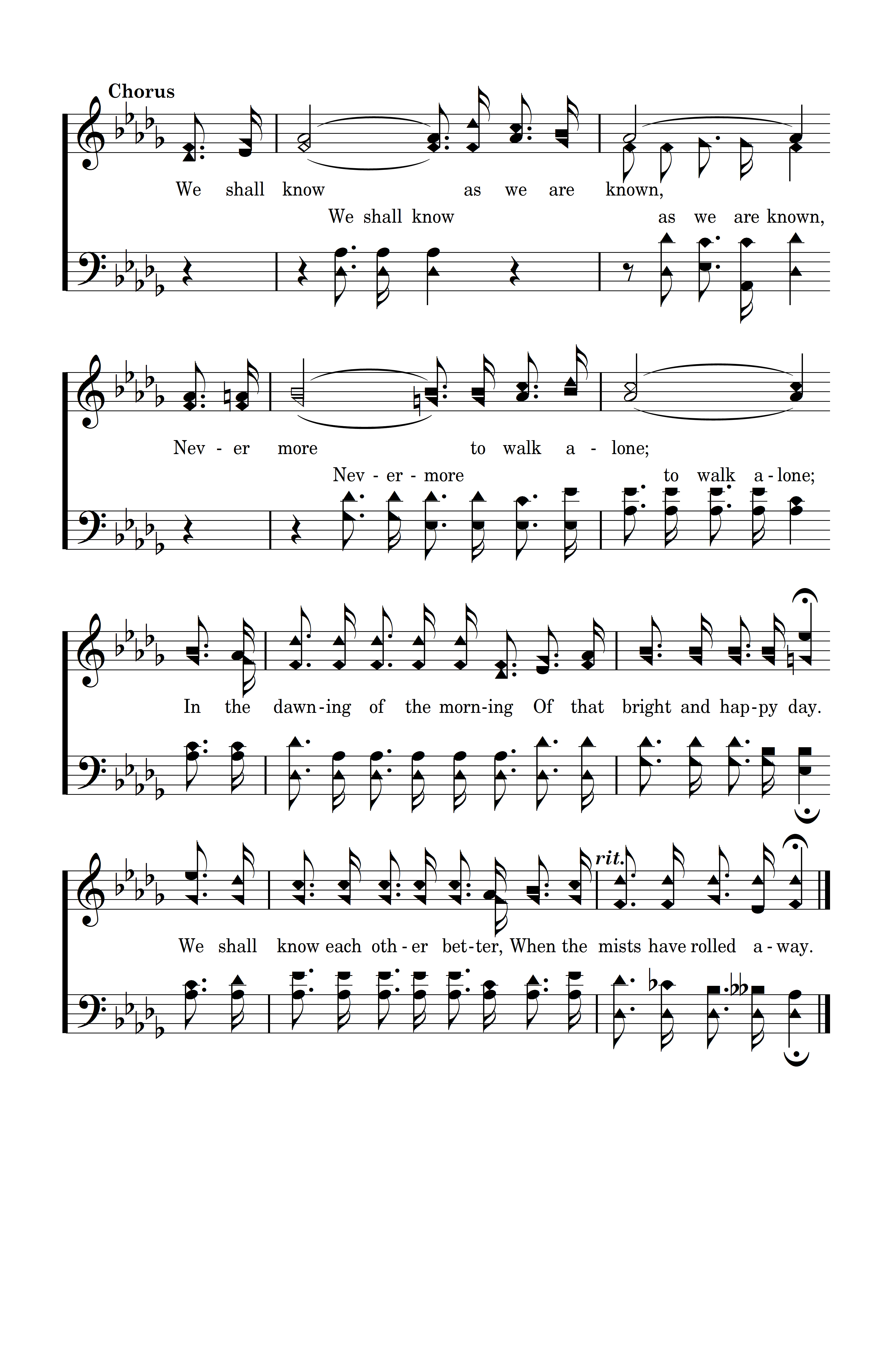 We shall know (We shall know) as we are known, (as we are known,) Never more (Never more) to walk alone; (to walk alone;) In the dawning of the morning Of that bright and happy day. We shall know each other better, When the mists have rolled away.