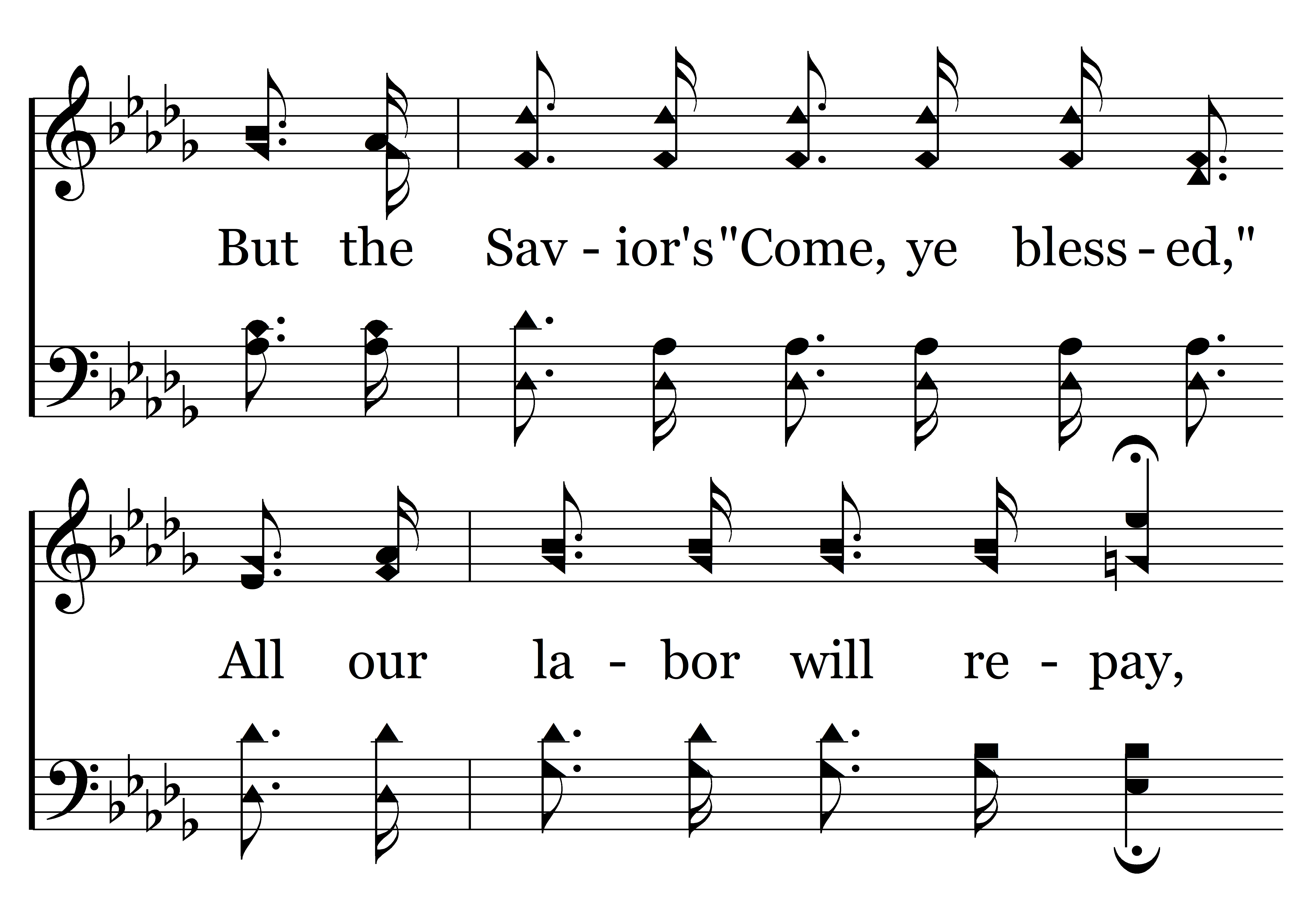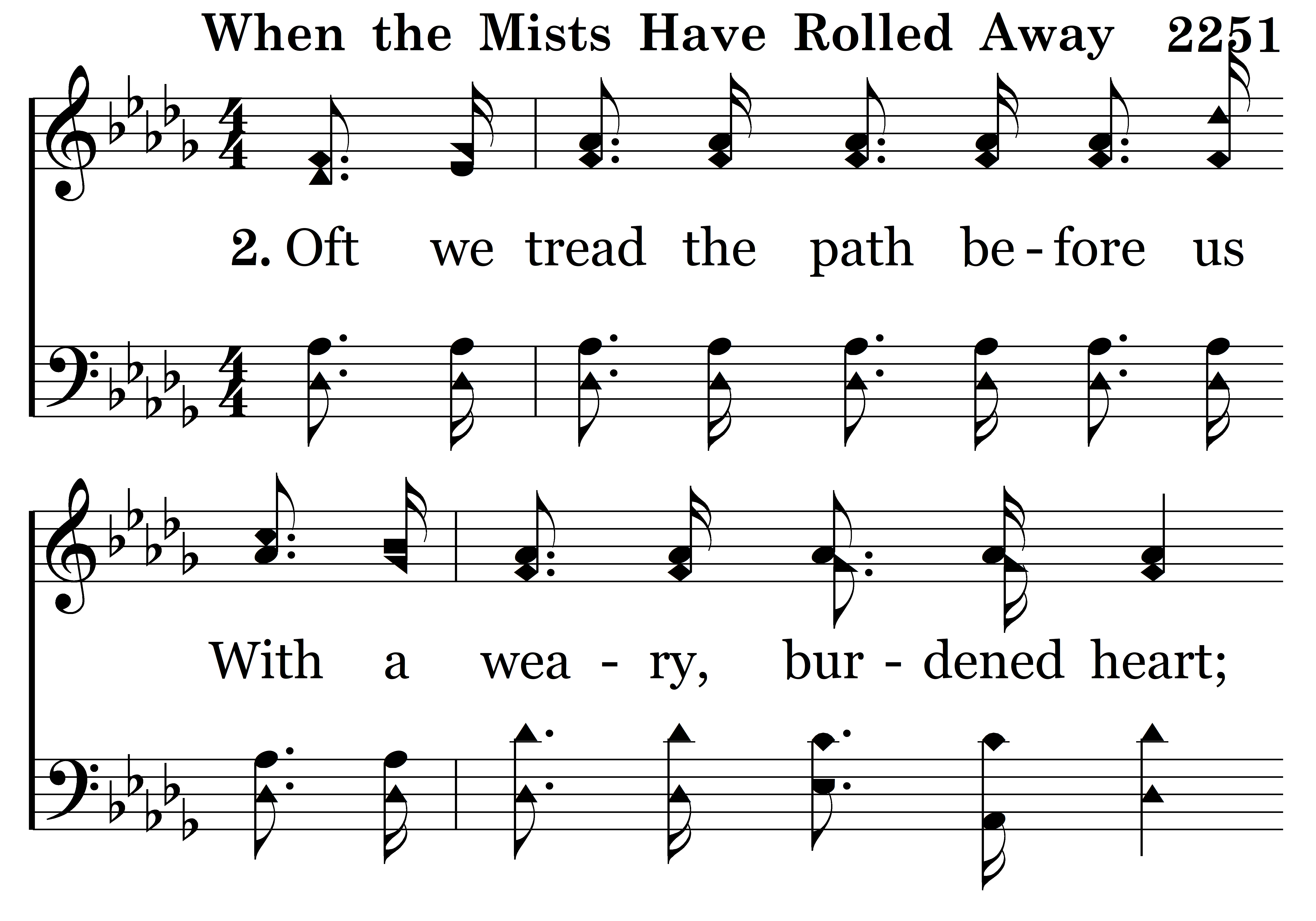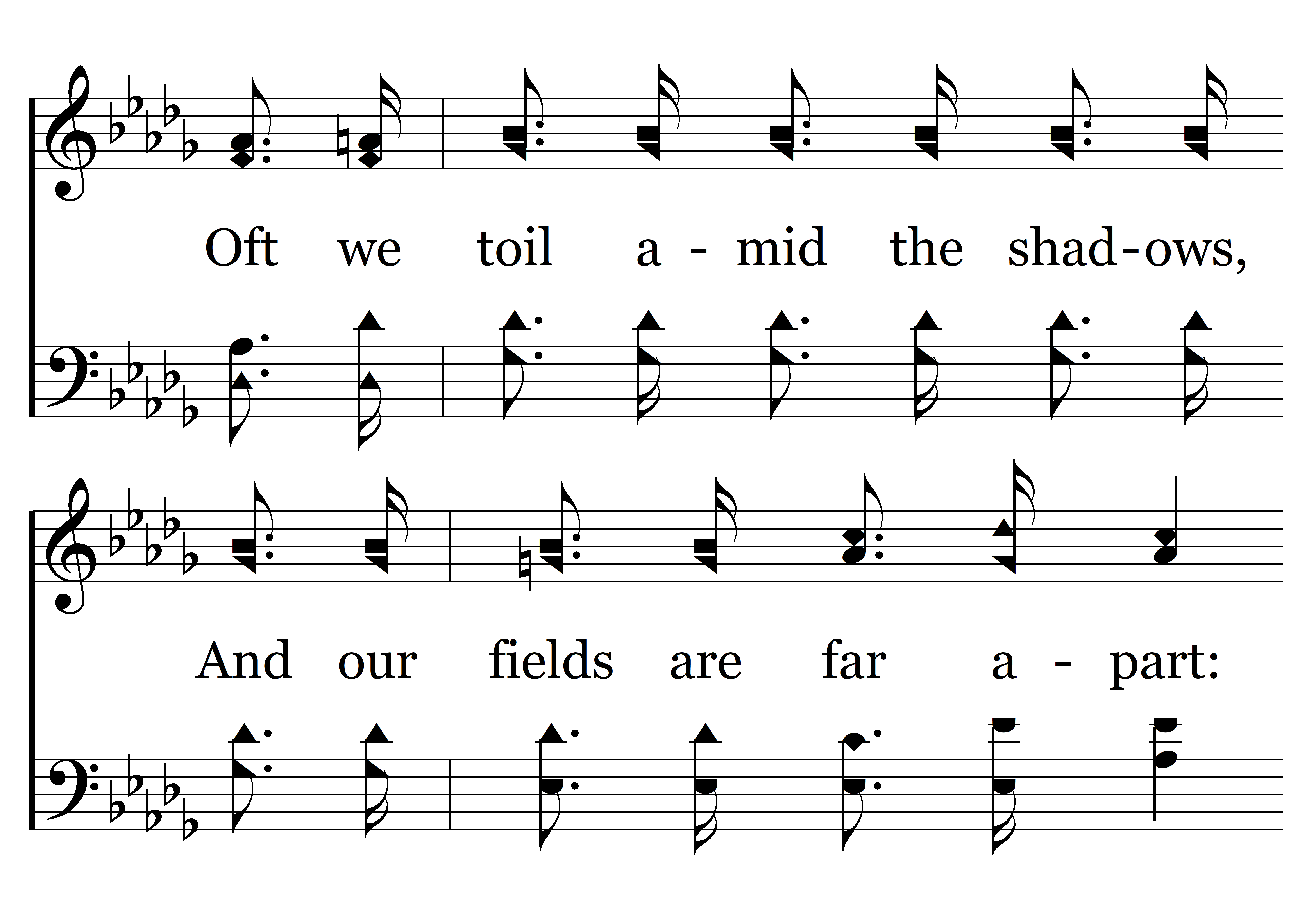 Oft we tread the path before us With a weary, burdened heart; Oft we toil amid the shadows, And our fields are far apart: But the Savior's "Come, ye blessed," All our labor will repay, When we gather in the morning Where the mists have rolled away.