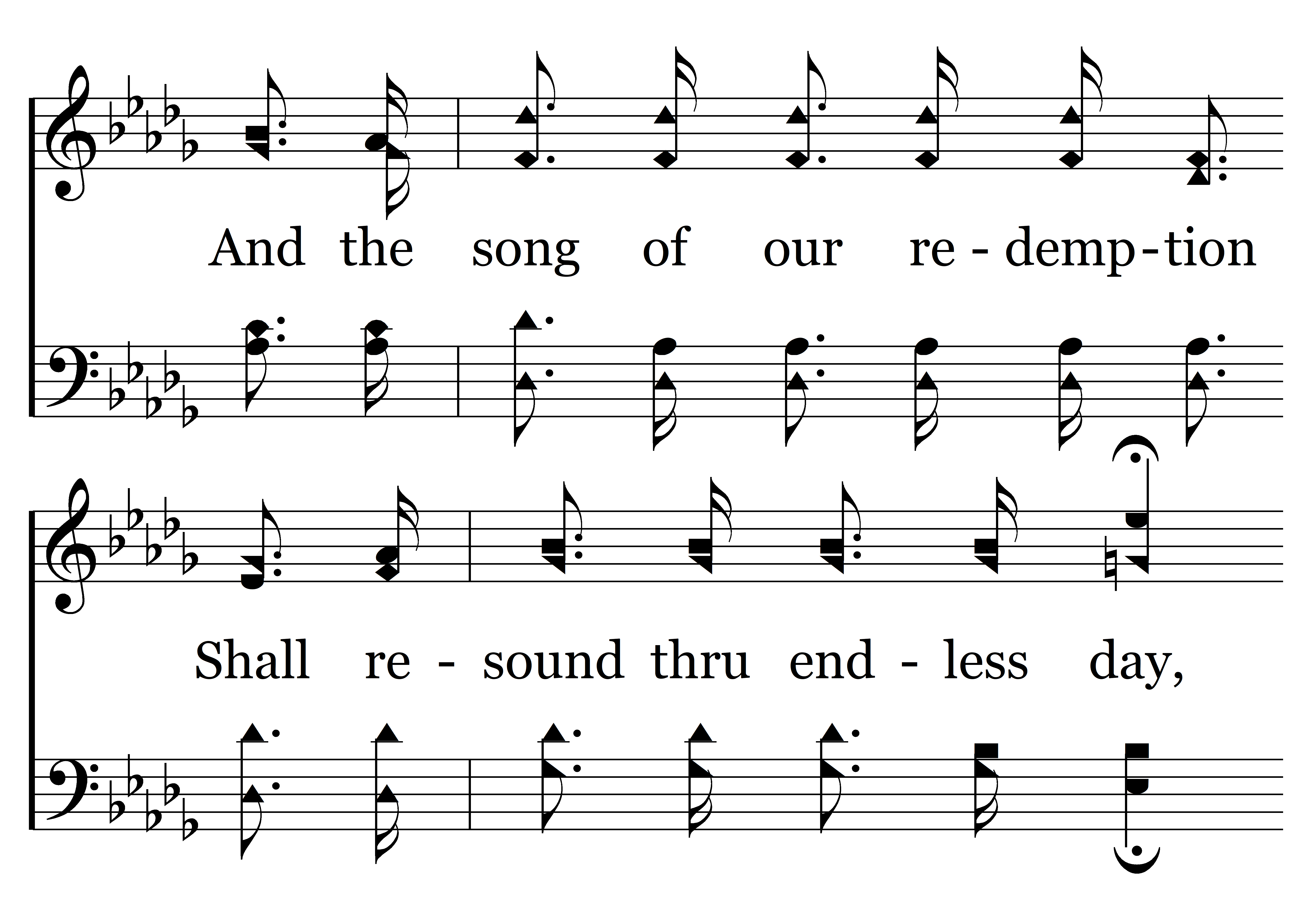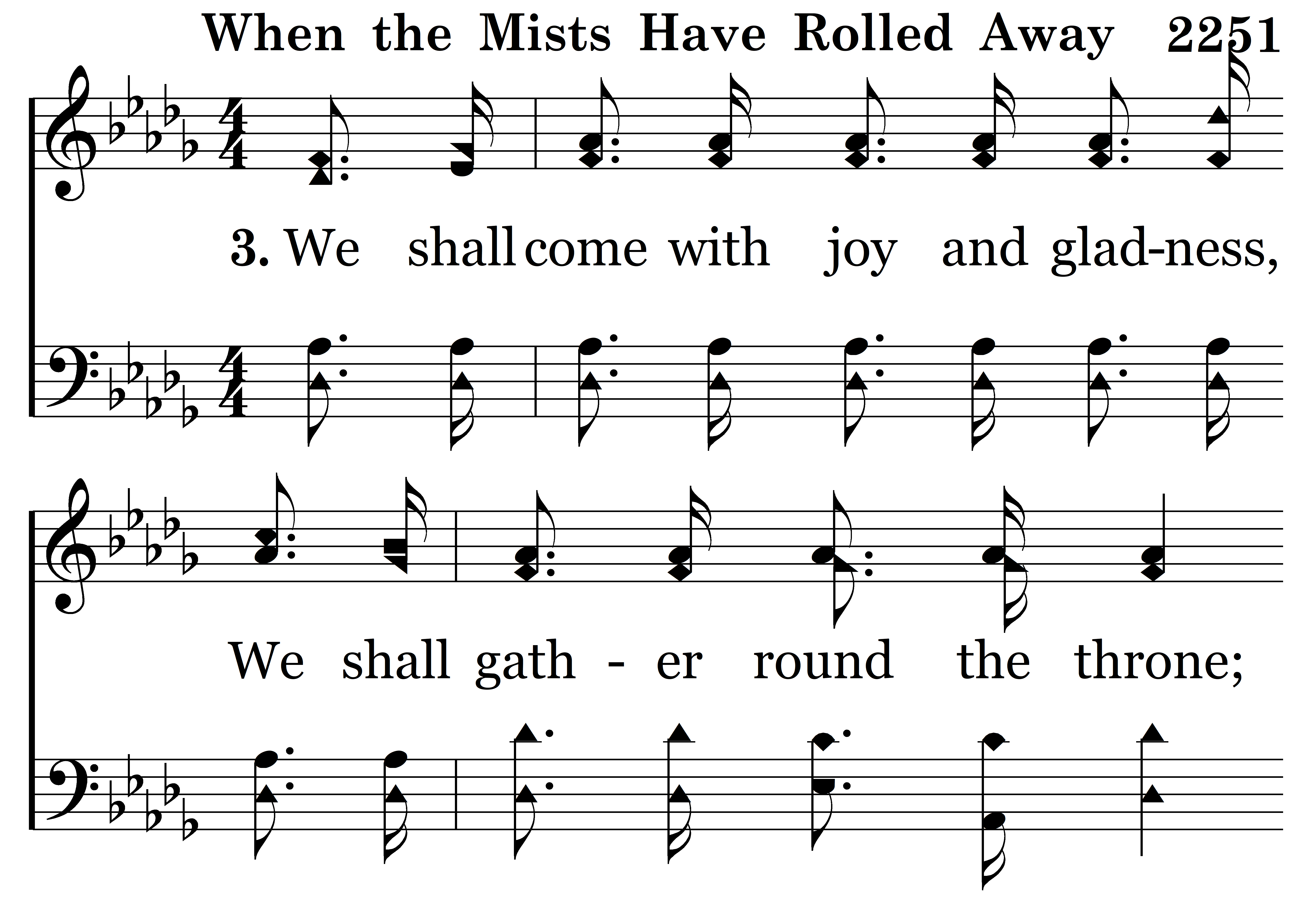 We shall come with joy and gladness, We shall gather round the throne; Face to face with those that love us, We shall know as we are known: And the song of our redemption Shall resound thru endless day, When the shadows have departed, And the mists have rolled away.
