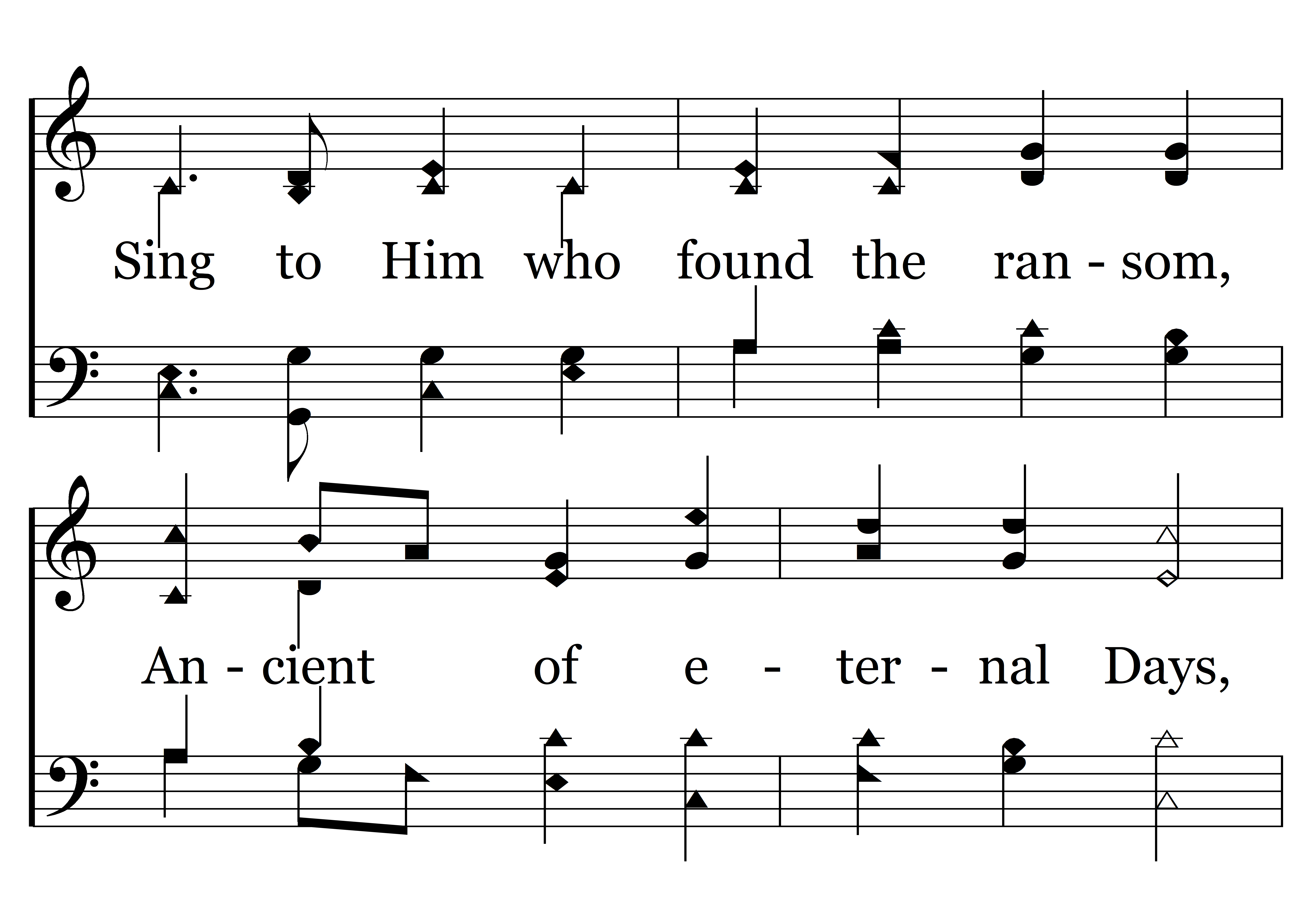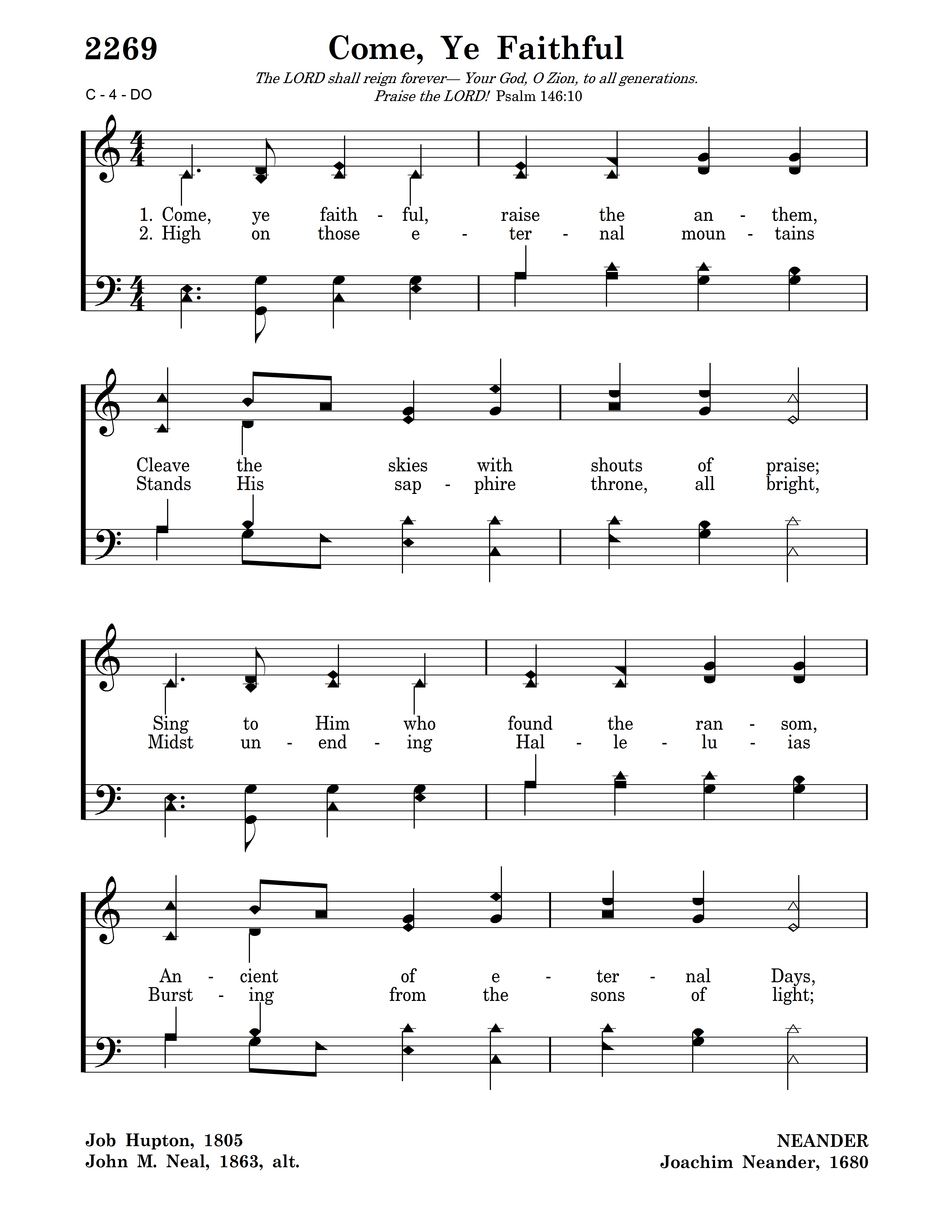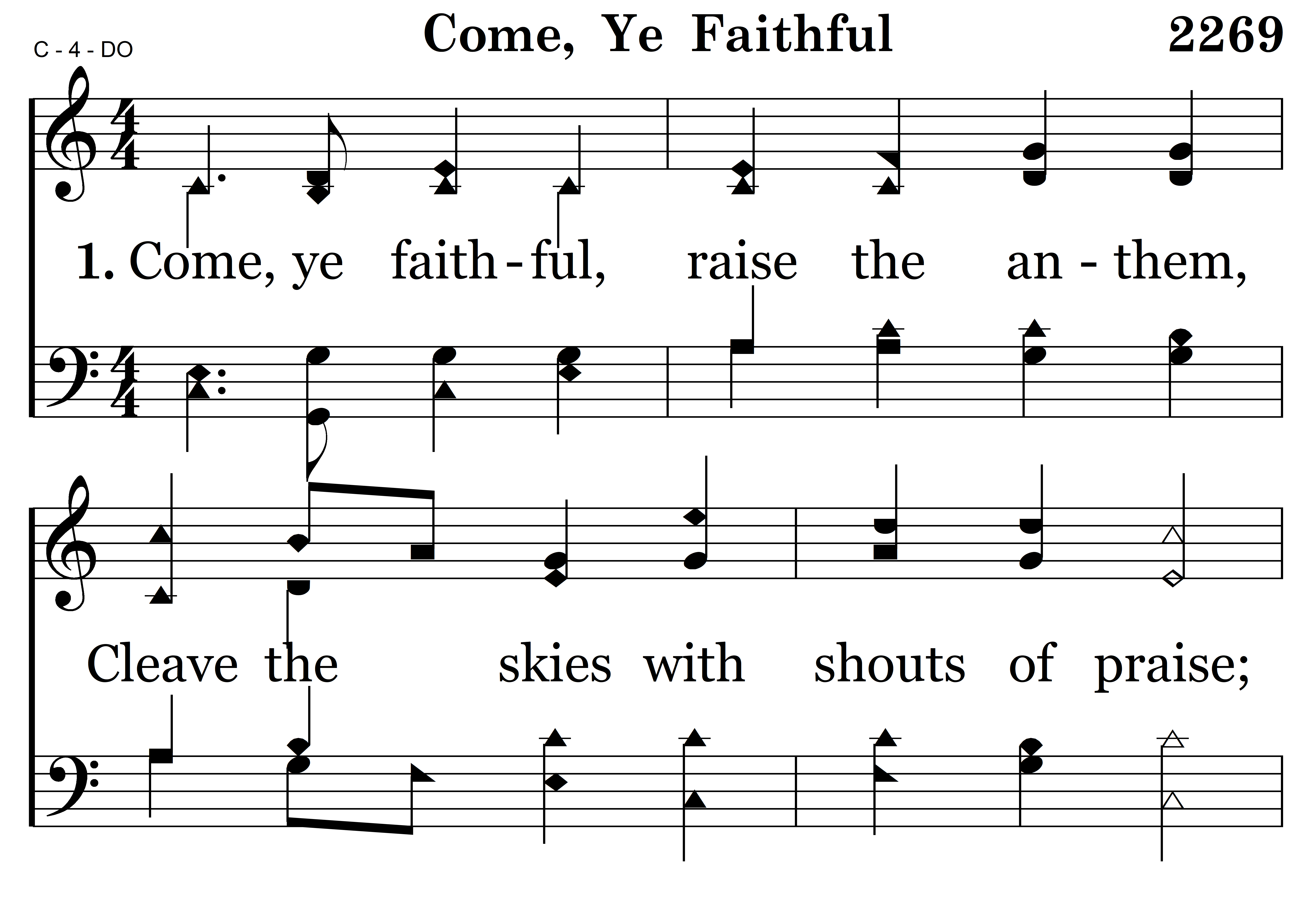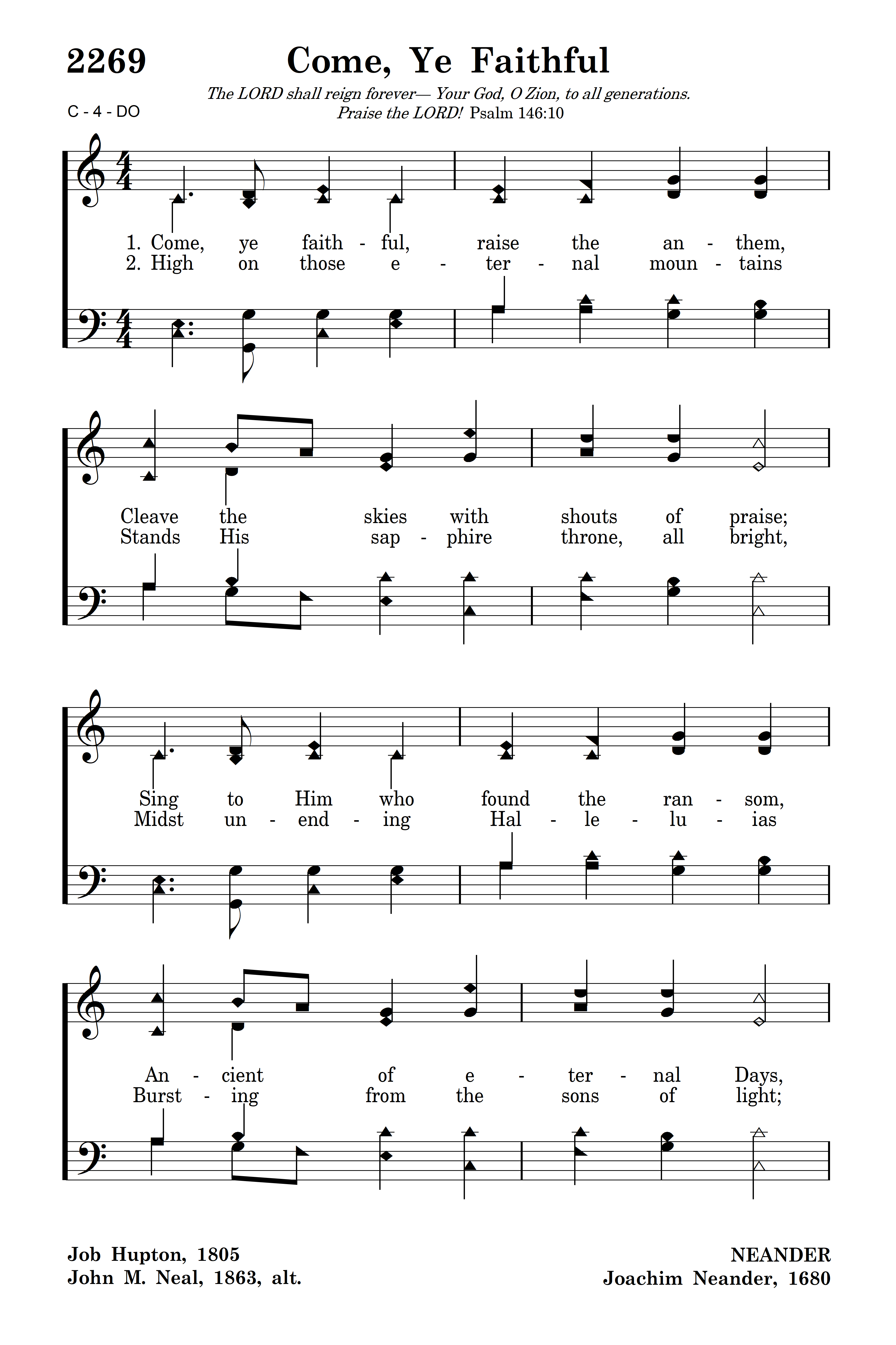 Come, ye faithful, raise the anthem, Cleave the skies with shouts of praise; Sing to Him who found the ransom, Ancient of eternal Days, God eternal, Word incarnate, Whom the heav’n of heav’ns obeys.