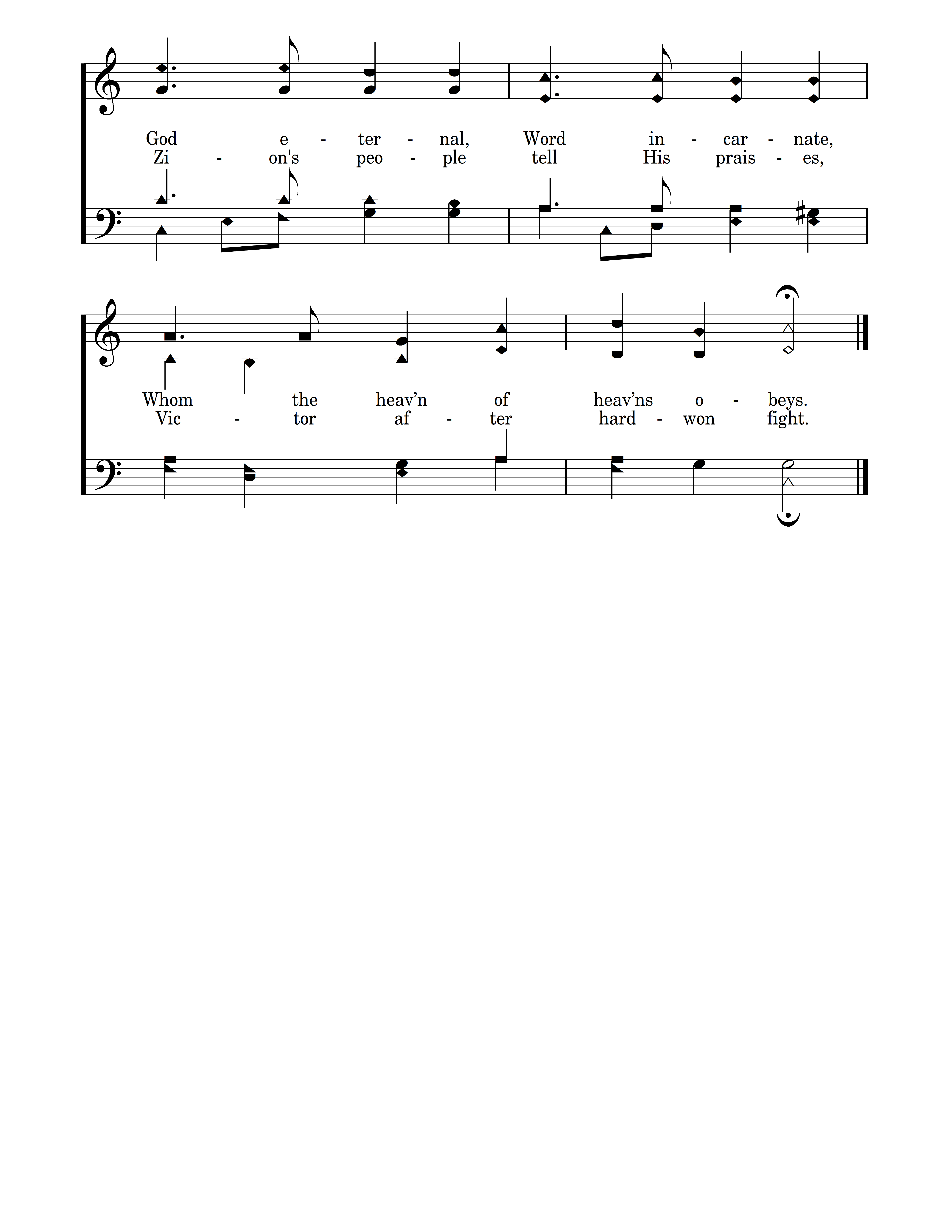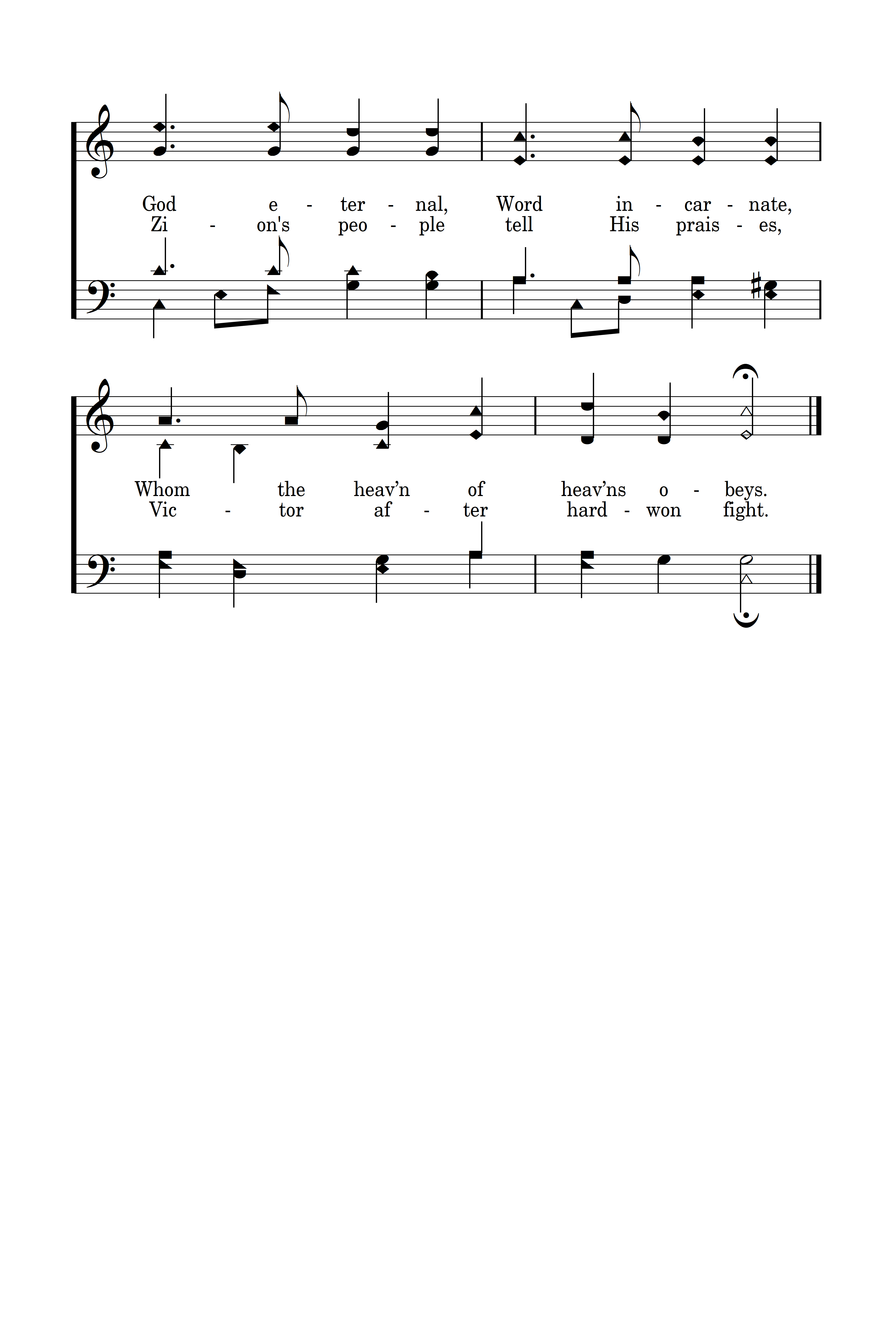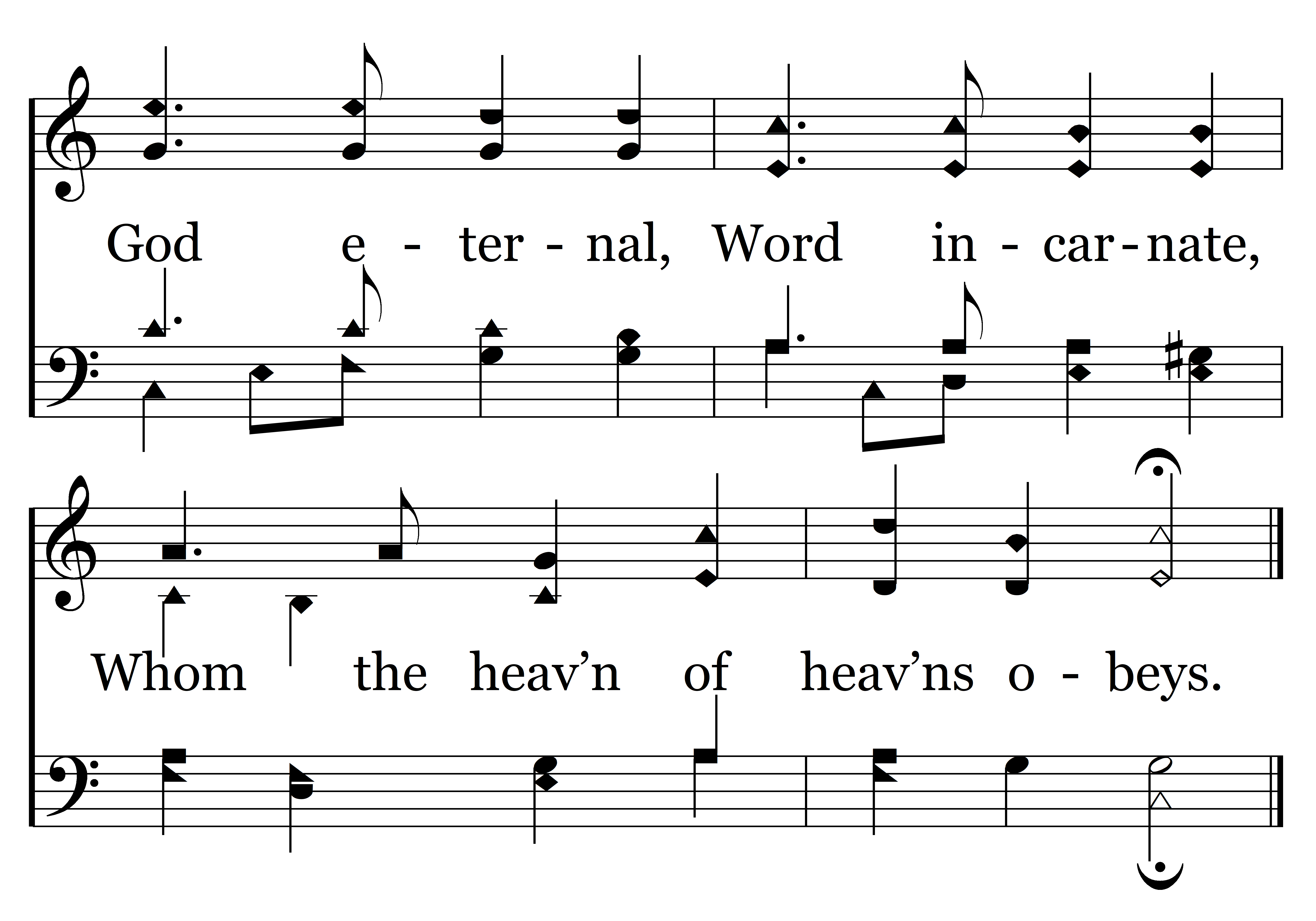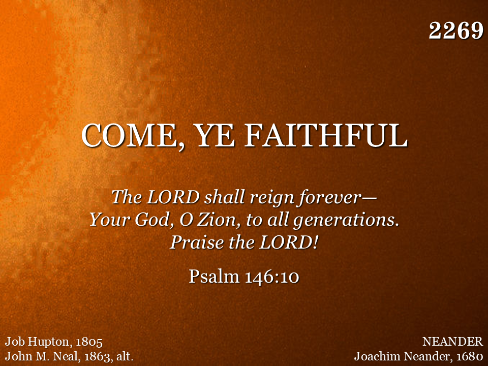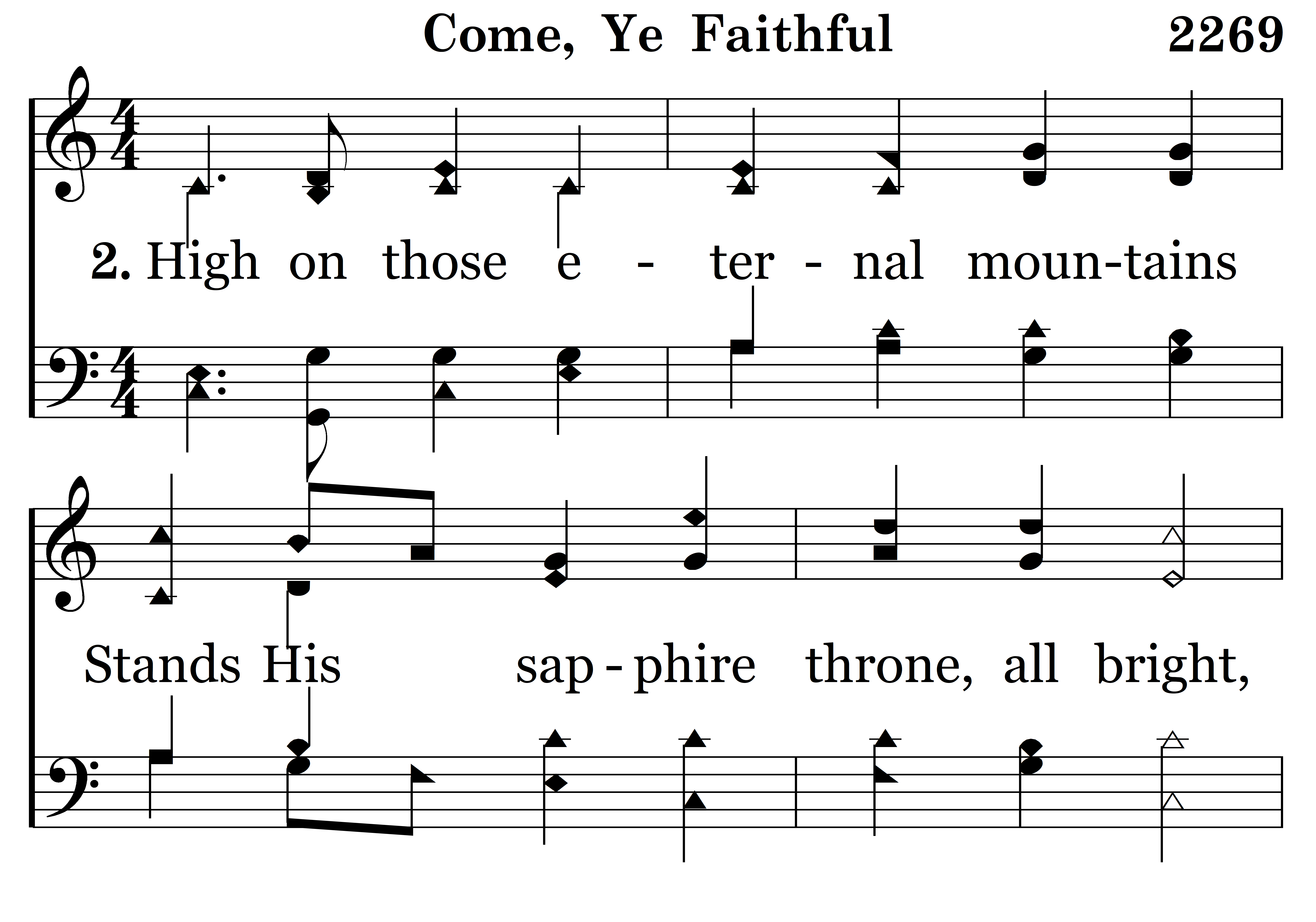 Come, ye faithful, raise the anthem, Cleave the skies with shouts of praise; Sing to Him who found the ransom, Ancient of eternal Days, God eternal, Word incarnate, Whom the heav’n of heav’ns obeys.