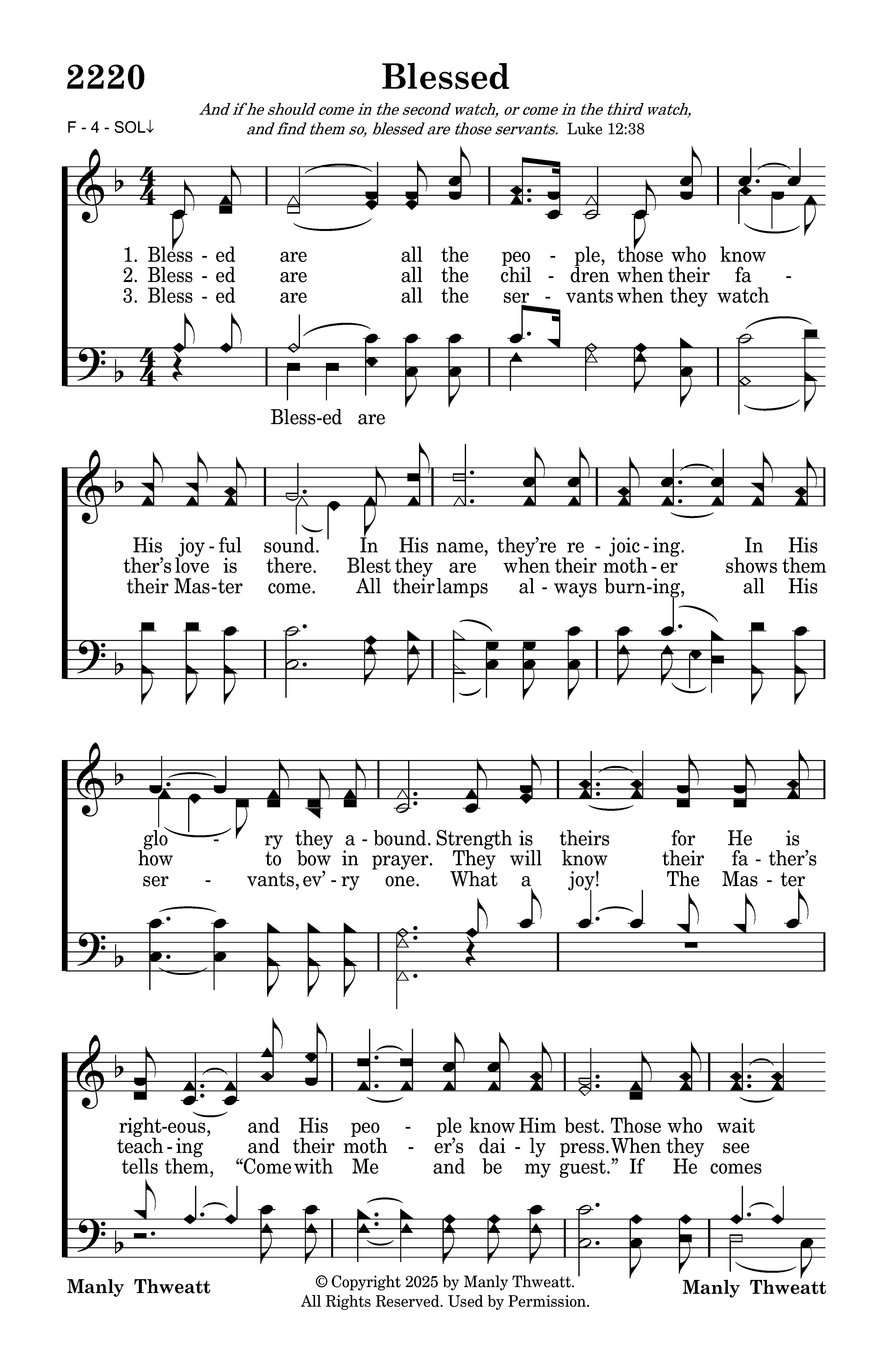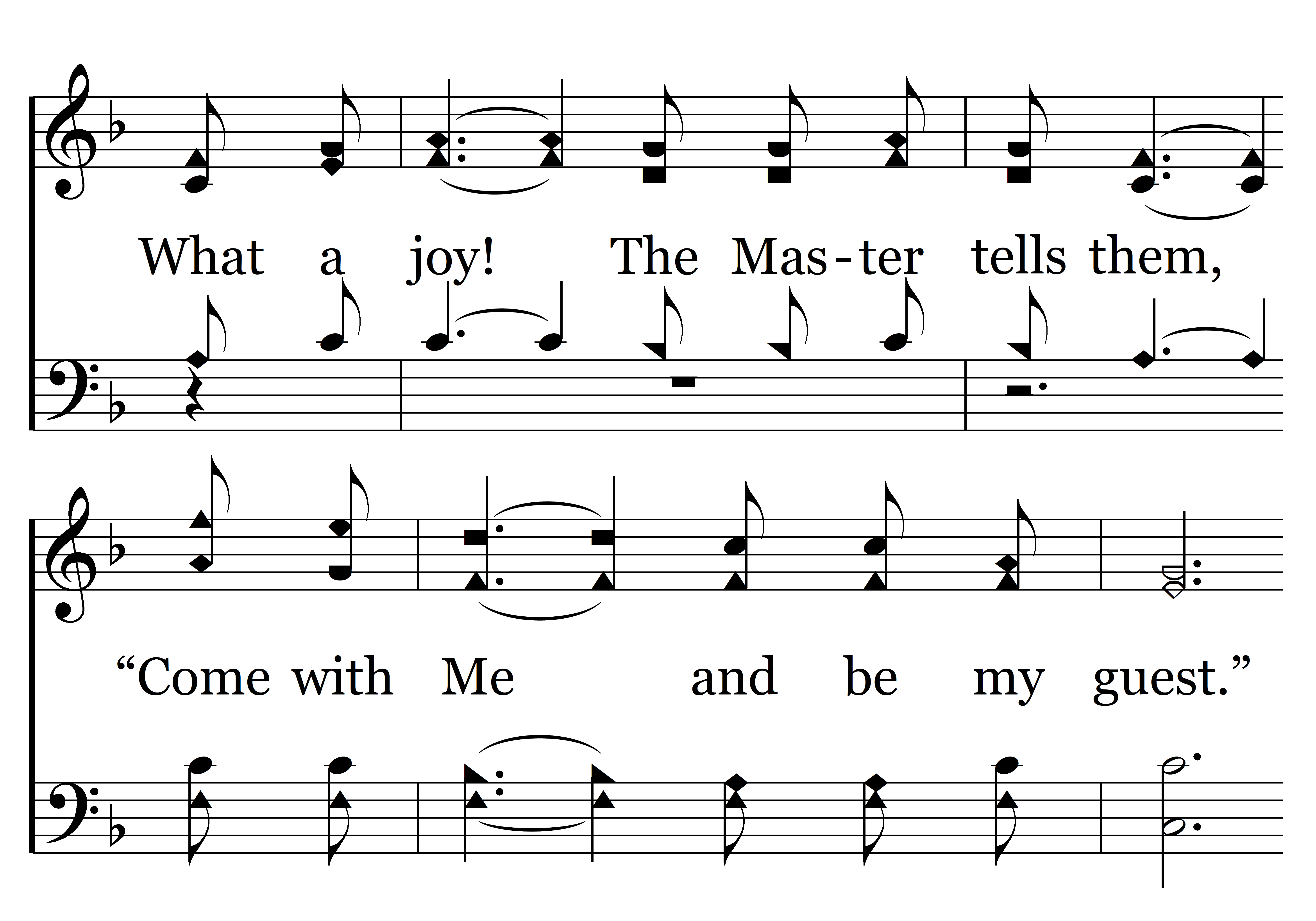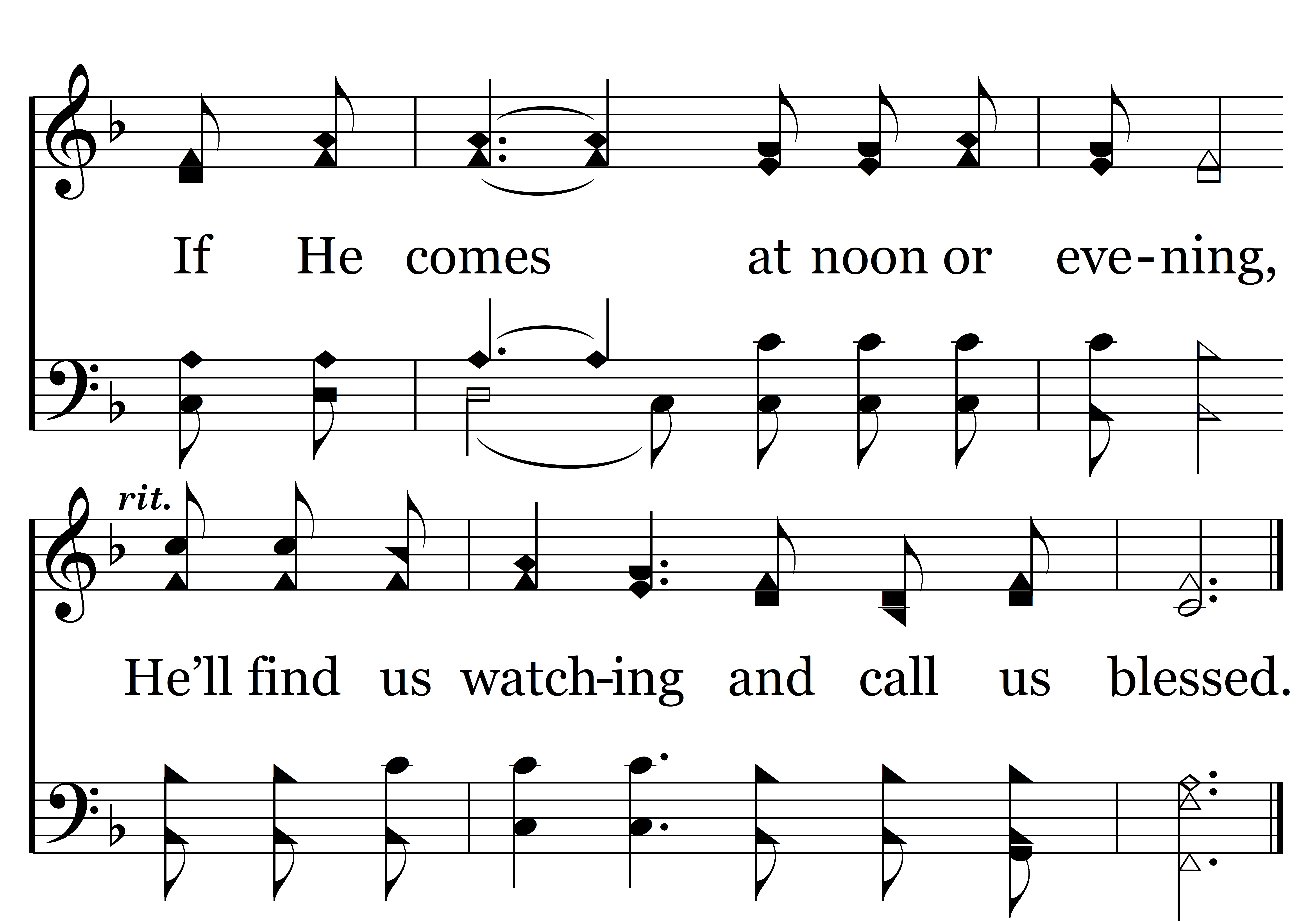 Blessed are (Blessed are) all the servants when they watch their Master come. All their lamps always burning, all His servants, ev’ry one. What a joy! The Master tells them, “Come with Me and be my guest.” If He comes at noon or evening. He’ll find us watching and call us blessed.