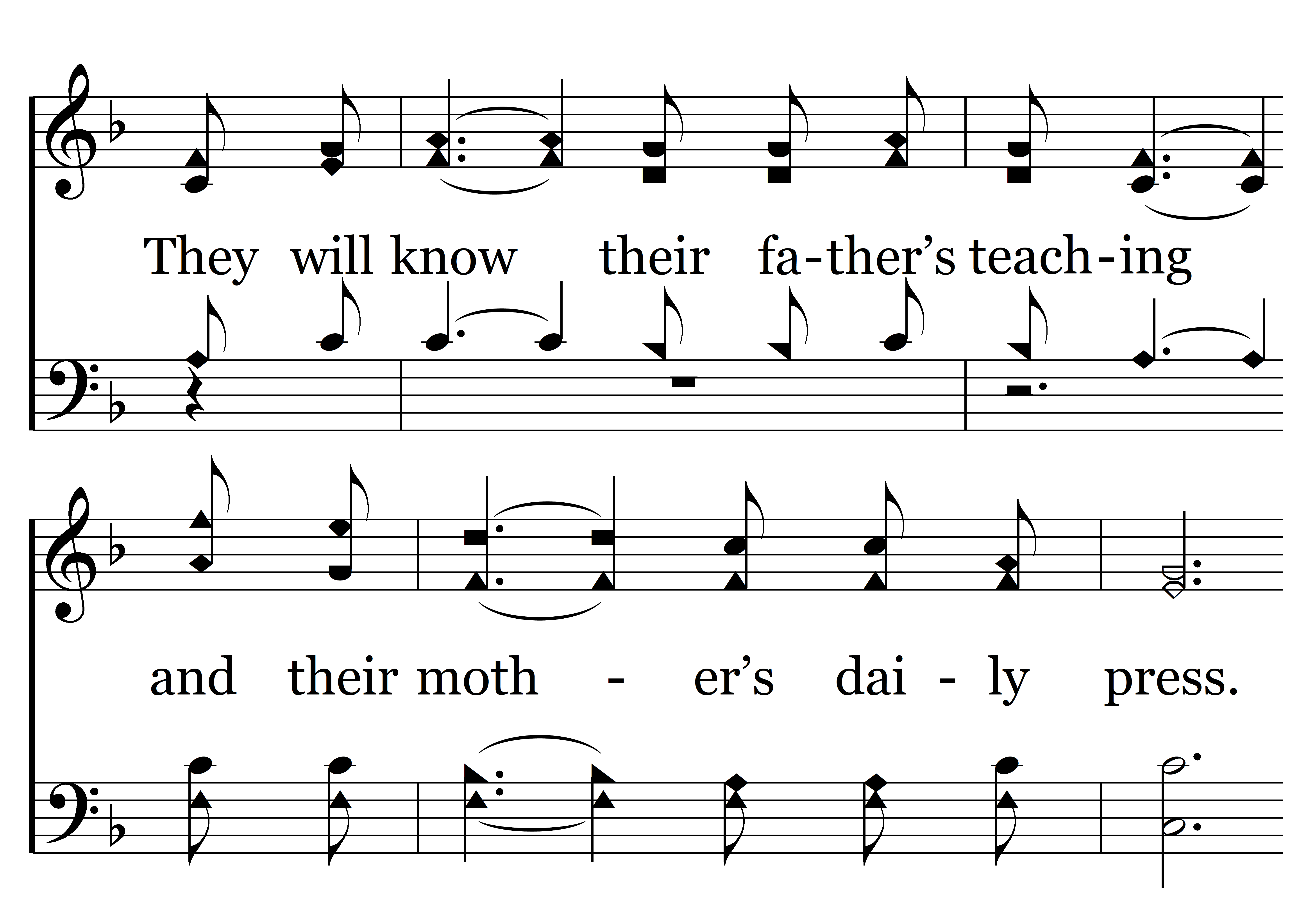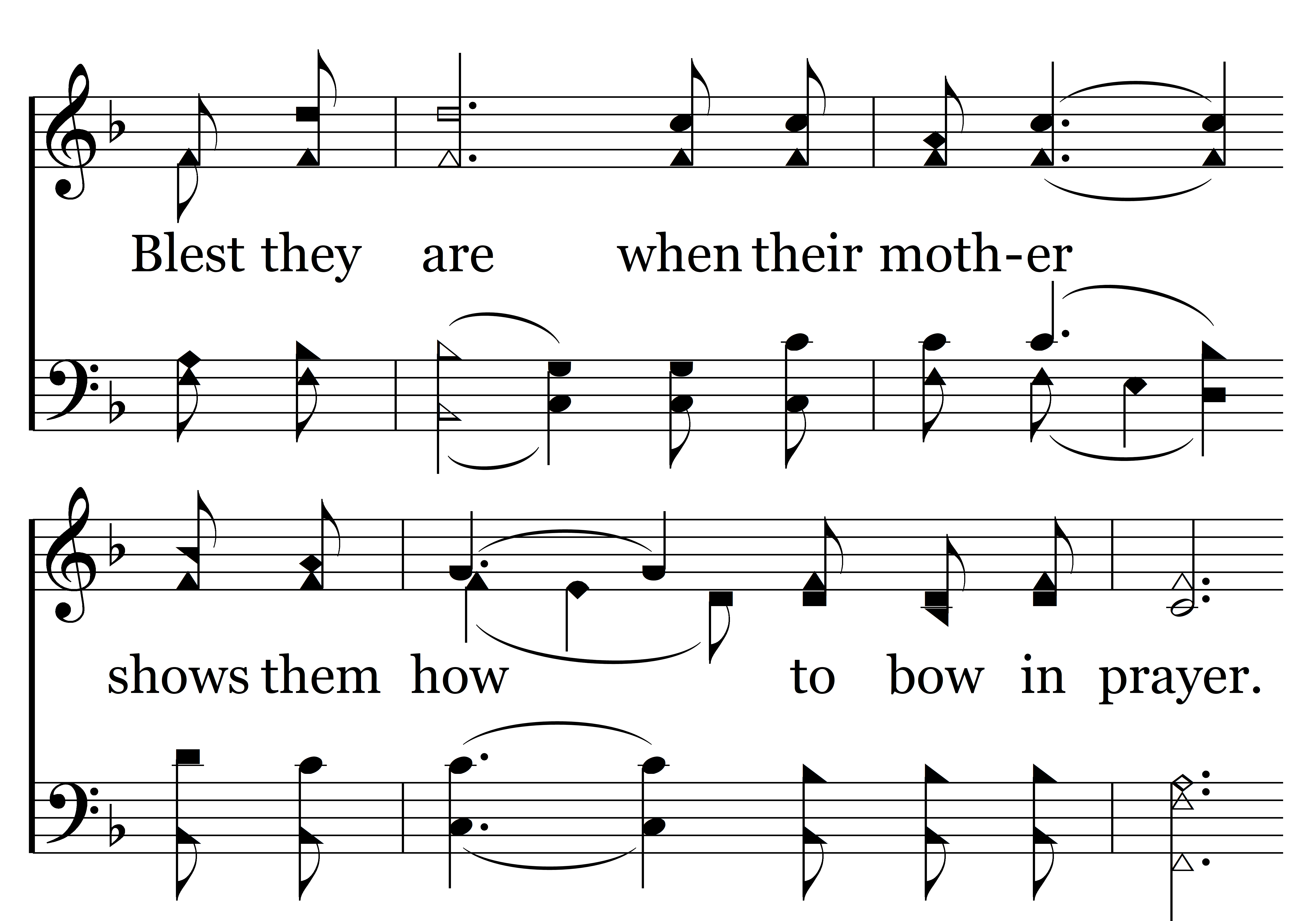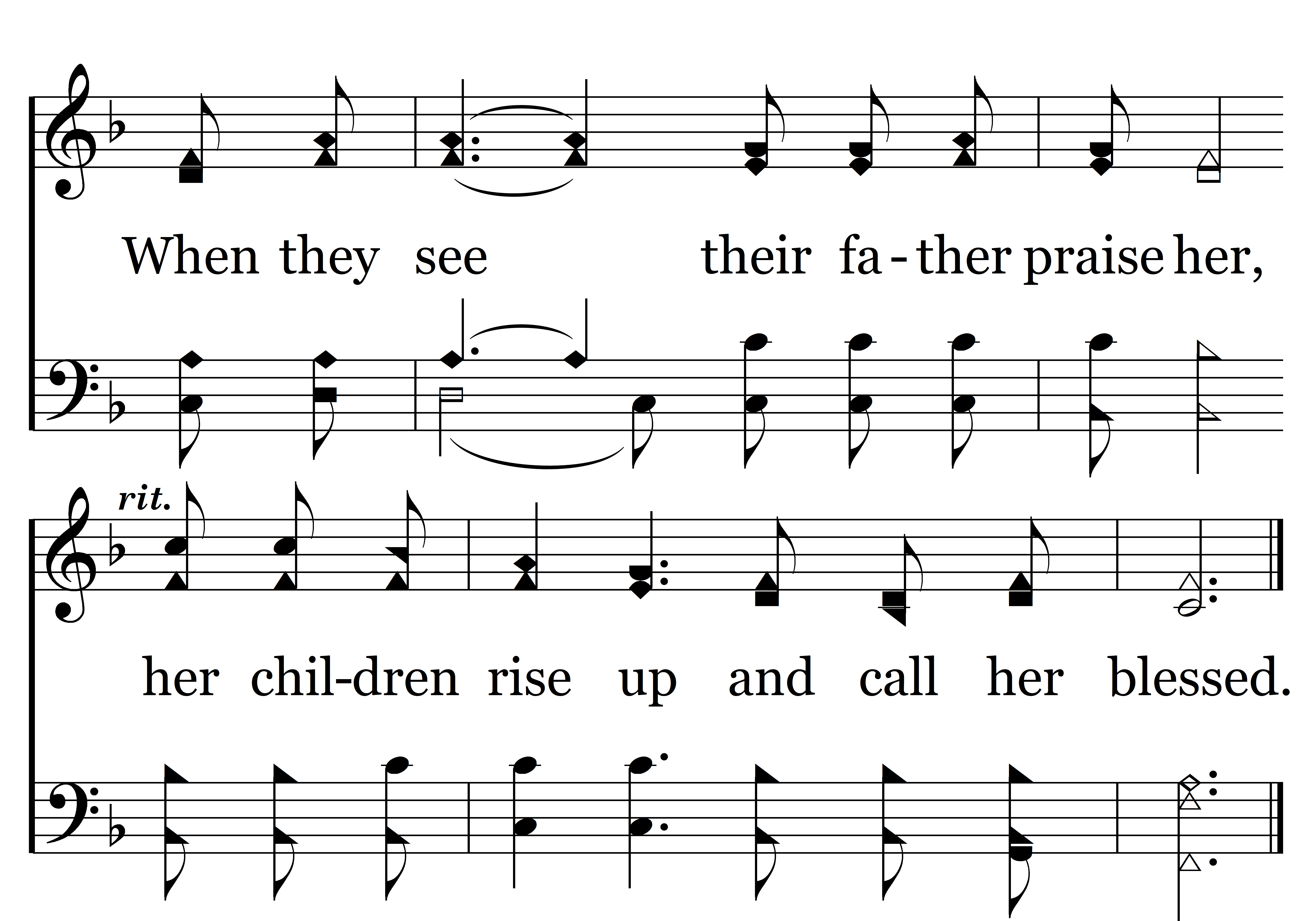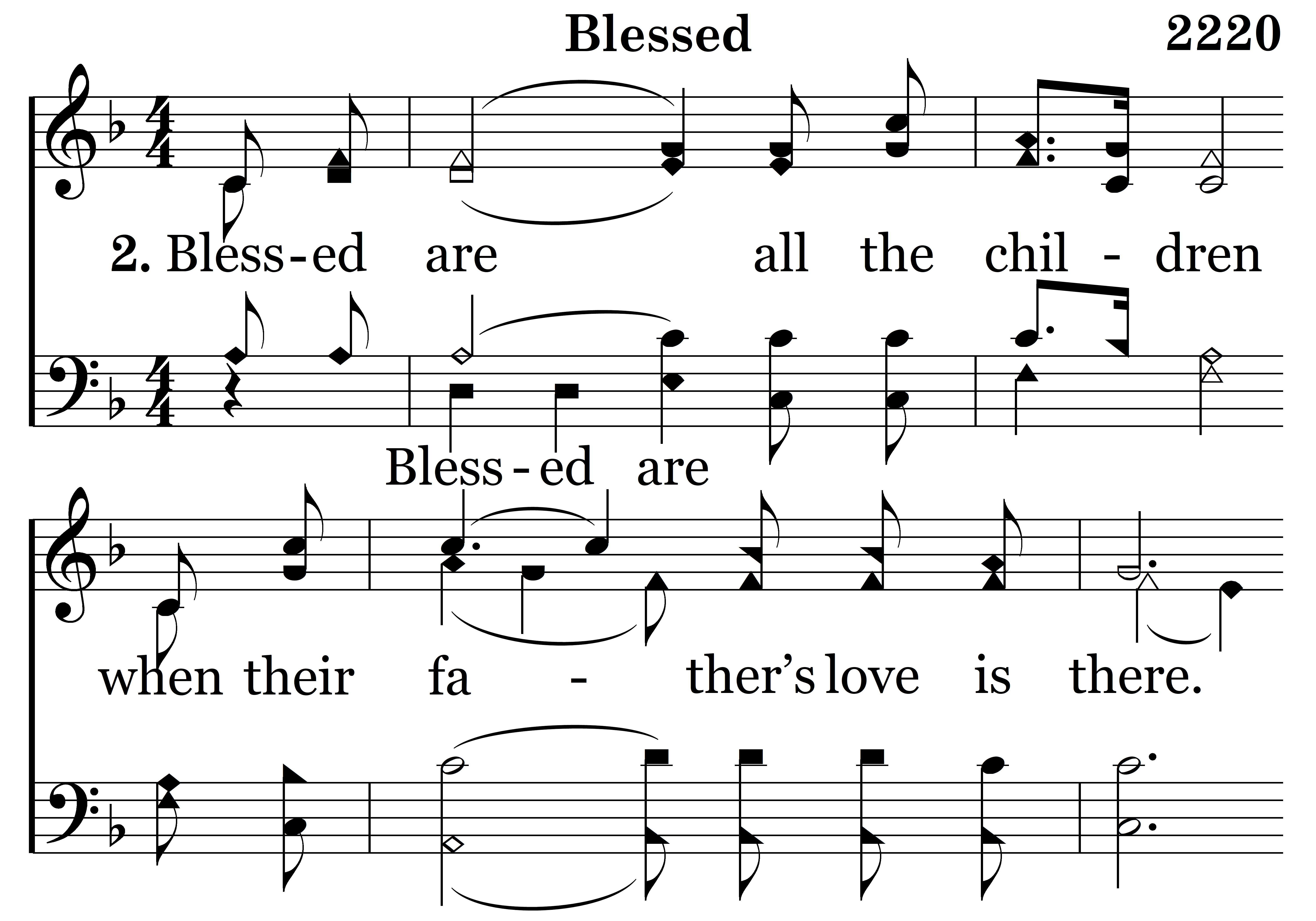 Blessed are (Blessed are) all the children when their father’s love is there. Blest they are when their mother shows them how to bow in prayer. They will know their father’s teaching and their mother’s daily press. When they see their father praise her, her children rise up and call her blessed.