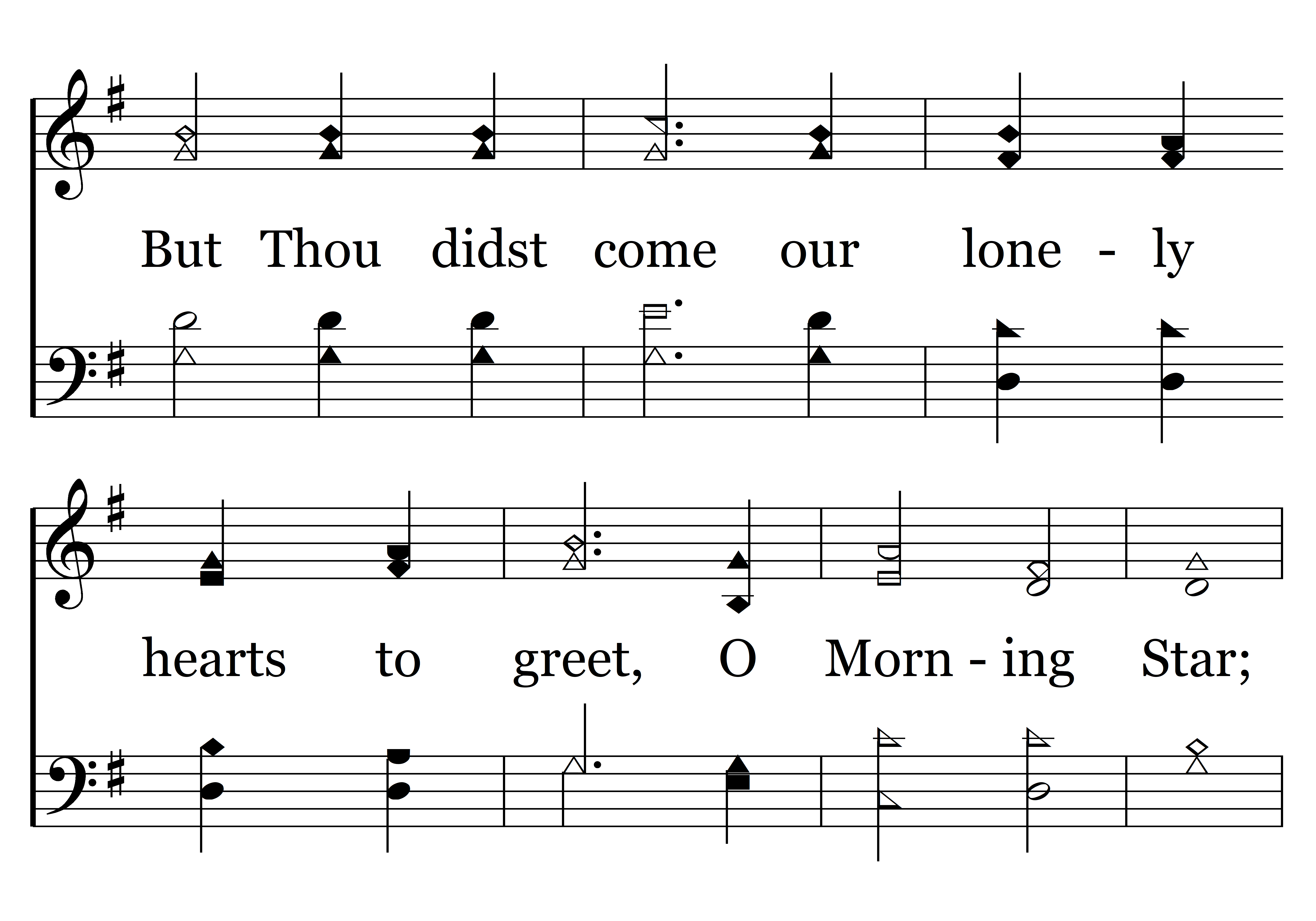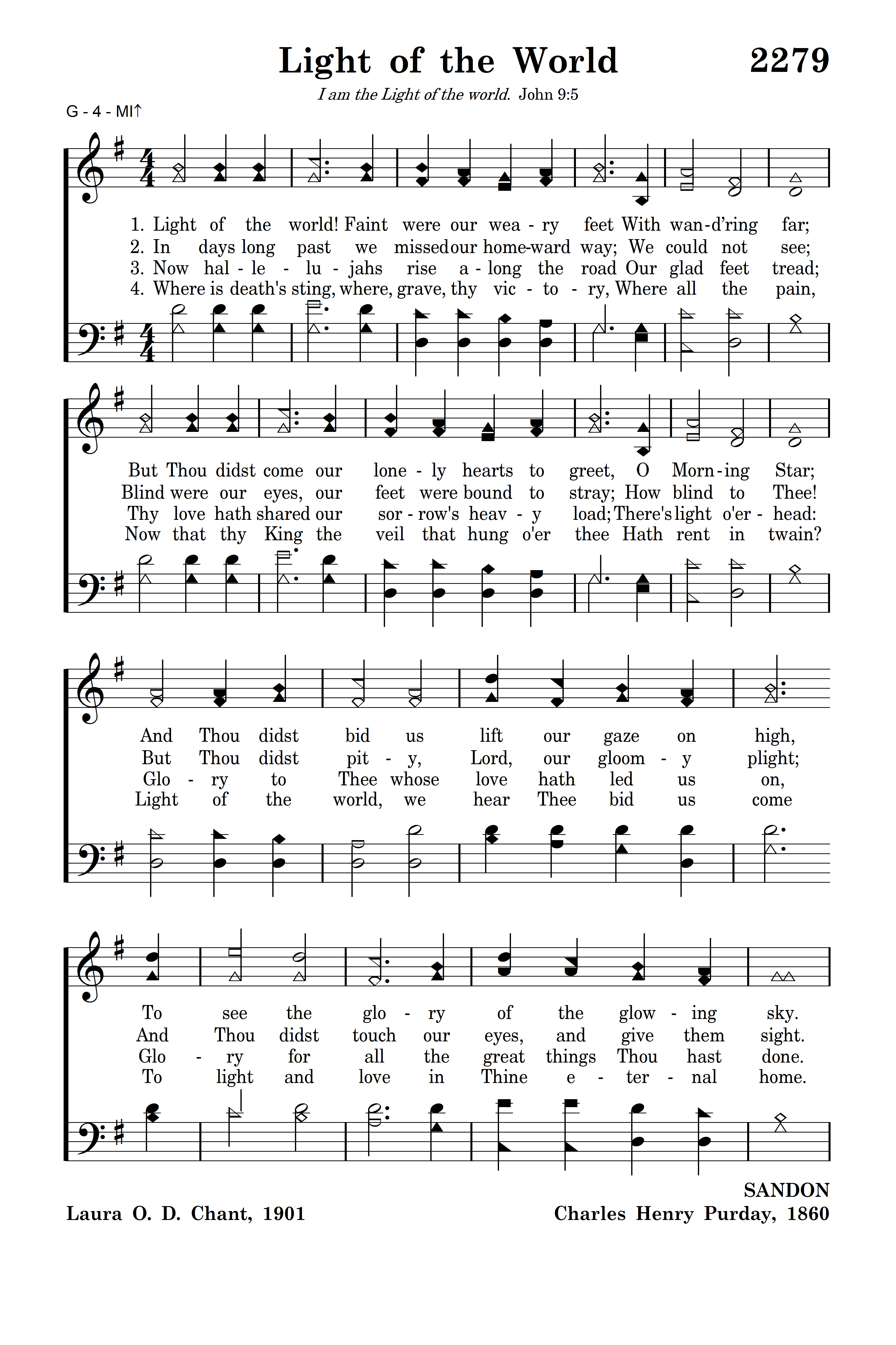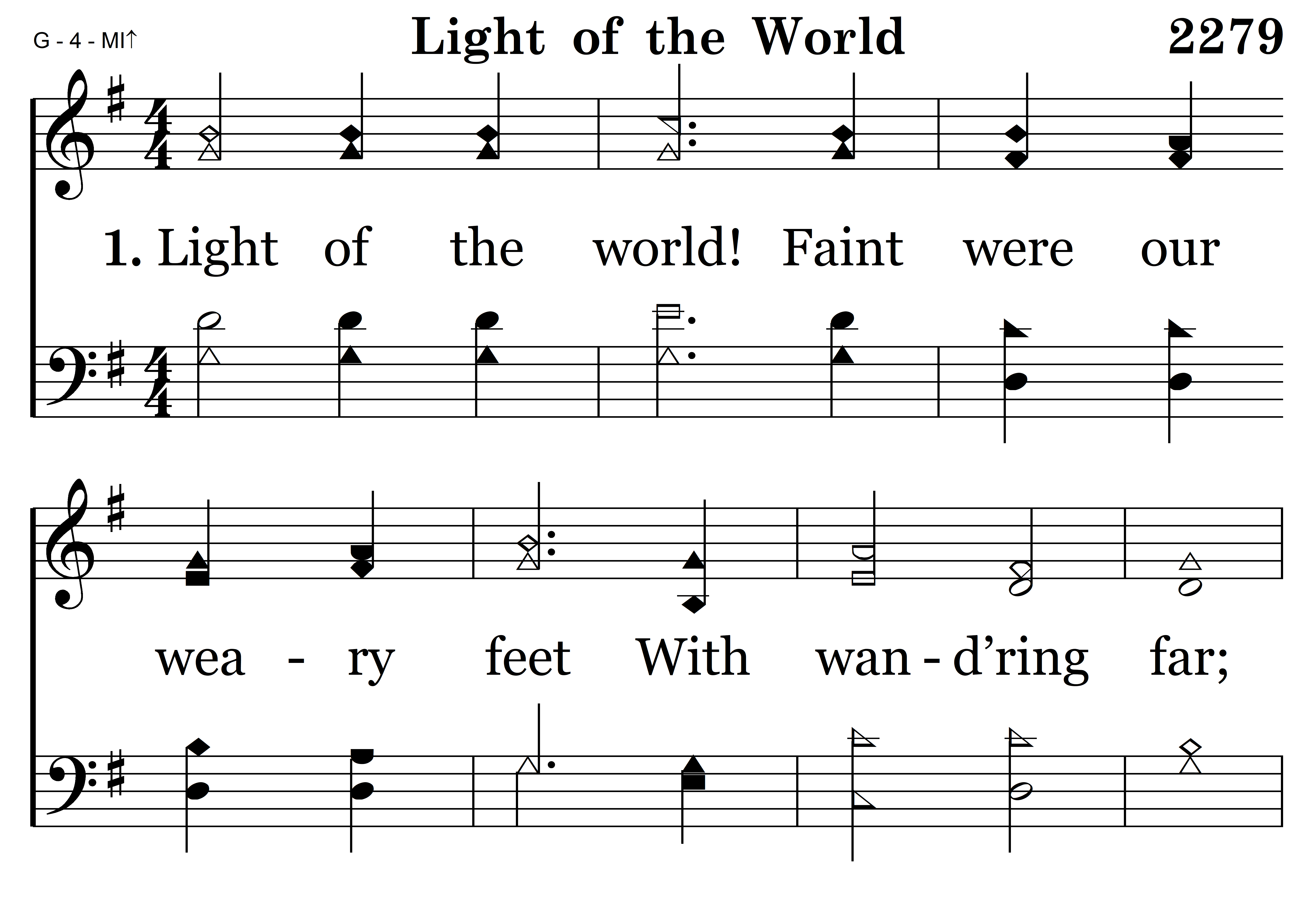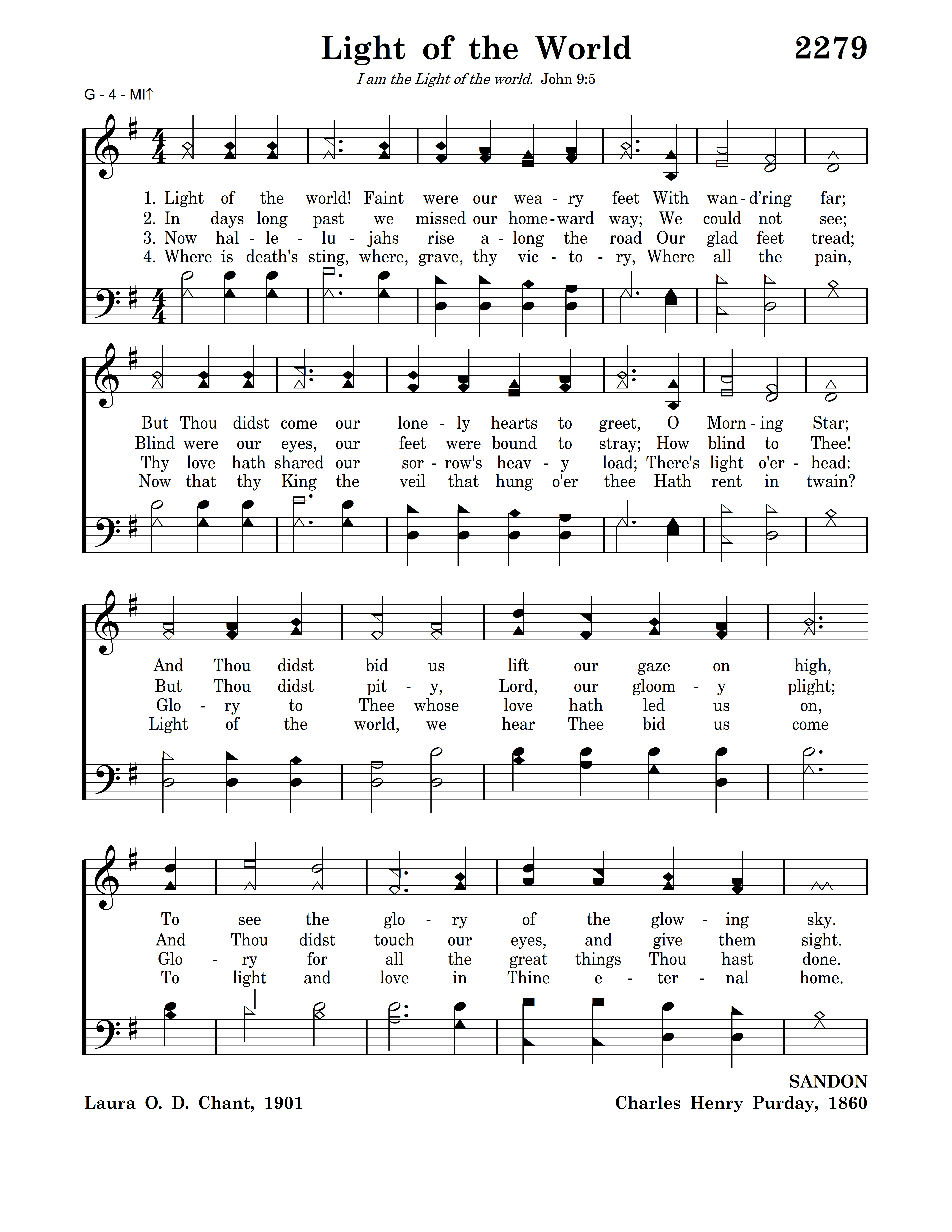 Light of the world! Faint were our weary feet With wandering far; But Thou didst come our lonely hearts to greet, O Morning Star; And Thou didst bid us lift our gaze on high, To see the glory of the glowing sky.