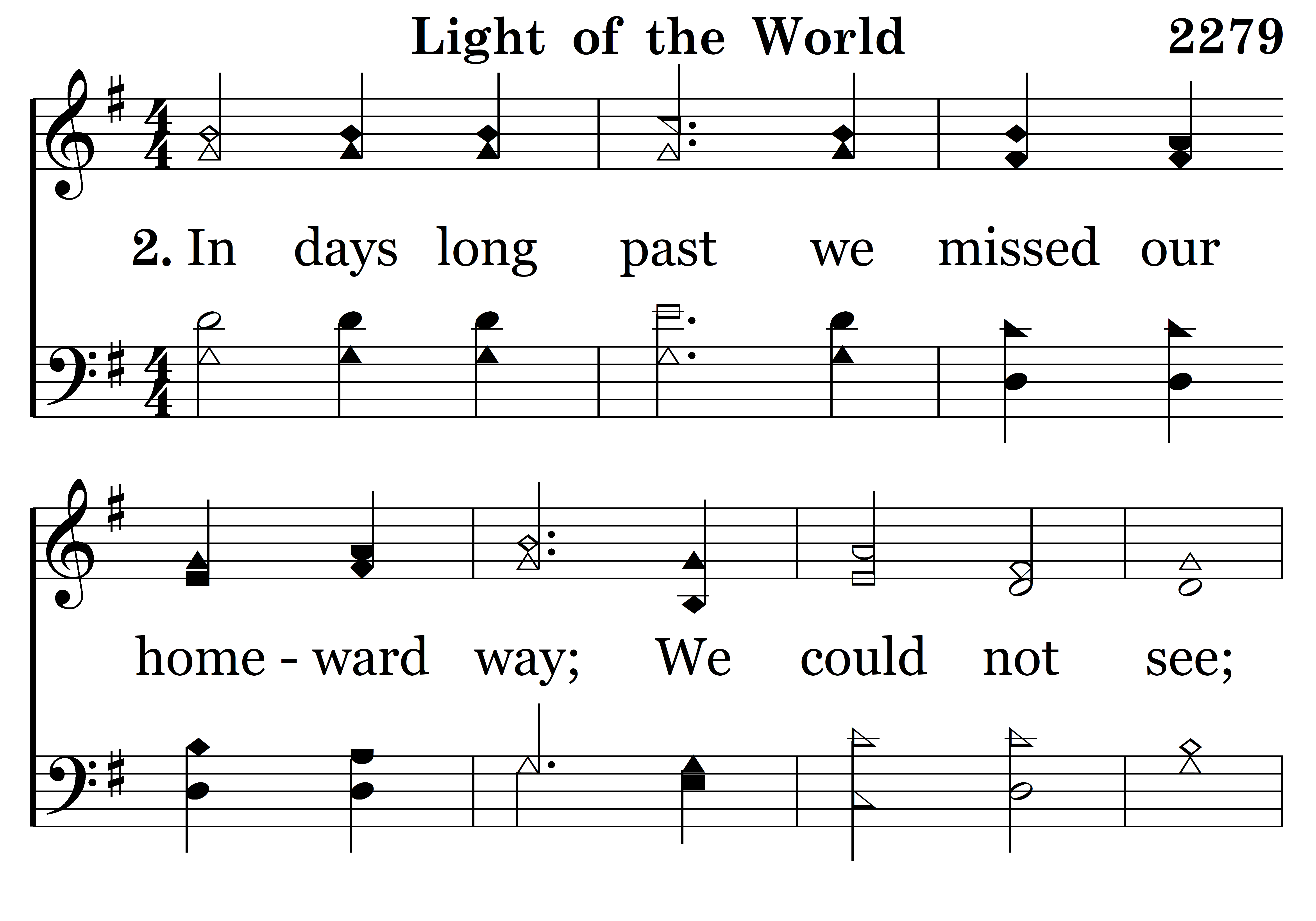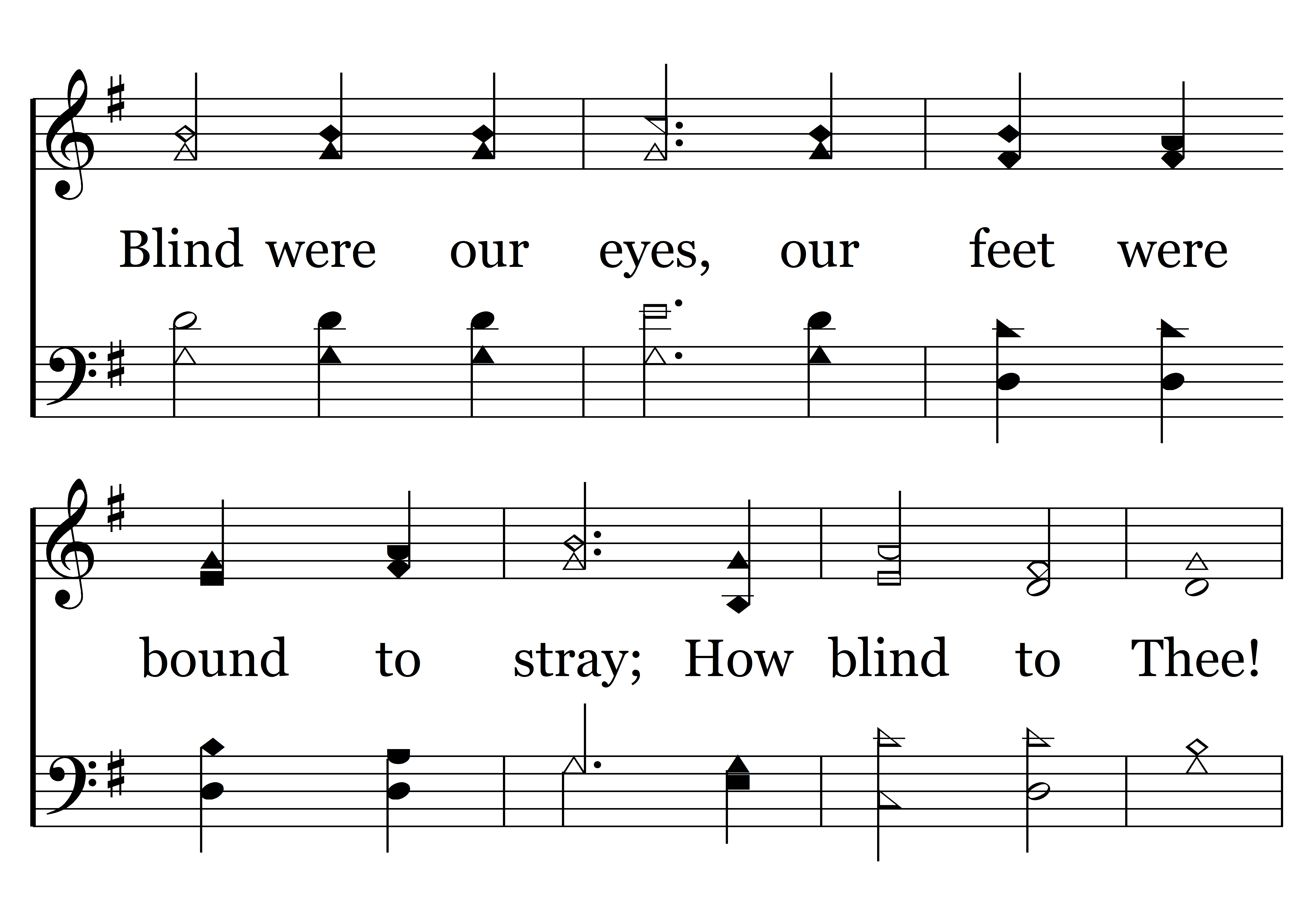 In days long past we missed our homeward way; We could not see; Blind were our eyes, our feet were bound to stray; How blind to Thee! But Thou didst pity, Lord, our gloomy plight; And Thou didst touch our eyes, and give them sight.