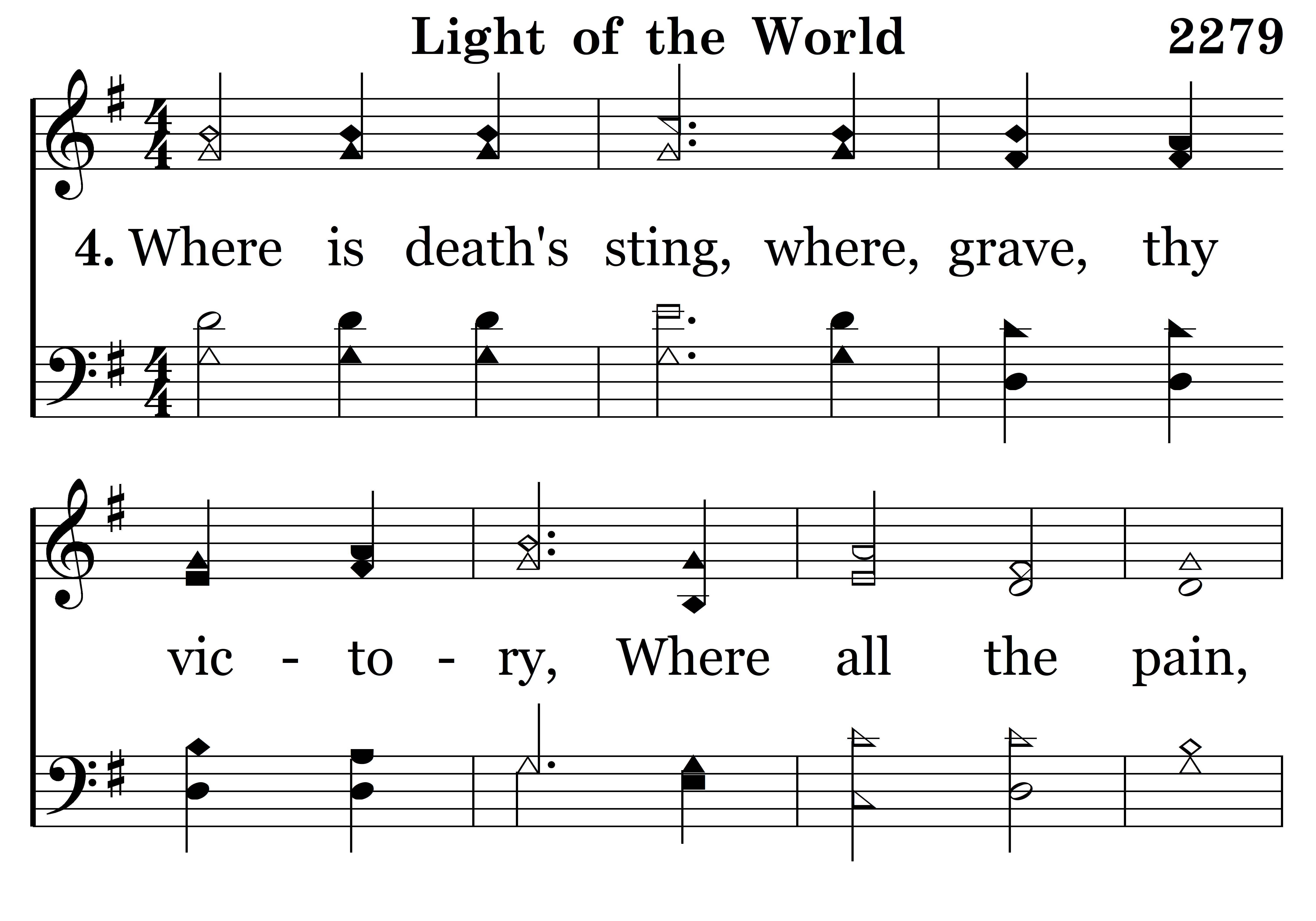 Where is death's sting, where, grave, thy victory, Where all the pain, Now that thy King the veil that hung o'er thee Hath rent in twain? Light of the world, we hear Thee bid us come To light and love in Thine eternal home.