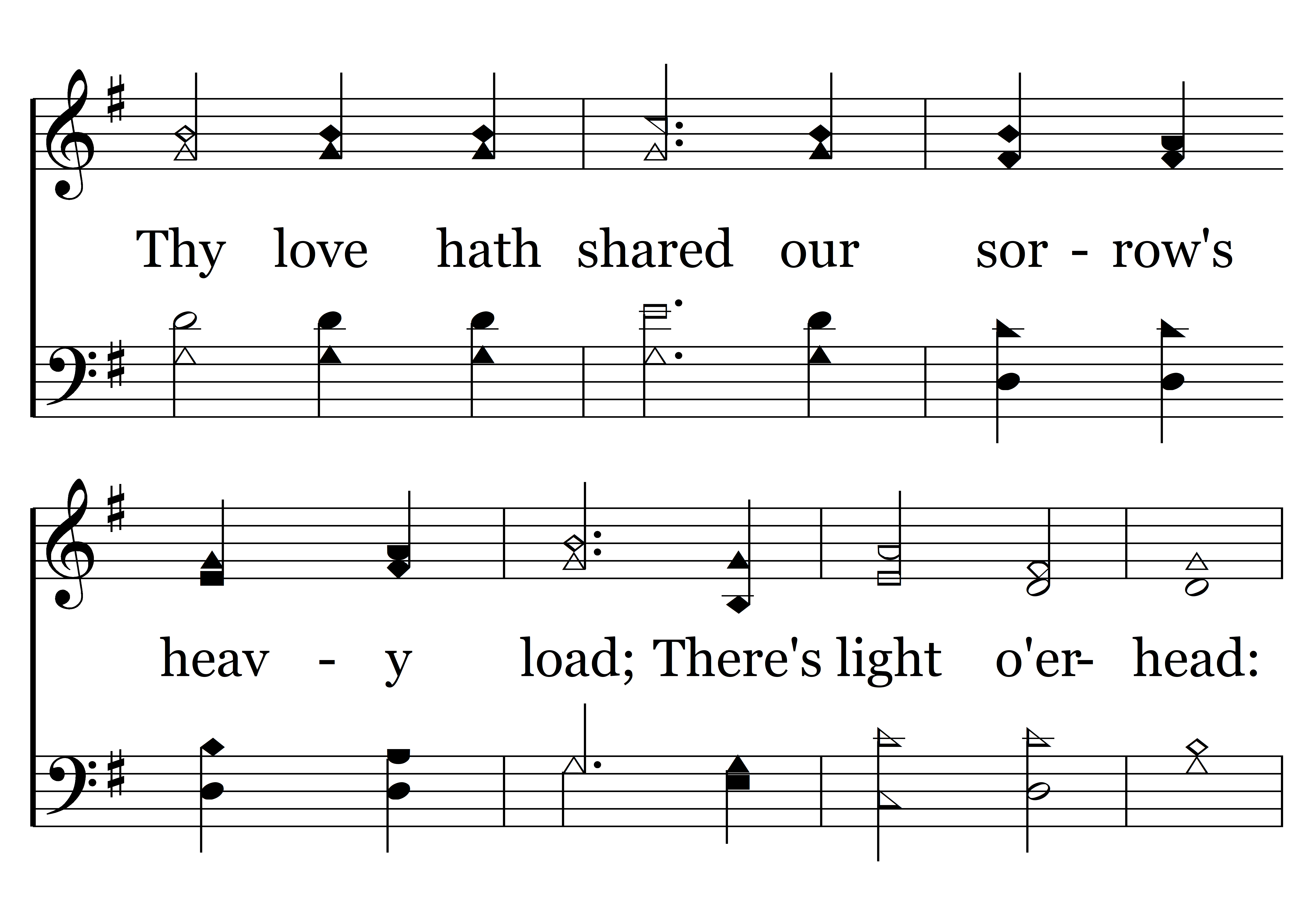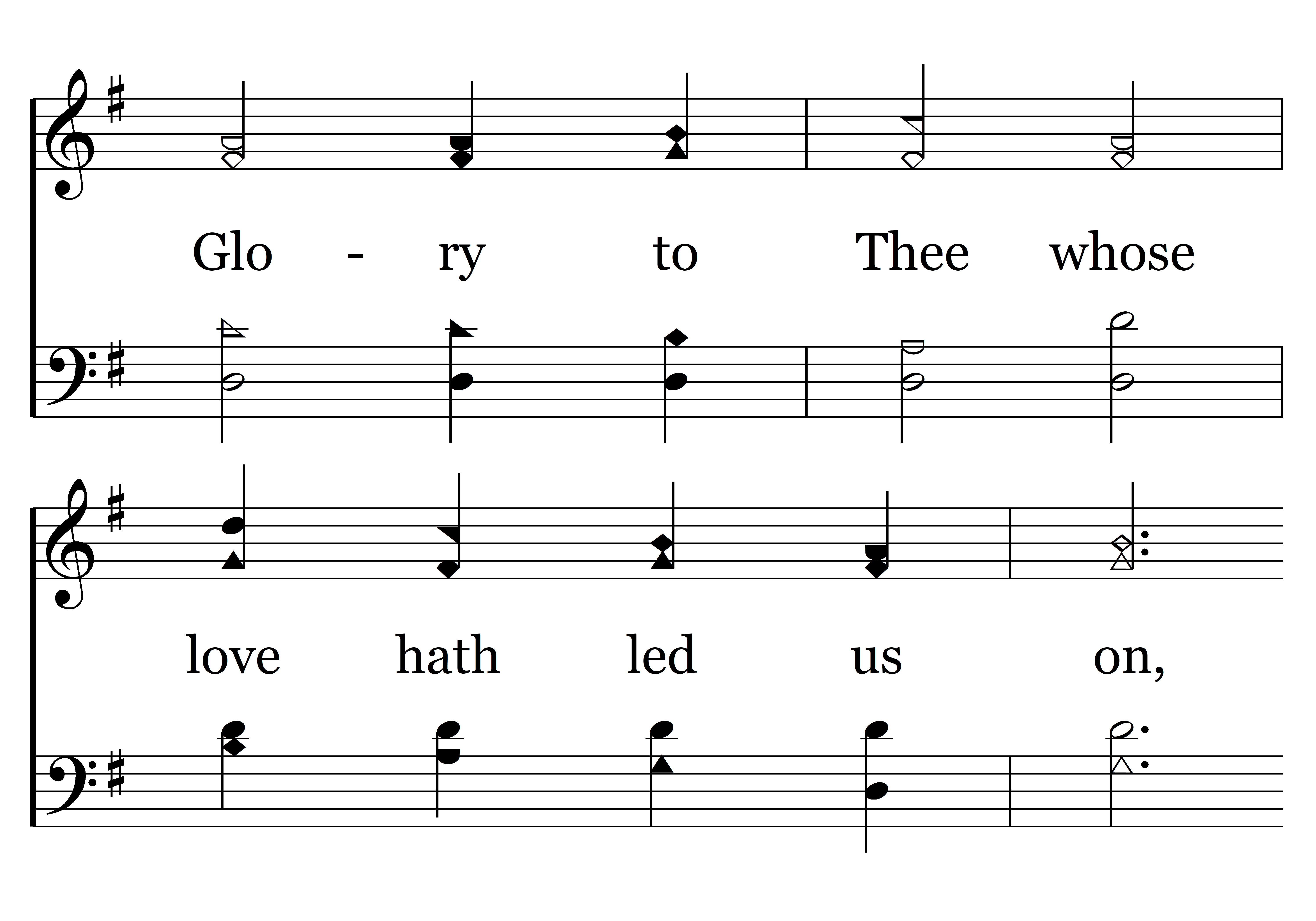 Now hallelujahs rise along the road Our glad feet tread; Thy love hath shared our sorrow's heavy load; There's light o'erhead: Glory to Thee whose love hath led us on, Glory for all the great things Thou hast done.