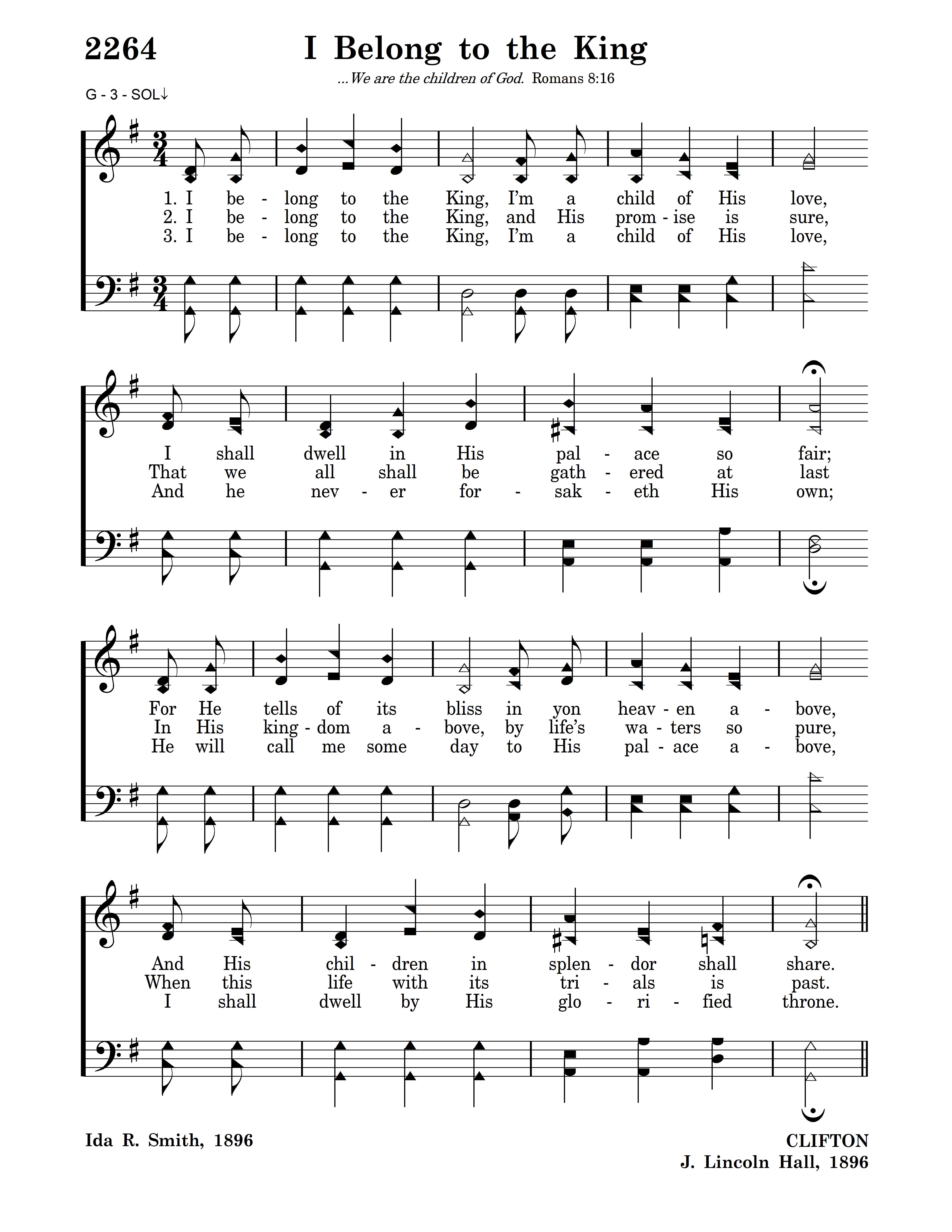 I belong to the King, and His promise is sure, That we all shall be gathered at last In His kingdom above, by life’s waters so pure, When this life with its trials is past.