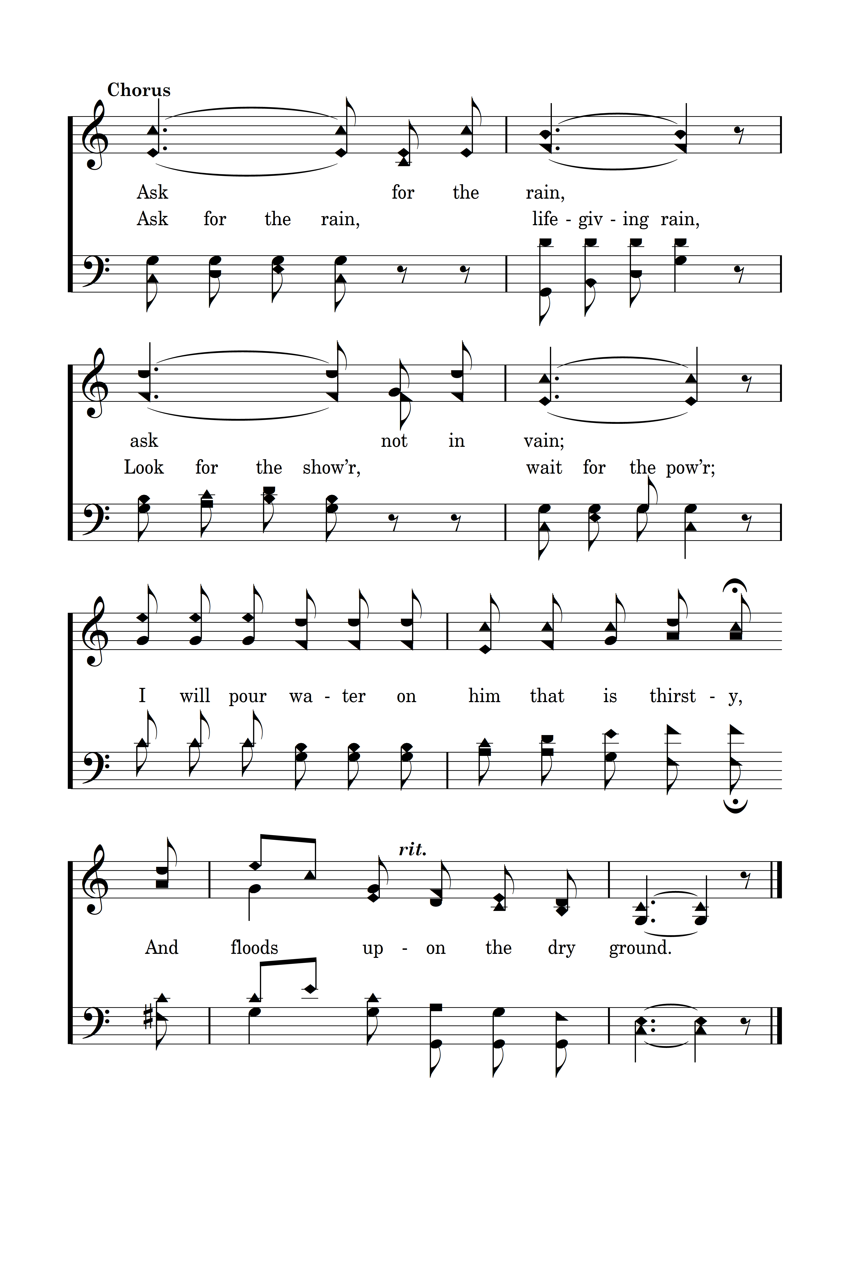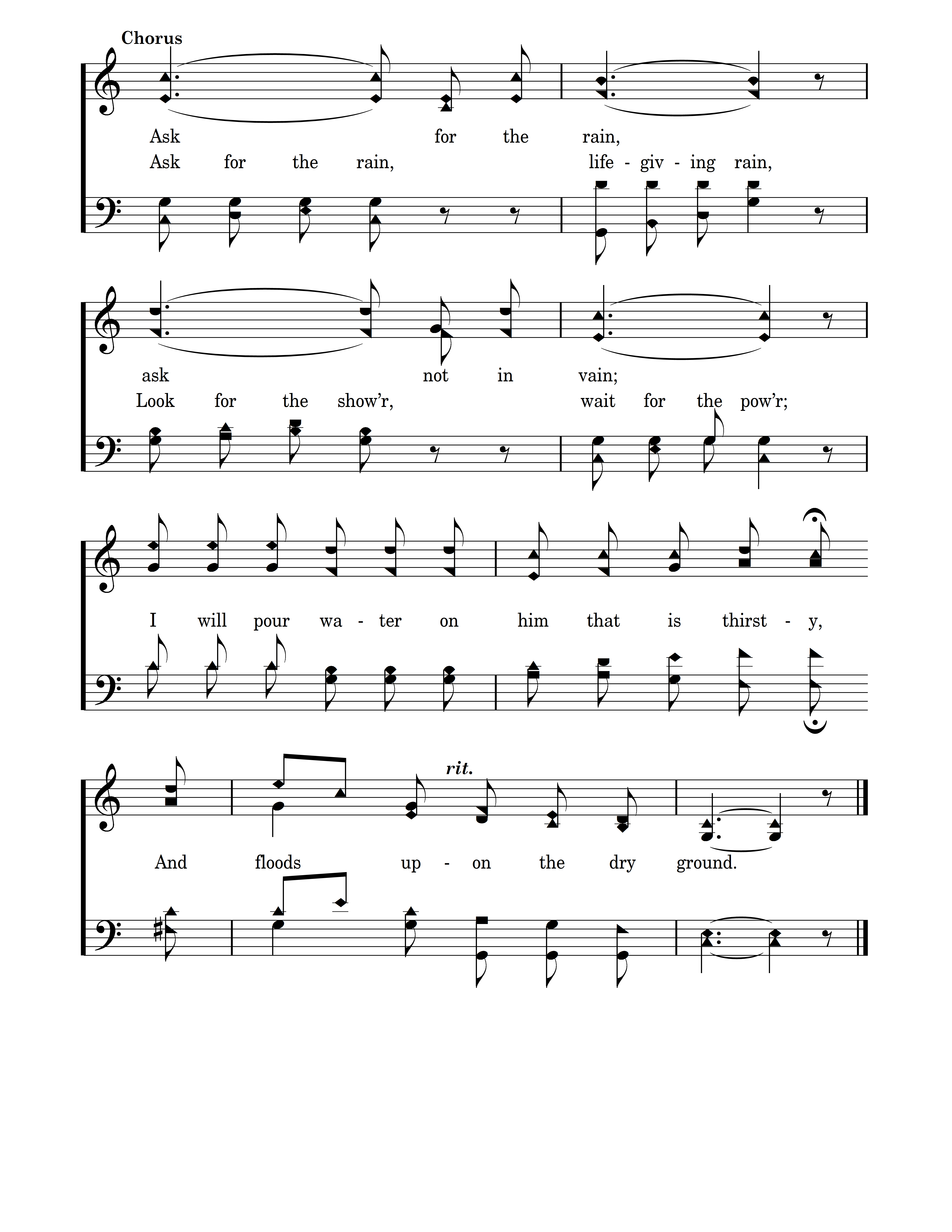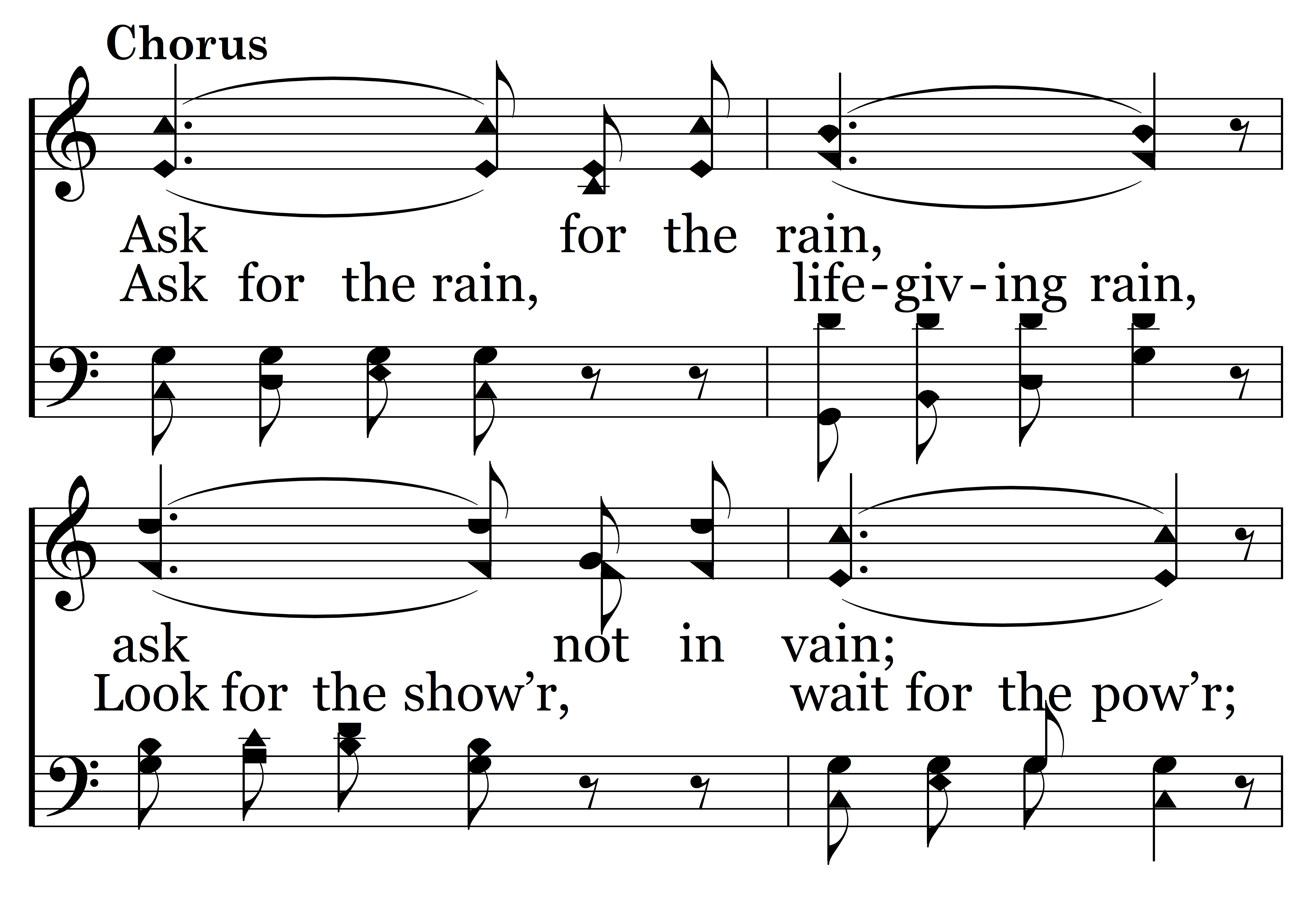 Ask for the rain, (Ask for the rain, life-giving rain,) ask not in vain; (Look for the show’r, wait for the pow’r;) “I will pour water on him that is thirsty, And floods upon the dry ground.”