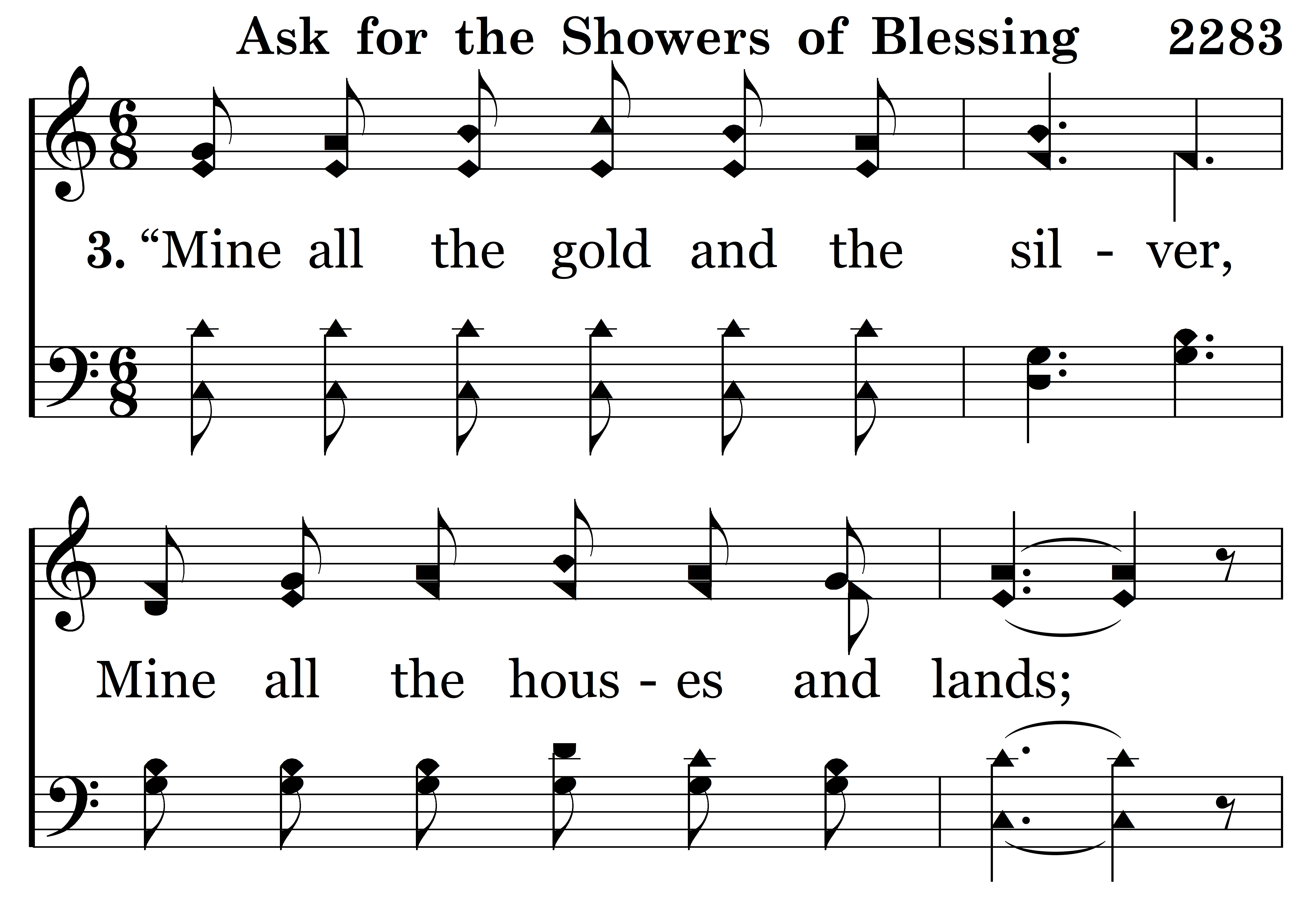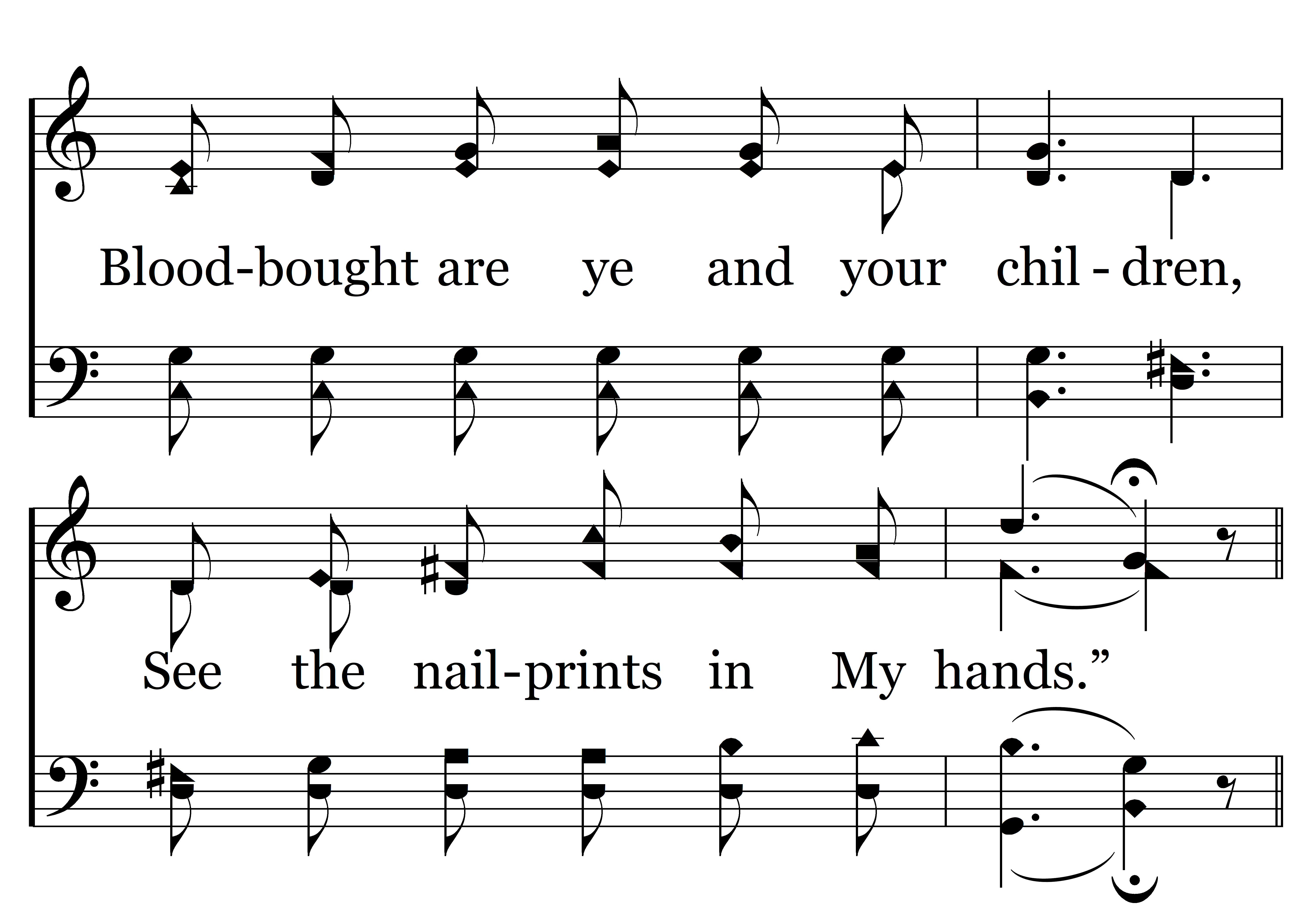 “Mine all the gold and the silver, Mine all the houses and lands; Blood-bought are ye and your children, See the nail-prints in My hands.”