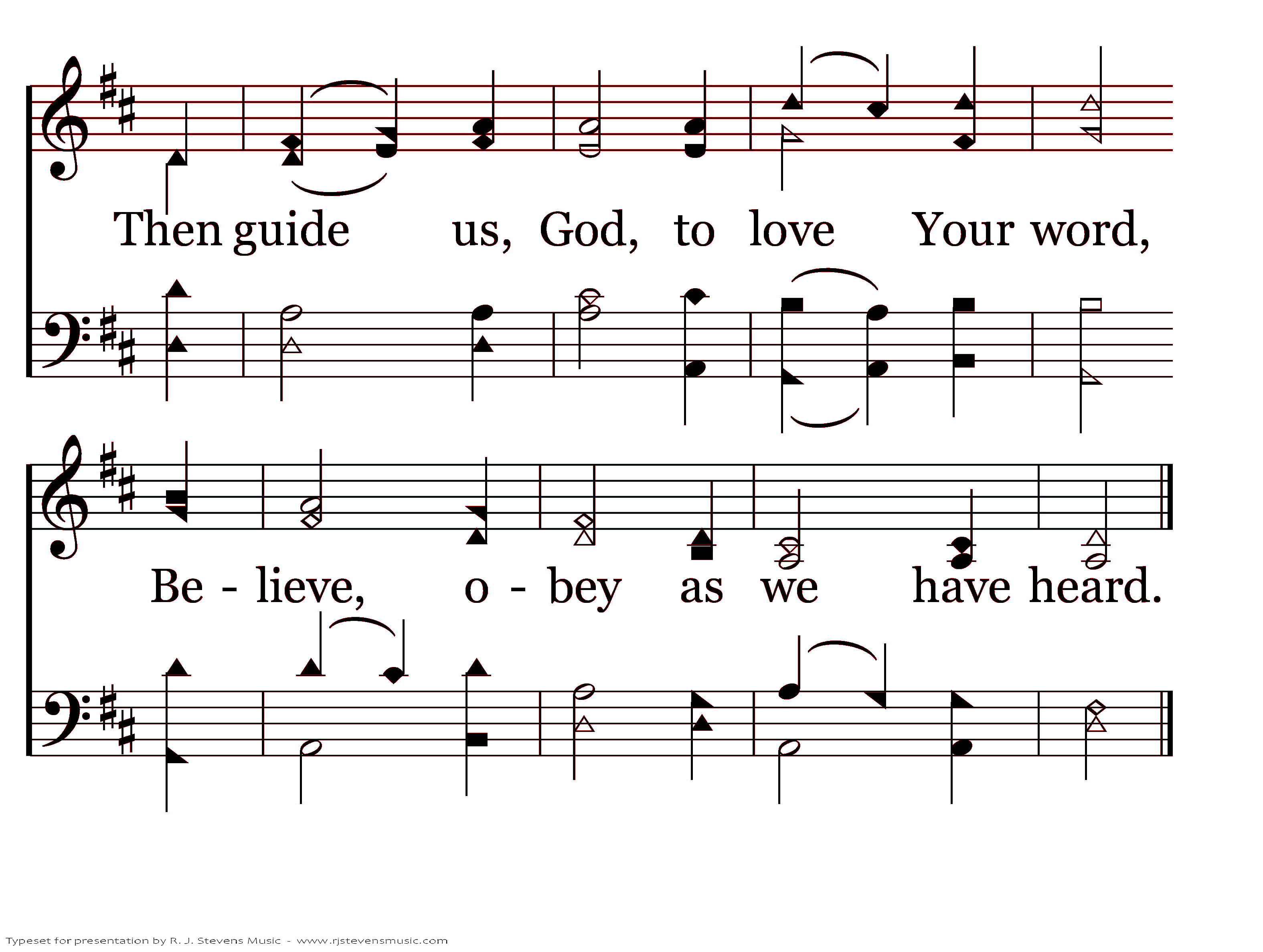 His word unites if we believe, And fellowship we then receive. Then guide us, God, to love Your word, Believe, obey as we have heard.
