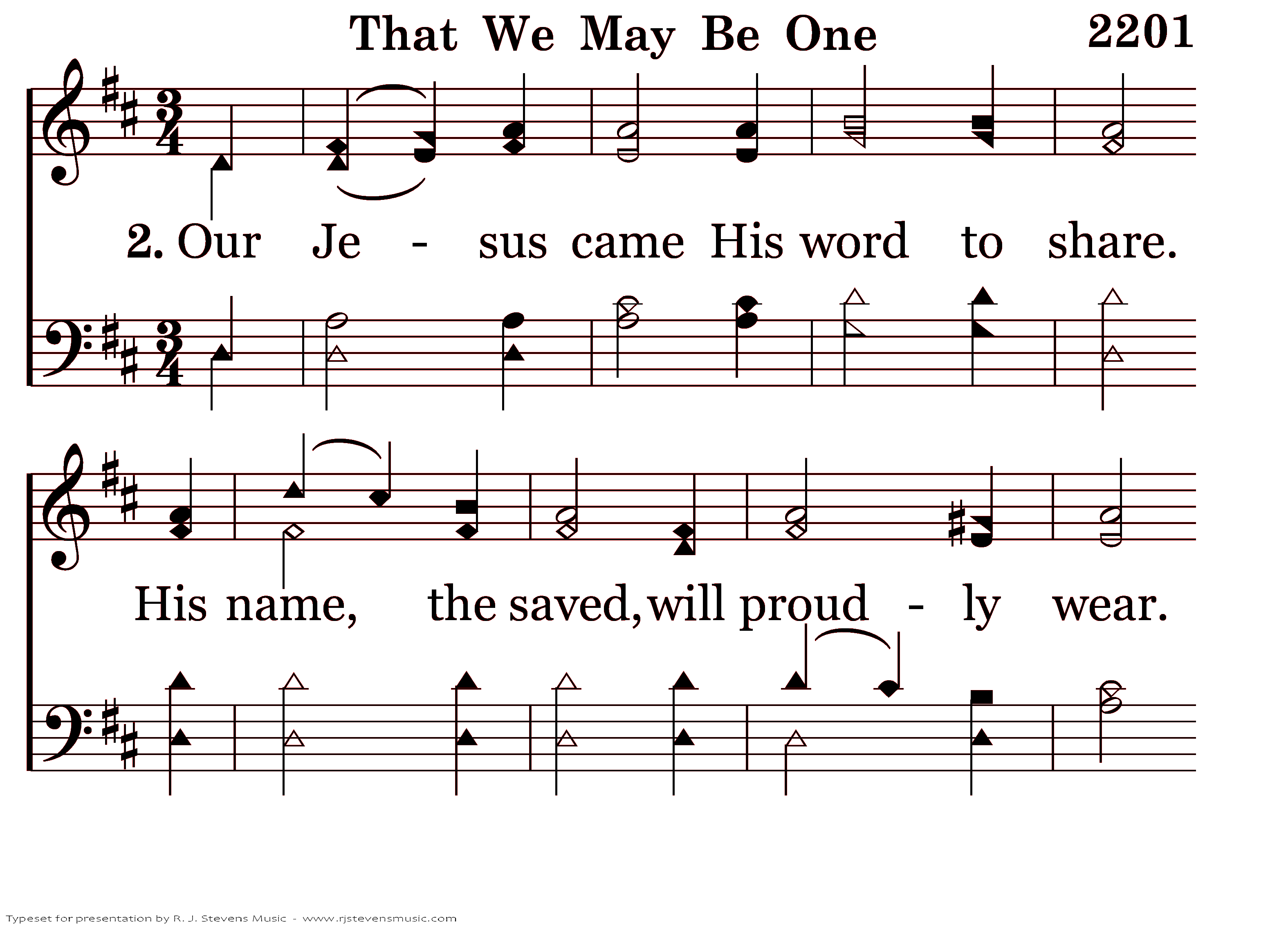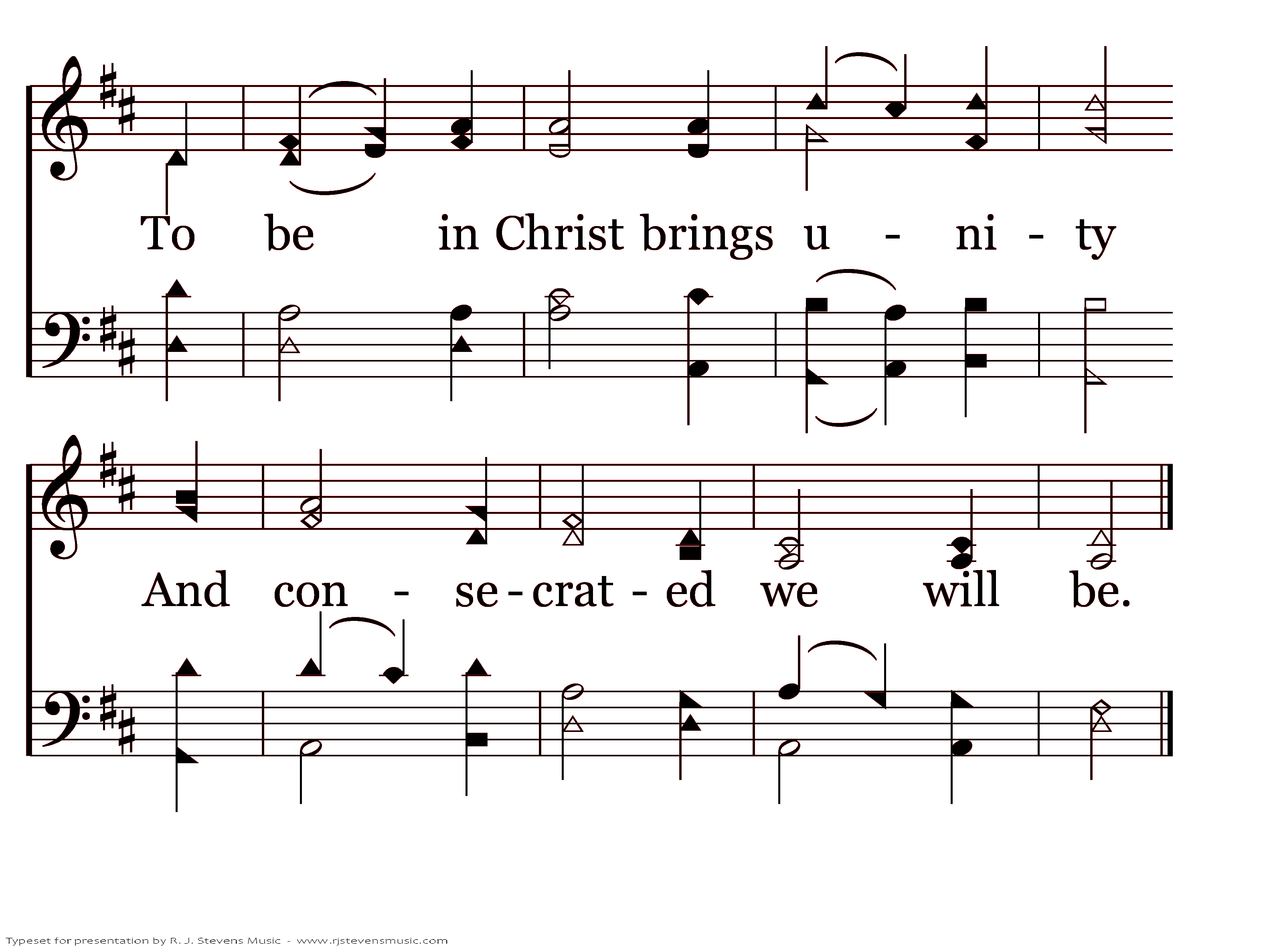 Our Jesus came His word to share. His name, the saved, will proudly wear. To be in Christ brings unity And consecrated we will be.