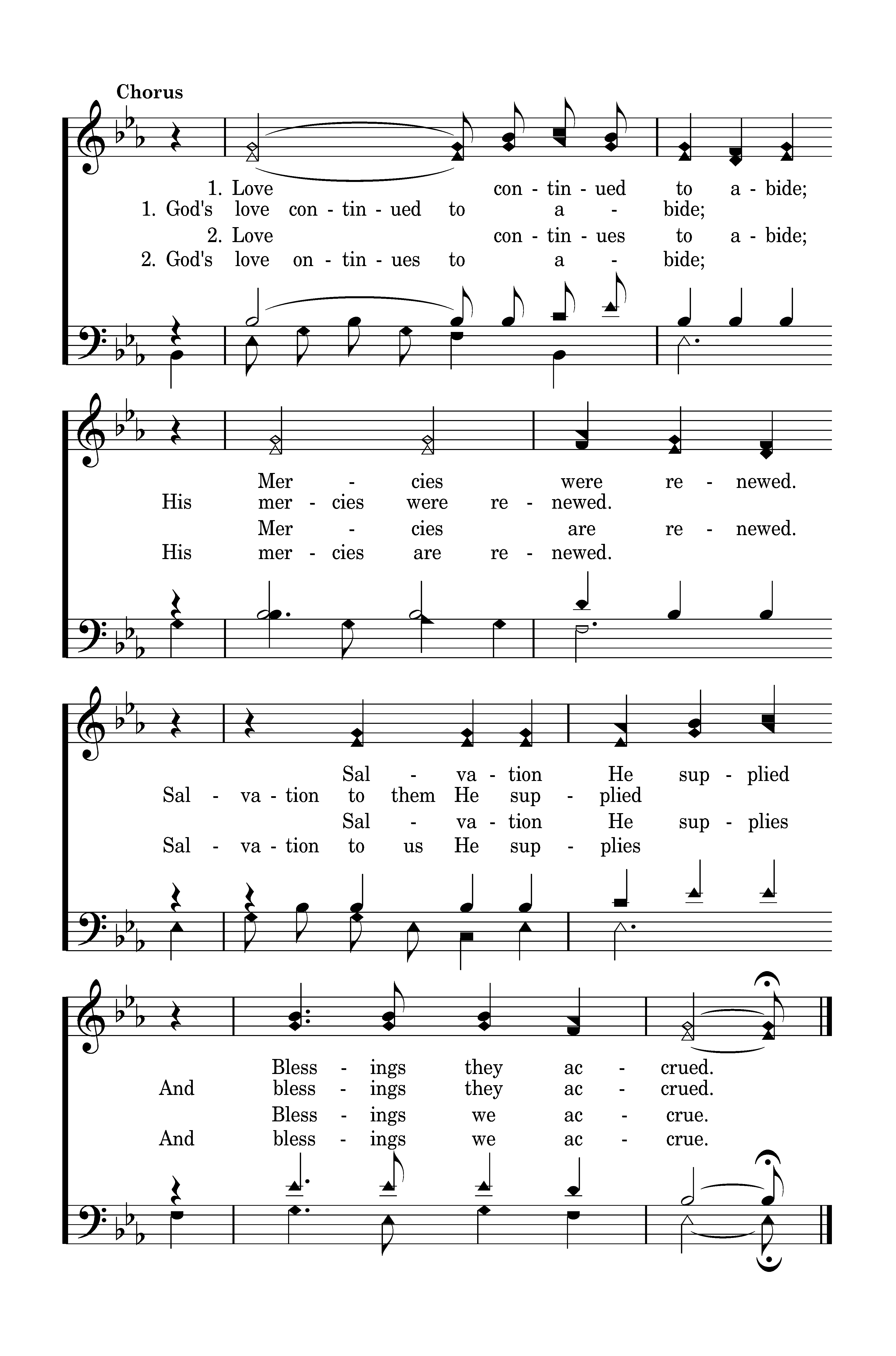 God's love continued to abide; His mercies were renewed. Salvation to them He supplied And blessings they accrued.