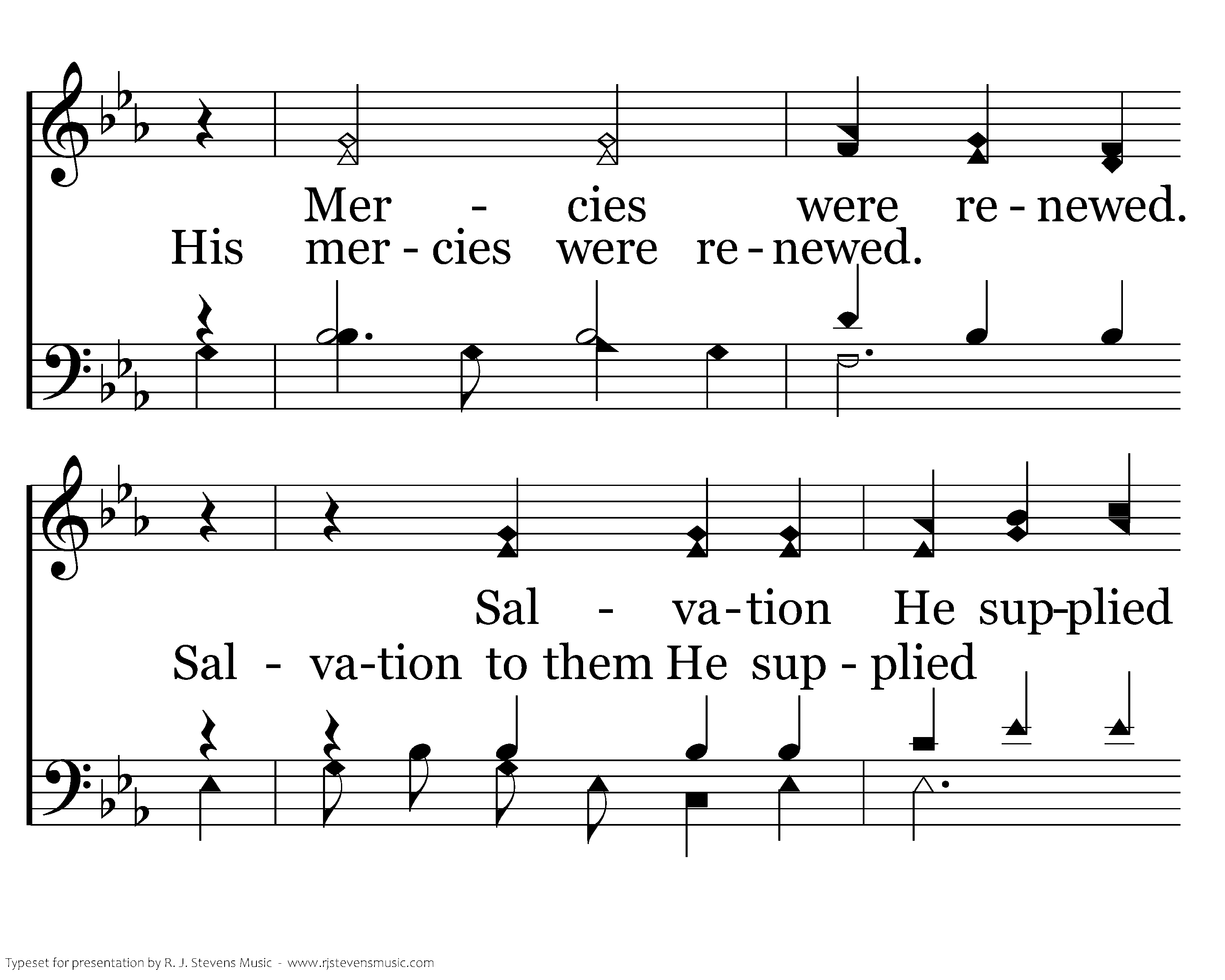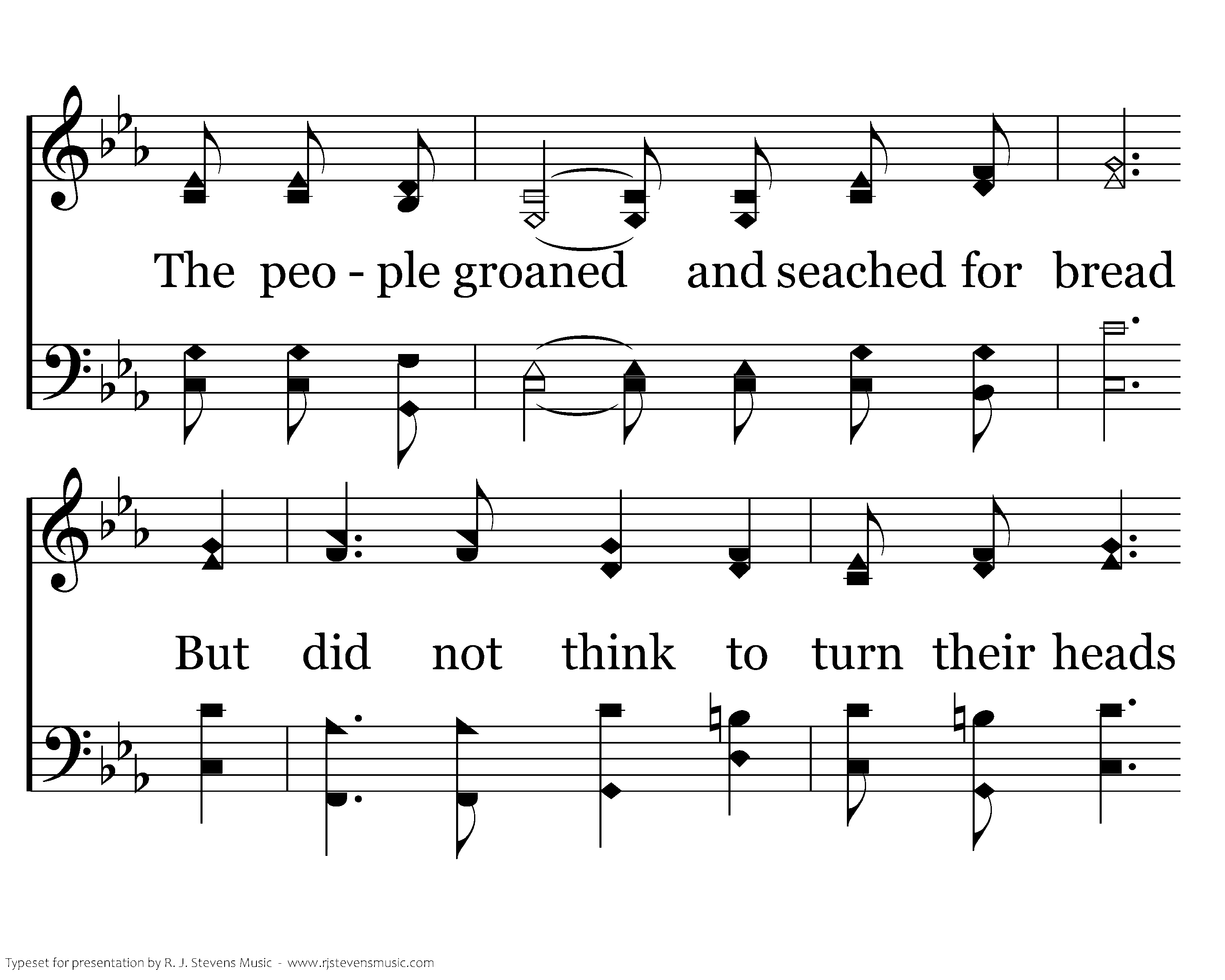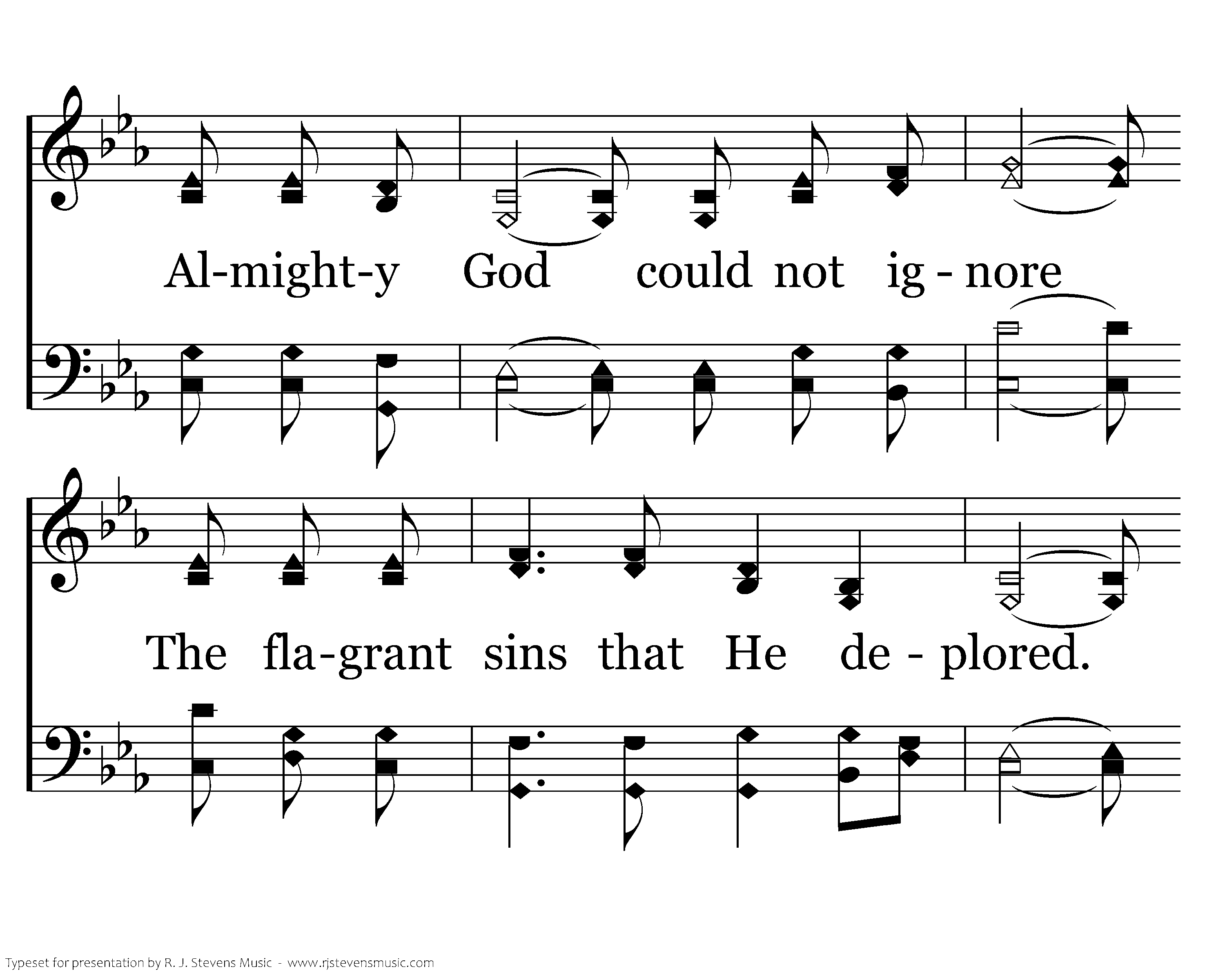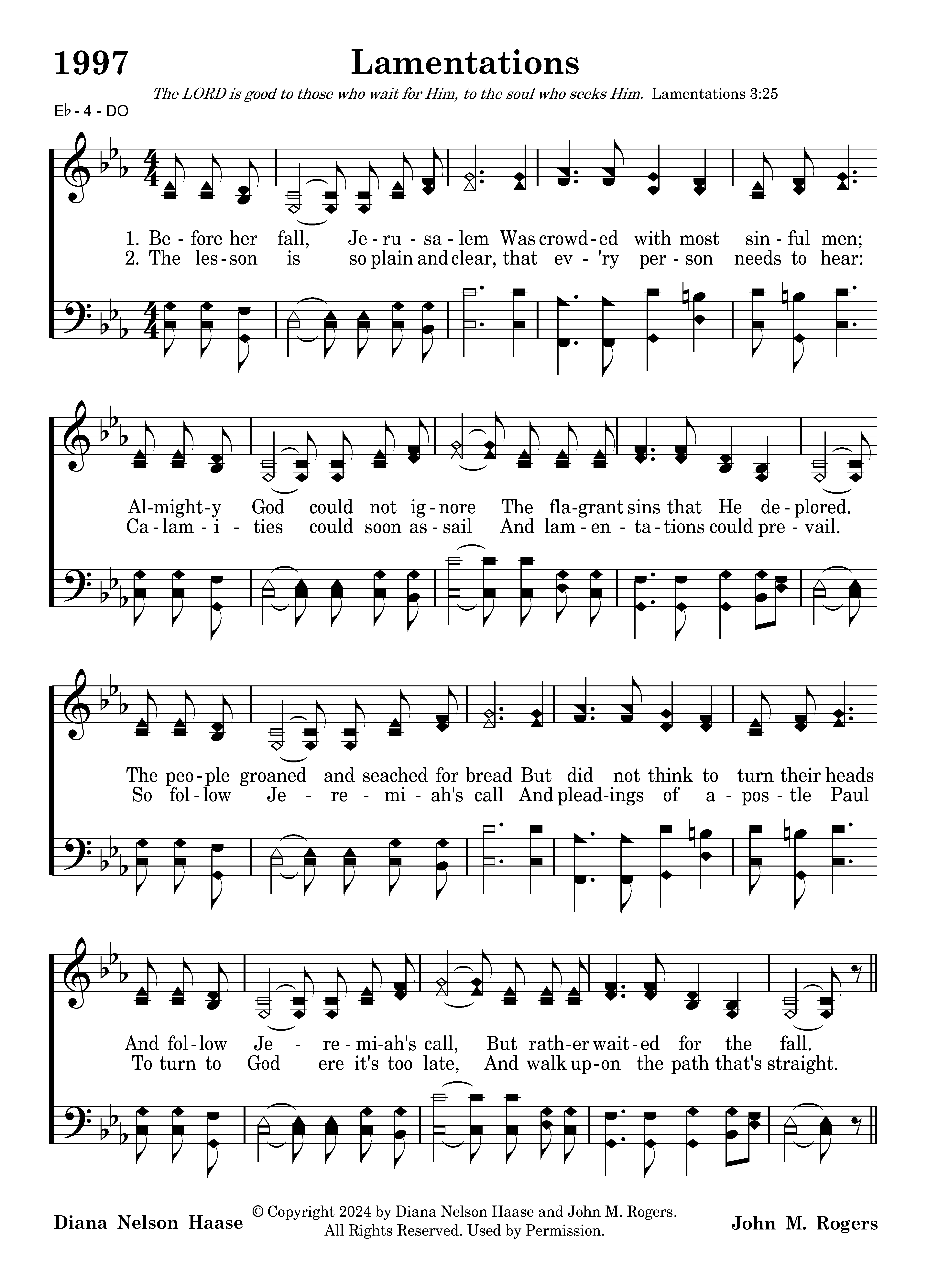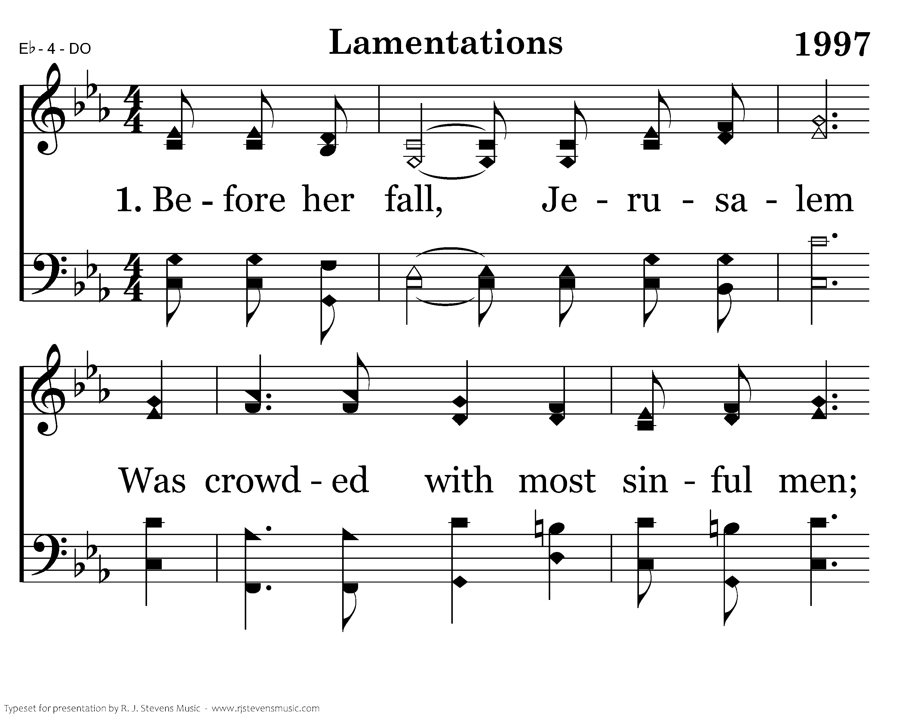 Before her fall, Jerusalem Was crowded with most sinful men; Almighty God could not ignore The flagrant sins that He deplored. The people groaned and seached for bread But did not think to turn their heads And follow Jeremiah's call, But rather waited for the fall. Love continued to abide; Mercies were renewed. Salvation He supplied Blessings they accrued.