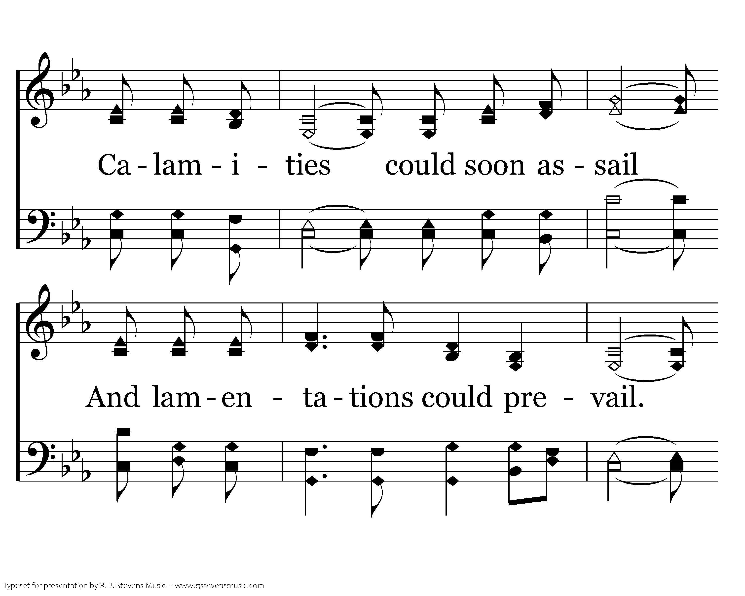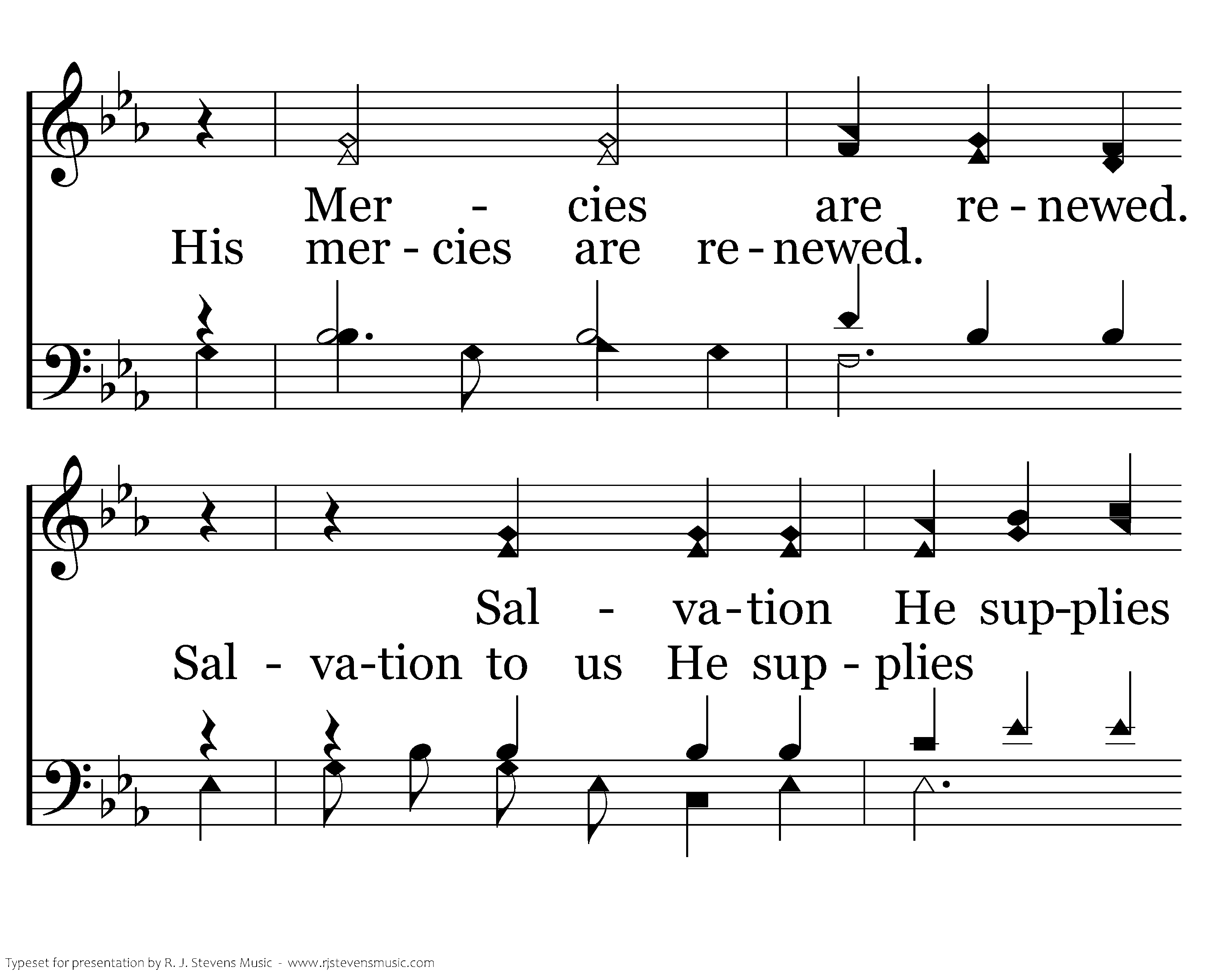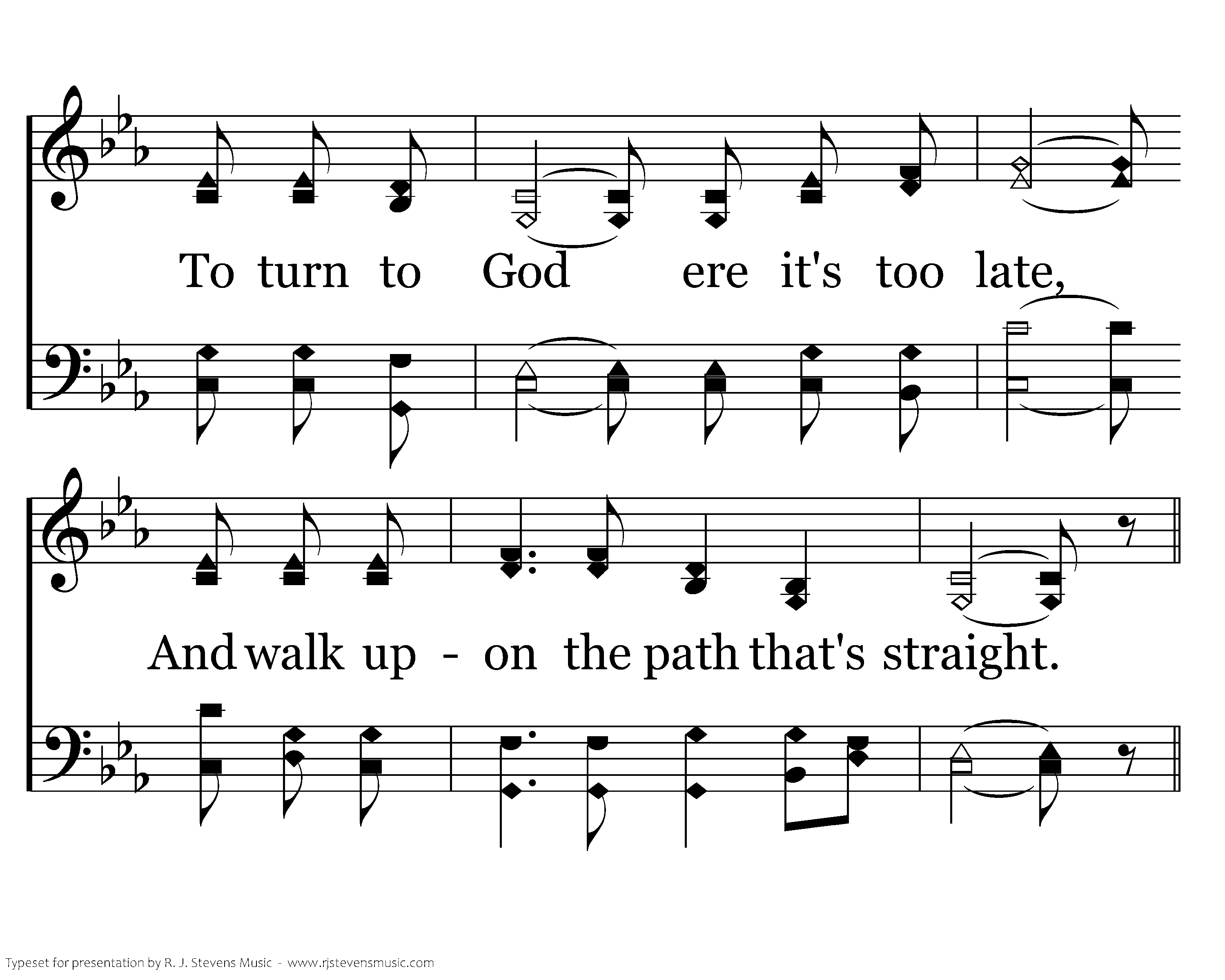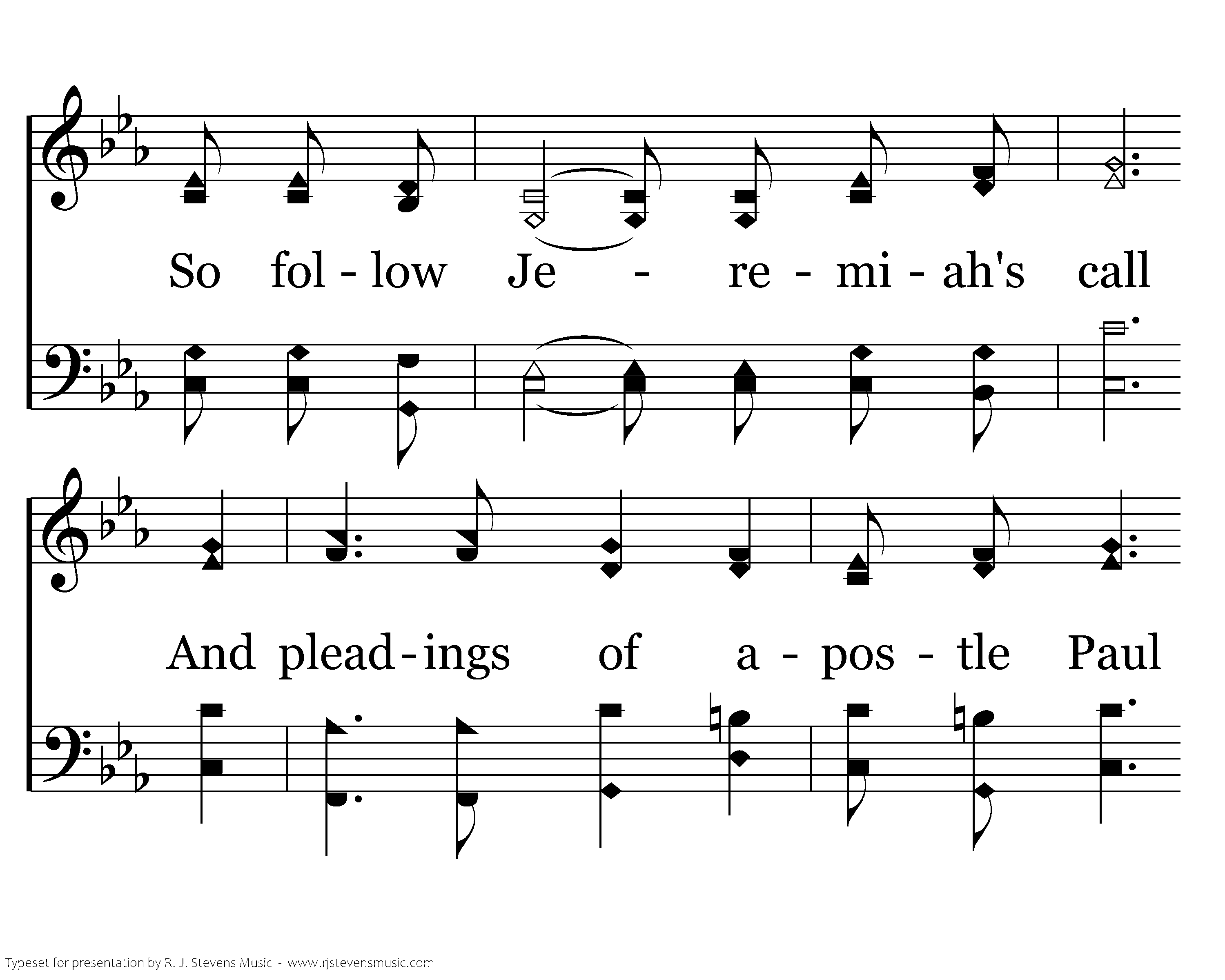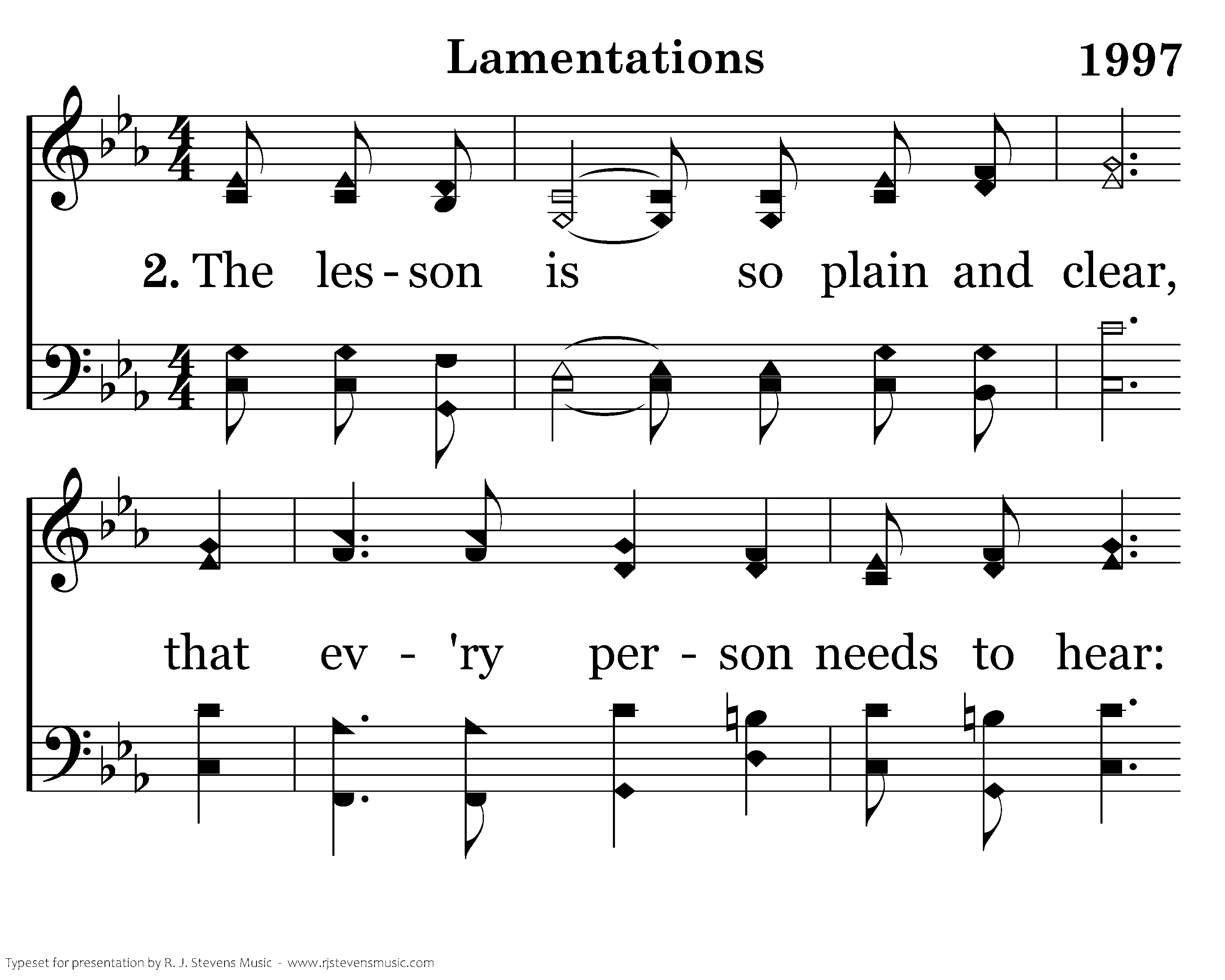 The lesson is so plain and clear, that ev'ry person needs to hear: Calamities could soon assail And lamentations could prevail. So follow Jeremiah's call And pleadings of apostle Paul To turn to God ere it's too late, And walk upon the path that's straight. Love continues to abide; Mercies are renewed. Salvation He supplies Blessings we accrue.