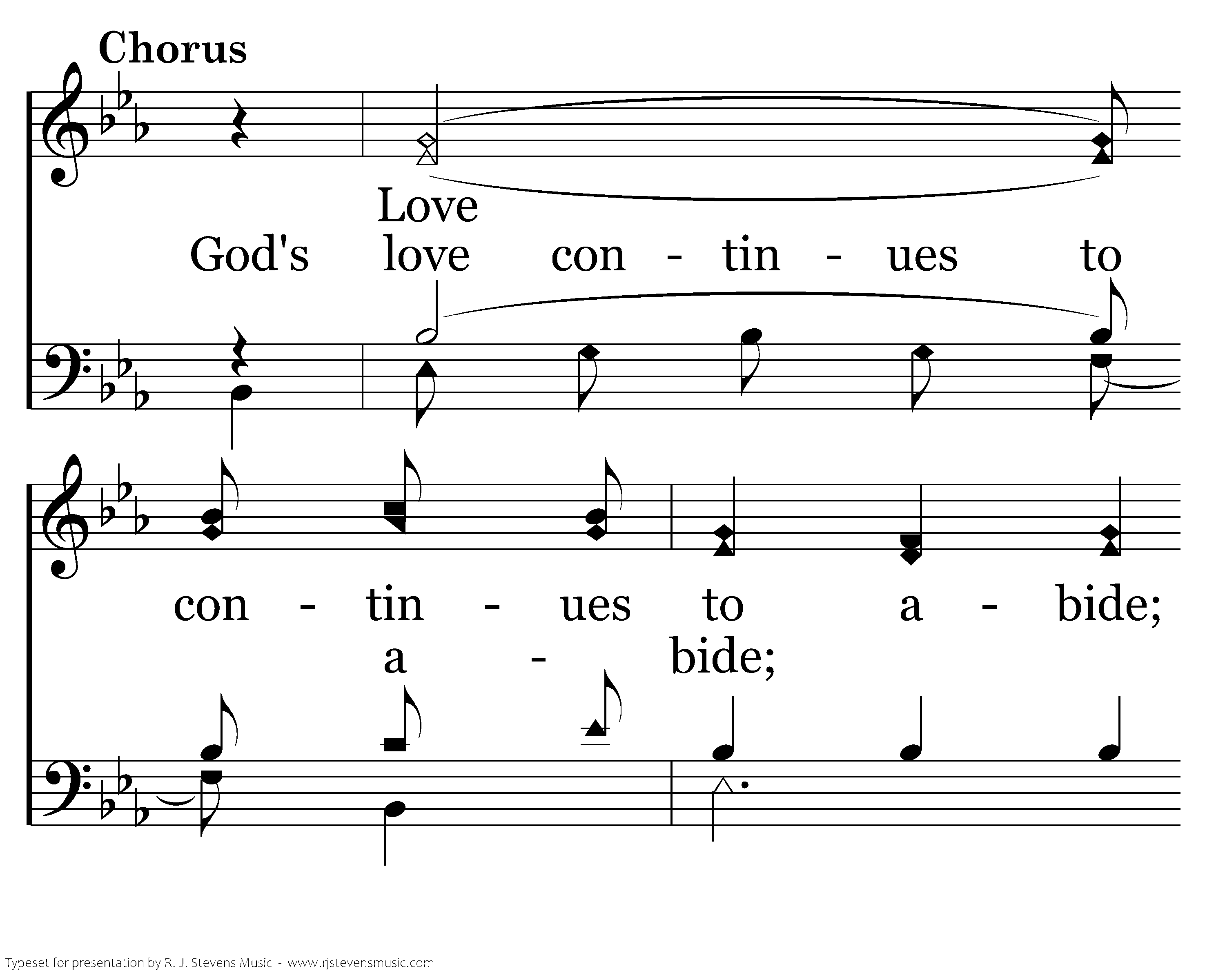 God's love continues to abide; His mercies are renewed. Salvation to us He supplies And blessings we accrue.