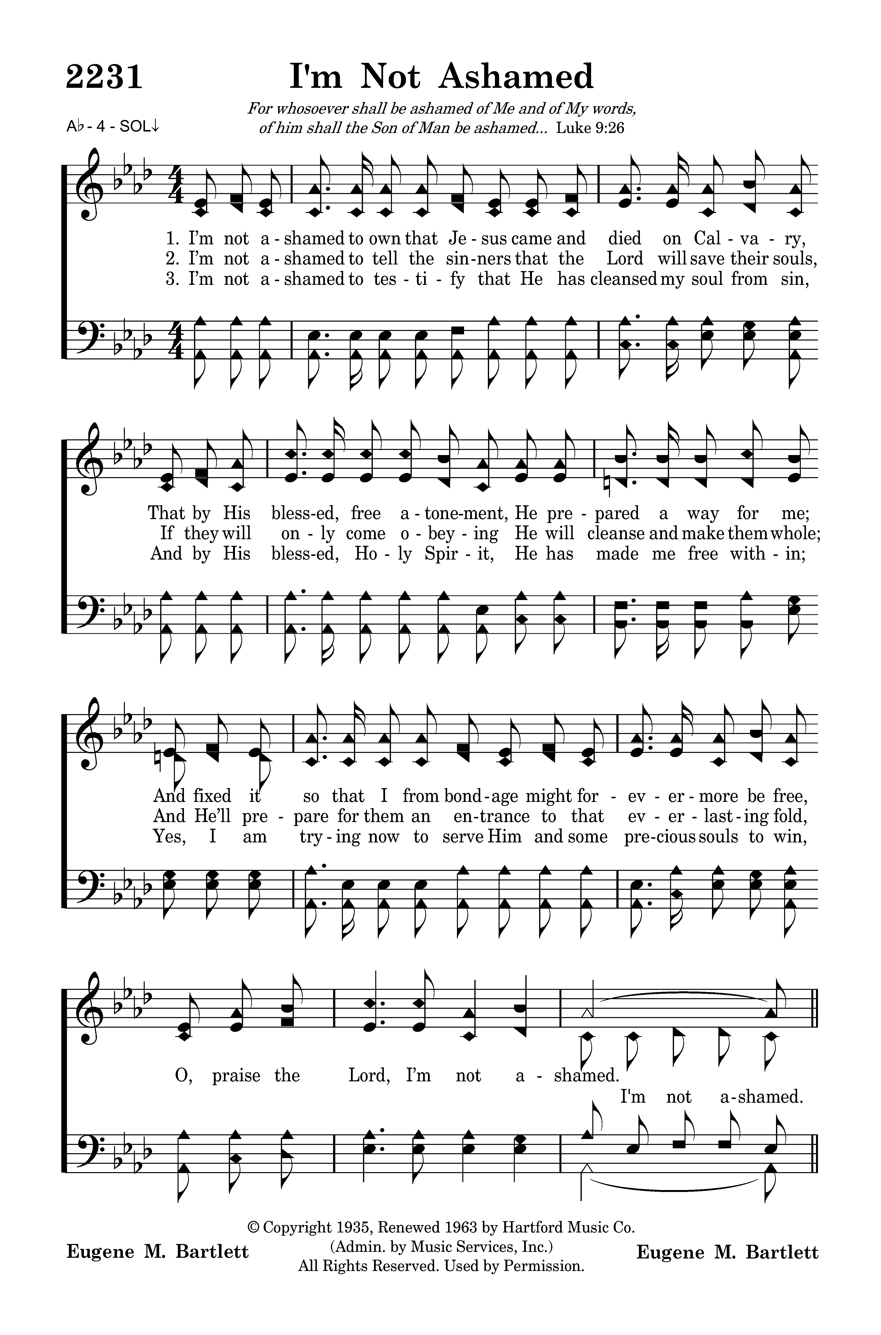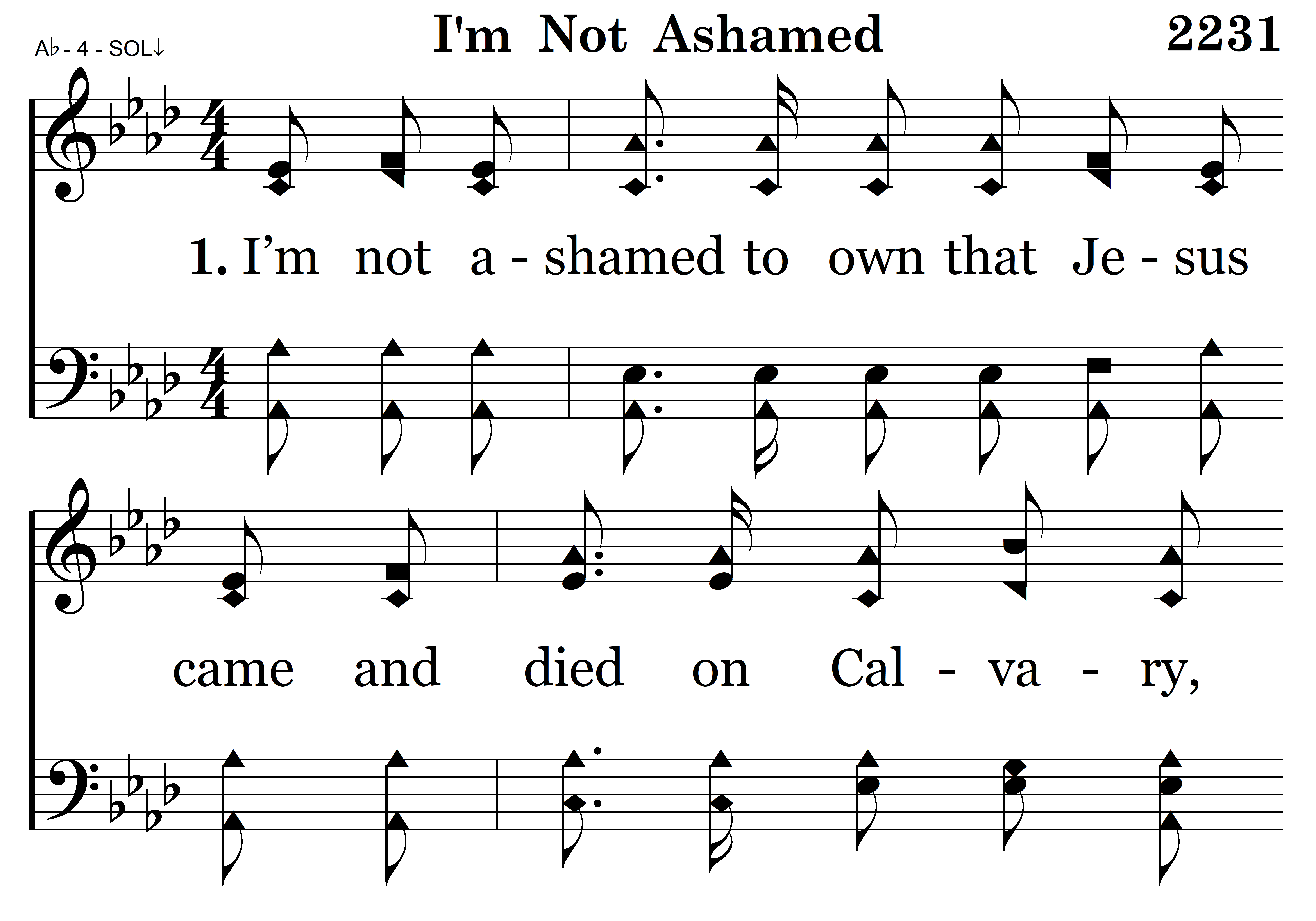 I’m not ashamed to own that Jesus came and died on Calvary, That by His blessed, free atonement, He prepared a way for me; And fixed it so that I from bondage might forevermore be free, O, praise the Lord, I’m not ashamed.