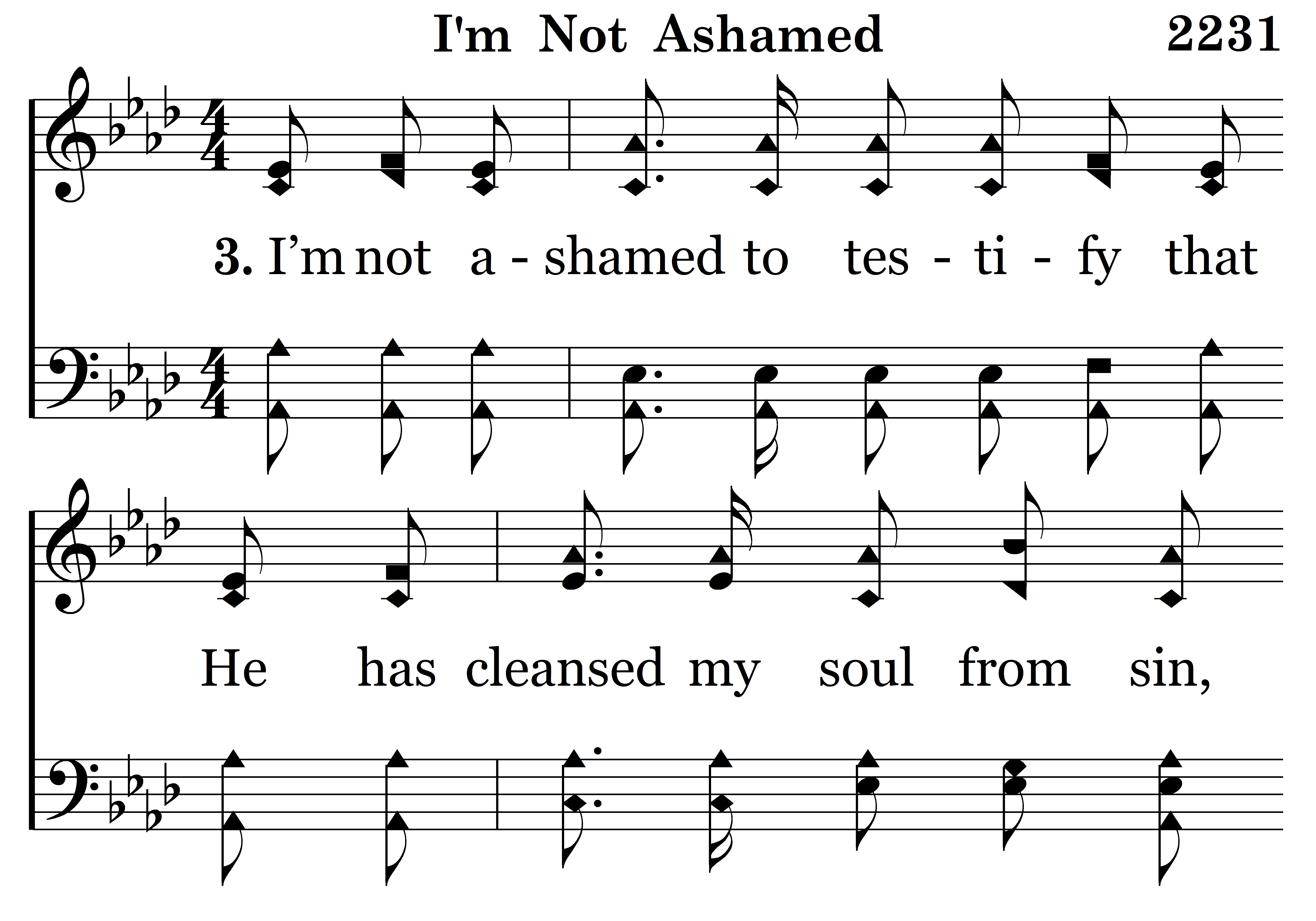 I’m not ashamed to testify that He has cleansed my soul from sin, And by His blessed, Holy Spirit, He has made me free within; Yes, I am trying now to serve Him and some precious souls to win, O, praise the Lord, I’m not ashamed.