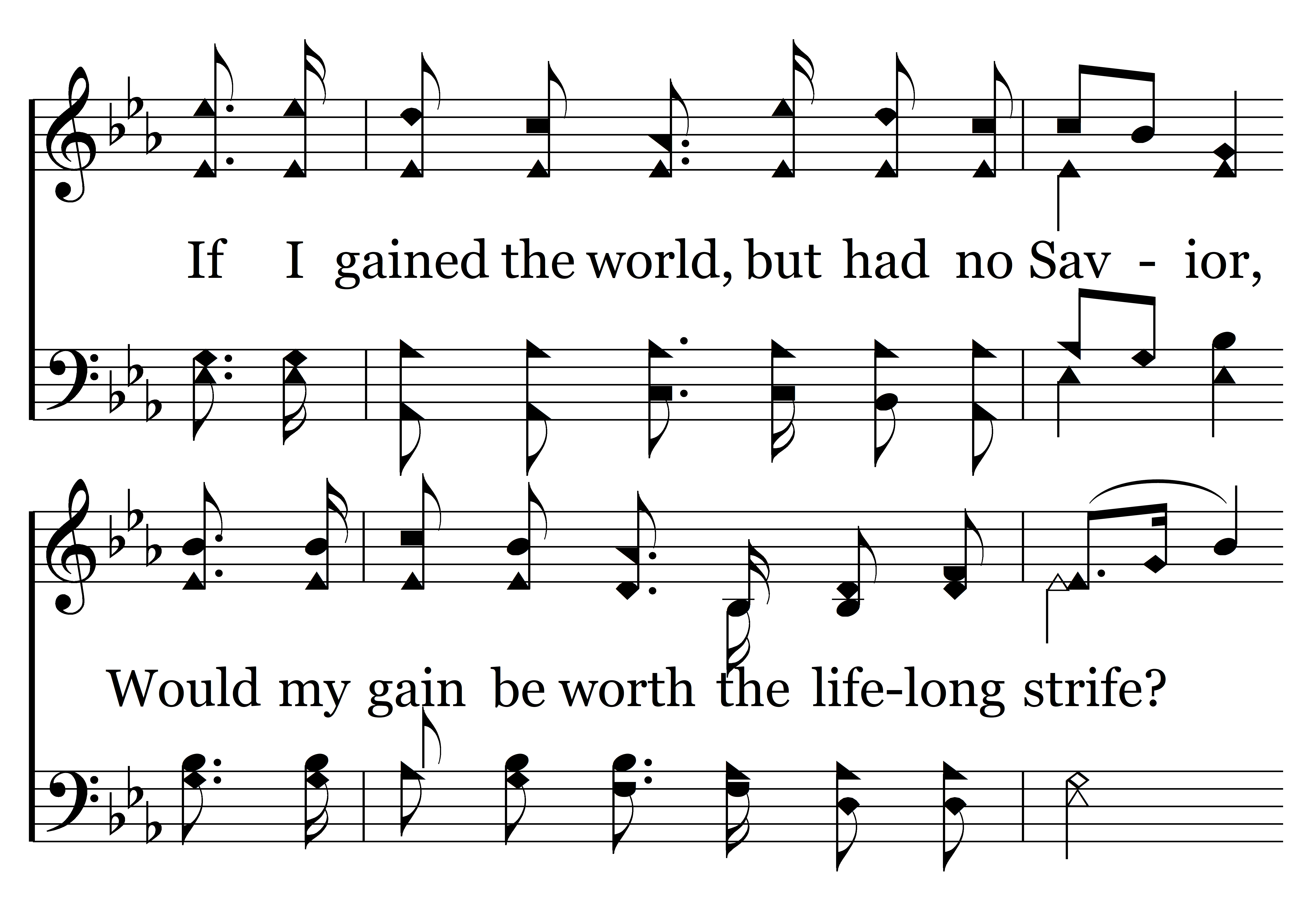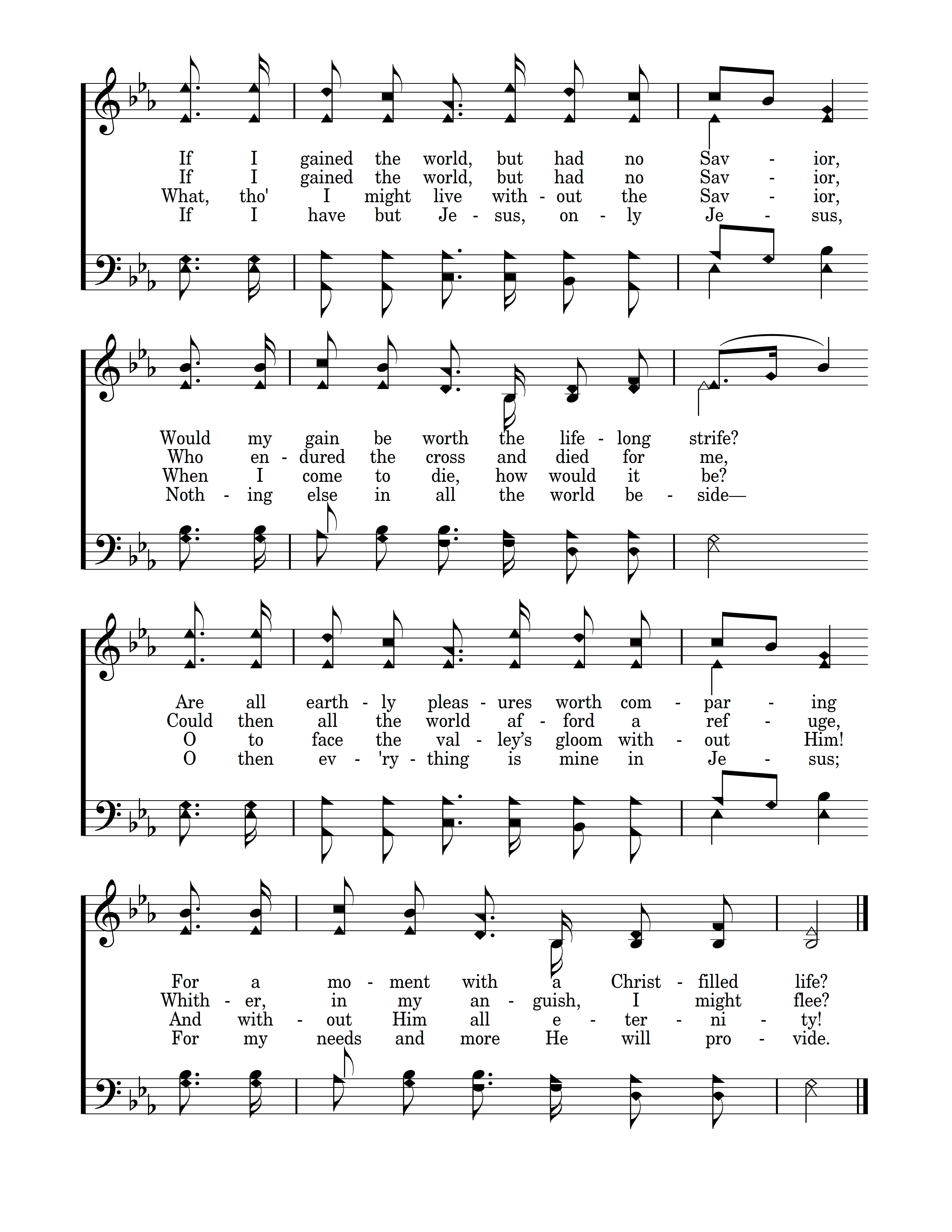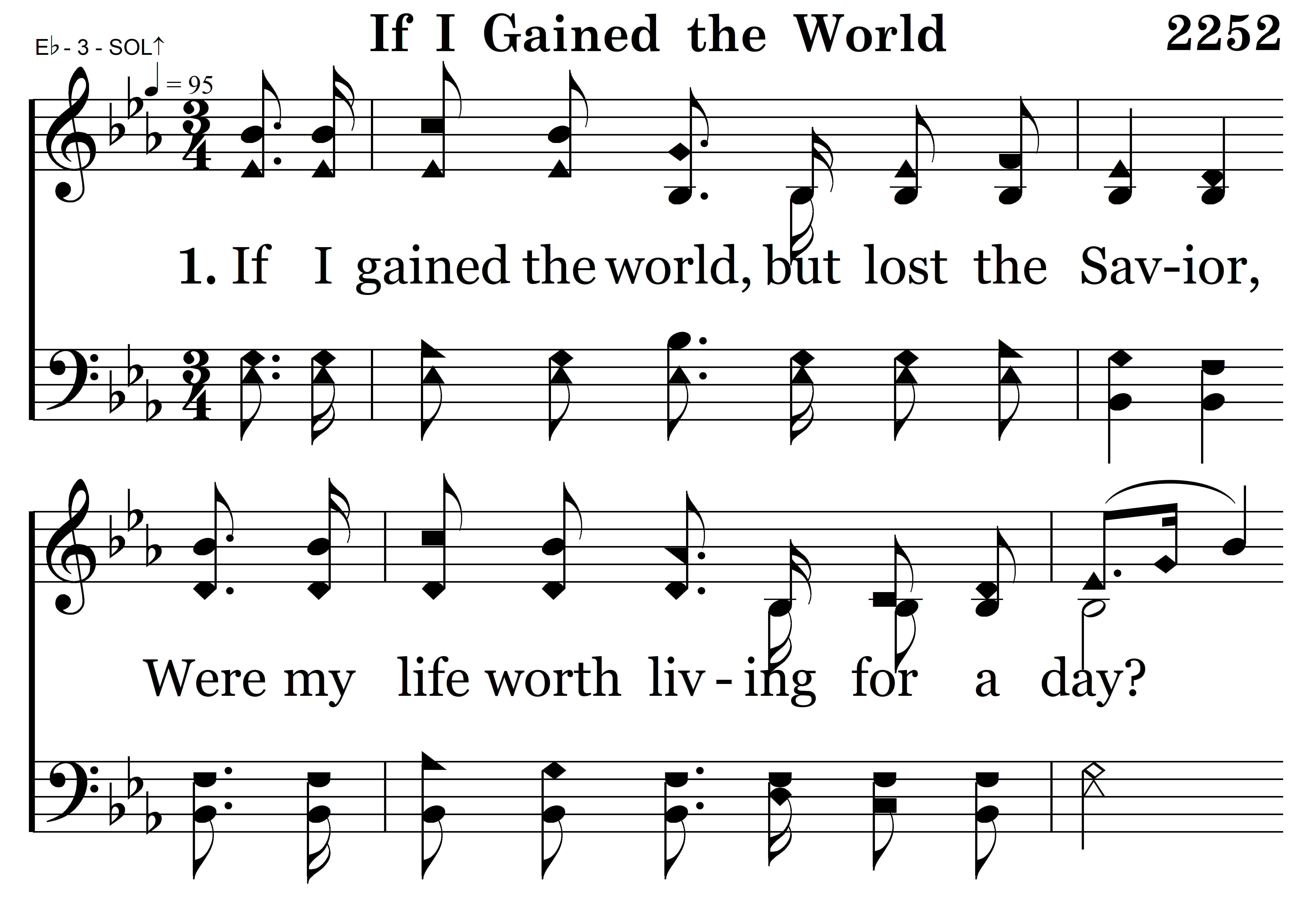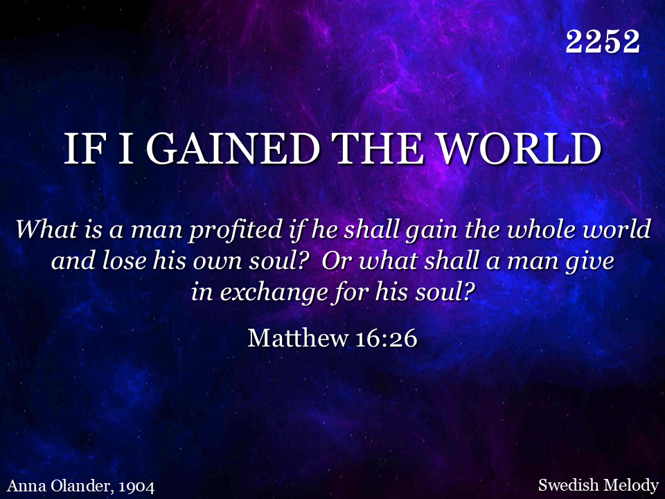 If I gained the world, but lost the Savior, Were my life worth living for a day? Could my yearning heart find rest and comfort In the things that soon must pass away? If I gained the world, but had no Savior, Would my gain be worth the life-long strife? Are all earthly pleasures worth comparing For a moment with a Christ-filled life?