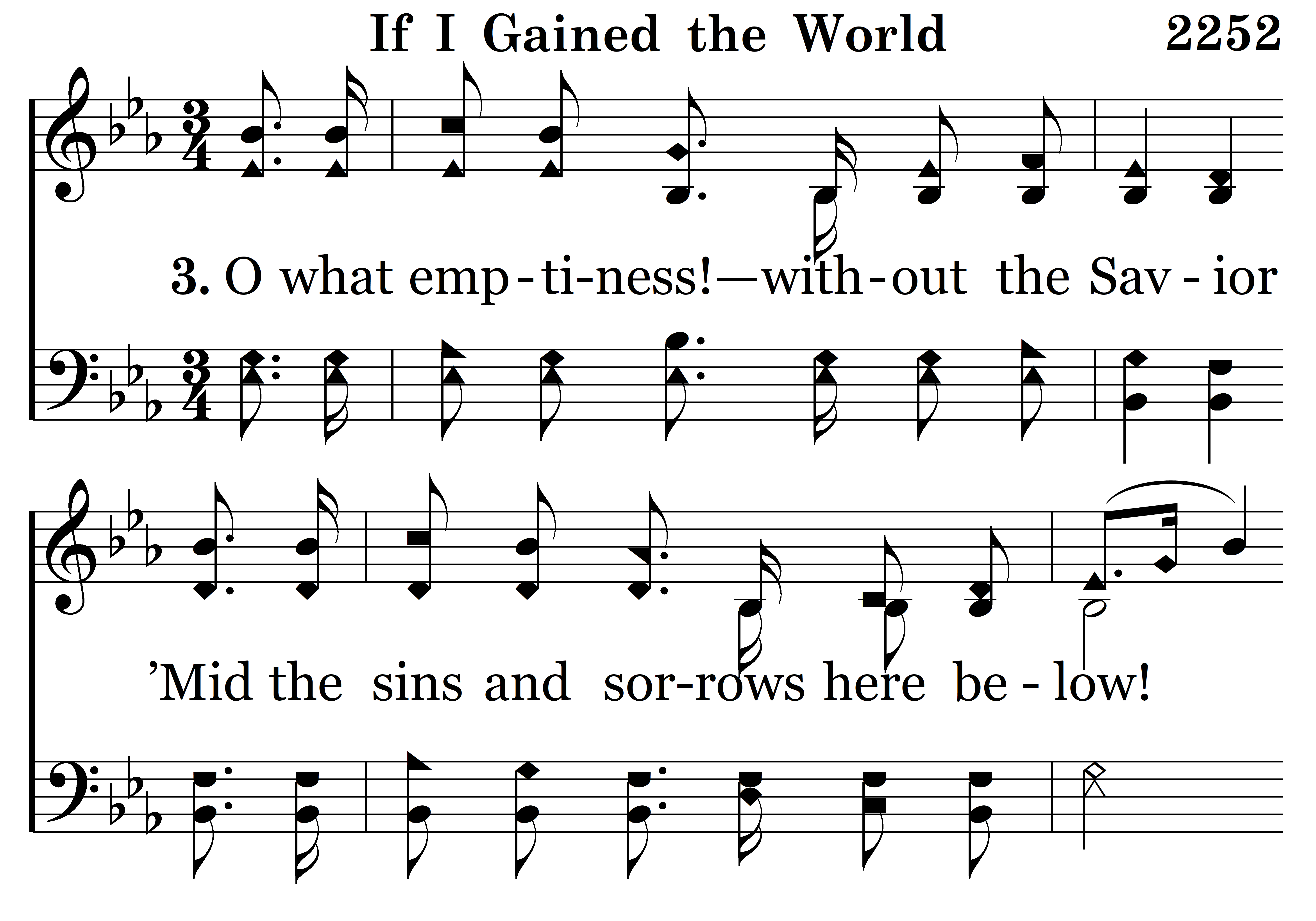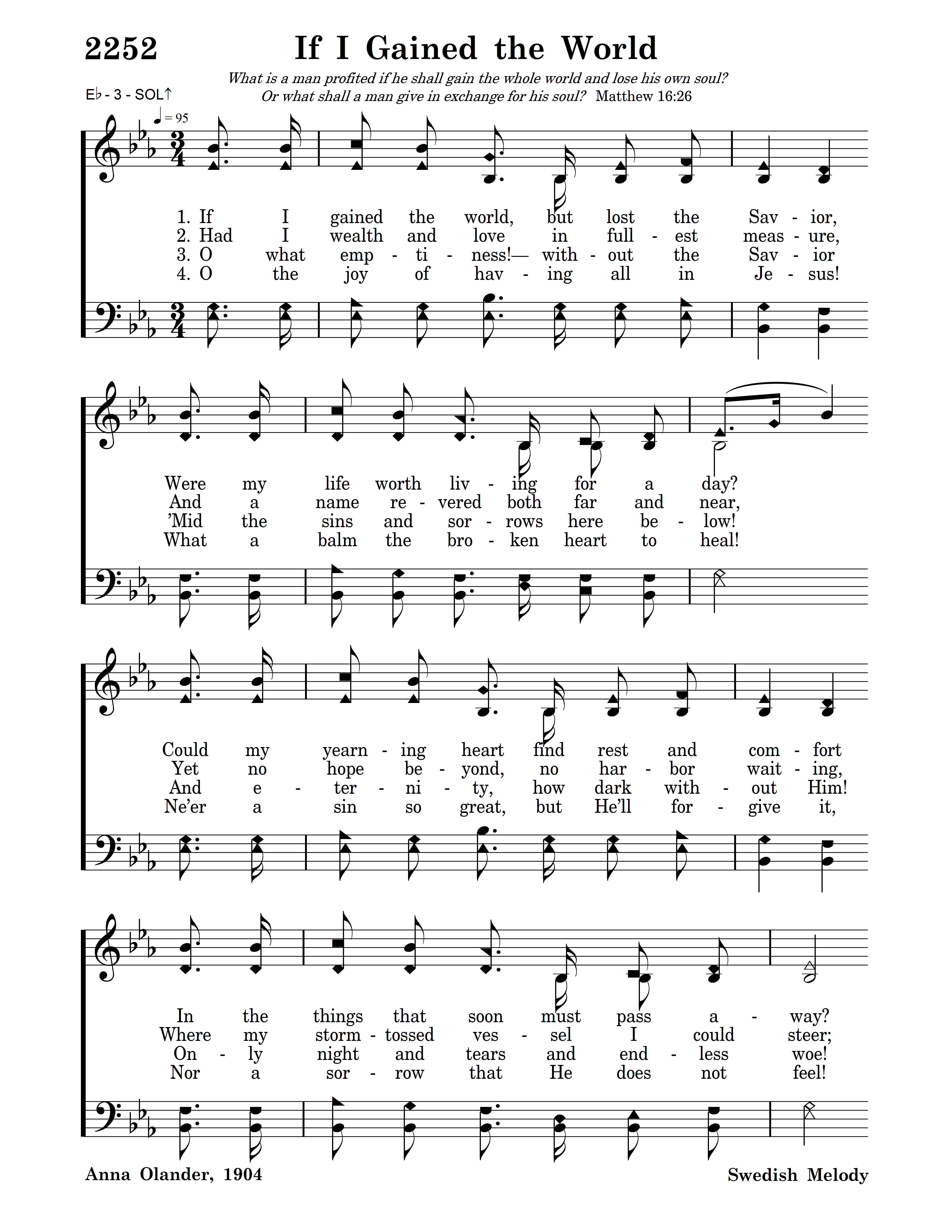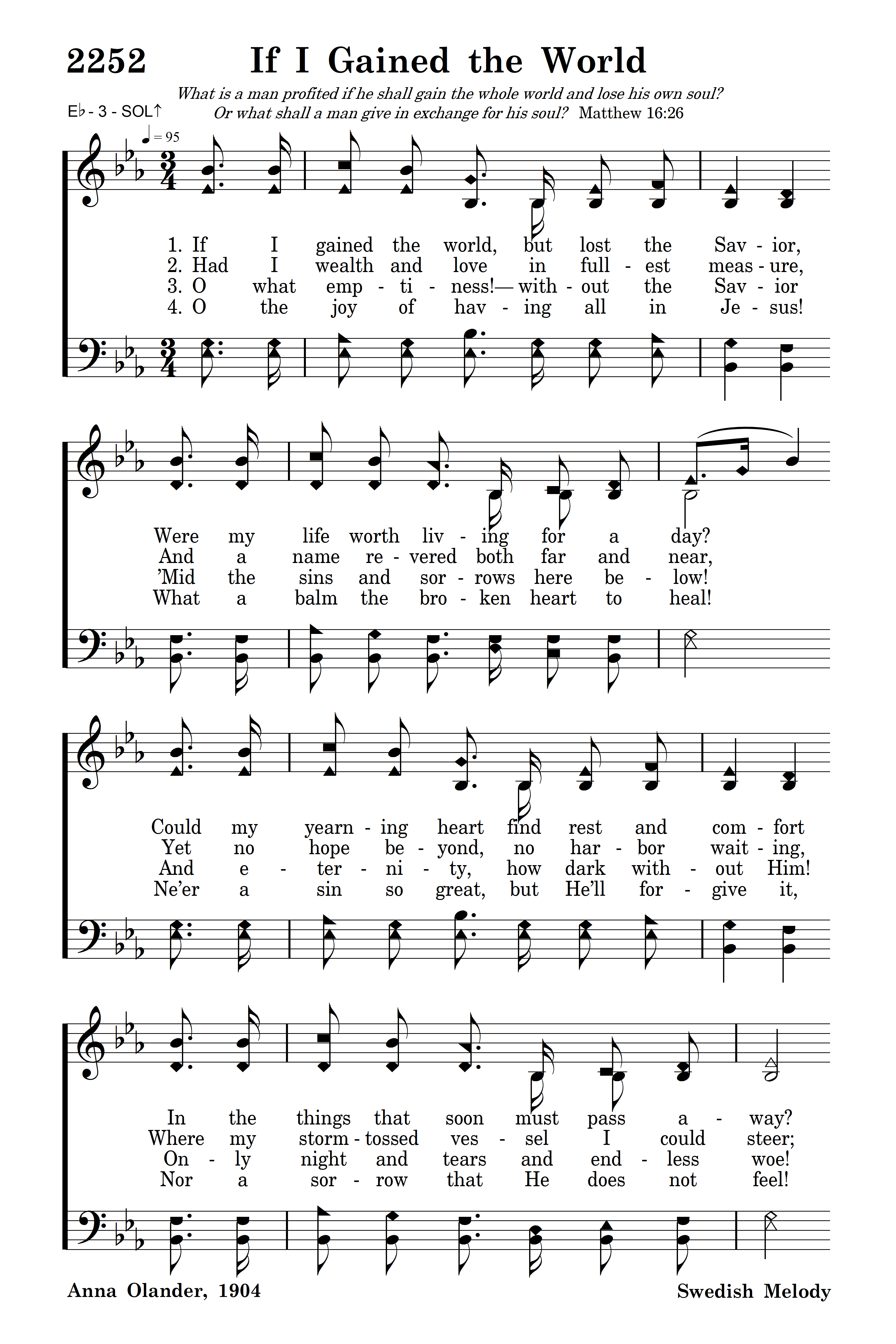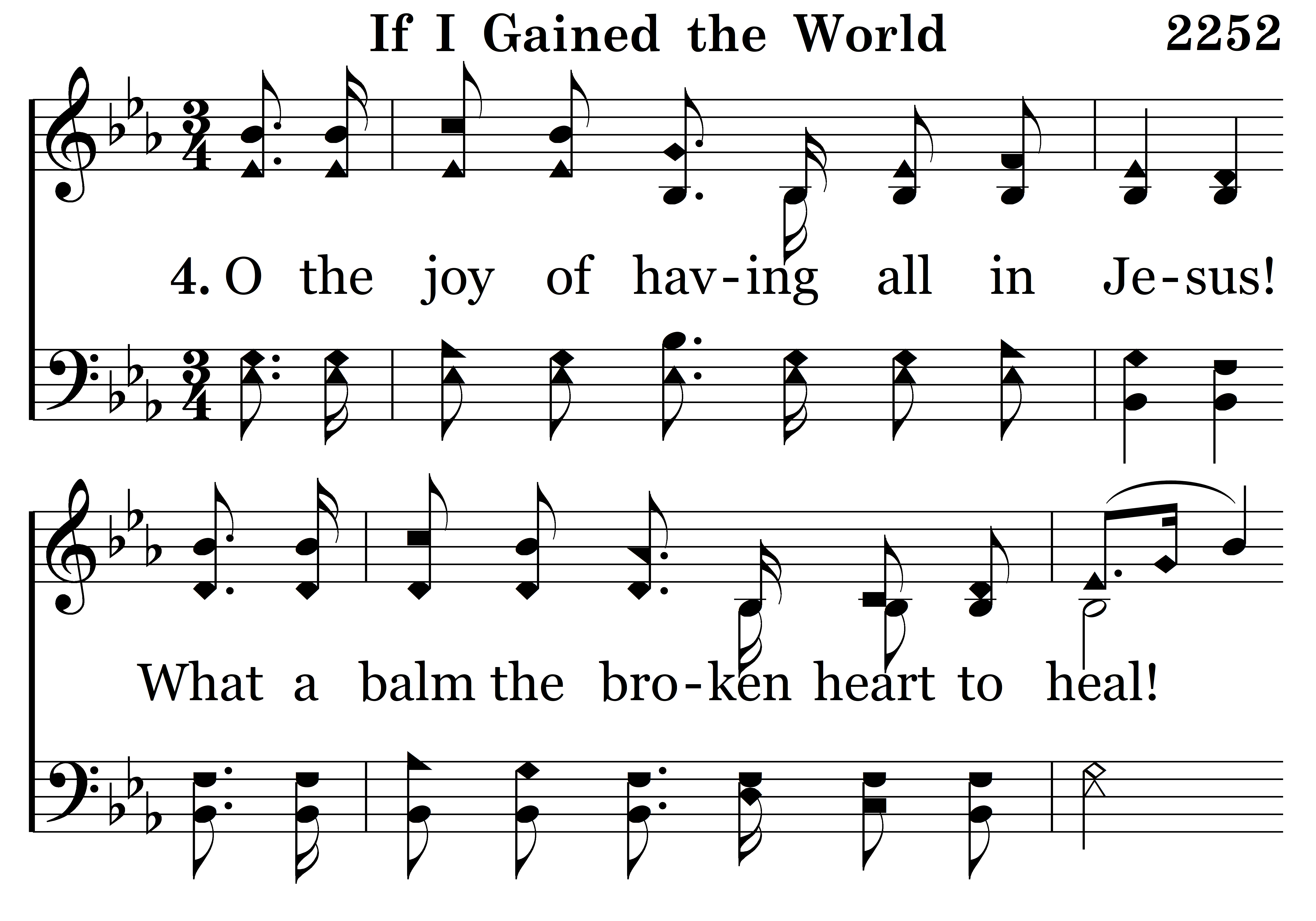 If I gained the world, but lost the Savior, Were my life worth living for a day? Could my yearning heart find rest and comfort In the things that soon must pass away? If I gained the world, but had no Savior, Would my gain be worth the life-long strife? Are all earthly pleasures worth comparing For a moment with a Christ-filled life?