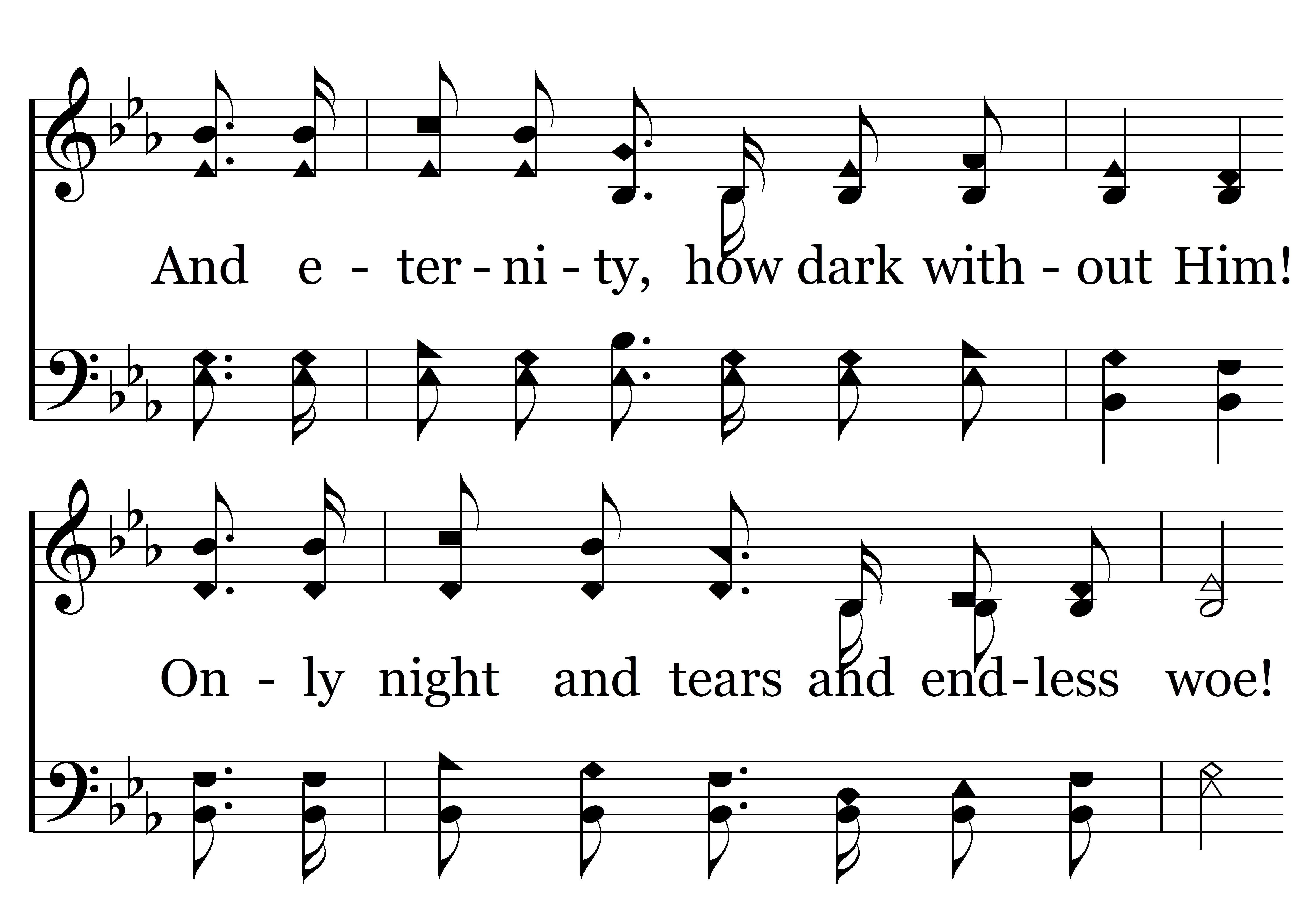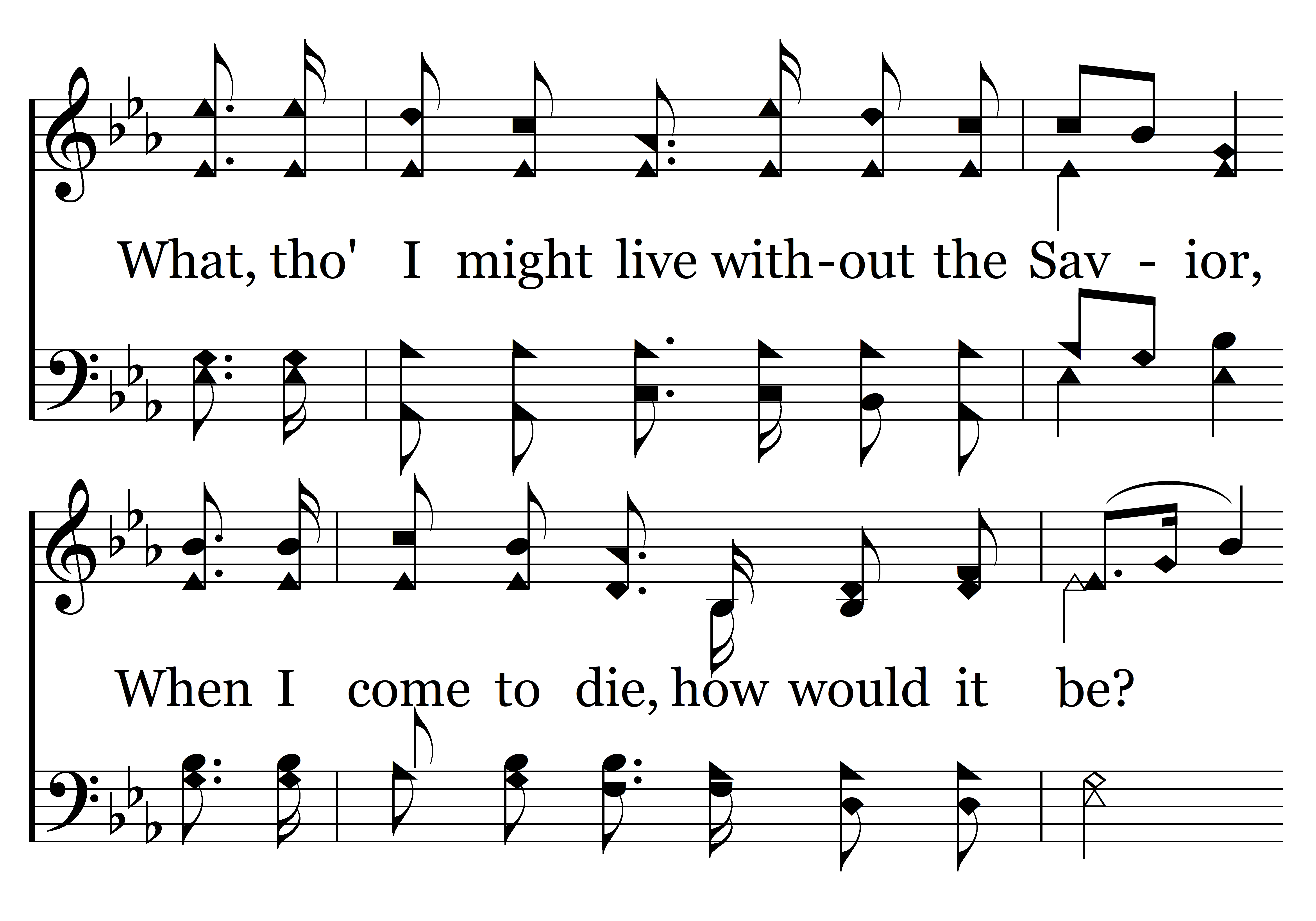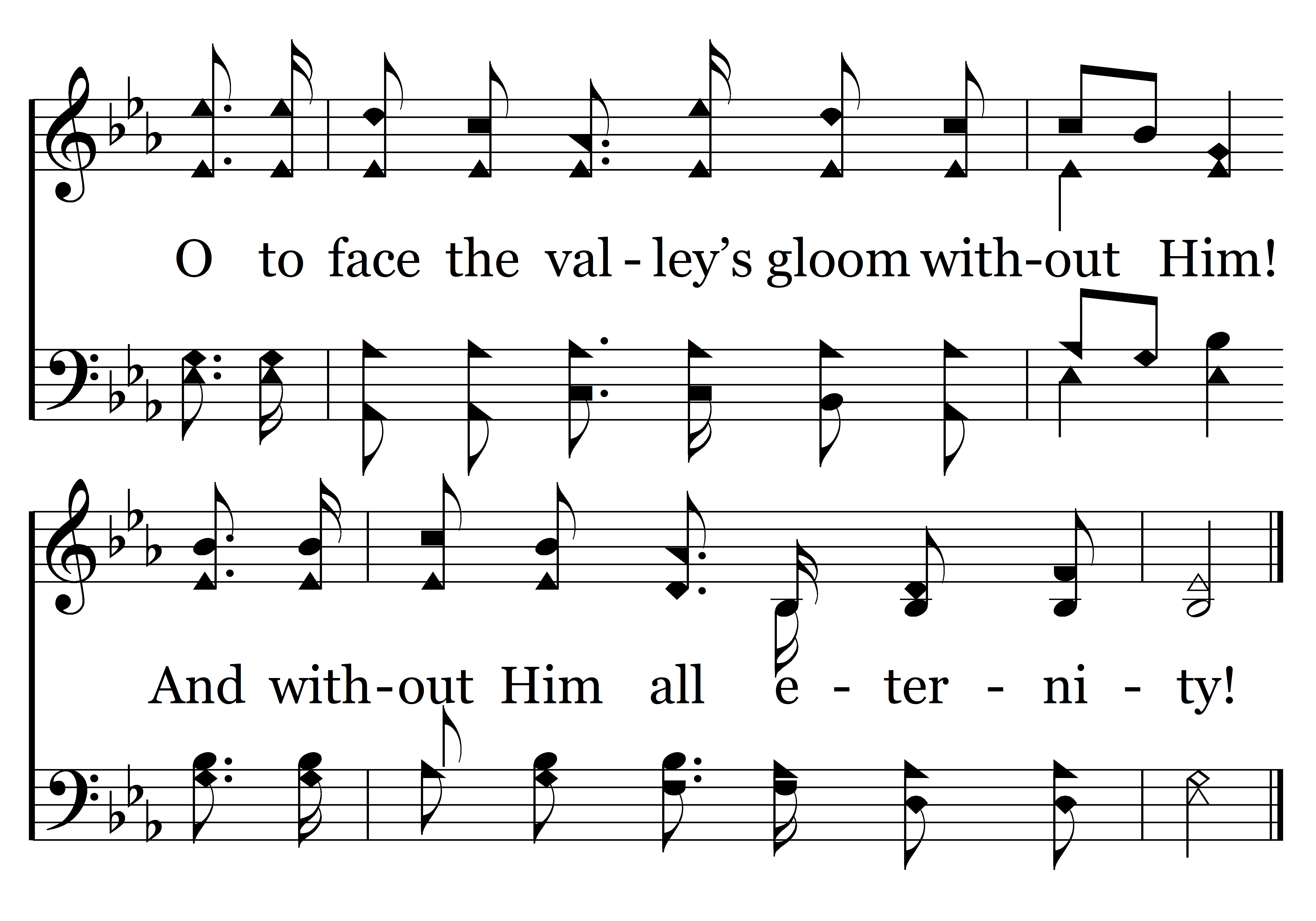 O what emptiness!— without the Savior ’Mid the sins and sorrows here below! And eternity, how dark without Him! Only night and tears and endless woe! What, tho' I might live without the Savior, When I come to die, how would it be? O to face the valley’s gloom without Him! And without Him all eternity!