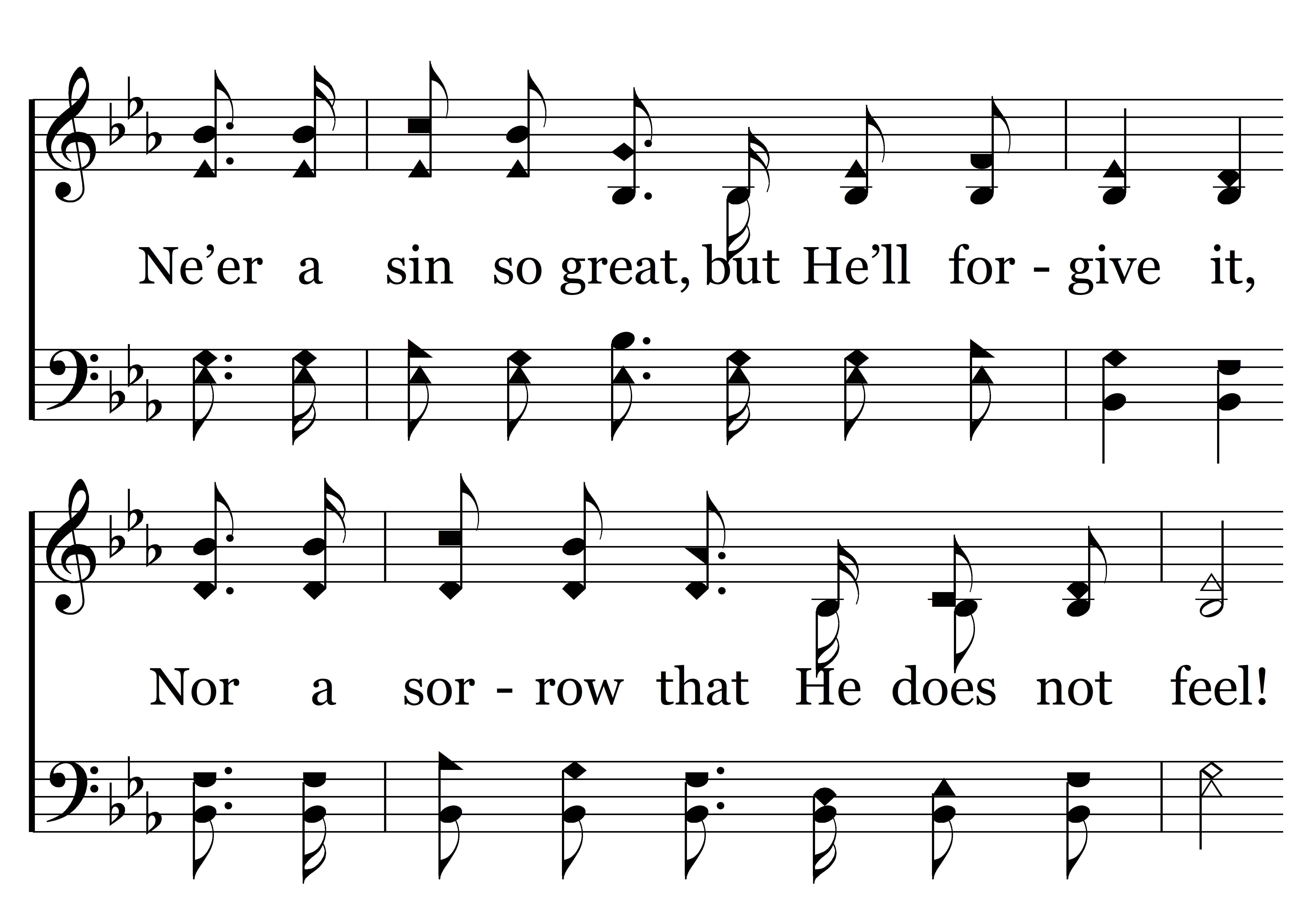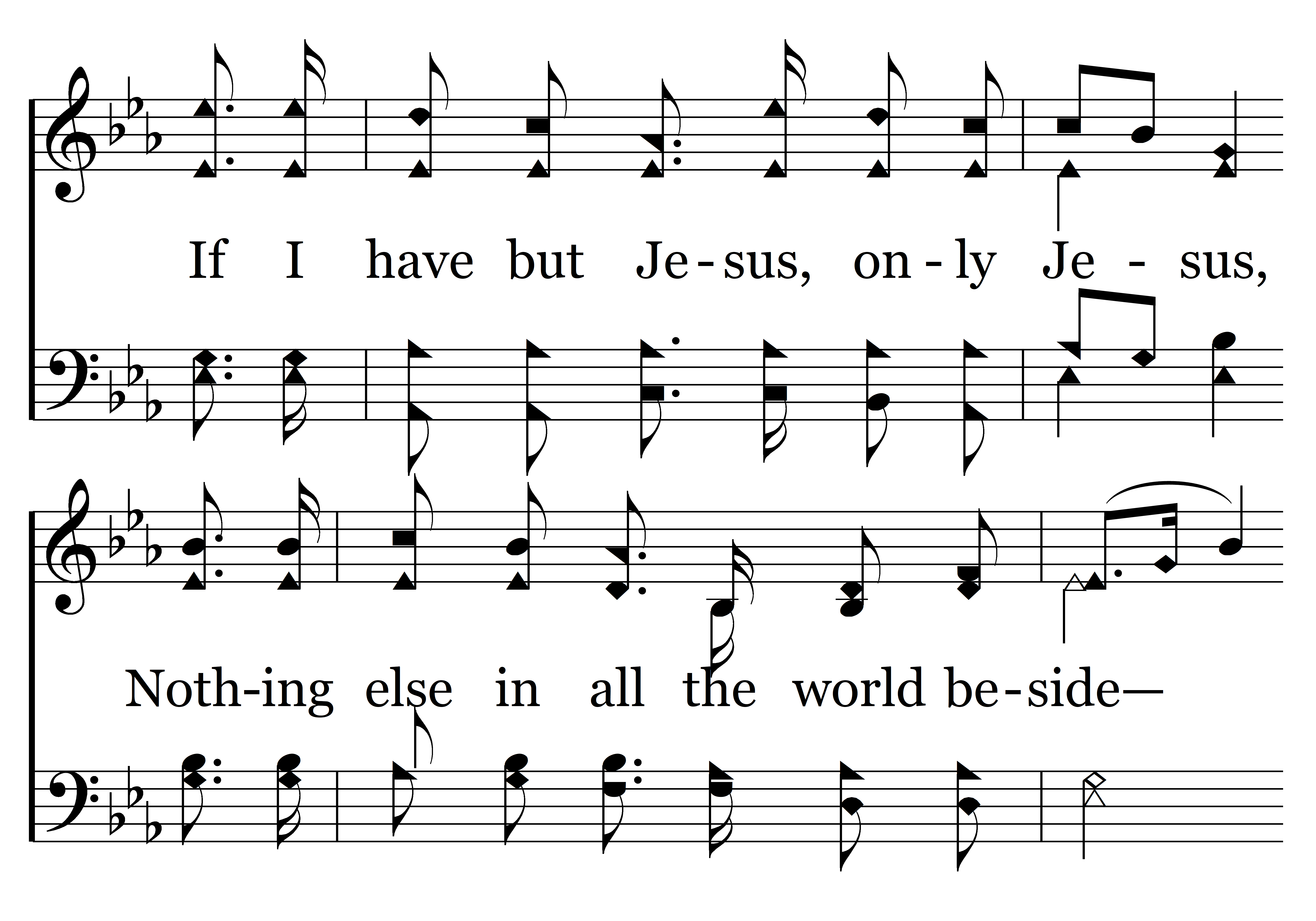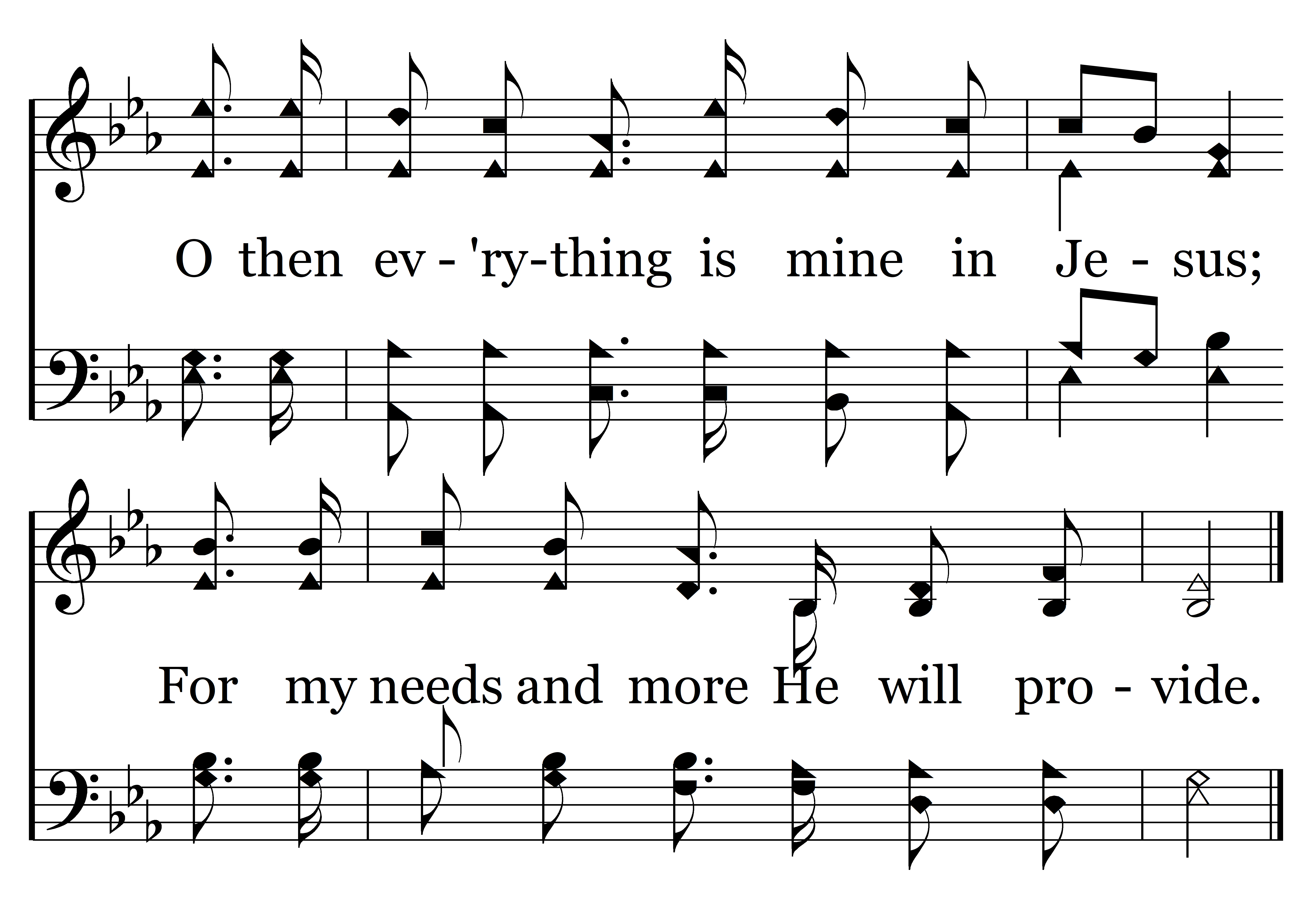 O the joy of having all in Jesus! What a balm the broken heart to heal! Ne’er a sin so great, but He’ll forgive it, Nor a sorrow that He does not feel! If I have but Jesus, only Jesus, Nothing else in all the world beside— O then ev'rything is mine in Jesus; For my needs and more He will provide.