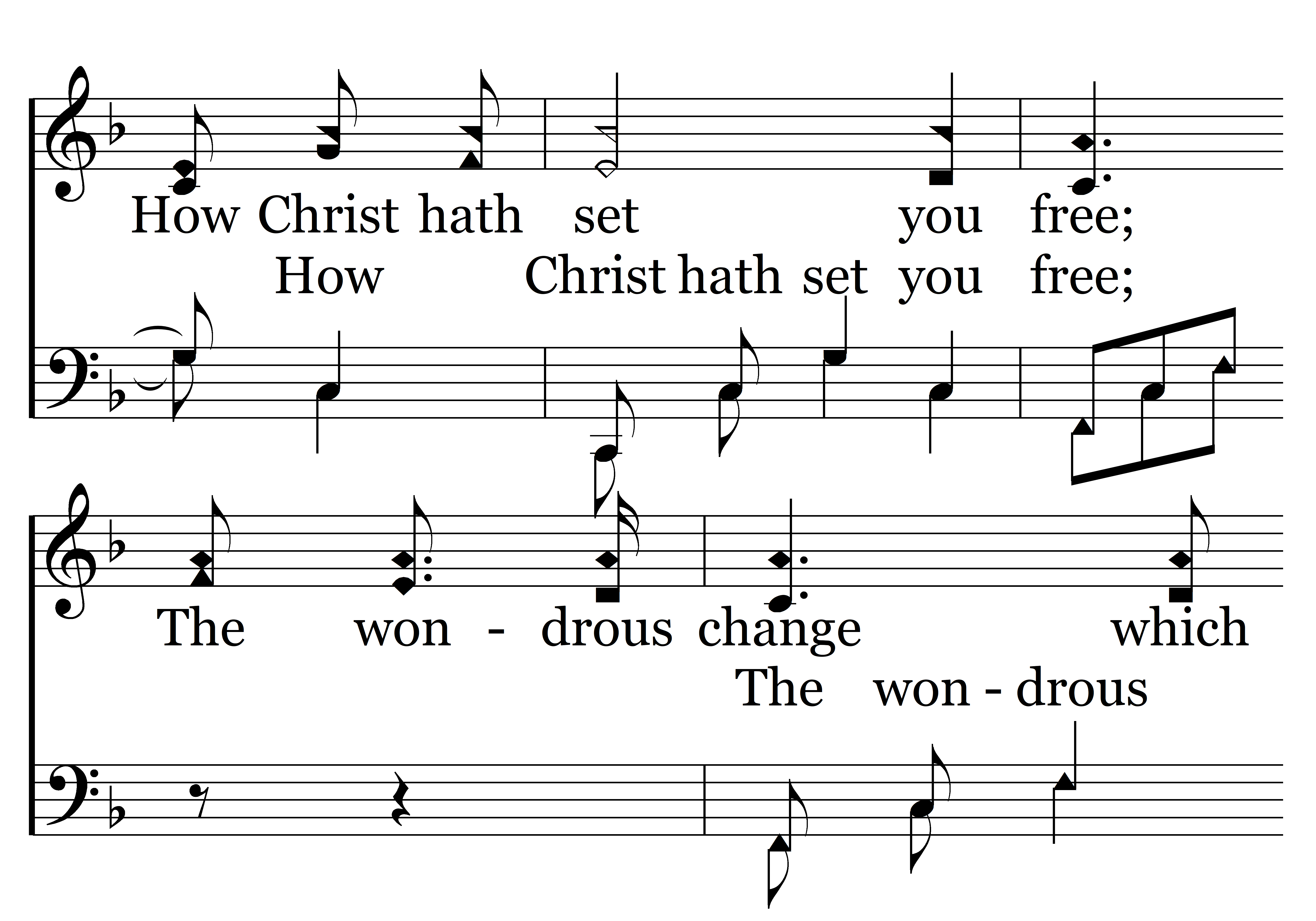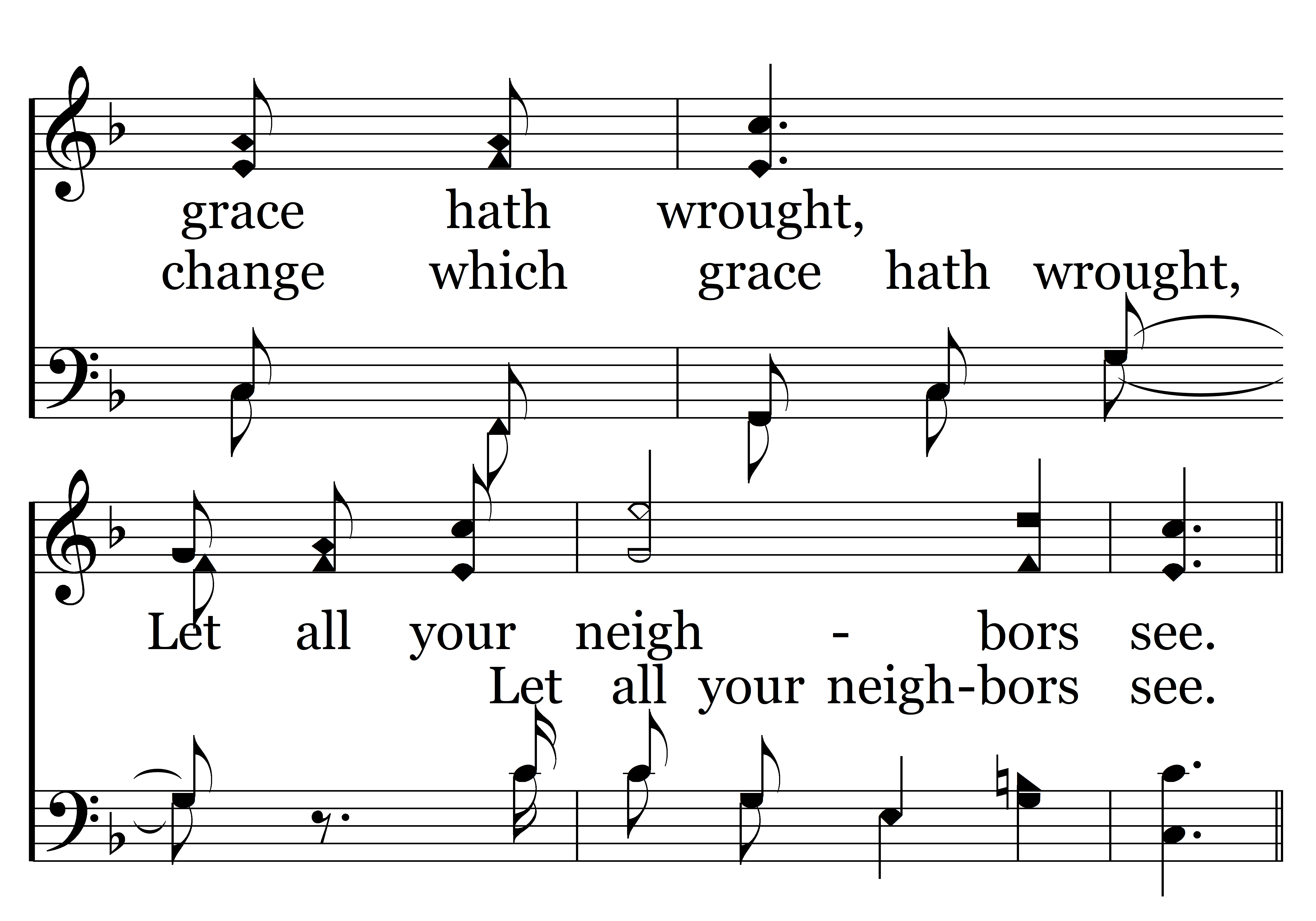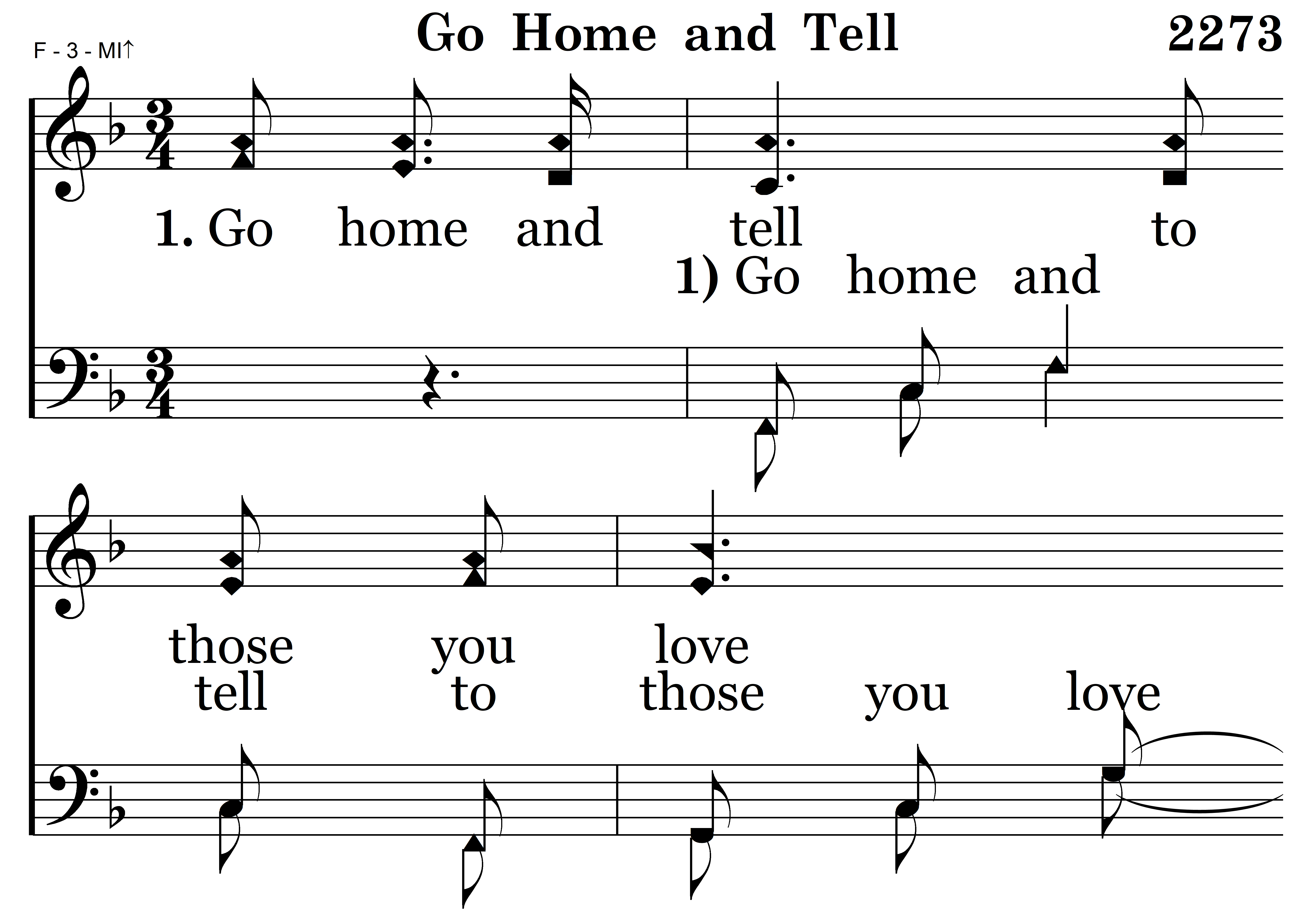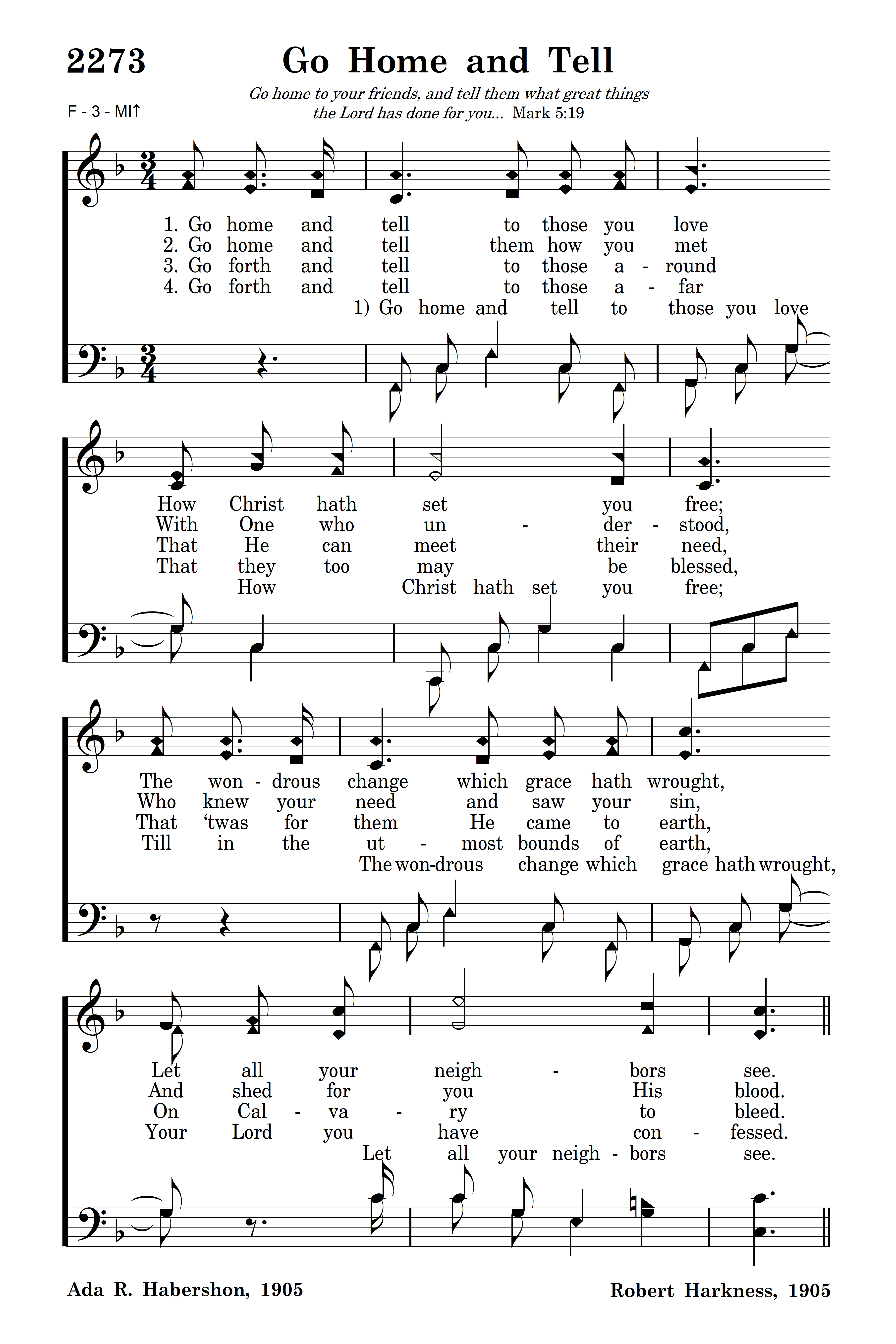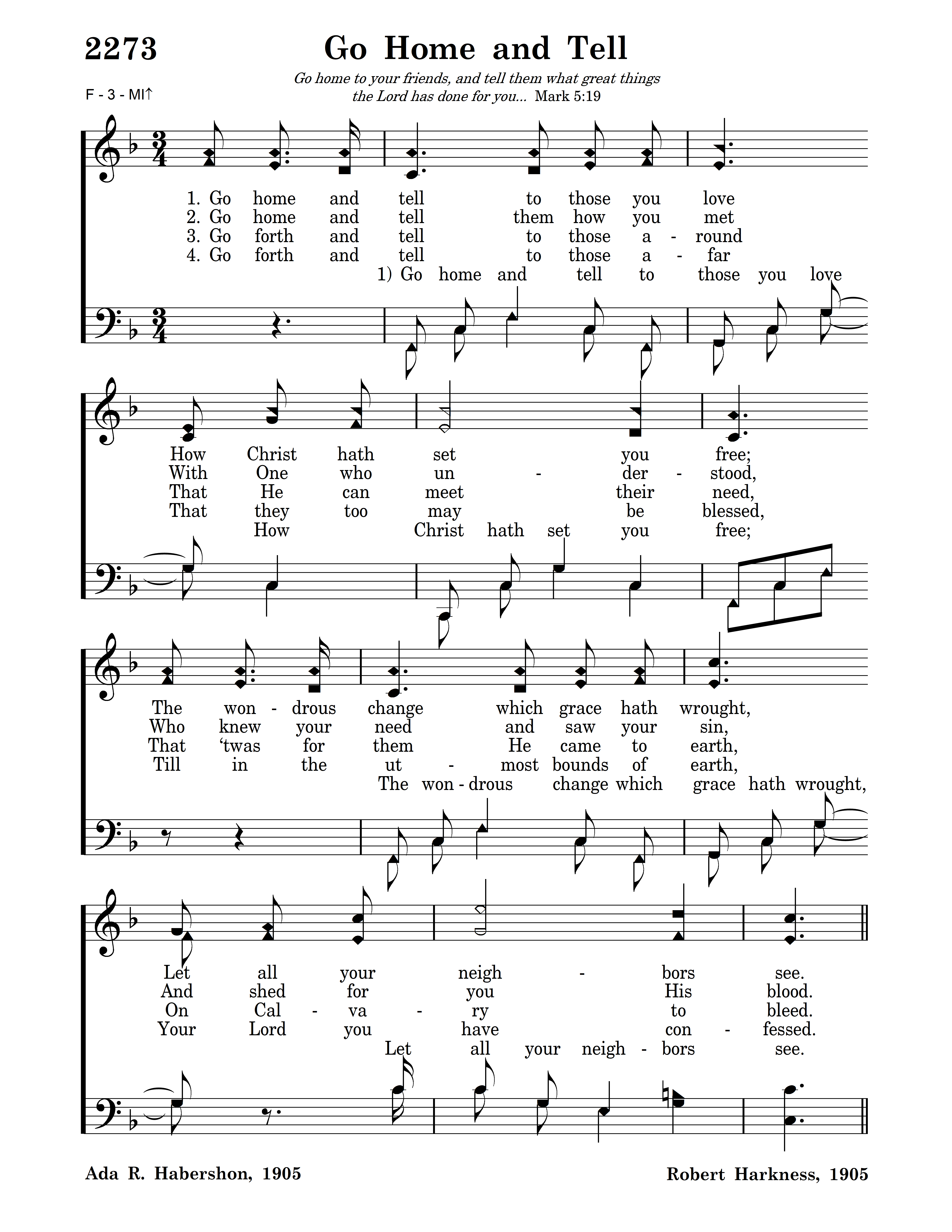 Go home and tell to those you love How Christ hath set you free The wondrous change which grace hath wrought, Let all your neighbors see.
