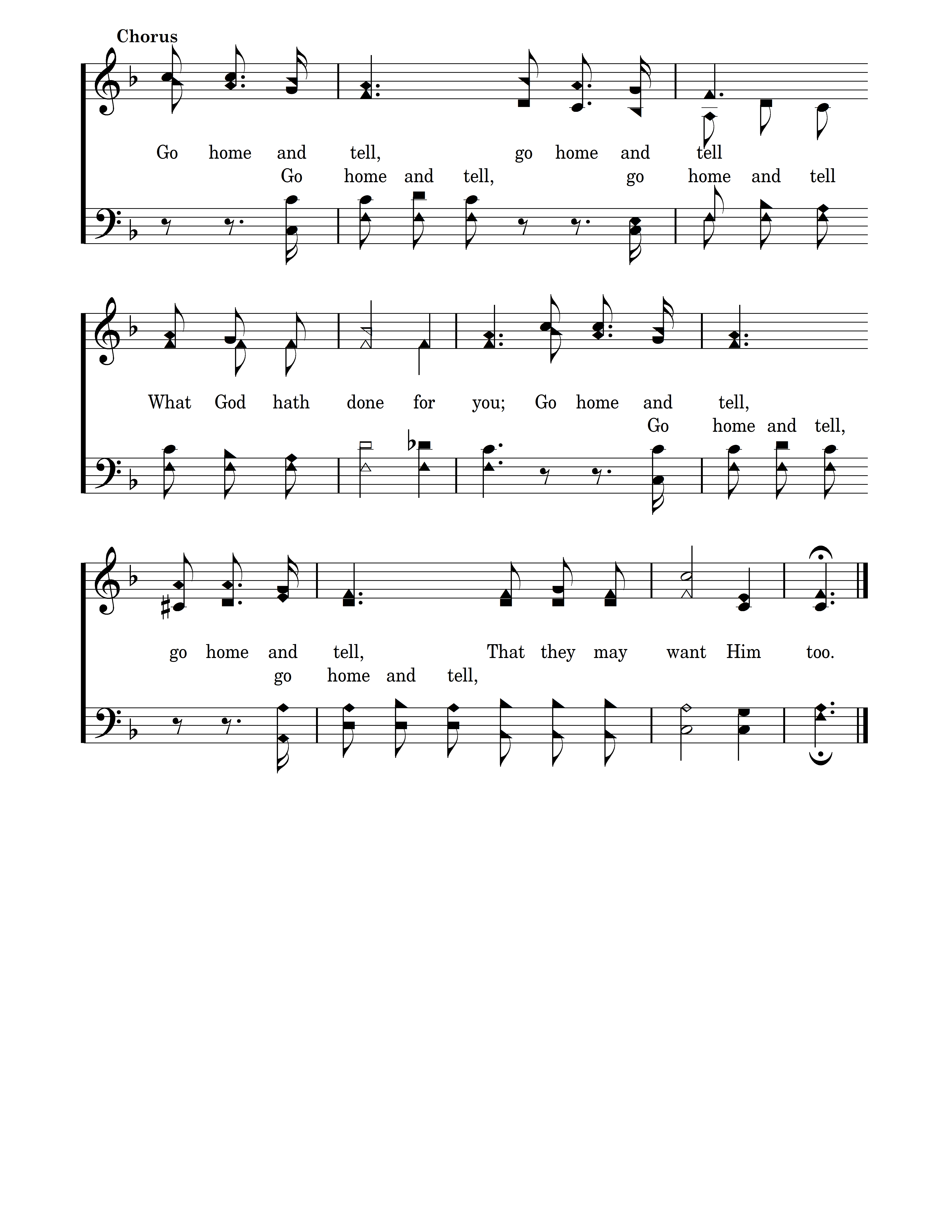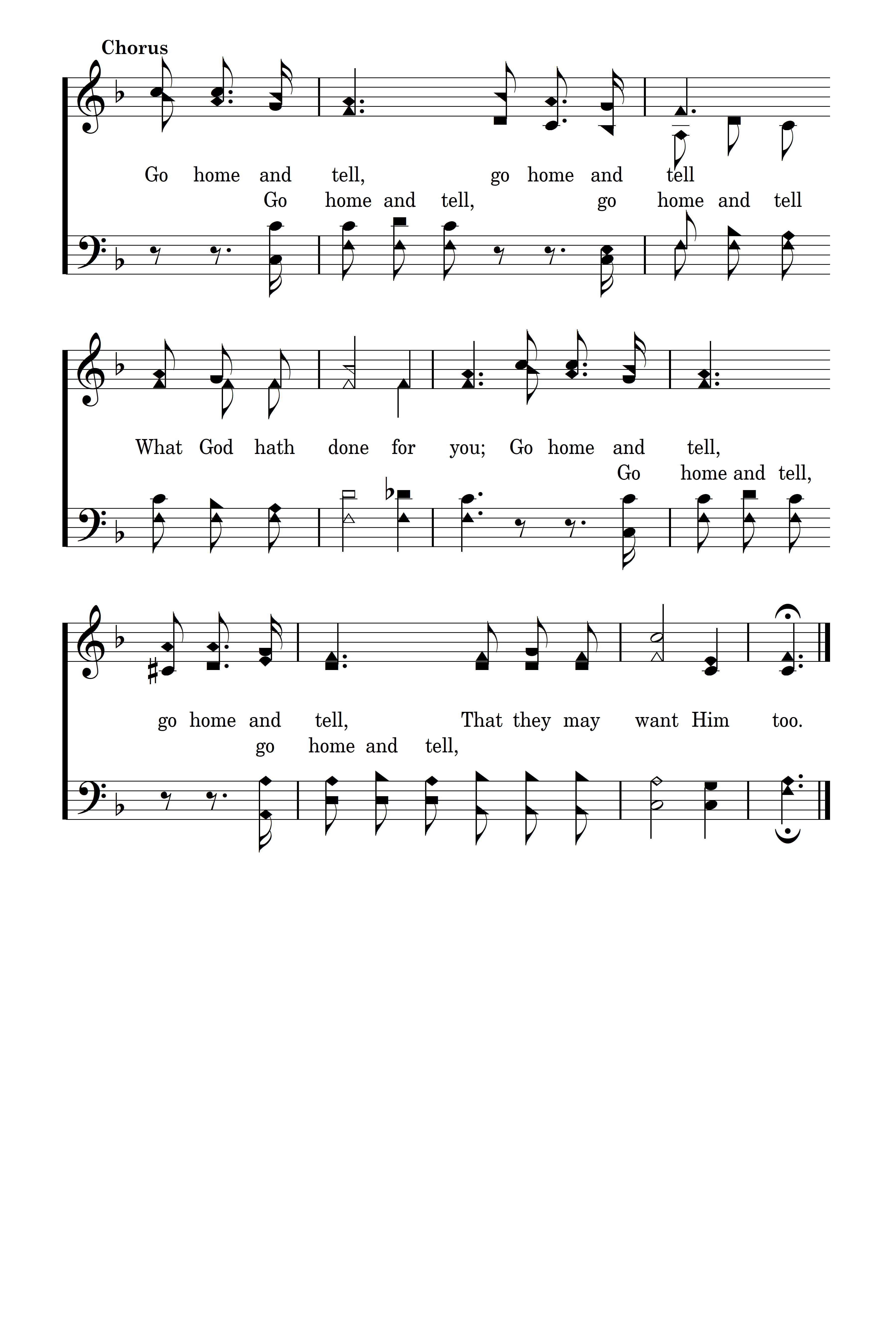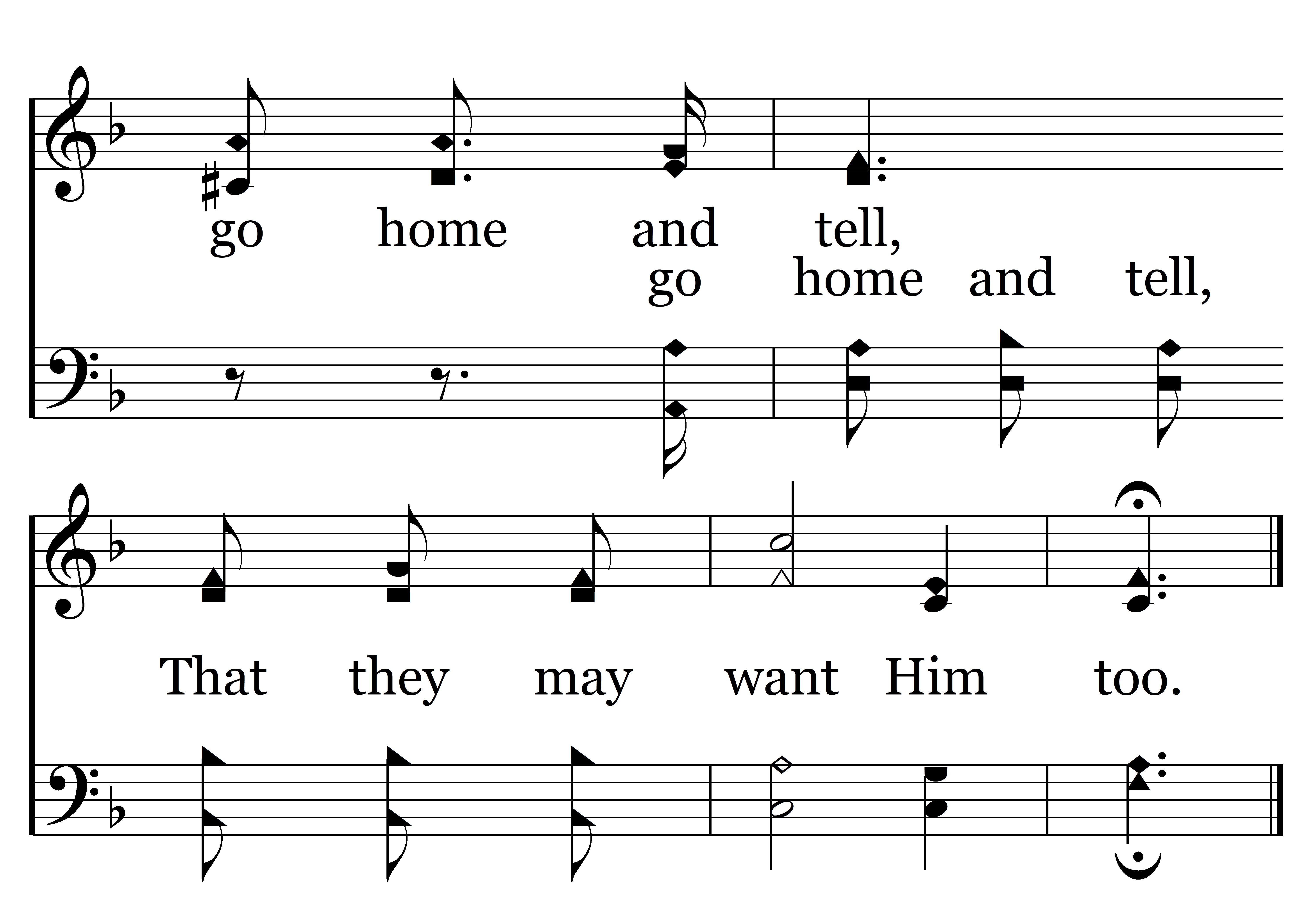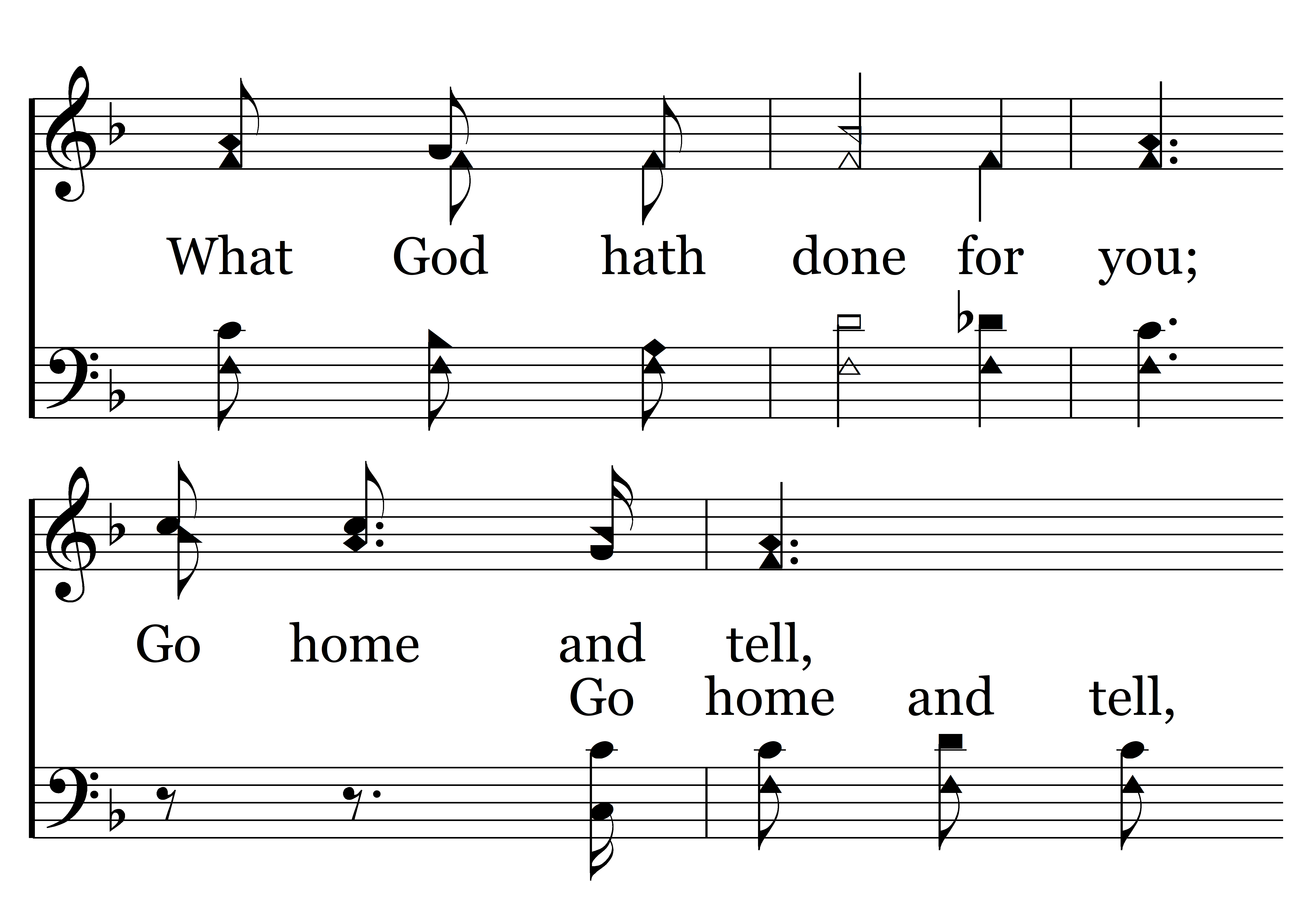 Go home and tell, go home and tell What God hath done for you; Go home and tell, go home and tell, That they may want Him too.