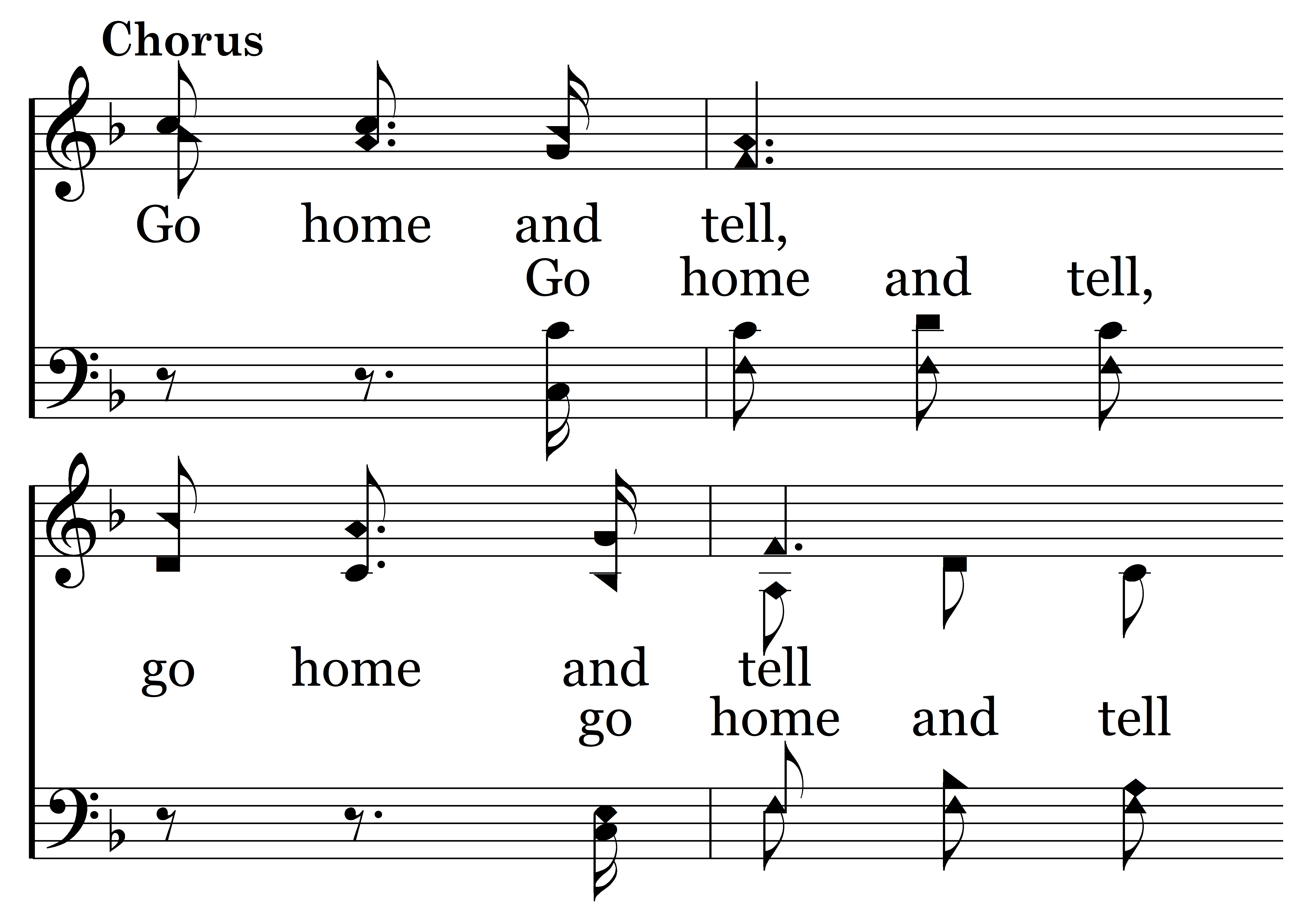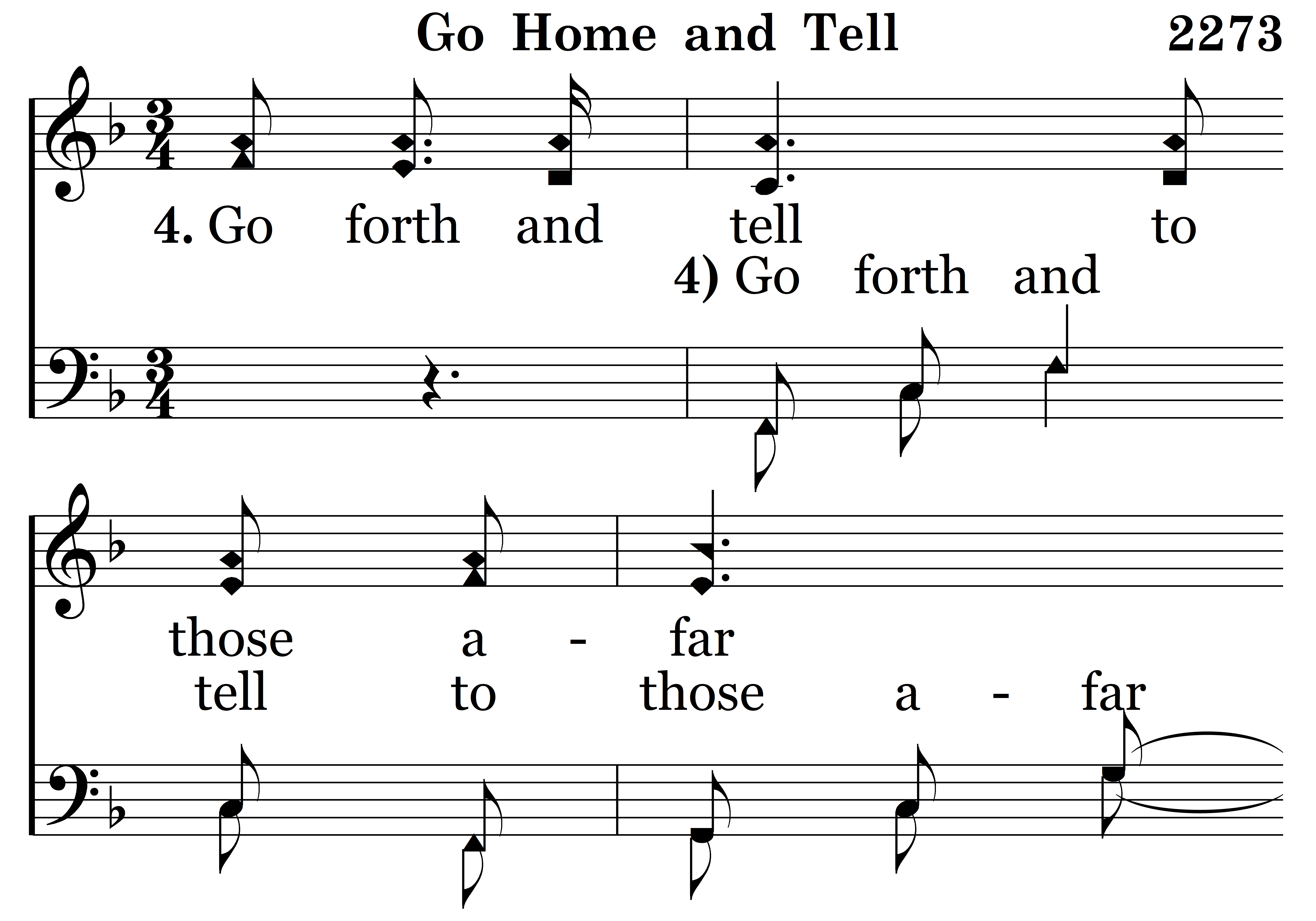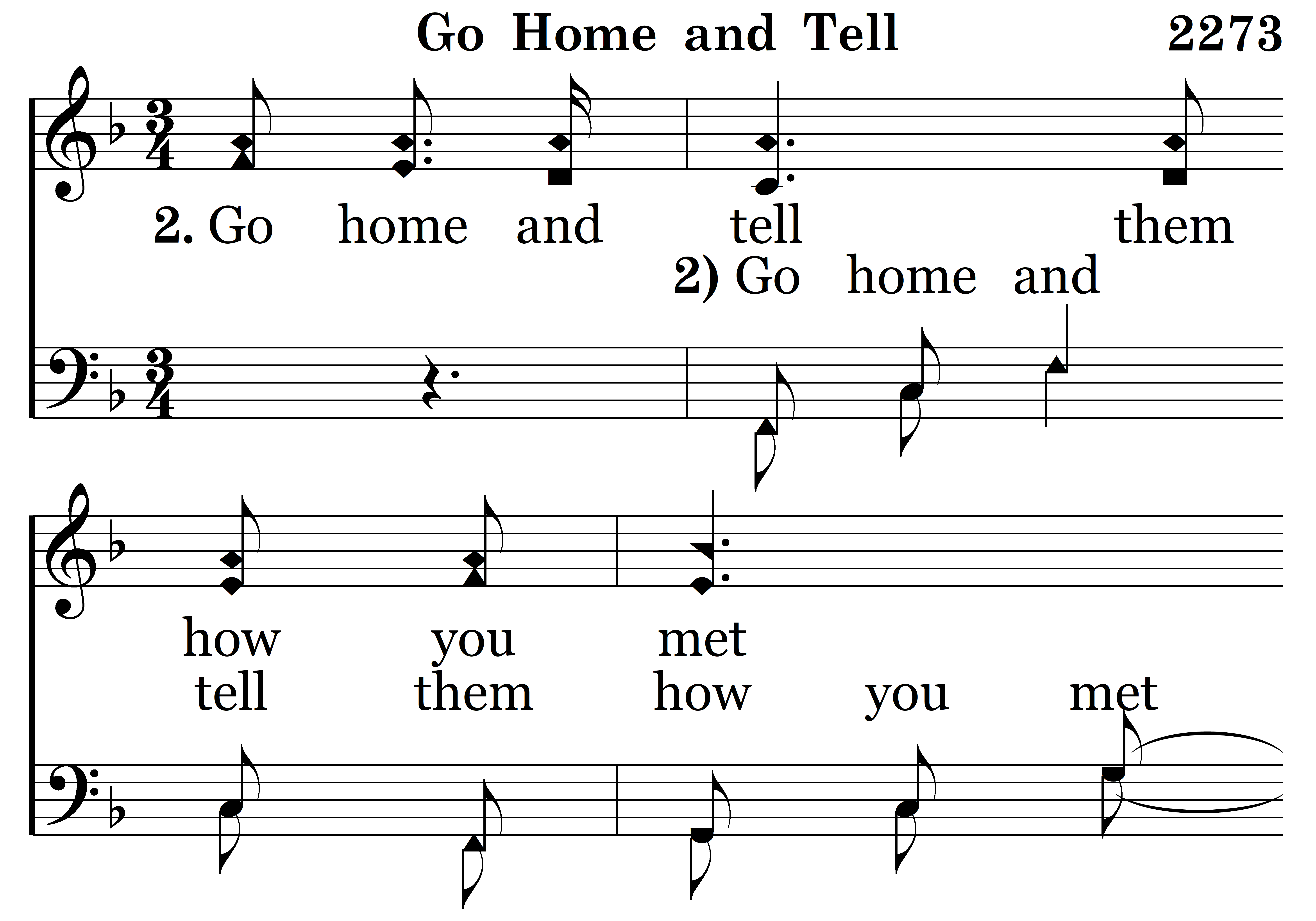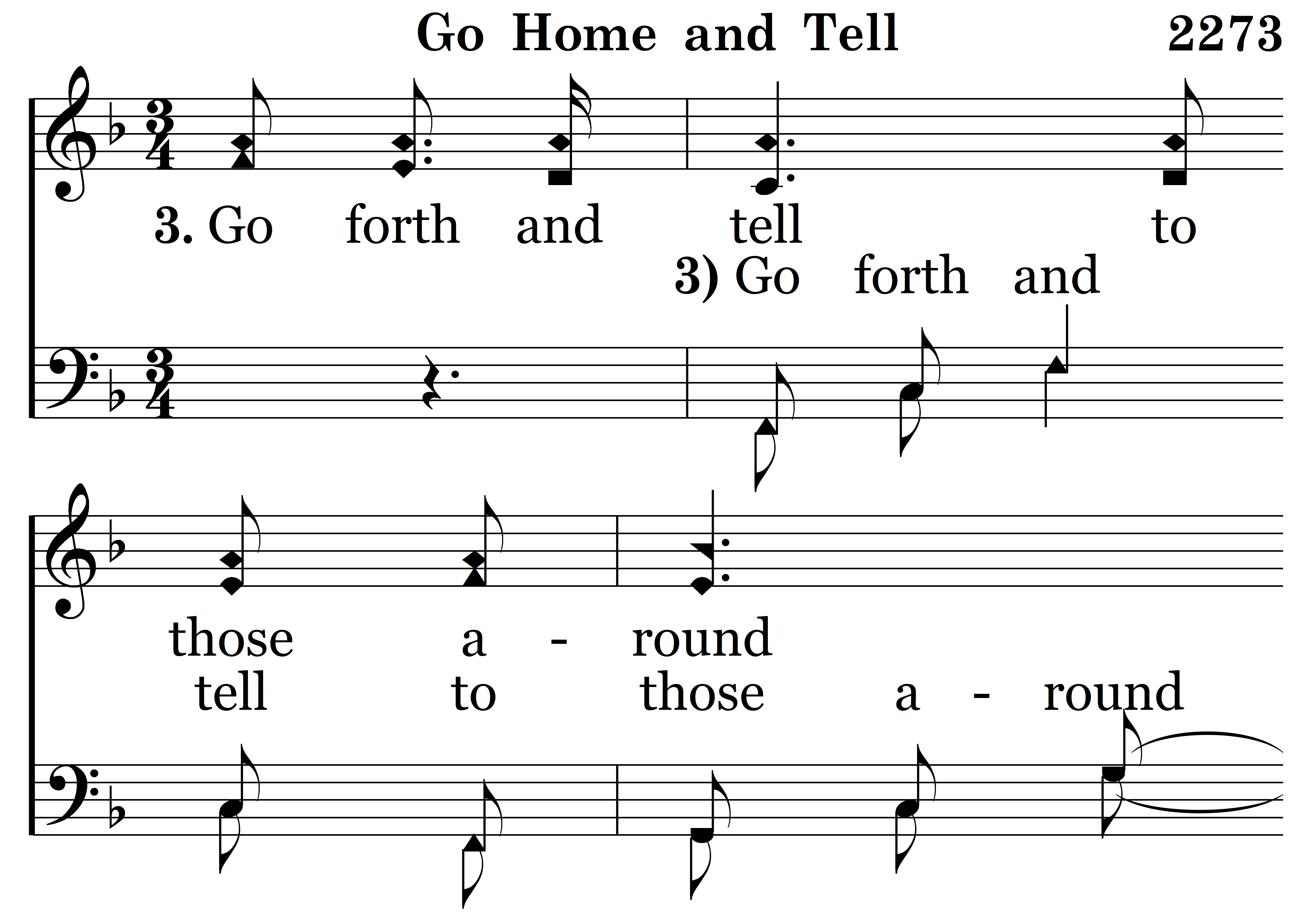 Go home and tell, go home and tell What God hath done for you; Go home and tell, go home and tell, That they may want Him too.