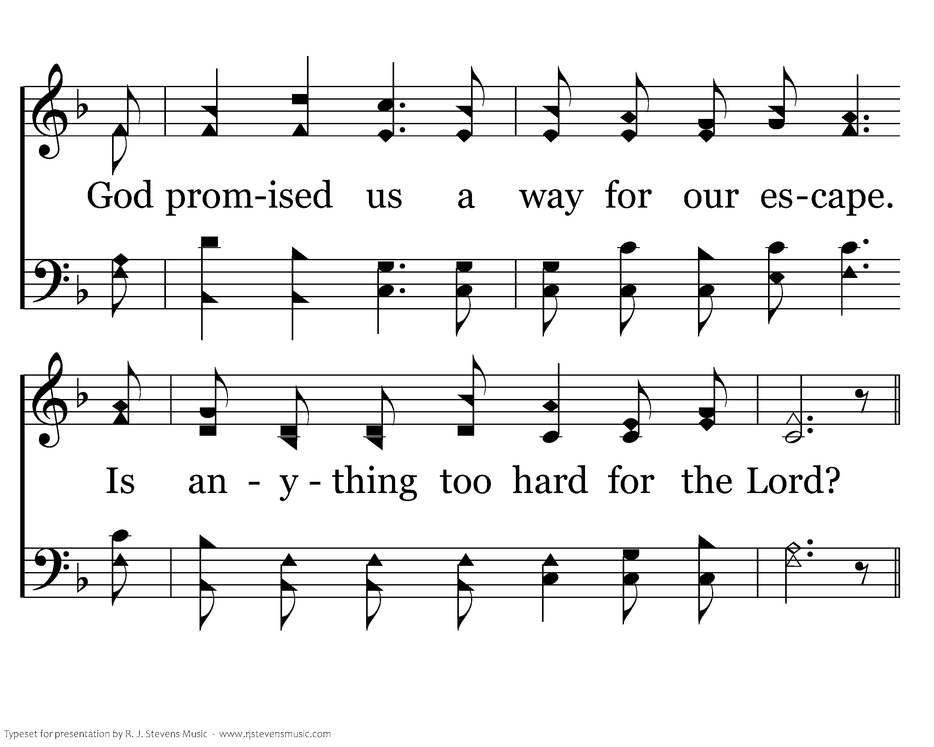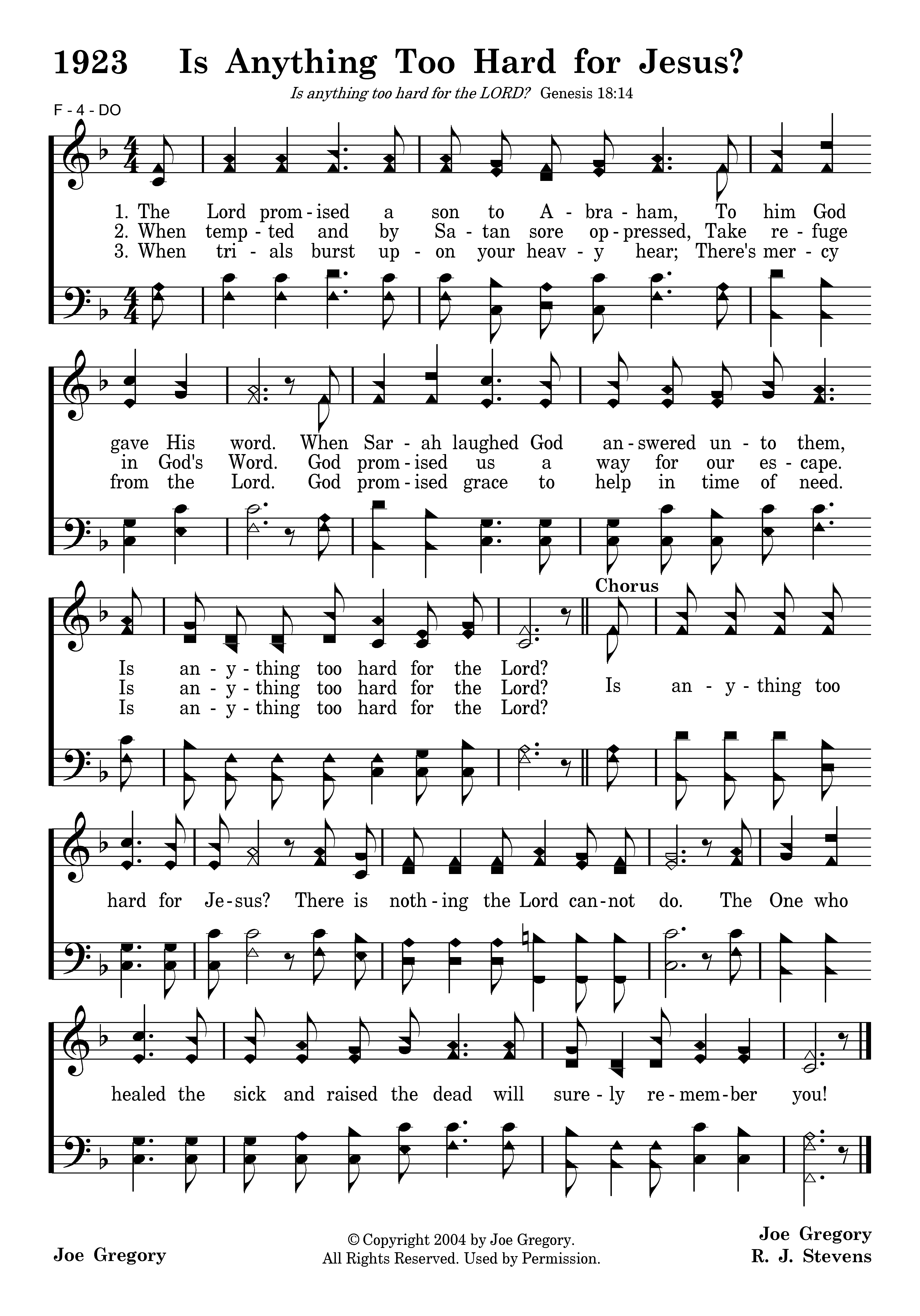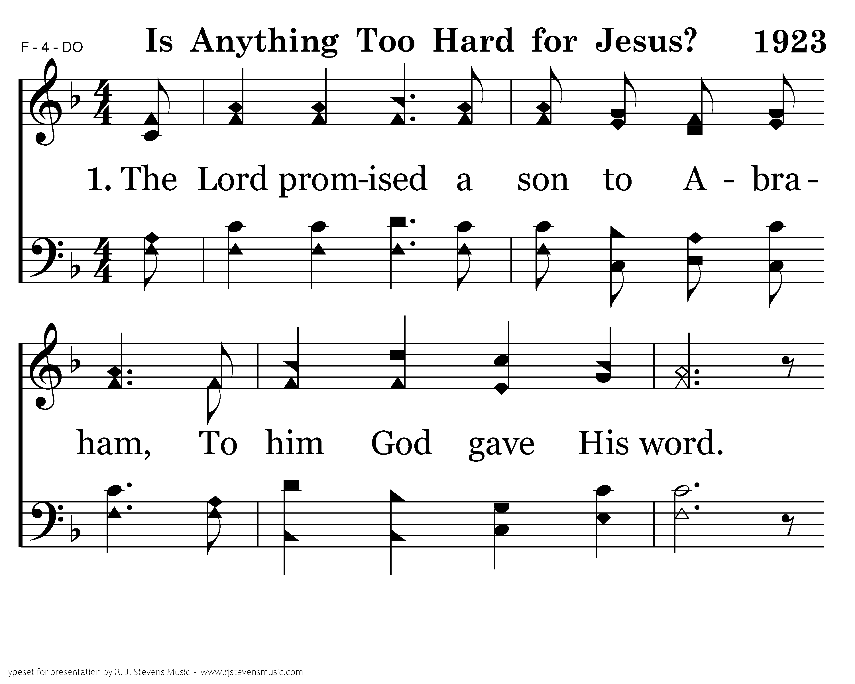 The Lord promised a son to Abraham, To him God gave His word. When Sarah laughed God answered unto them, Is anything too hard for the Lord?
