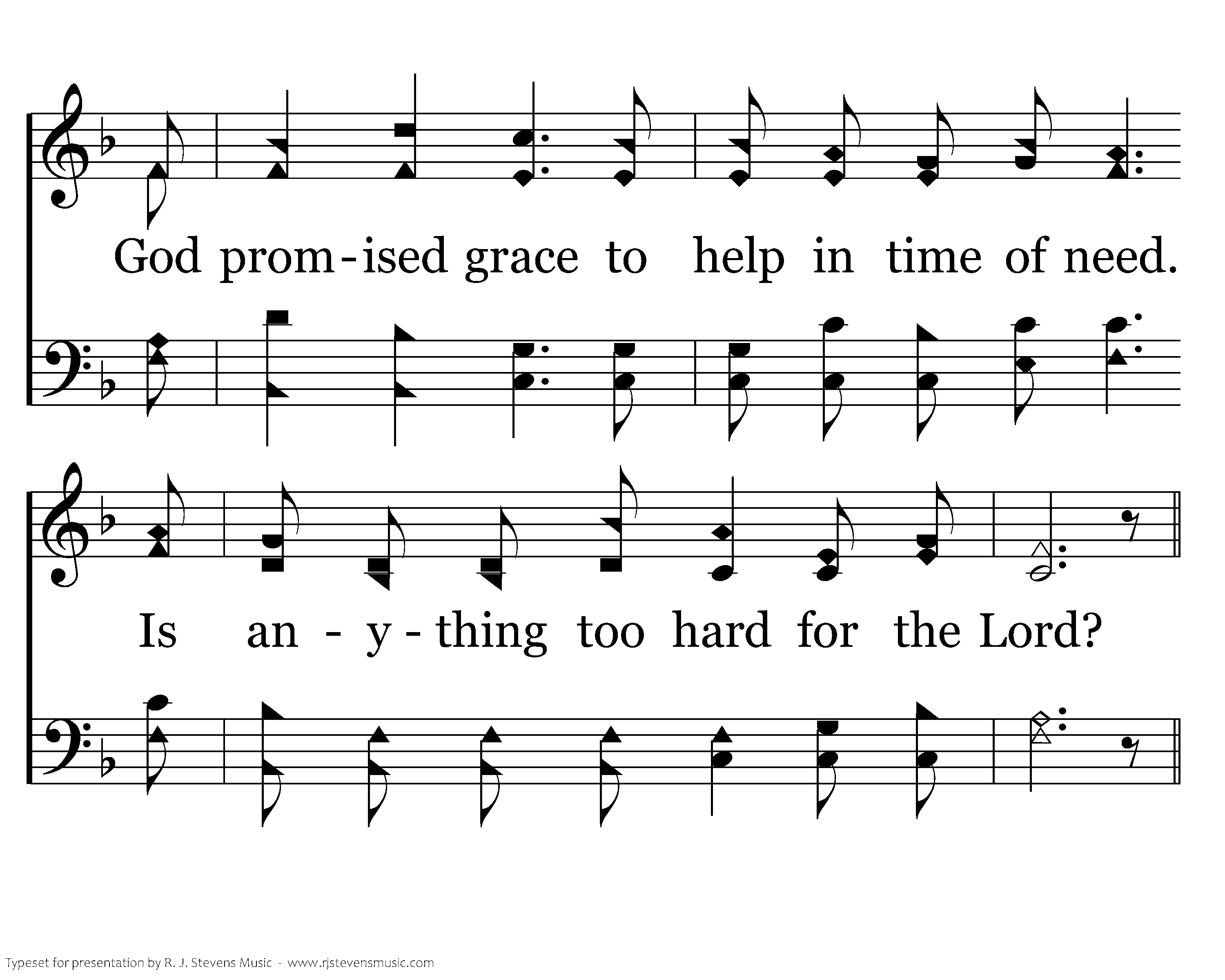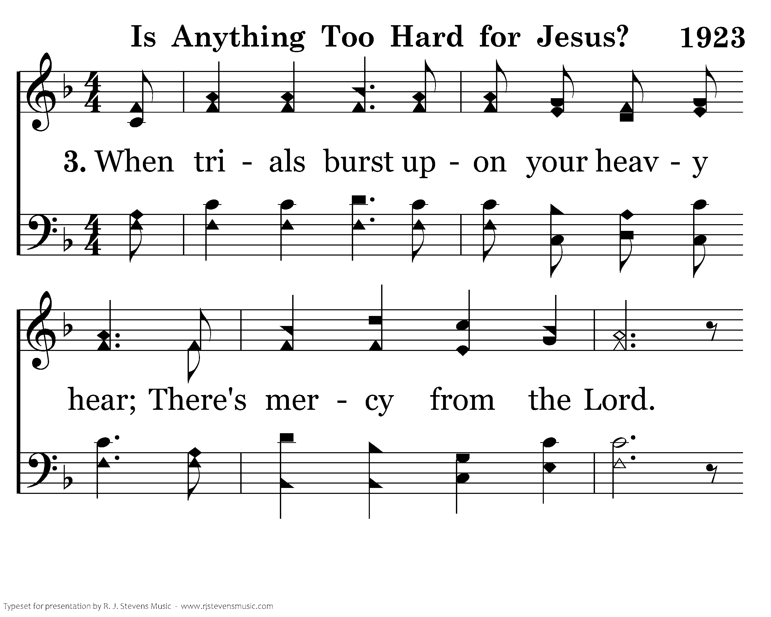 When trials burst upon your heavy hear; There's mercy from the Lord. God promised grace to help in time of need. Is anything too hard for the Lord?